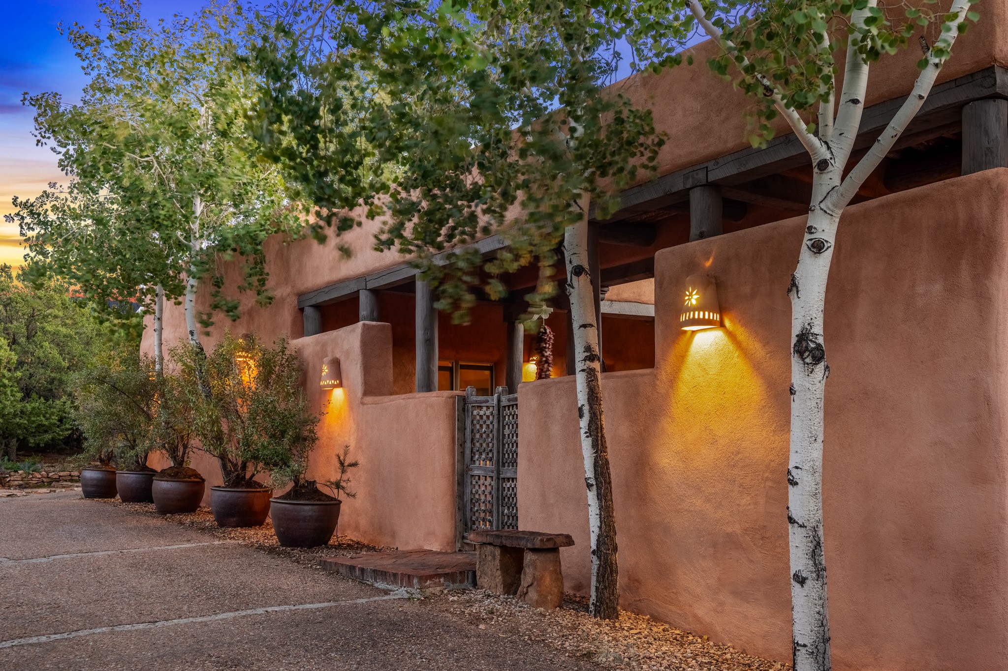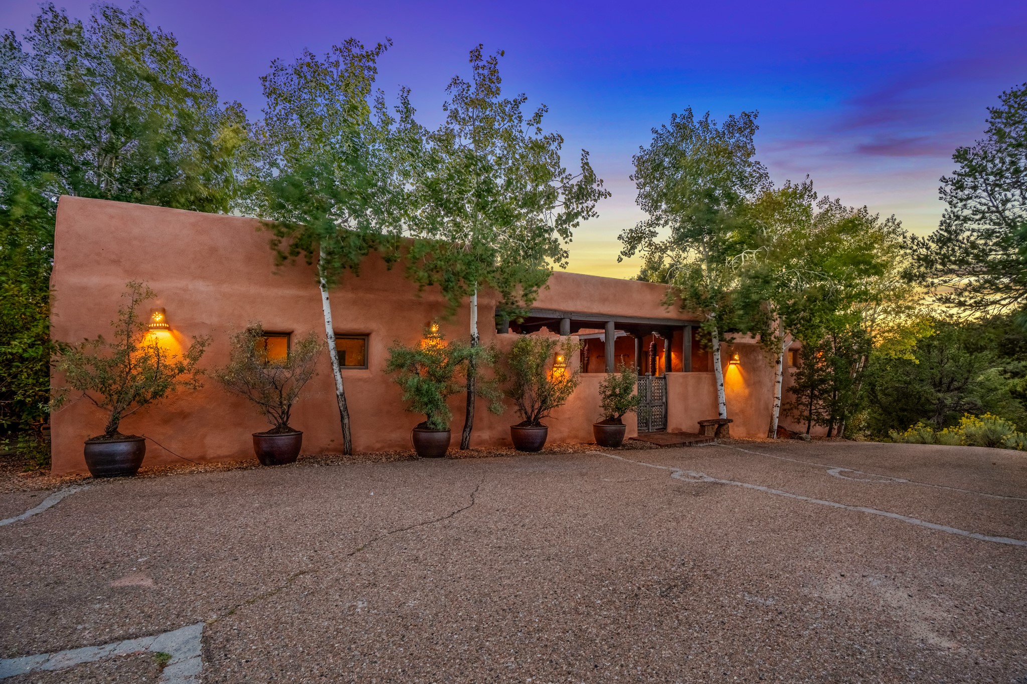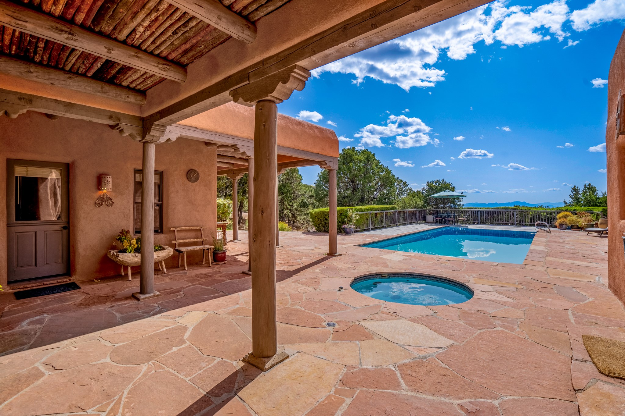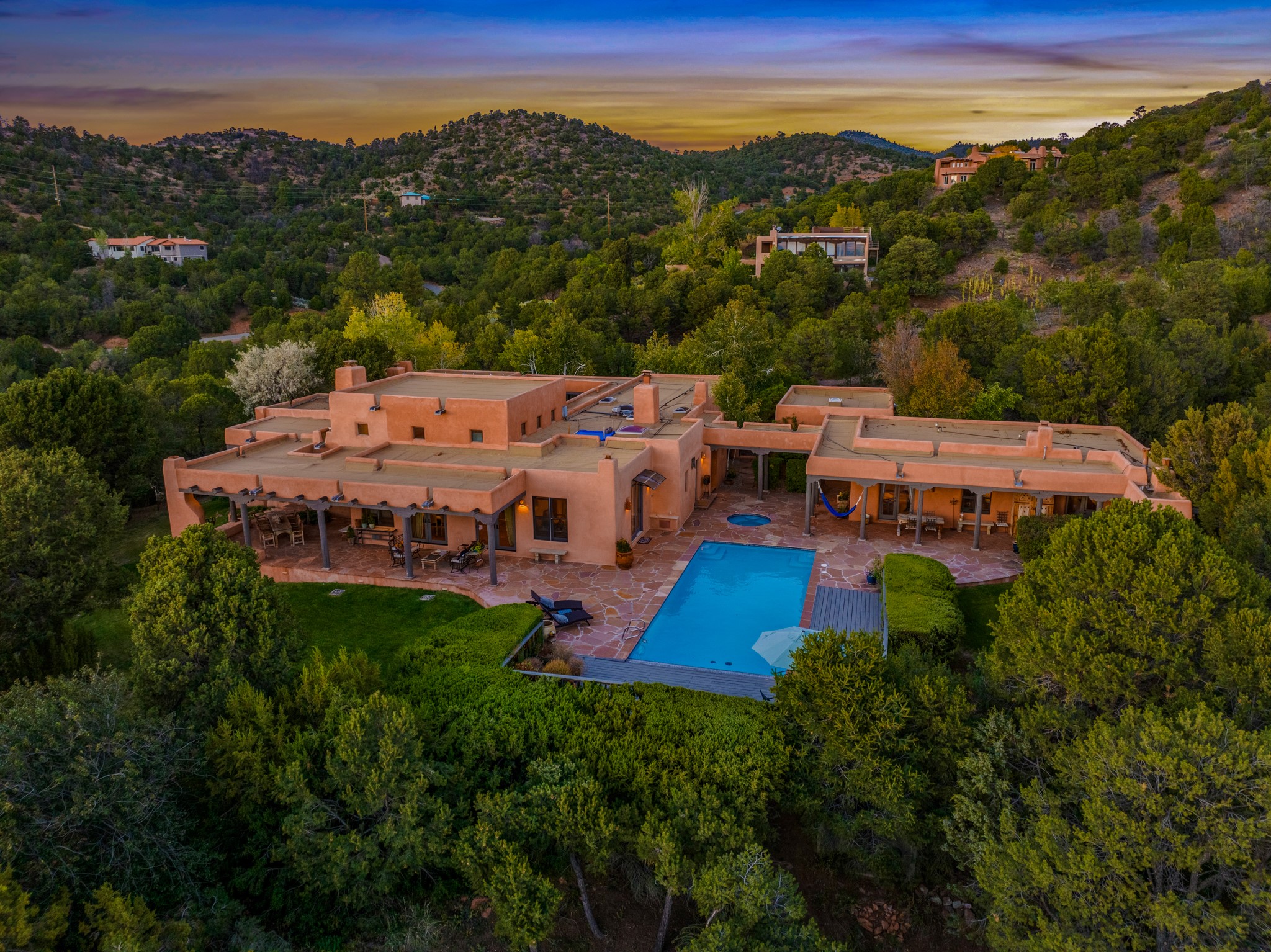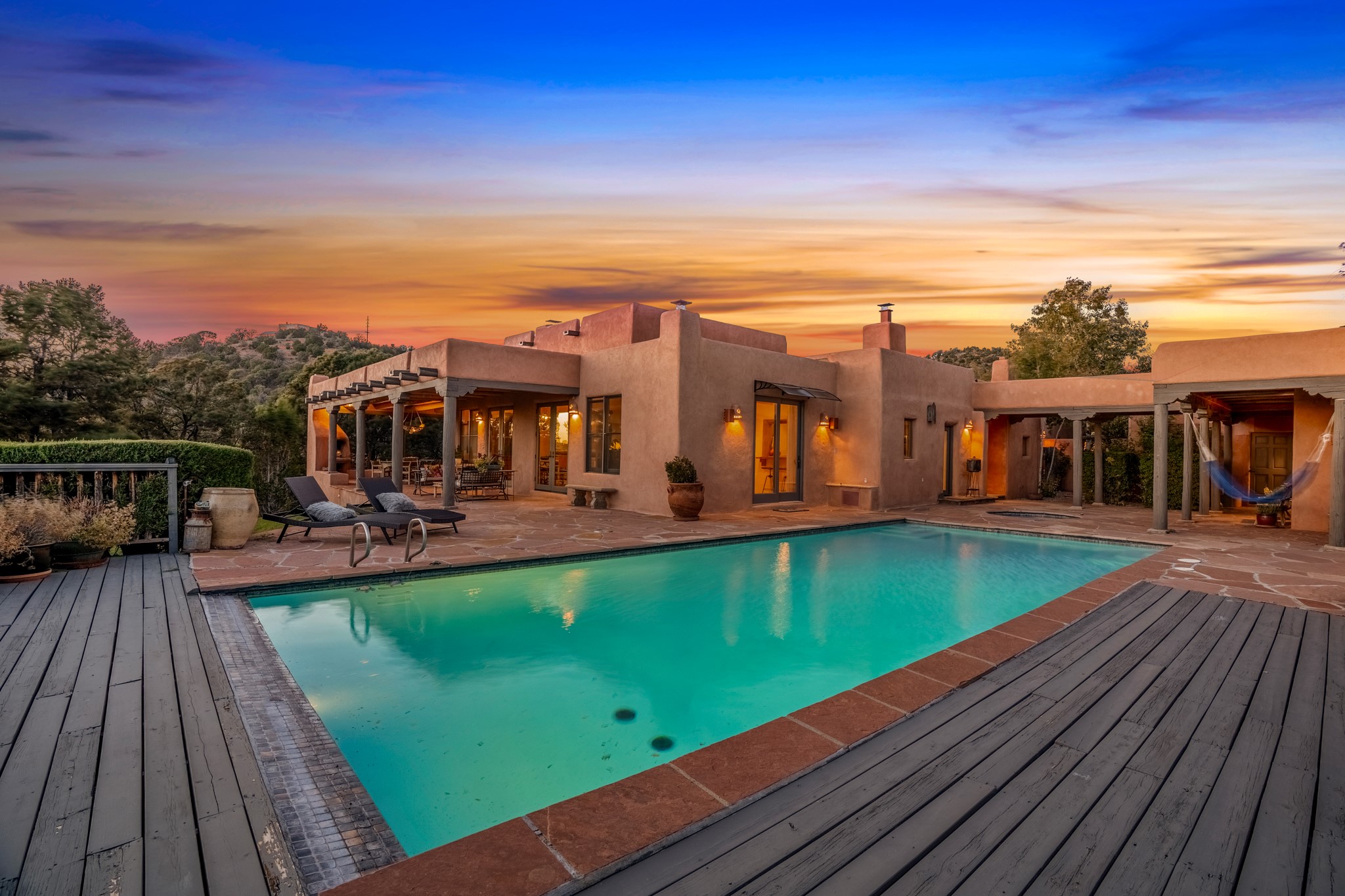 Nestled in the Santa Fe foothills and only 5 miles to the Plaza lies a magnificent representation of Pueblo Revival architecture; an adobe home that enjoys maximum privacy, located on a 5 acre densely wooded and entirely fenced property, with spectacular views. This unique home, built in 1997, consists of a main house, a guest house, expansive outdoor portals, pool, in-ground hot tub and a detached garage. The fountain courtyard entrance sets the tone for this special home. Upon stepping into the 4,100 sq ft main house, you begin by experiencing this unique rendition with its 16 ft coved vigas ceilings, a shepherd's fireplace and abundant natural light. The living area opens onto the dramatic South-facing portal that encompasses sitting and dining areas, as well as a media/bar for your outdoor entertainment. The kitchen is the heart of this spectacular house with a raised wood burning fireplace, maple countertops, a bar and a pass through to the attached den. The primary suite is located in the West wing of the property and includes a large office, which opens to the portal, and a lovely bedroom with a kiva fireplace and private balcony. The beautifully renovated bathroom includes a 2-person air tub, a steam shower, its own fireplace and access to the central courtyard. The East wing has a guest bedroom with a full ensuite bathroom and a third very large bedroom, presently used as a flex room and plumbed for an additional bathroom. The stunning pool area is that of a Southwestern resort with a deep pool, in-ground hot tub and panoramic views. The lovely 820 sq ft 1 bedroom, detached guest house enjoys its own portal, a full kitchen and steam shower. 96 Double Arrow has the heart of Spain and the soul of Santa Fe embedded in each handmade adobe brick, a rare opportunity to purchase an authentic foothills adobe hacienda just minutes from downtown Santa Fe.