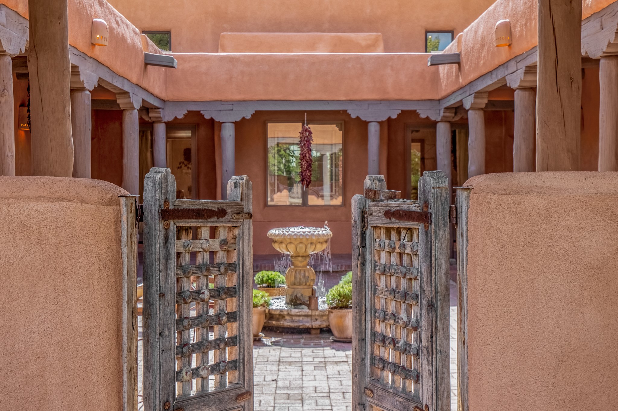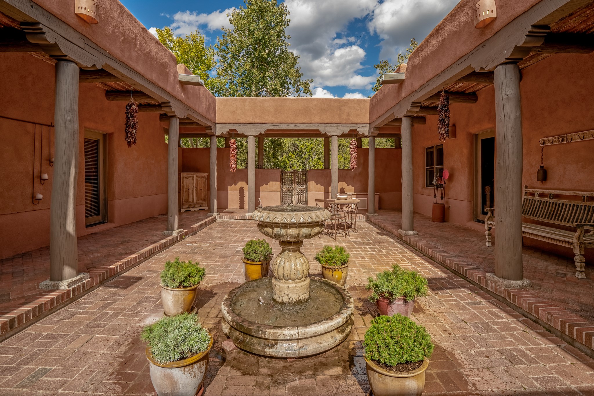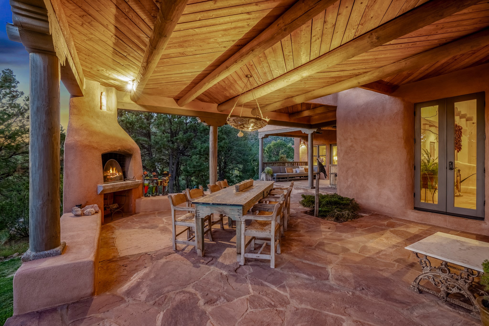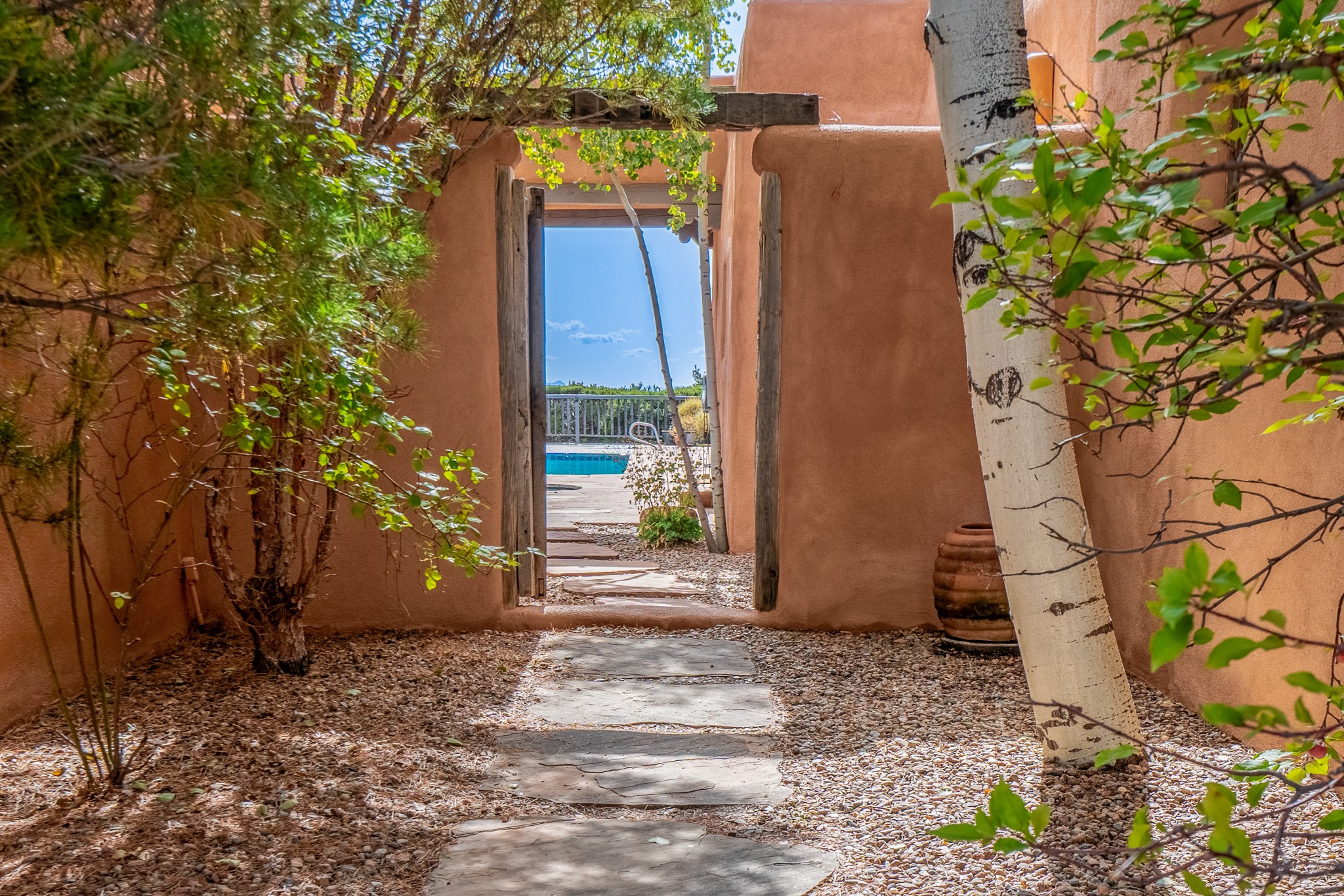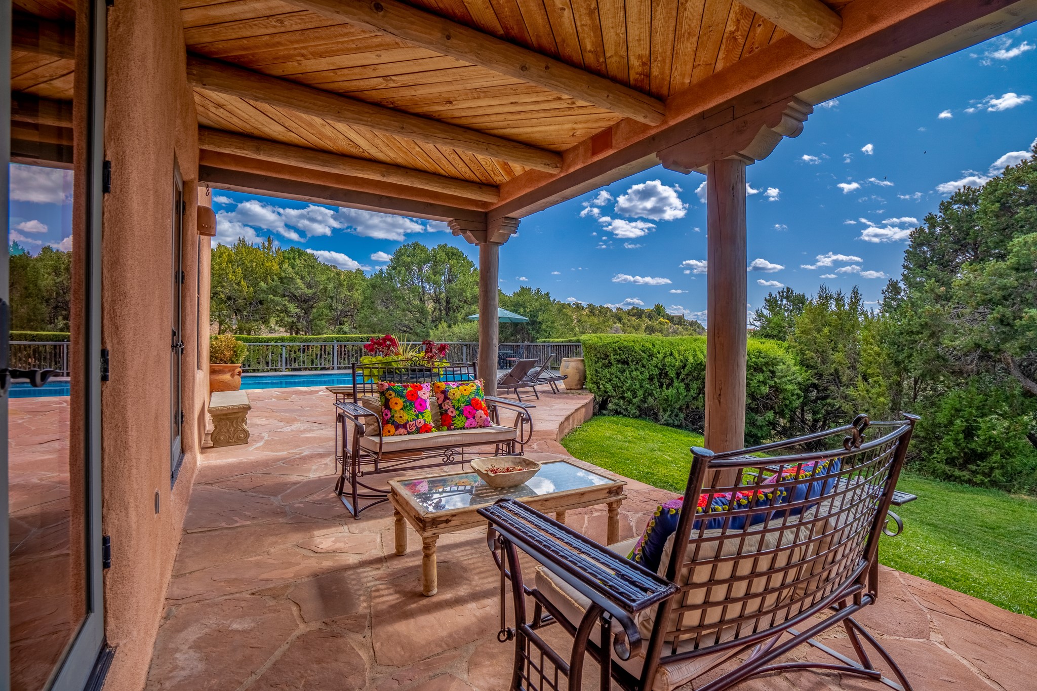 Nestled in the Santa Fe foothills and only 5 miles to the Plaza lies a magnificent representation of Pueblo Revival architecture; an adobe home that enjoys maximum privacy, located on a 5 acre densely wooded and entirely fenced property, with spectacular views. This unique home, built in 1997, consists of a main house, a guest house, expansive outdoor portals, pool, in-ground hot tub and a detached garage. The fountain courtyard entrance sets the tone for this special home. Upon stepping into the 4,100 sq ft main house, you begin by experiencing this unique rendition with its 16 ft coved vigas ceilings, a shepherd's fireplace and abundant natural light. The living area opens onto the dramatic South-facing portal that encompasses sitting and dining areas, as well as a media/bar for your outdoor entertainment. The kitchen is the heart of this spectacular house with a raised wood burning fireplace, maple countertops, a bar and a pass through to the attached den. The primary suite is located in the West wing of the property and includes a large office, which opens to the portal, and a lovely bedroom with a kiva fireplace and private balcony. The beautifully renovated bathroom includes a 2-person air tub, a steam shower, its own fireplace and access to the central courtyard. The East wing has a guest bedroom with a full ensuite bathroom and a third very large bedroom, presently used as a flex room and plumbed for an additional bathroom. The stunning pool area is that of a Southwestern resort with a deep pool, in-ground hot tub and panoramic views. The lovely 820 sq ft 1 bedroom, detached guest house enjoys its own portal, a full kitchen and steam shower. 96 Double Arrow has the heart of Spain and the soul of Santa Fe embedded in each handmade adobe brick, a rare opportunity to purchase an authentic foothills adobe hacienda just minutes from downtown Santa Fe.