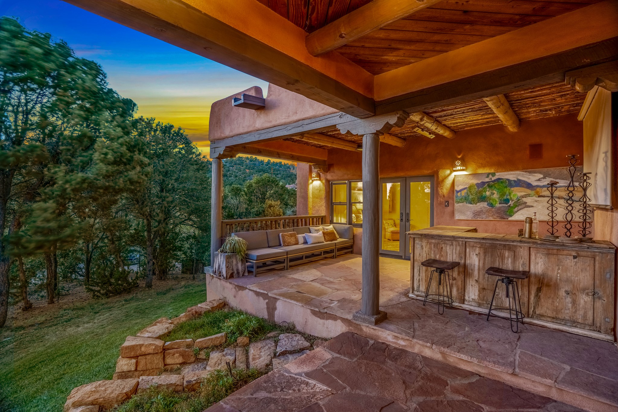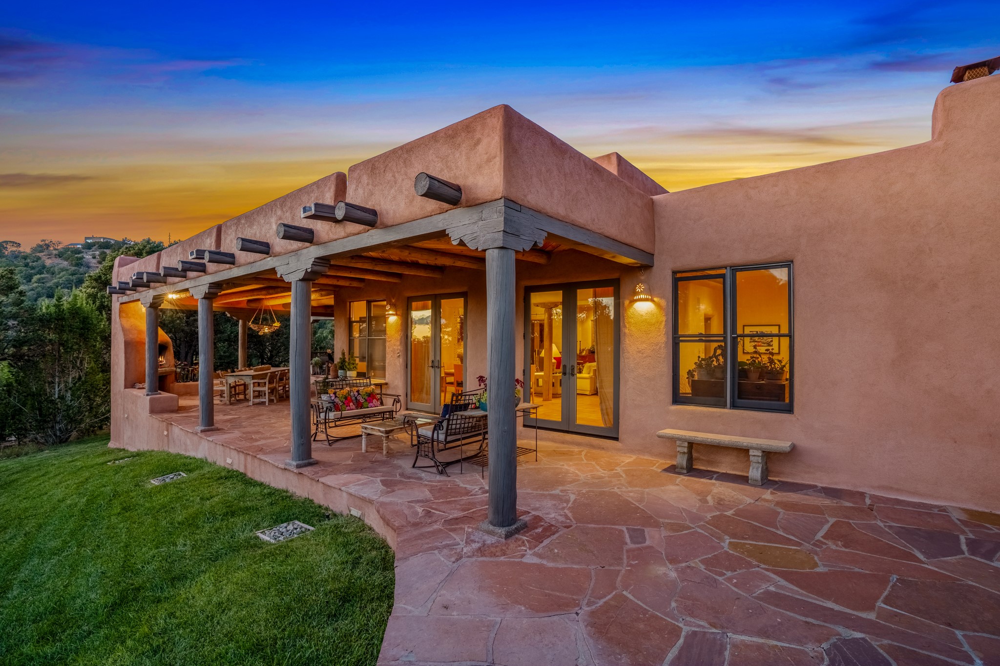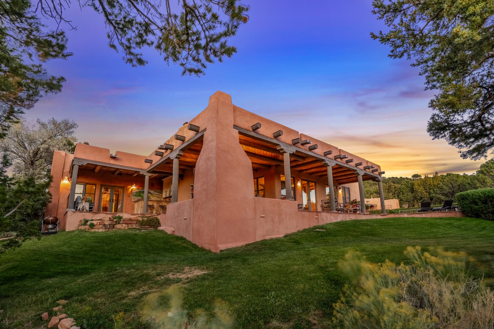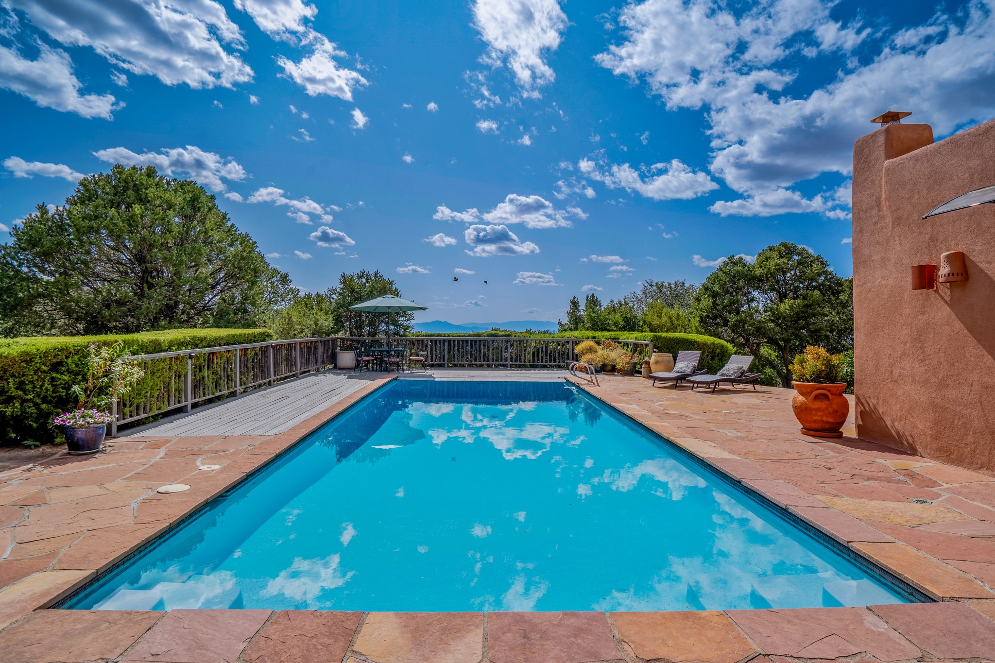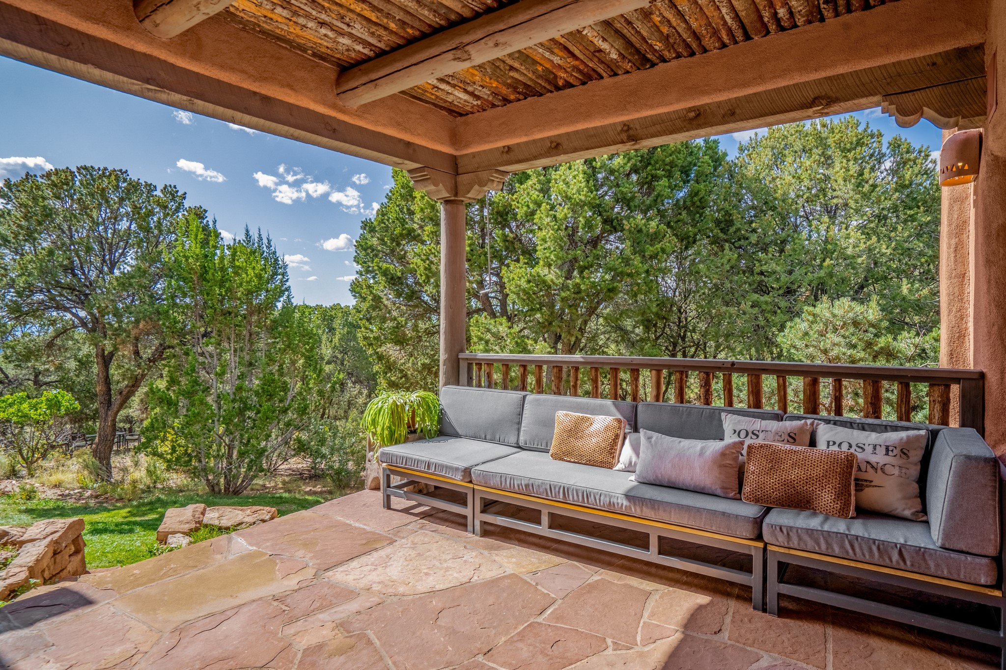 Nestled in the Santa Fe foothills and only 5 miles to the Plaza lies a magnificent representation of Pueblo Revival architecture; an adobe home that enjoys maximum privacy, located on a 5 acre densely wooded and entirely fenced property, with spectacular views. This unique home, built in 1997, consists of a main house, a guest house, expansive outdoor portals, pool, in-ground hot tub and a detached garage. The fountain courtyard entrance sets the tone for this special home. Upon stepping into the 4,100 sq ft main house, you begin by experiencing this unique rendition with its 16 ft coved vigas ceilings, a shepherd's fireplace and abundant natural light. The living area opens onto the dramatic South-facing portal that encompasses sitting and dining areas, as well as a media/bar for your outdoor entertainment. The kitchen is the heart of this spectacular house with a raised wood burning fireplace, maple countertops, a bar and a pass through to the attached den. The primary suite is located in the West wing of the property and includes a large office, which opens to the portal, and a lovely bedroom with a kiva fireplace and private balcony. The beautifully renovated bathroom includes a 2-person air tub, a steam shower, its own fireplace and access to the central courtyard. The East wing has a guest bedroom with a full ensuite bathroom and a third very large bedroom, presently used as a flex room and plumbed for an additional bathroom. The stunning pool area is that of a Southwestern resort with a deep pool, in-ground hot tub and panoramic views. The lovely 820 sq ft 1 bedroom, detached guest house enjoys its own portal, a full kitchen and steam shower. 96 Double Arrow has the heart of Spain and the soul of Santa Fe embedded in each handmade adobe brick, a rare opportunity to purchase an authentic foothills adobe hacienda just minutes from downtown Santa Fe.