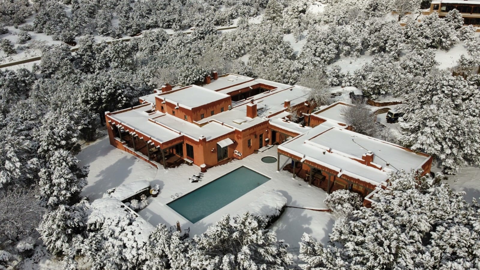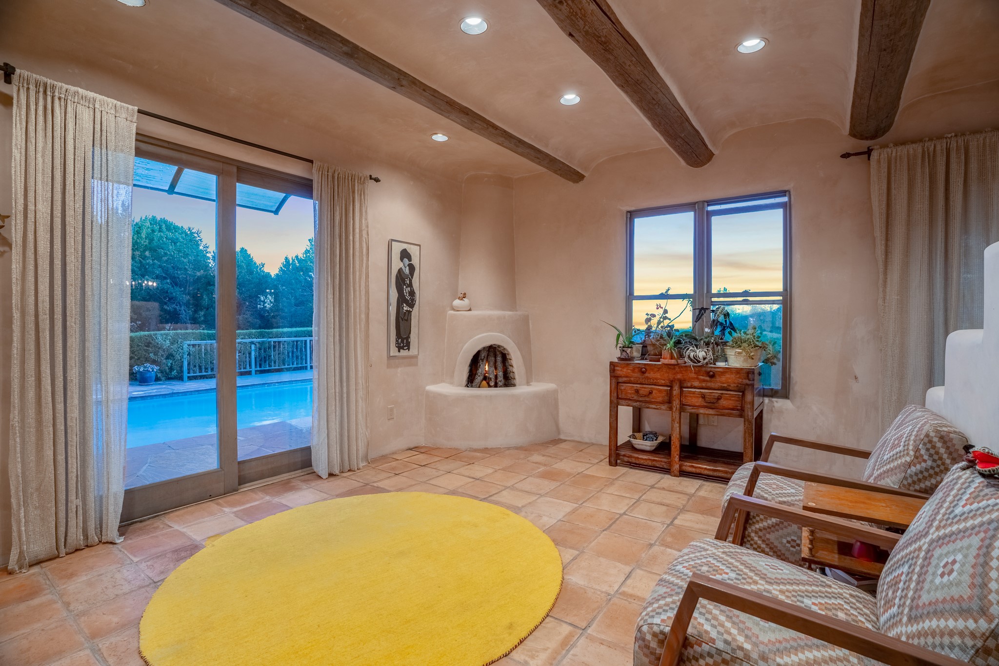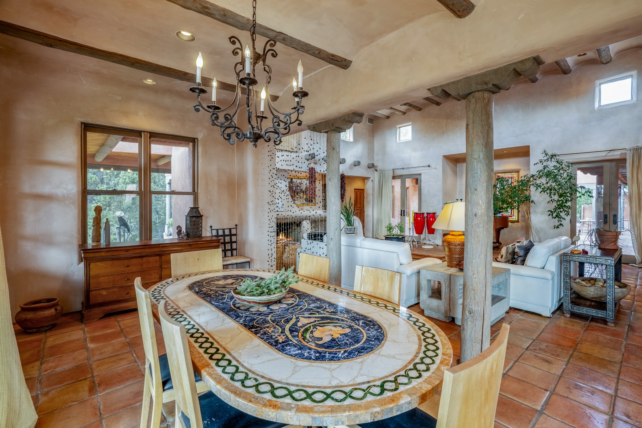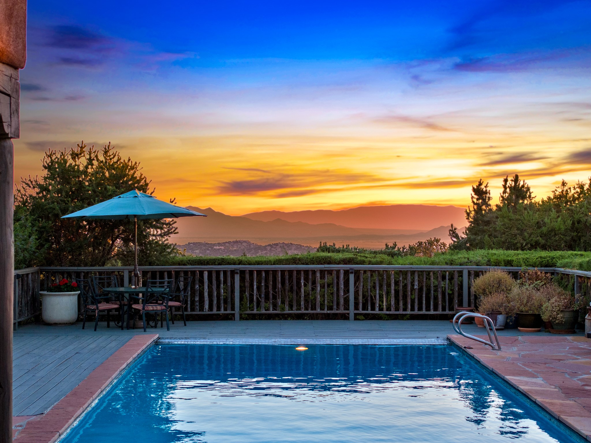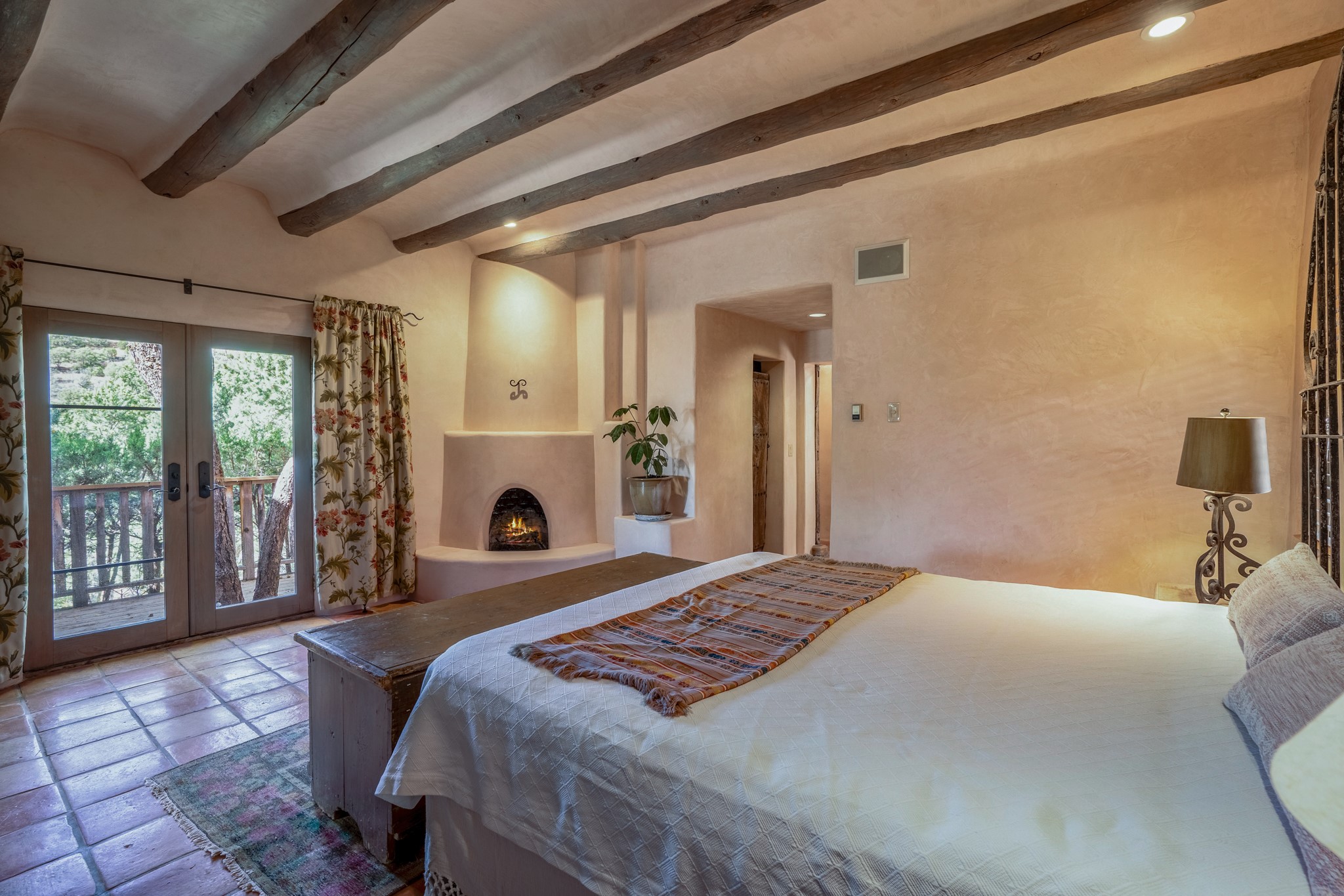 Nestled in the Santa Fe foothills and only 5 miles to the Plaza lies a magnificent representation of Pueblo Revival architecture; an adobe home that enjoys maximum privacy, located on a 5 acre densely wooded and entirely fenced property, with spectacular views. This unique home, built in 1997, consists of a main house, a guest house, expansive outdoor portals, pool, in-ground hot tub and a detached garage. The fountain courtyard entrance sets the tone for this special home. Upon stepping into the 4,100 sq ft main house, you begin by experiencing this unique rendition with its 16 ft coved vigas ceilings, a shepherd's fireplace and abundant natural light. The living area opens onto the dramatic South-facing portal that encompasses sitting and dining areas, as well as a media/bar for your outdoor entertainment. The kitchen is the heart of this spectacular house with a raised wood burning fireplace, maple countertops, a bar and a pass through to the attached den. The primary suite is located in the West wing of the property and includes a large office, which opens to the portal, and a lovely bedroom with a kiva fireplace and private balcony. The beautifully renovated bathroom includes a 2-person air tub, a steam shower, its own fireplace and access to the central courtyard. The East wing has a guest bedroom with a full ensuite bathroom and a third very large bedroom, presently used as a flex room and plumbed for an additional bathroom. The stunning pool area is that of a Southwestern resort with a deep pool, in-ground hot tub and panoramic views. The lovely 820 sq ft 1 bedroom, detached guest house enjoys its own portal, a full kitchen and steam shower. 96 Double Arrow has the heart of Spain and the soul of Santa Fe embedded in each handmade adobe brick, a rare opportunity to purchase an authentic foothills adobe hacienda just minutes from downtown Santa Fe.