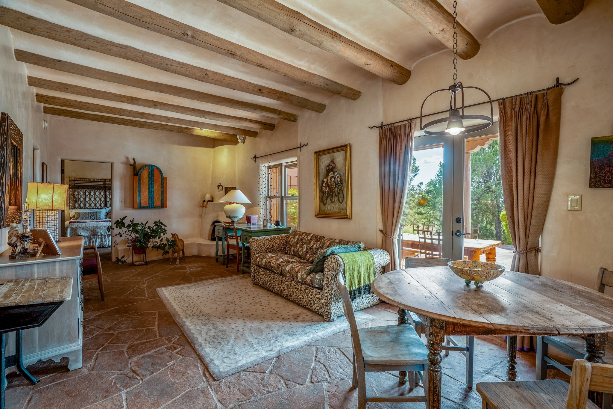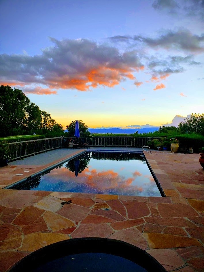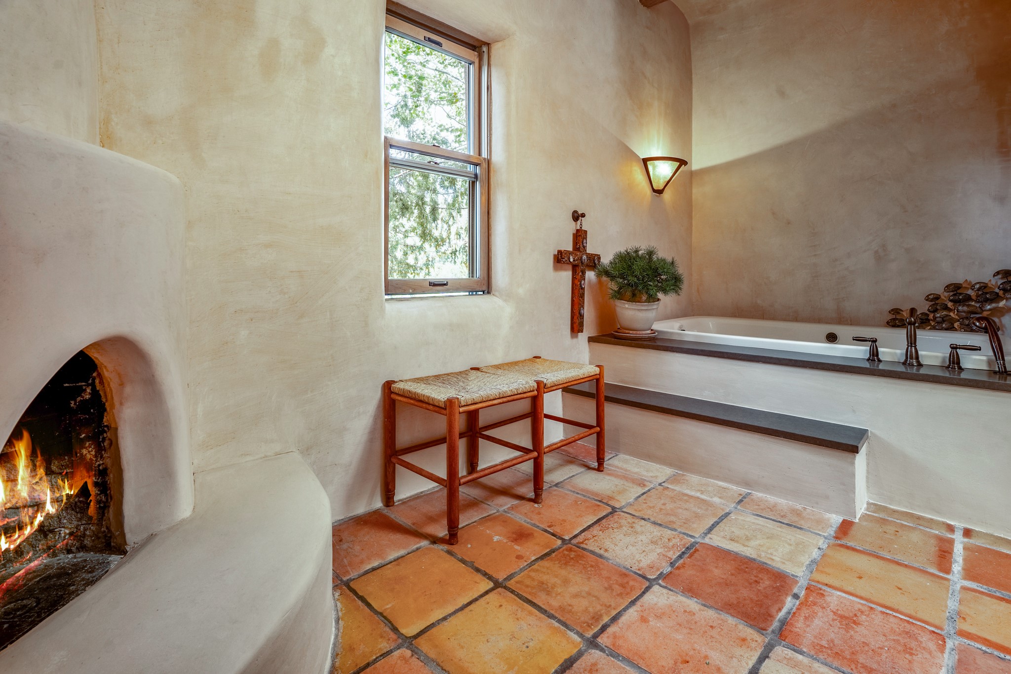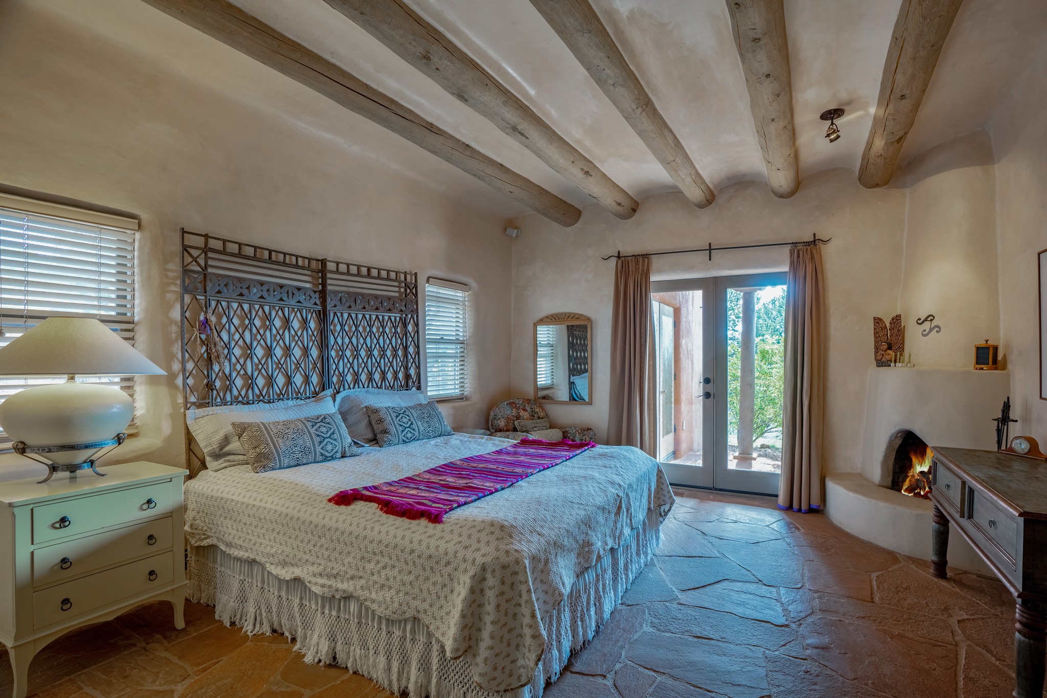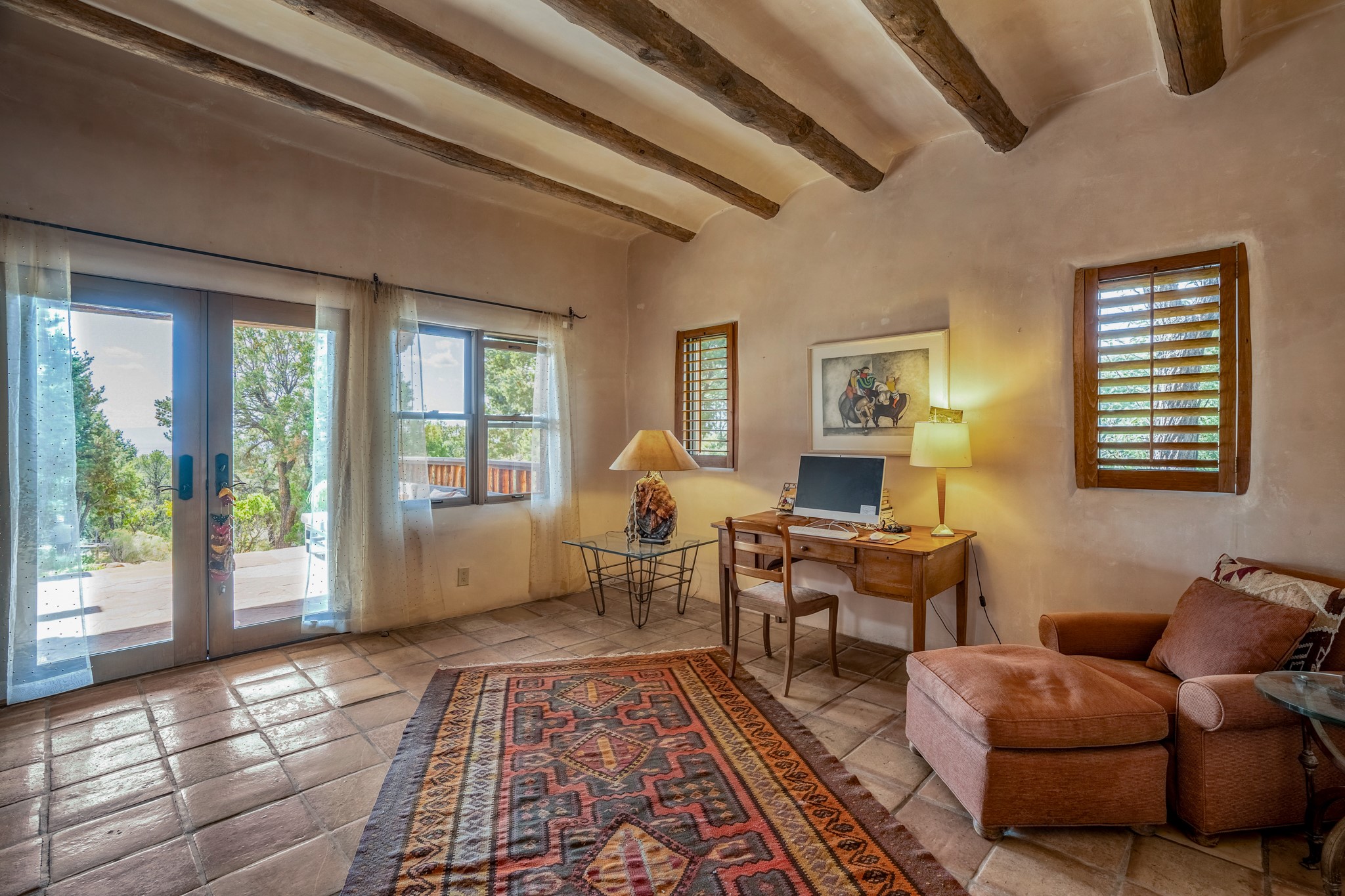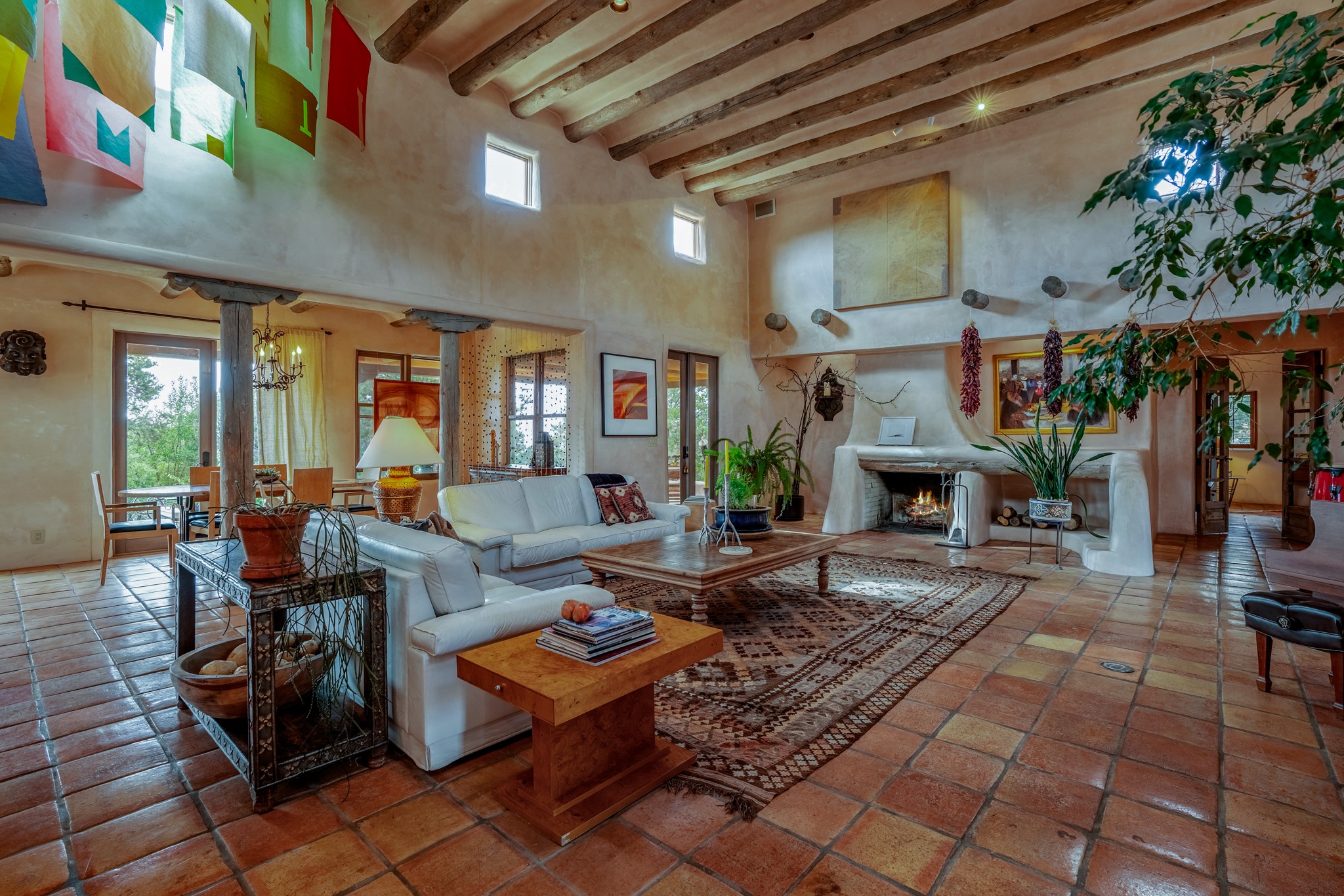 Nestled in the Santa Fe foothills and only 5 miles to the Plaza lies a magnificent representation of Pueblo Revival architecture; an adobe home that enjoys maximum privacy, located on a 5 acre densely wooded and entirely fenced property, with spectacular views. This unique home, built in 1997, consists of a main house, a guest house, expansive outdoor portals, pool, in-ground hot tub and a detached garage. The fountain courtyard entrance sets the tone for this special home. Upon stepping into the 4,100 sq ft main house, you begin by experiencing this unique rendition with its 16 ft coved vigas ceilings, a shepherd's fireplace and abundant natural light. The living area opens onto the dramatic South-facing portal that encompasses sitting and dining areas, as well as a media/bar for your outdoor entertainment. The kitchen is the heart of this spectacular house with a raised wood burning fireplace, maple countertops, a bar and a pass through to the attached den. The primary suite is located in the West wing of the property and includes a large office, which opens to the portal, and a lovely bedroom with a kiva fireplace and private balcony. The beautifully renovated bathroom includes a 2-person air tub, a steam shower, its own fireplace and access to the central courtyard. The East wing has a guest bedroom with a full ensuite bathroom and a third very large bedroom, presently used as a flex room and plumbed for an additional bathroom. The stunning pool area is that of a Southwestern resort with a deep pool, in-ground hot tub and panoramic views. The lovely 820 sq ft 1 bedroom, detached guest house enjoys its own portal, a full kitchen and steam shower. 96 Double Arrow has the heart of Spain and the soul of Santa Fe embedded in each handmade adobe brick, a rare opportunity to purchase an authentic foothills adobe hacienda just minutes from downtown Santa Fe.