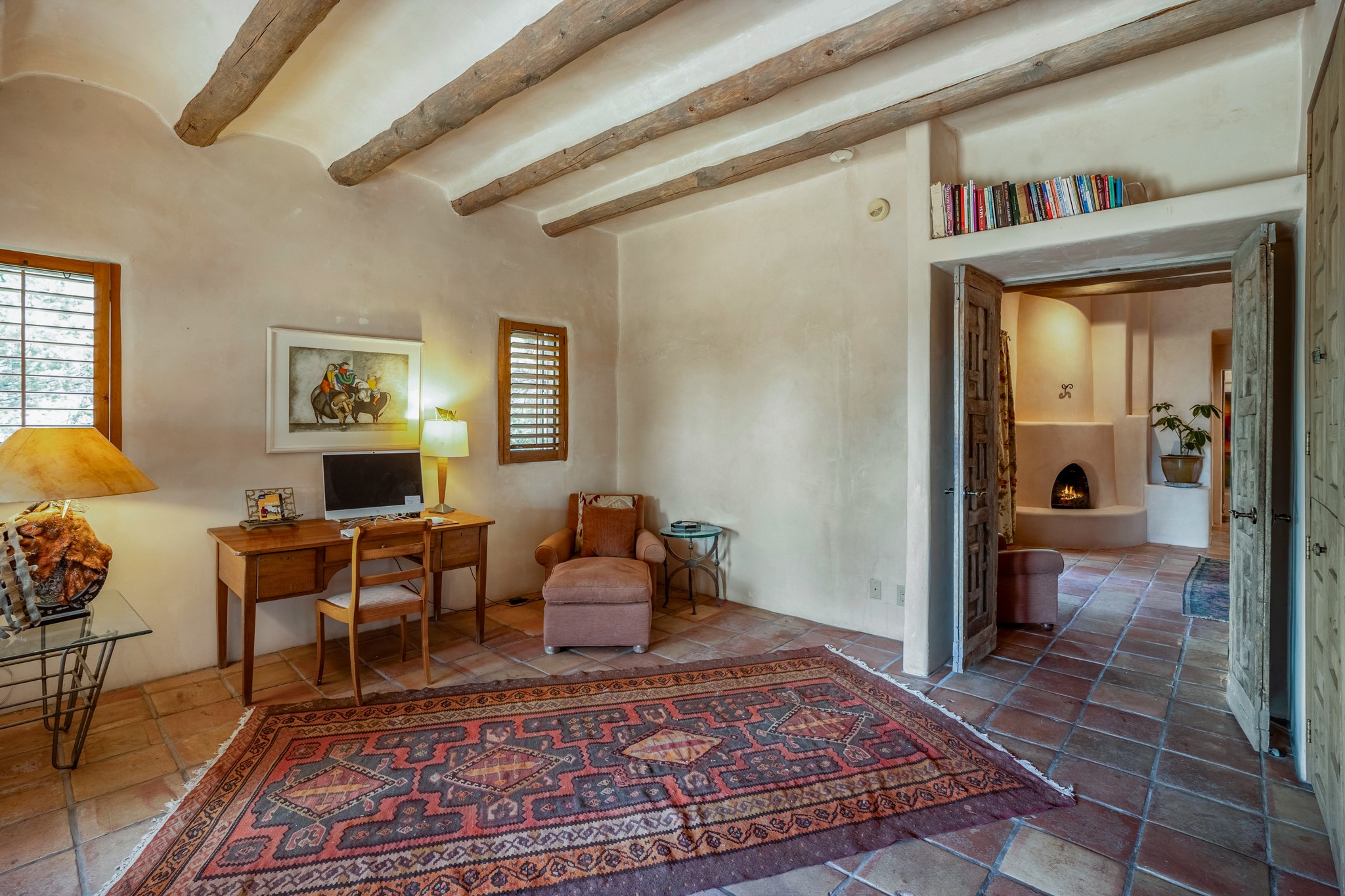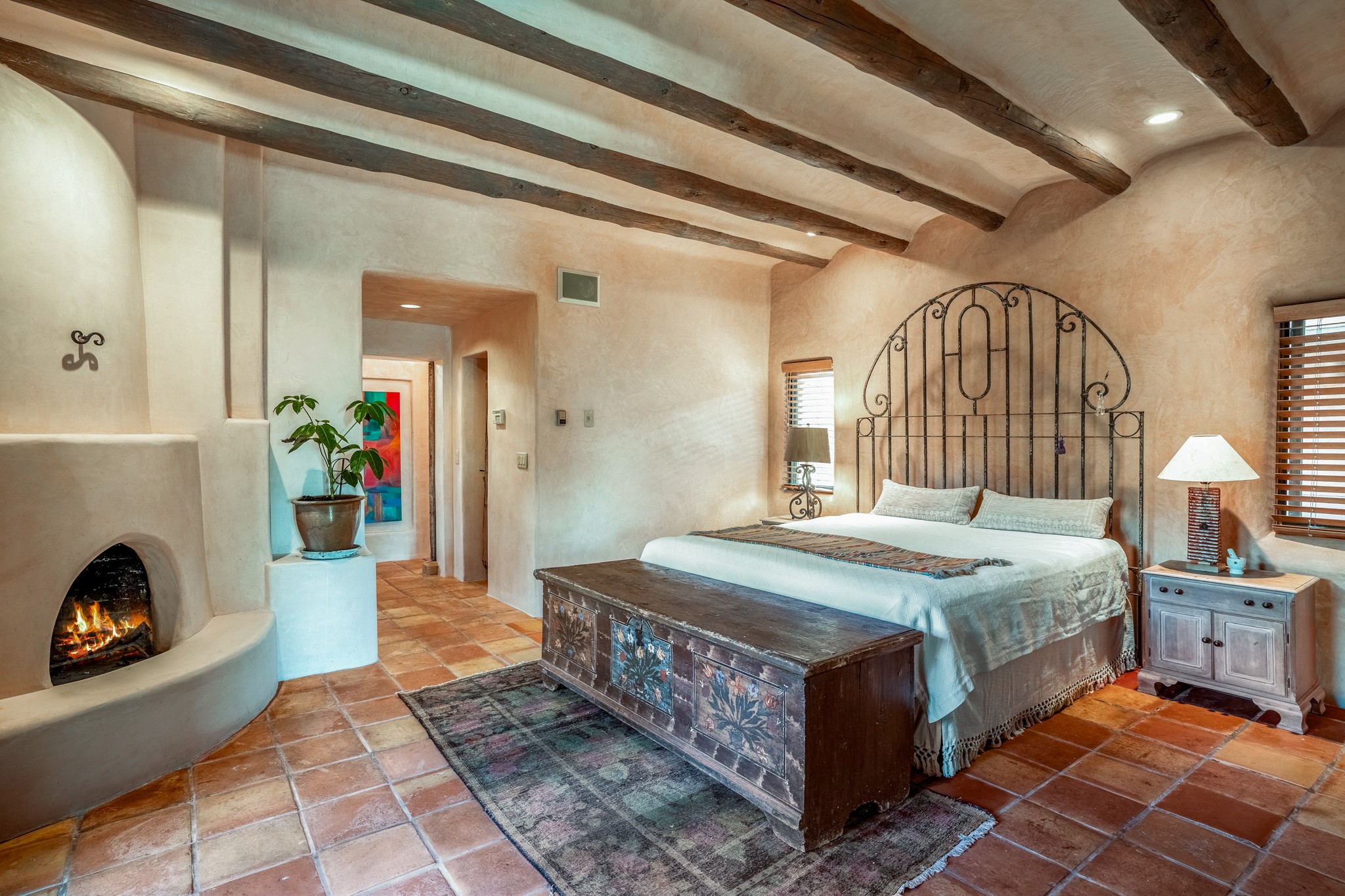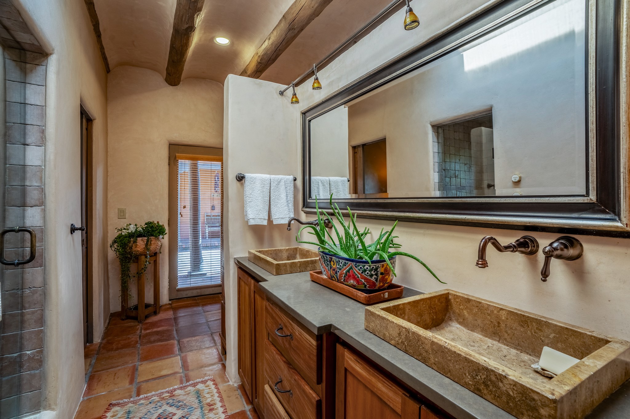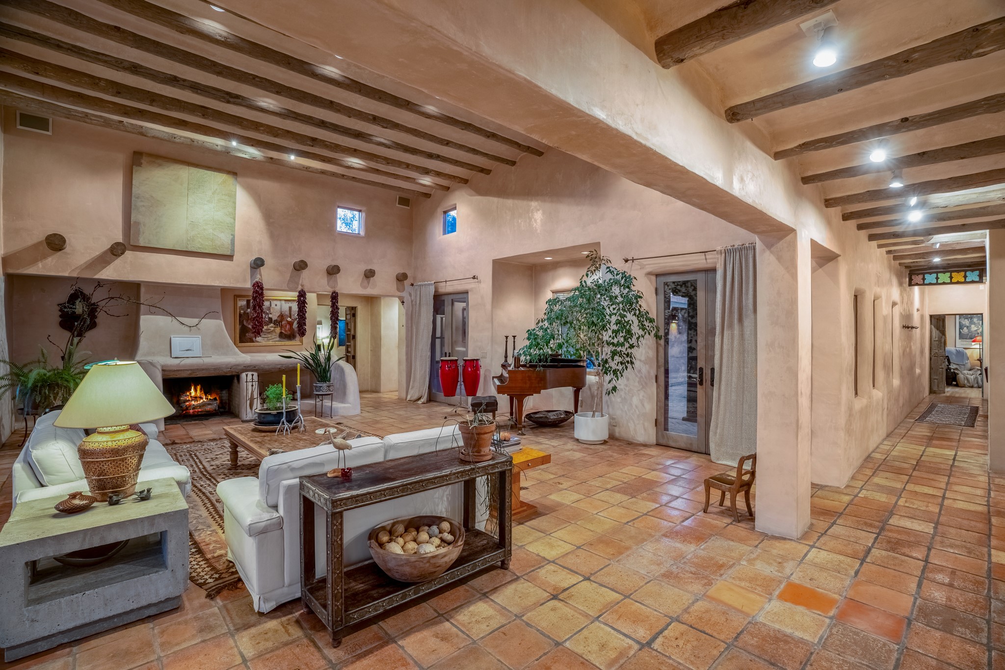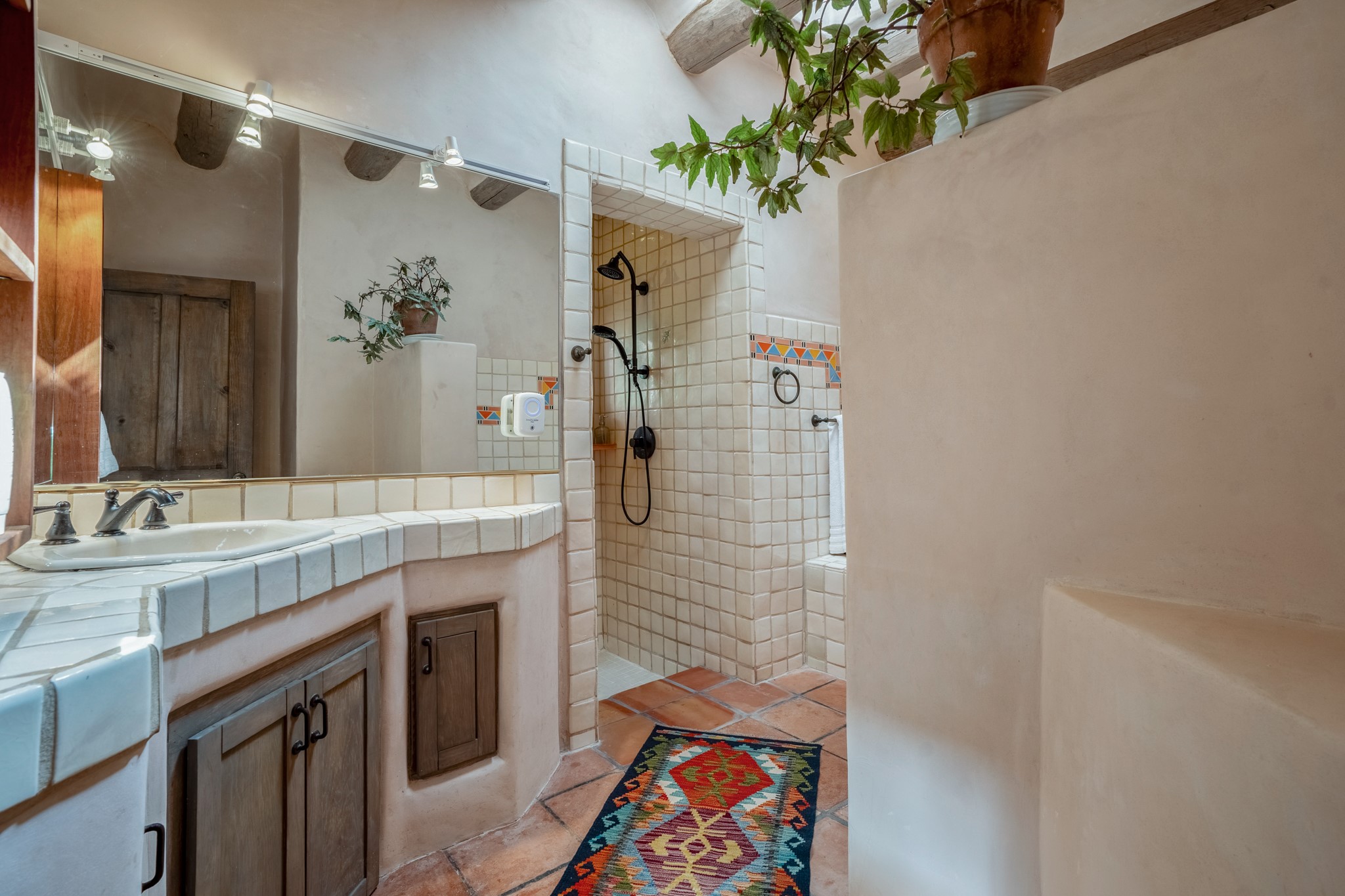 Nestled in the Santa Fe foothills and only 5 miles to the Plaza lies a magnificent representation of Pueblo Revival architecture; an adobe home that enjoys maximum privacy, located on a 5 acre densely wooded and entirely fenced property, with spectacular views. This unique home, built in 1997, consists of a main house, a guest house, expansive outdoor portals, pool, in-ground hot tub and a detached garage. The fountain courtyard entrance sets the tone for this special home. Upon stepping into the 4,100 sq ft main house, you begin by experiencing this unique rendition with its 16 ft coved vigas ceilings, a shepherd's fireplace and abundant natural light. The living area opens onto the dramatic South-facing portal that encompasses sitting and dining areas, as well as a media/bar for your outdoor entertainment. The kitchen is the heart of this spectacular house with a raised wood burning fireplace, maple countertops, a bar and a pass through to the attached den. The primary suite is located in the West wing of the property and includes a large office, which opens to the portal, and a lovely bedroom with a kiva fireplace and private balcony. The beautifully renovated bathroom includes a 2-person air tub, a steam shower, its own fireplace and access to the central courtyard. The East wing has a guest bedroom with a full ensuite bathroom and a third very large bedroom, presently used as a flex room and plumbed for an additional bathroom. The stunning pool area is that of a Southwestern resort with a deep pool, in-ground hot tub and panoramic views. The lovely 820 sq ft 1 bedroom, detached guest house enjoys its own portal, a full kitchen and steam shower. 96 Double Arrow has the heart of Spain and the soul of Santa Fe embedded in each handmade adobe brick, a rare opportunity to purchase an authentic foothills adobe hacienda just minutes from downtown Santa Fe.