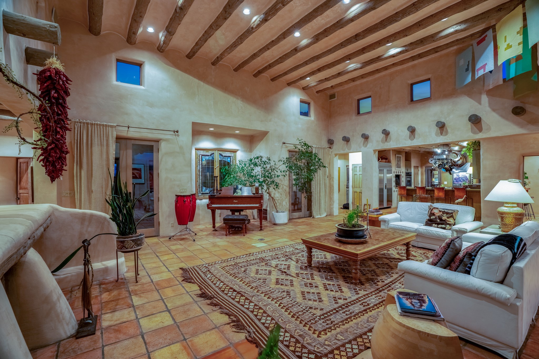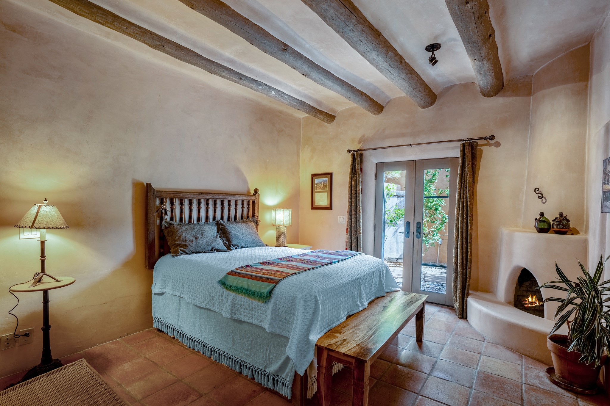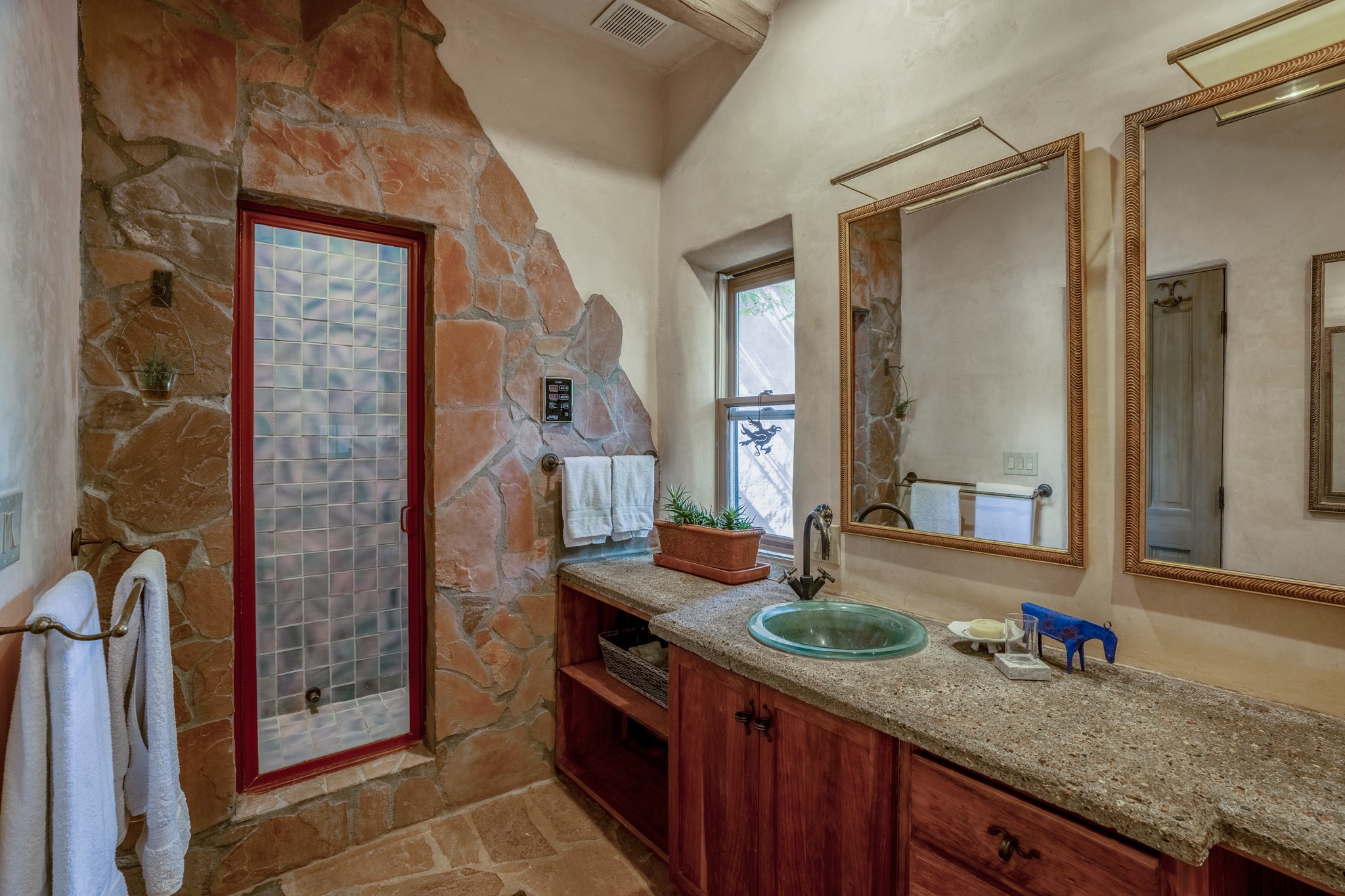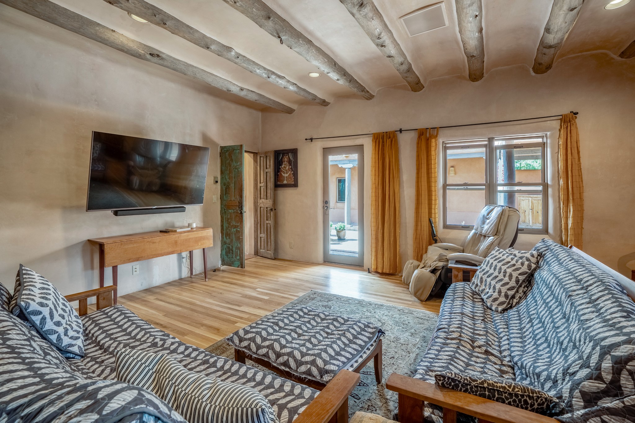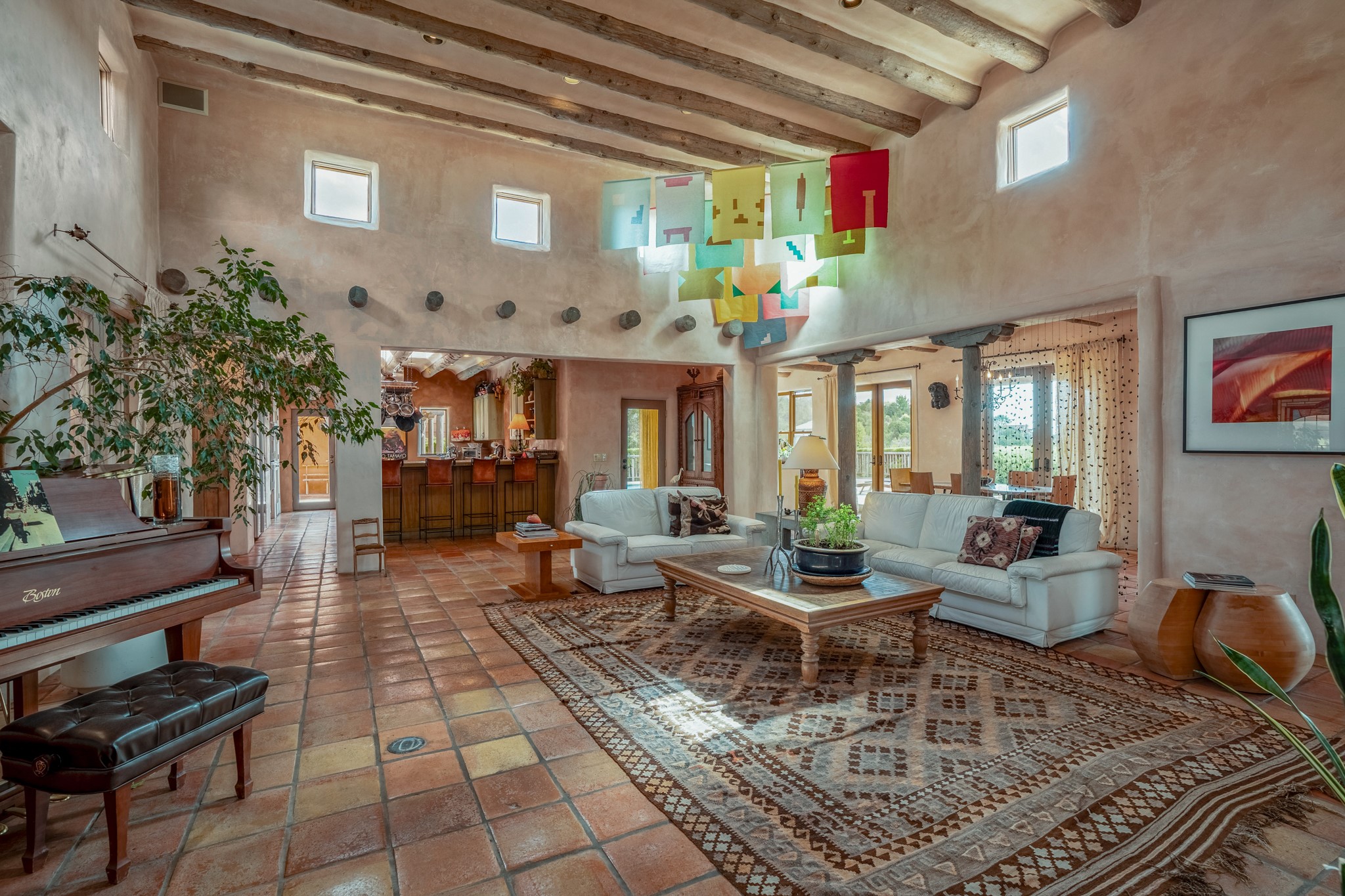 Nestled in the Santa Fe foothills and only 5 miles to the Plaza lies a magnificent representation of Pueblo Revival architecture; an adobe home that enjoys maximum privacy, located on a 5 acre densely wooded and entirely fenced property, with spectacular views. This unique home, built in 1997, consists of a main house, a guest house, expansive outdoor portals, pool, in-ground hot tub and a detached garage. The fountain courtyard entrance sets the tone for this special home. Upon stepping into the 4,100 sq ft main house, you begin by experiencing this unique rendition with its 16 ft coved vigas ceilings, a shepherd's fireplace and abundant natural light. The living area opens onto the dramatic South-facing portal that encompasses sitting and dining areas, as well as a media/bar for your outdoor entertainment. The kitchen is the heart of this spectacular house with a raised wood burning fireplace, maple countertops, a bar and a pass through to the attached den. The primary suite is located in the West wing of the property and includes a large office, which opens to the portal, and a lovely bedroom with a kiva fireplace and private balcony. The beautifully renovated bathroom includes a 2-person air tub, a steam shower, its own fireplace and access to the central courtyard. The East wing has a guest bedroom with a full ensuite bathroom and a third very large bedroom, presently used as a flex room and plumbed for an additional bathroom. The stunning pool area is that of a Southwestern resort with a deep pool, in-ground hot tub and panoramic views. The lovely 820 sq ft 1 bedroom, detached guest house enjoys its own portal, a full kitchen and steam shower. 96 Double Arrow has the heart of Spain and the soul of Santa Fe embedded in each handmade adobe brick, a rare opportunity to purchase an authentic foothills adobe hacienda just minutes from downtown Santa Fe.