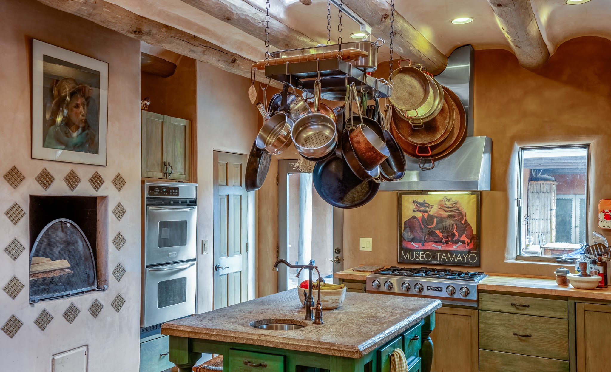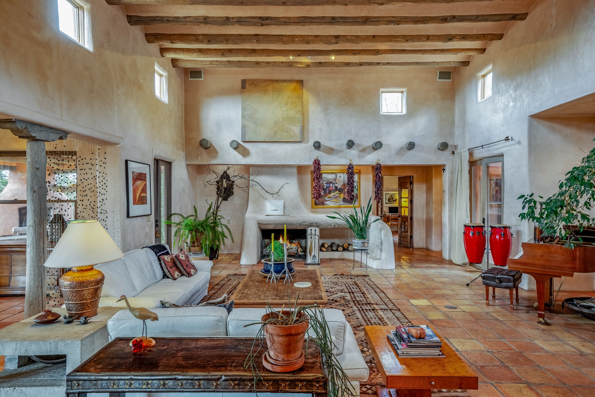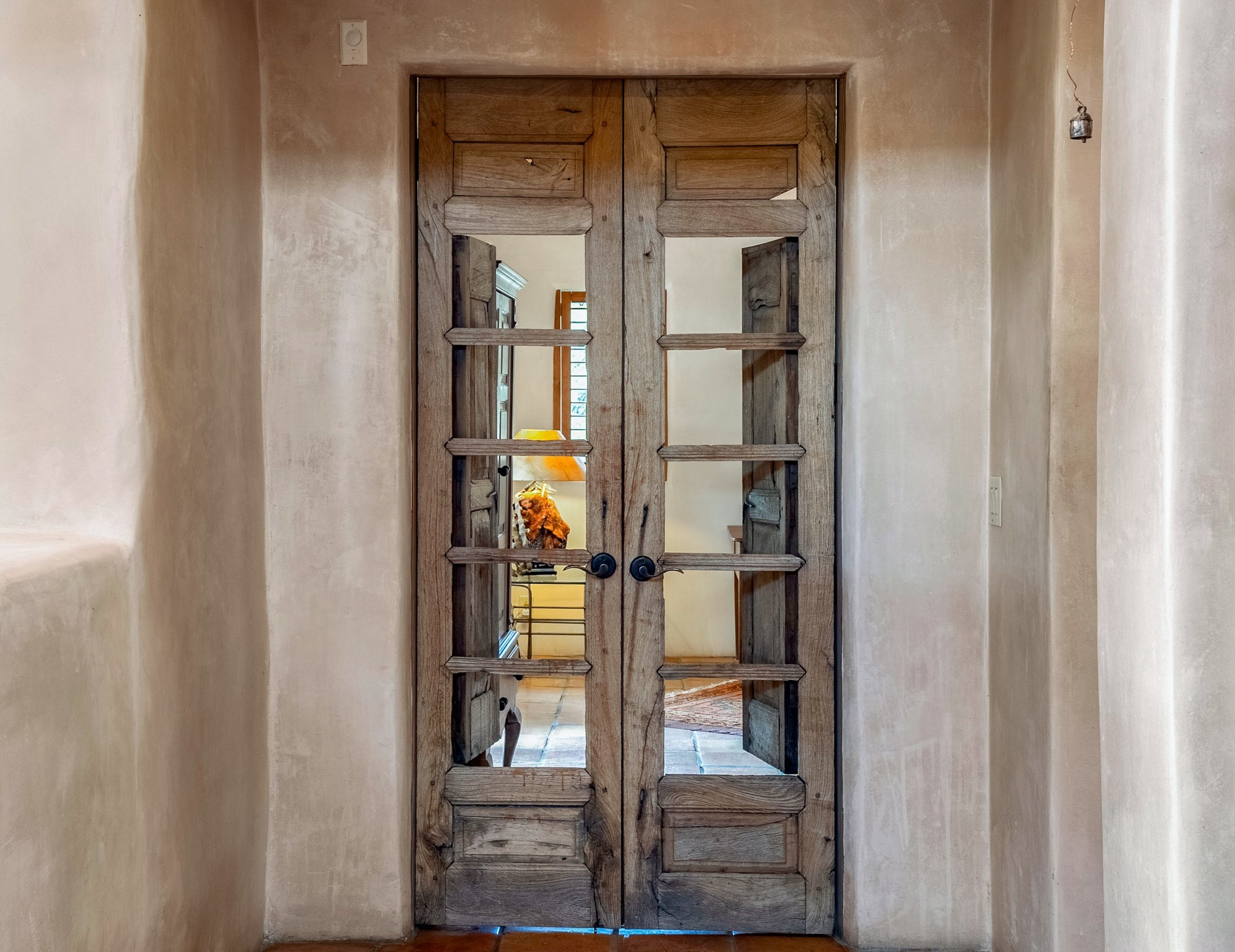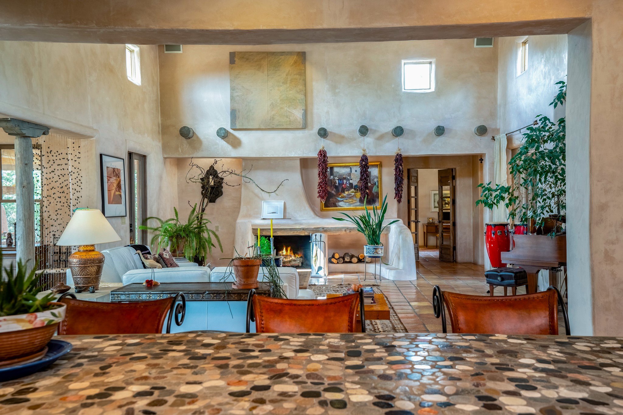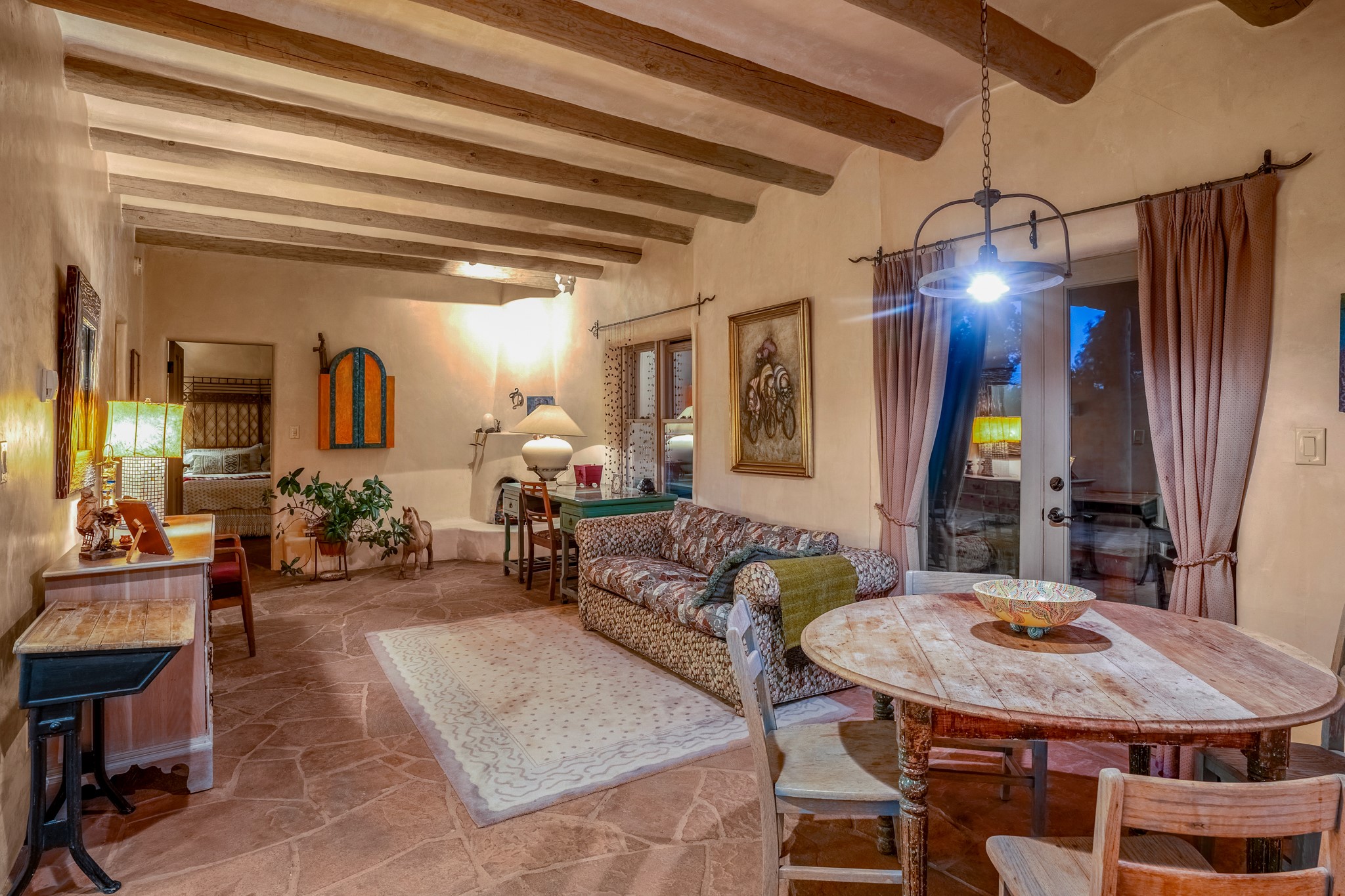 Nestled in the Santa Fe foothills and only 5 miles to the Plaza lies a magnificent representation of Pueblo Revival architecture; an adobe home that enjoys maximum privacy, located on a 5 acre densely wooded and entirely fenced property, with spectacular views. This unique home, built in 1997, consists of a main house, a guest house, expansive outdoor portals, pool, in-ground hot tub and a detached garage. The fountain courtyard entrance sets the tone for this special home. Upon stepping into the 4,100 sq ft main house, you begin by experiencing this unique rendition with its 16 ft coved vigas ceilings, a shepherd's fireplace and abundant natural light. The living area opens onto the dramatic South-facing portal that encompasses sitting and dining areas, as well as a media/bar for your outdoor entertainment. The kitchen is the heart of this spectacular house with a raised wood burning fireplace, maple countertops, a bar and a pass through to the attached den. The primary suite is located in the West wing of the property and includes a large office, which opens to the portal, and a lovely bedroom with a kiva fireplace and private balcony. The beautifully renovated bathroom includes a 2-person air tub, a steam shower, its own fireplace and access to the central courtyard. The East wing has a guest bedroom with a full ensuite bathroom and a third very large bedroom, presently used as a flex room and plumbed for an additional bathroom. The stunning pool area is that of a Southwestern resort with a deep pool, in-ground hot tub and panoramic views. The lovely 820 sq ft 1 bedroom, detached guest house enjoys its own portal, a full kitchen and steam shower. 96 Double Arrow has the heart of Spain and the soul of Santa Fe embedded in each handmade adobe brick, a rare opportunity to purchase an authentic foothills adobe hacienda just minutes from downtown Santa Fe.