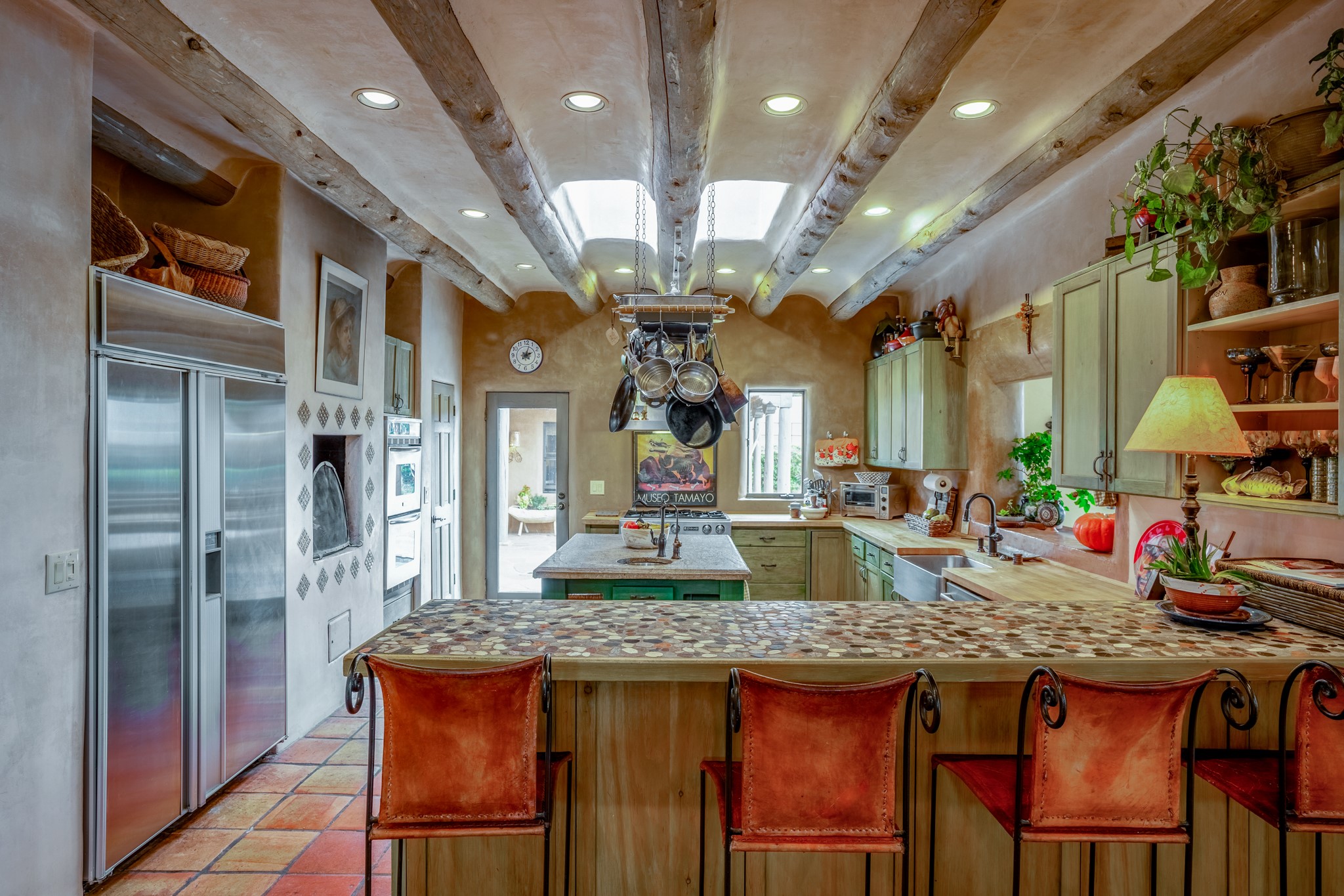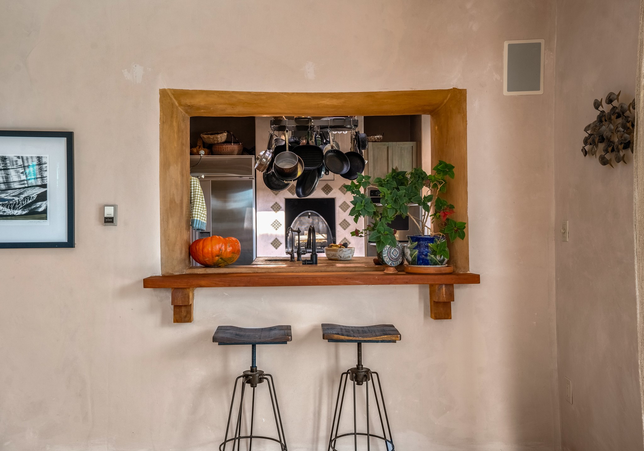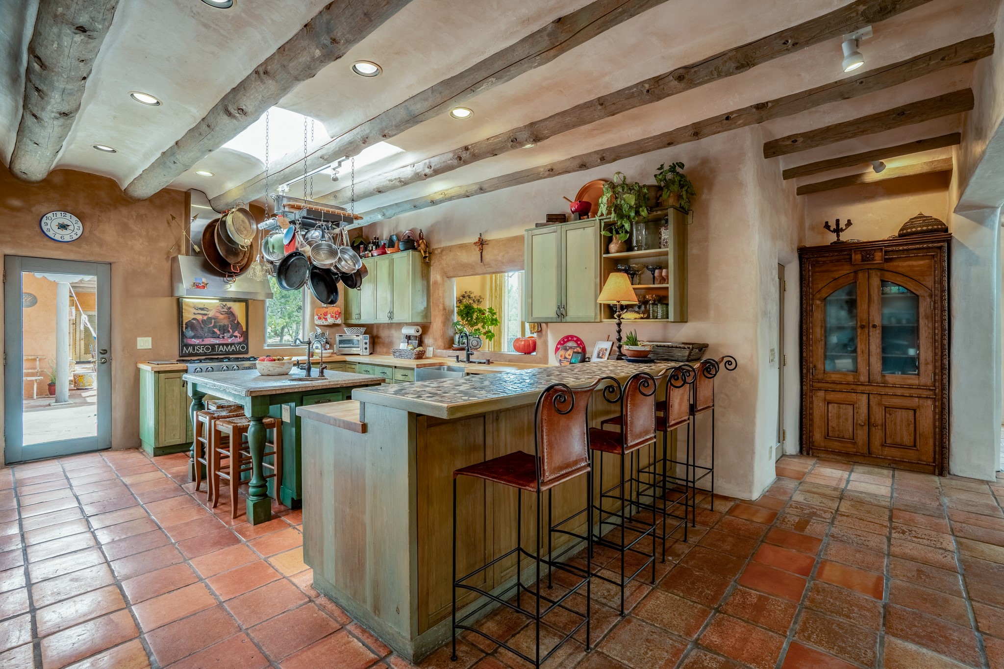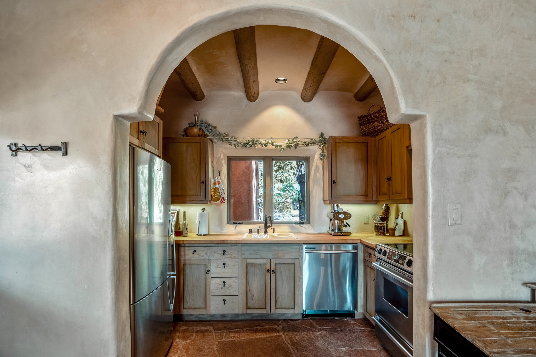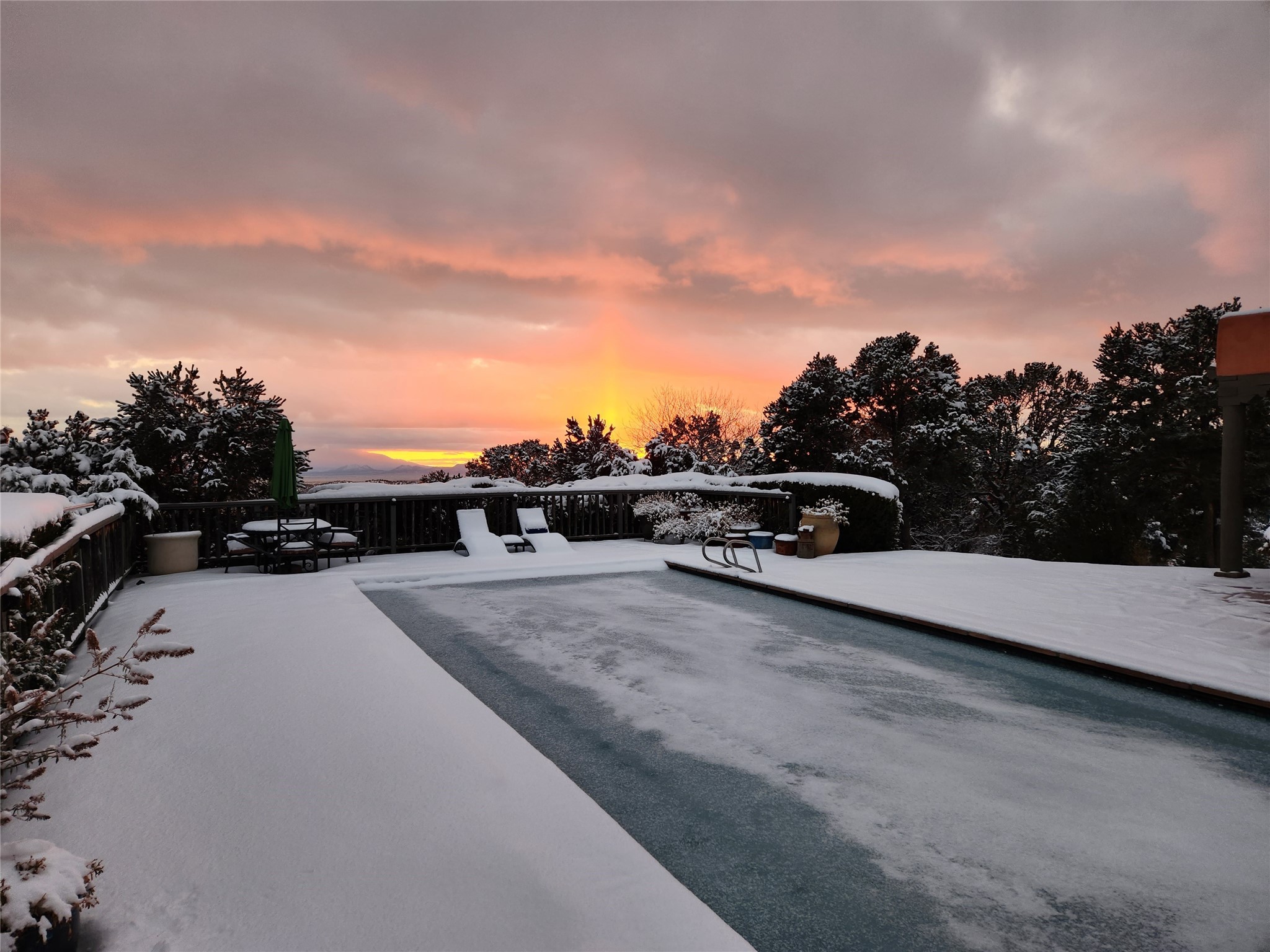Nestled in the Santa Fe foothills and only 5 miles to the Plaza lies a magnificent representation of Pueblo Revival architecture; an adobe home that enjoys maximum privacy, located on a 5 acre densely wooded and entirely fenced property, with spectacular views. This unique home, built in 1997, consists of a main house, a guest house, expansive outdoor portals, pool, in-ground hot tub and a detached garage. The fountain courtyard entrance sets the tone for this special home. Upon stepping into the 4,100 sq ft main house, you begin by experiencing this unique rendition with its 16 ft coved vigas ceilings, a shepherd's fireplace and abundant natural light. The living area opens onto the dramatic South-facing portal that encompasses sitting and dining areas, as well as a media/bar for your outdoor entertainment. The kitchen is the heart of this spectacular house with a raised wood burning fireplace, maple countertops, a bar and a pass through to the attached den. The primary suite is located in the West wing of the property and includes a large office, which opens to the portal, and a lovely bedroom with a kiva fireplace and private balcony. The beautifully renovated bathroom includes a 2-person air tub, a steam shower, its own fireplace and access to the central courtyard. The East wing has a guest bedroom with a full ensuite bathroom and a third very large bedroom, presently used as a flex room and plumbed for an additional bathroom. The stunning pool area is that of a Southwestern resort with a deep pool, in-ground hot tub and panoramic views. The lovely 820 sq ft 1 bedroom, detached guest house enjoys its own portal, a full kitchen and steam shower. 96 Double Arrow has the heart of Spain and the soul of Santa Fe embedded in each handmade adobe brick, a rare opportunity to purchase an authentic foothills adobe hacienda just minutes from downtown Santa Fe.