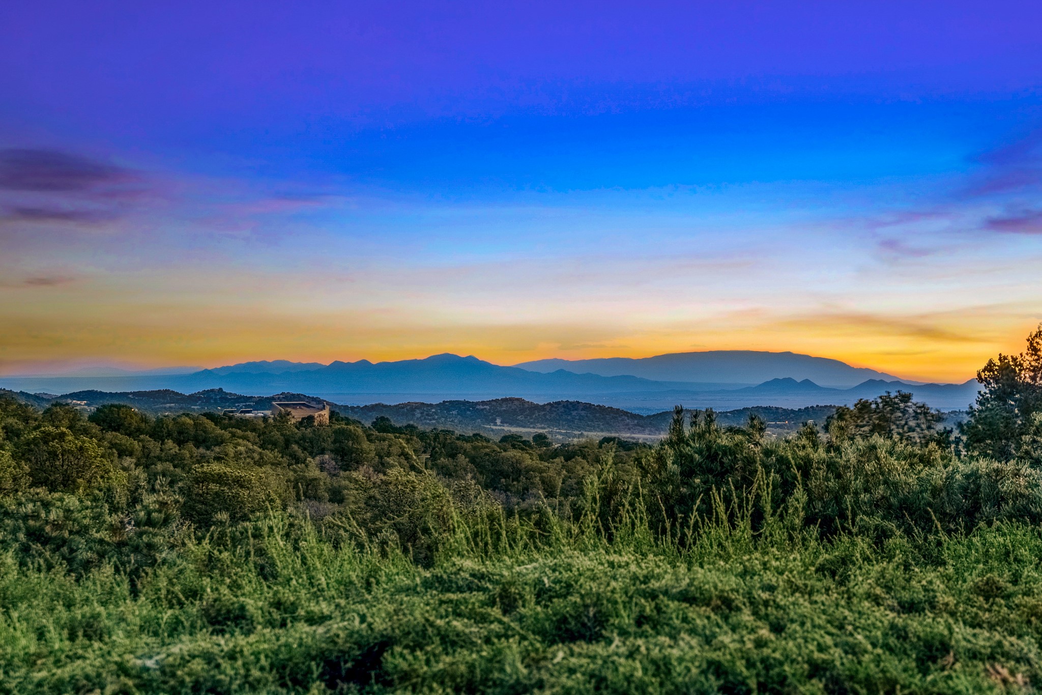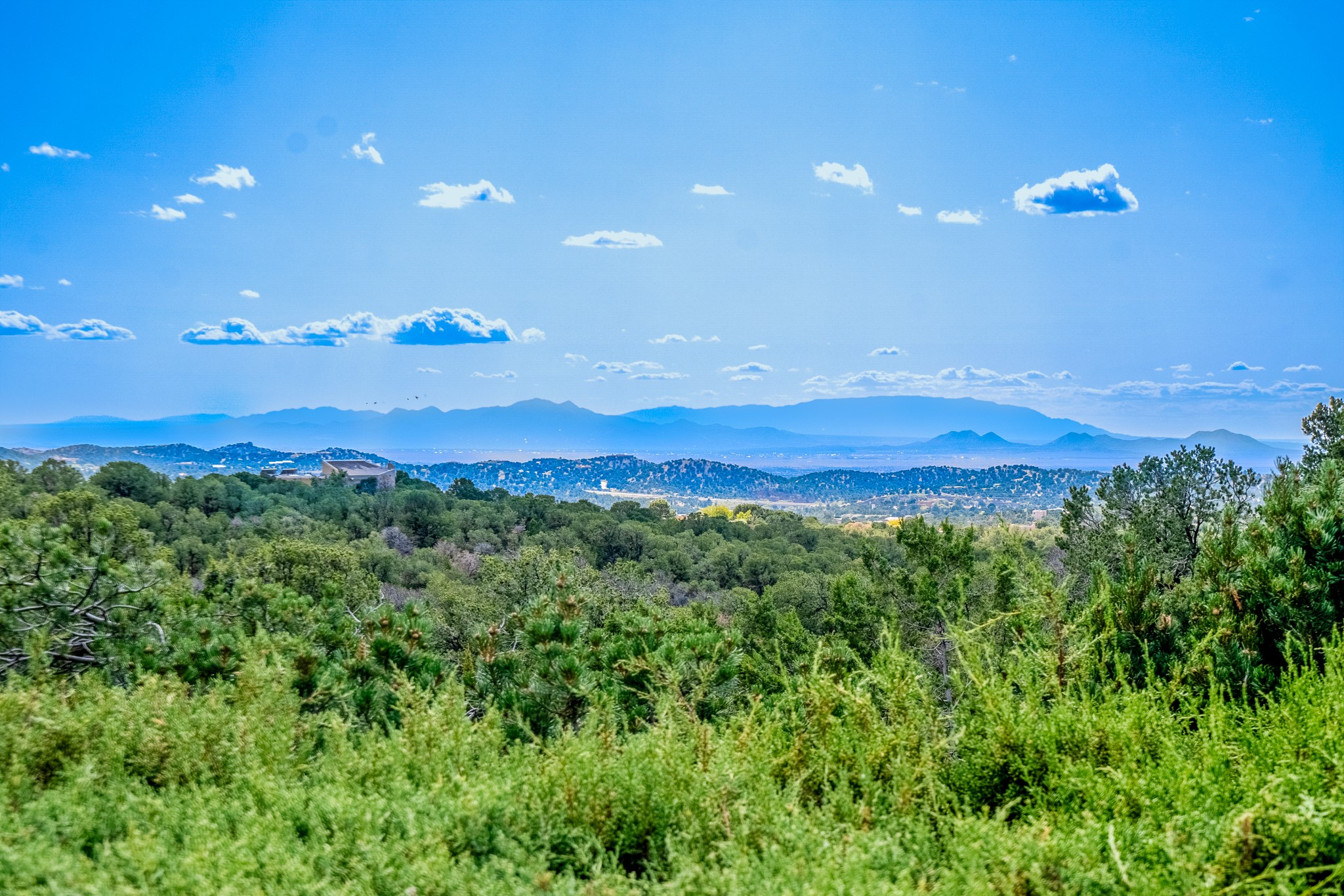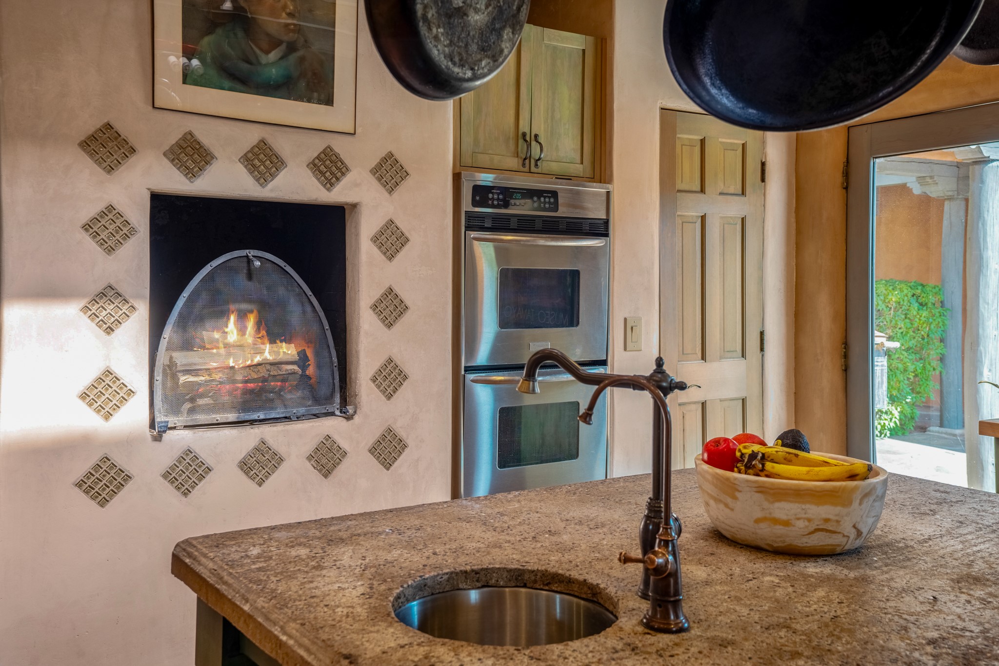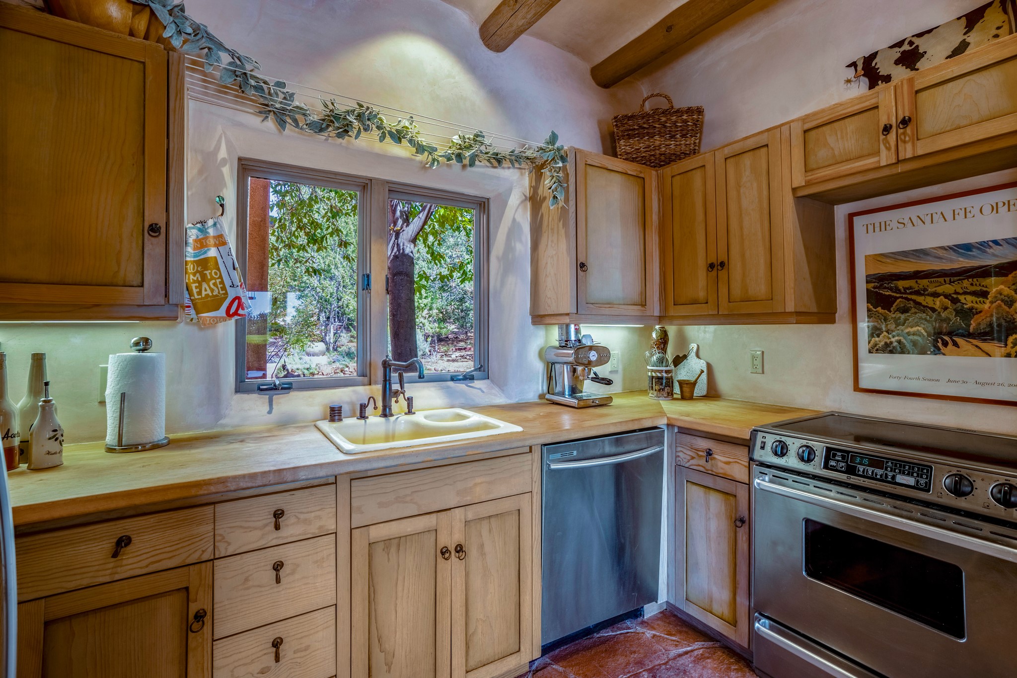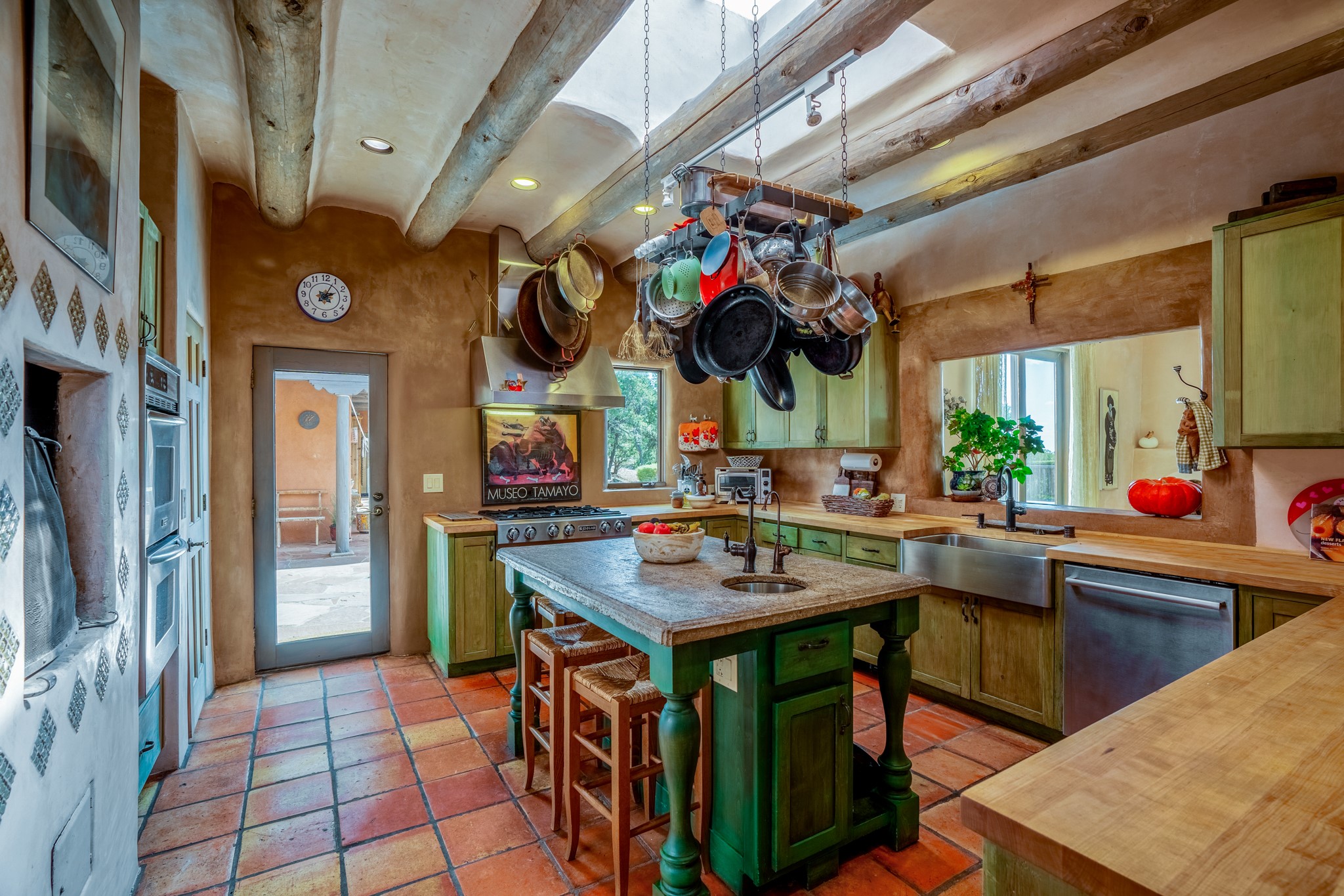 Nestled in the Santa Fe foothills and only 5 miles to the Plaza lies a magnificent representation of Pueblo Revival architecture; an adobe home that enjoys maximum privacy, located on a 5 acre densely wooded and entirely fenced property, with spectacular views. This unique home, built in 1997, consists of a main house, a guest house, expansive outdoor portals, pool, in-ground hot tub and a detached garage. The fountain courtyard entrance sets the tone for this special home. Upon stepping into the 4,100 sq ft main house, you begin by experiencing this unique rendition with its 16 ft coved vigas ceilings, a shepherd's fireplace and abundant natural light. The living area opens onto the dramatic South-facing portal that encompasses sitting and dining areas, as well as a media/bar for your outdoor entertainment. The kitchen is the heart of this spectacular house with a raised wood burning fireplace, maple countertops, a bar and a pass through to the attached den. The primary suite is located in the West wing of the property and includes a large office, which opens to the portal, and a lovely bedroom with a kiva fireplace and private balcony. The beautifully renovated bathroom includes a 2-person air tub, a steam shower, its own fireplace and access to the central courtyard. The East wing has a guest bedroom with a full ensuite bathroom and a third very large bedroom, presently used as a flex room and plumbed for an additional bathroom. The stunning pool area is that of a Southwestern resort with a deep pool, in-ground hot tub and panoramic views. The lovely 820 sq ft 1 bedroom, detached guest house enjoys its own portal, a full kitchen and steam shower. 96 Double Arrow has the heart of Spain and the soul of Santa Fe embedded in each handmade adobe brick, a rare opportunity to purchase an authentic foothills adobe hacienda just minutes from downtown Santa Fe.