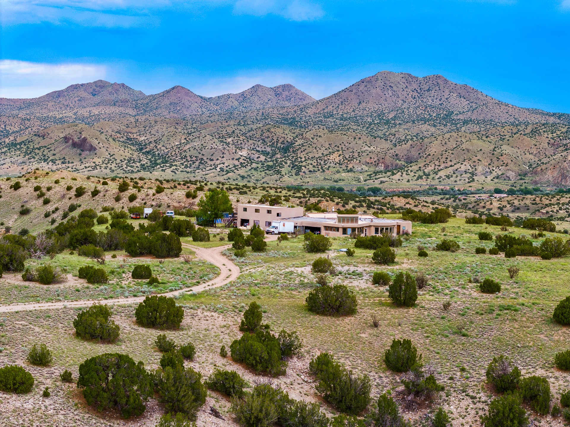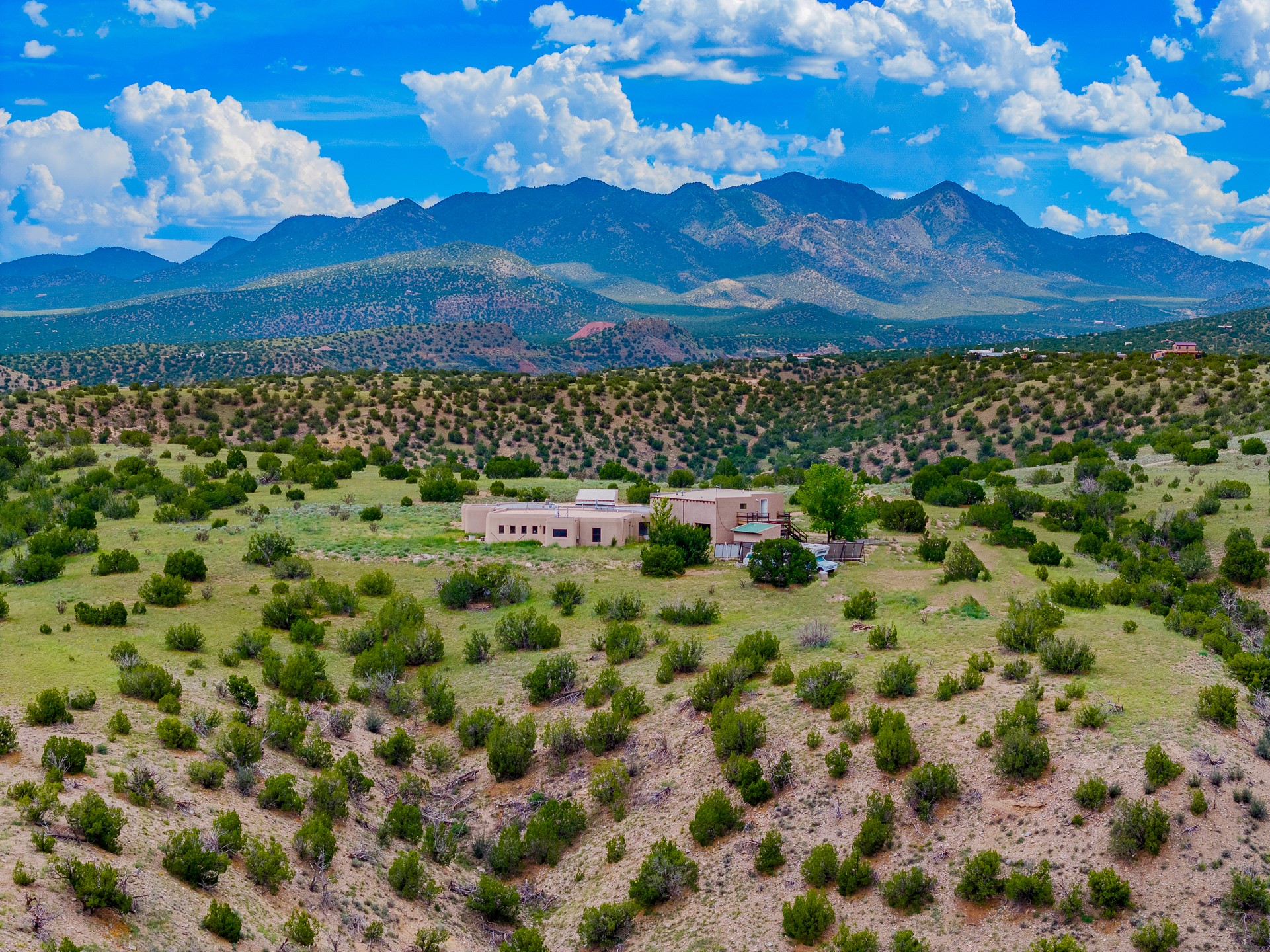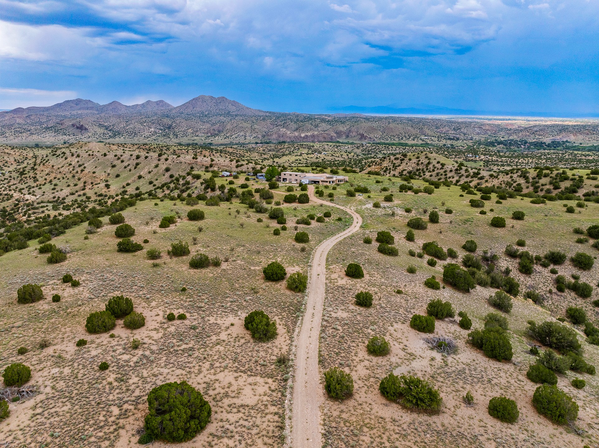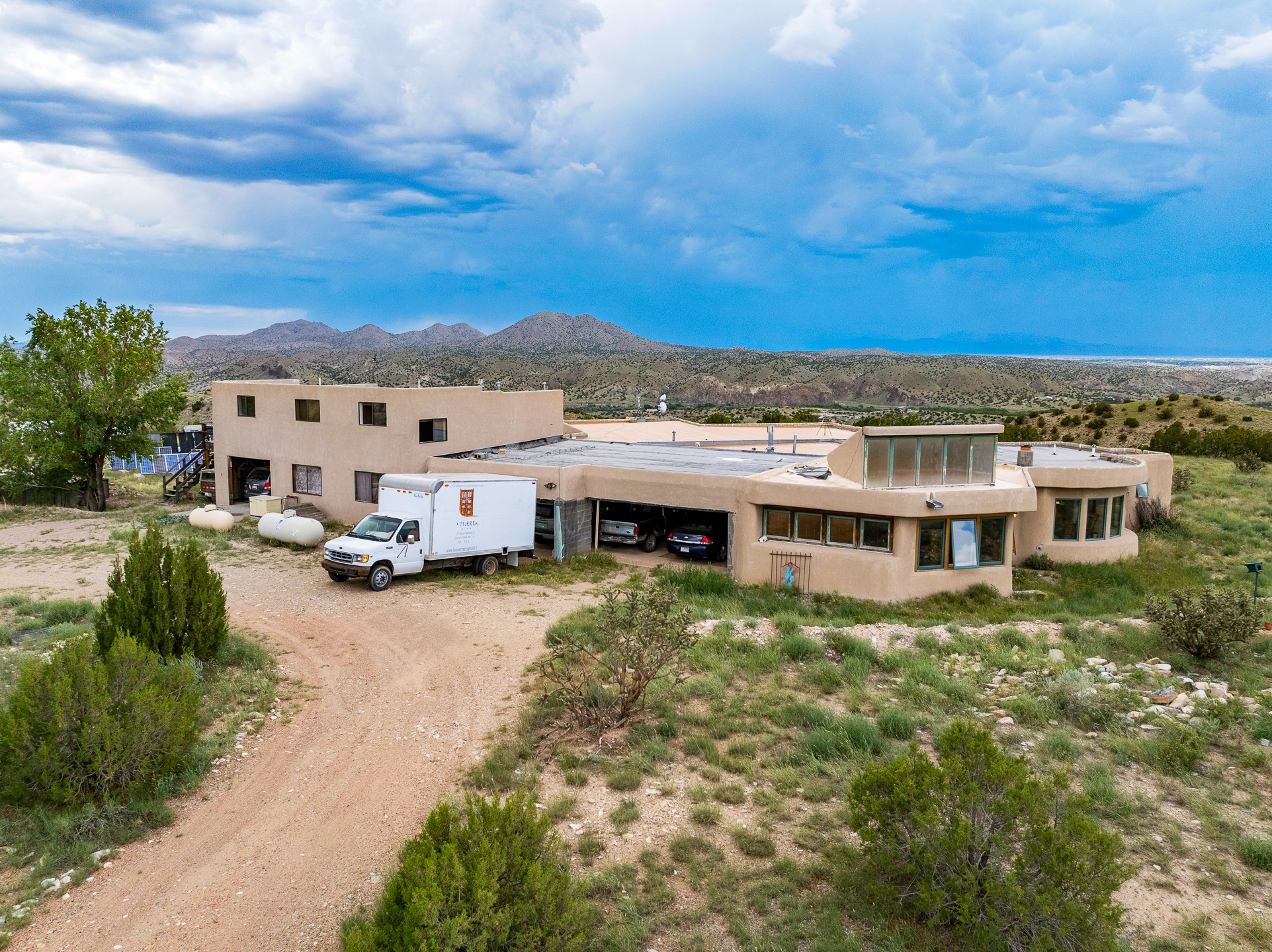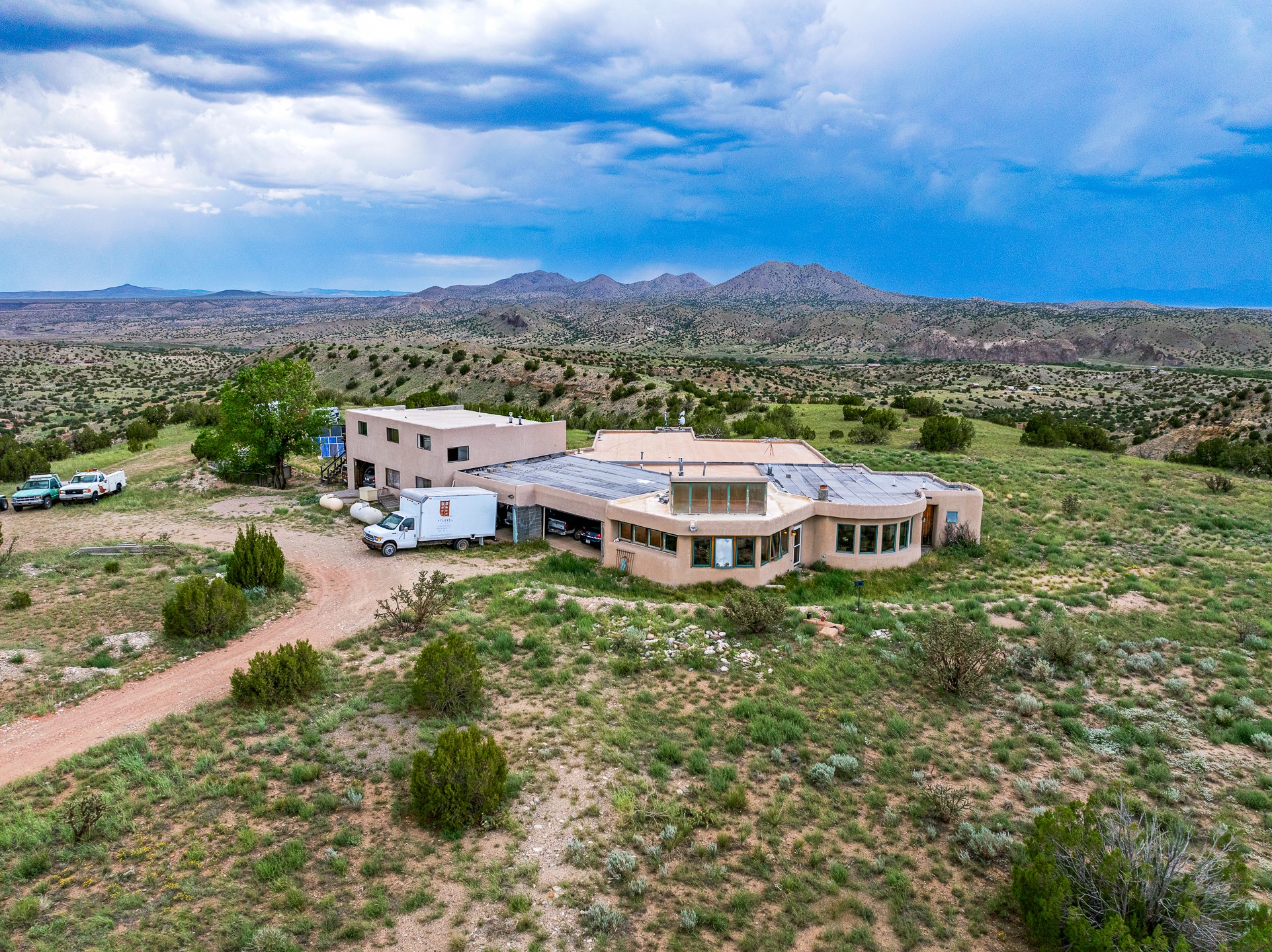 Mesa-top views, space and privacy from this substantial off-grid home on 53 acres, two miles from Madrid and Highway 14. Primary residence is 4474 square feet all on one level, with generous, ample rooms, an open concept kitchen, a separate media nook, home office, and a light-filled living room. A kiva fireplace warms the dining area. Two large bedrooms and two bathrooms are in the main home. A separate upstairs apartment has its own kitchen and bath. The home features rammed earth construction with exterior walls two feet thick, and plaster interiors, radiant flooring, and solar power. The upstairs apartment, with its own entrance, is 1008 sq. ft. and offers guest, caretaker, or rental opportunities. 1132 sq. ft. of shop and garage space provides room for parking up to 5 cars. Acreage would be ideal has for gardening, horses, etc. Home has some deferred maintenance and needs finishing in places, and is priced accordingly, bring your vision and energy for an opportunity for considerable sweat equity.