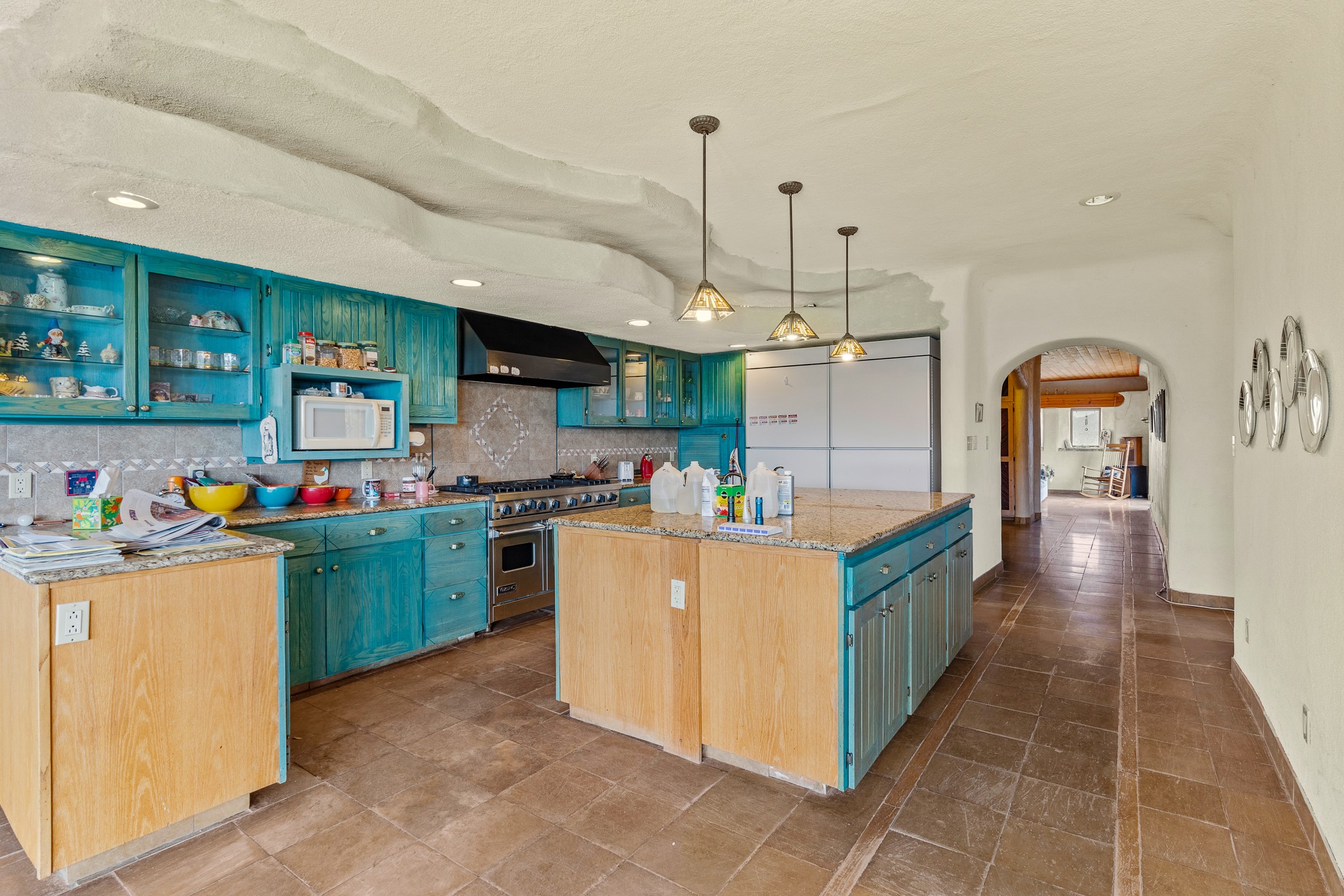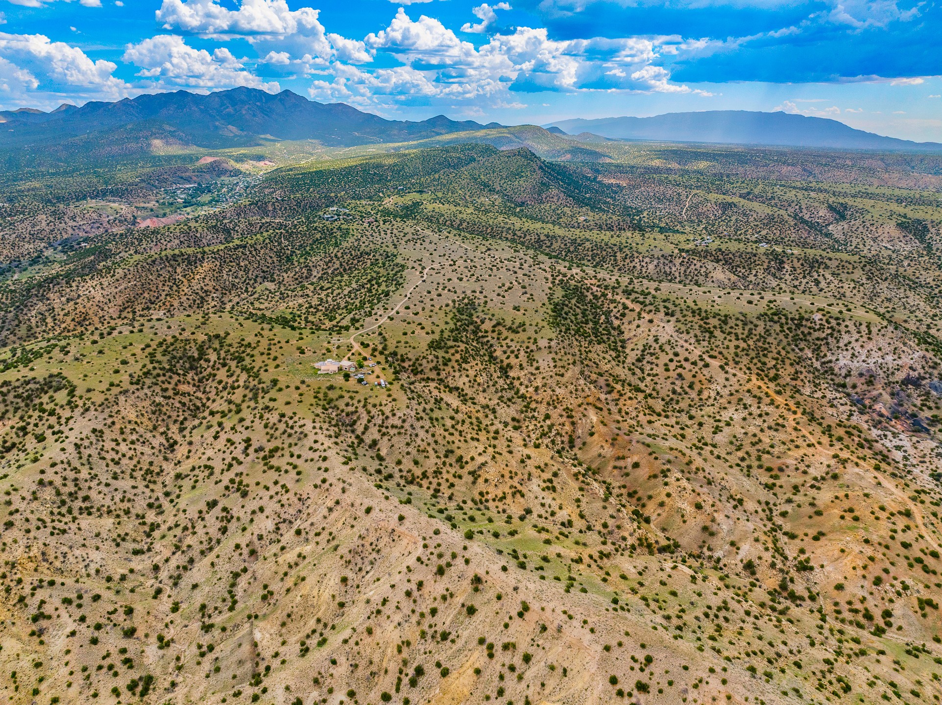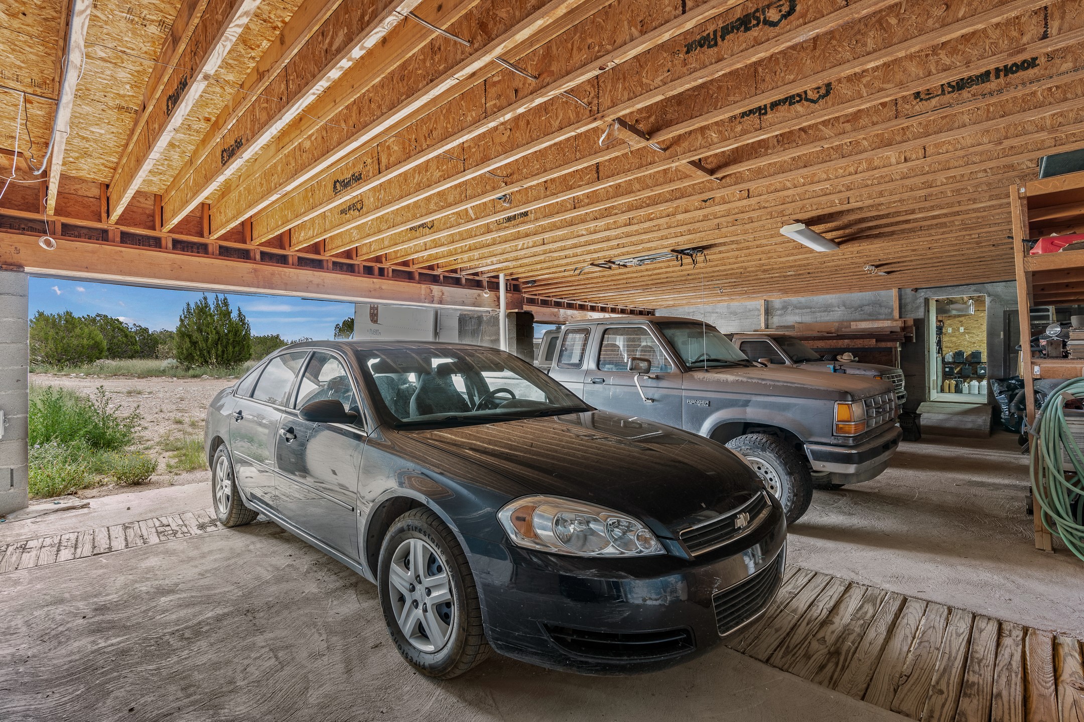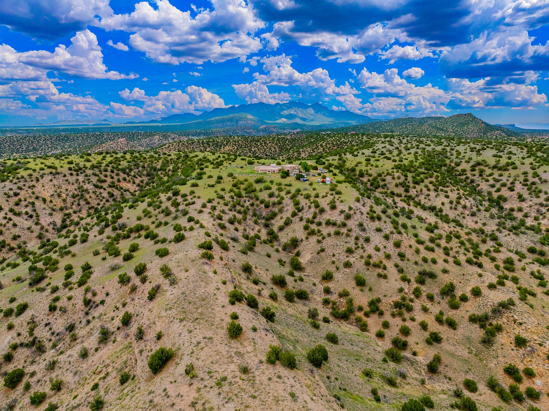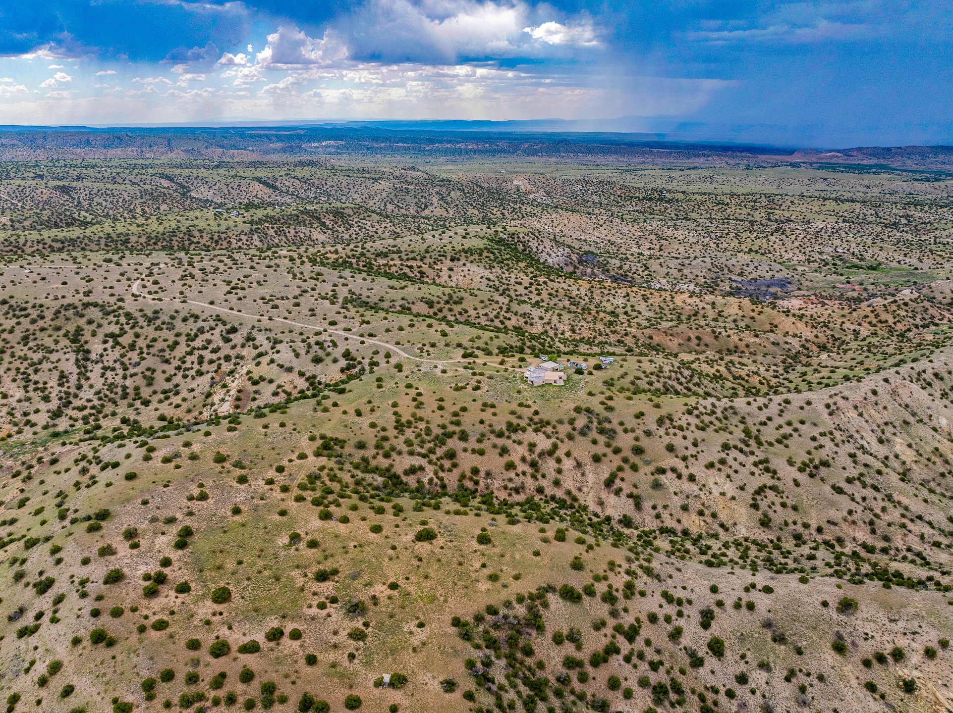 Mesa-top views, space and privacy from this substantial off-grid home on 53 acres, two miles from Madrid and Highway 14. Primary residence is 4474 square feet all on one level, with generous, ample rooms, an open concept kitchen, a separate media nook, home office, and a light-filled living room. A kiva fireplace warms the dining area. Two large bedrooms and two bathrooms are in the main home. A separate upstairs apartment has its own kitchen and bath. The home features rammed earth construction with exterior walls two feet thick, and plaster interiors, radiant flooring, and solar power. The upstairs apartment, with its own entrance, is 1008 sq. ft. and offers guest, caretaker, or rental opportunities. 1132 sq. ft. of shop and garage space provides room for parking up to 5 cars. Acreage would be ideal has for gardening, horses, etc. Home has some deferred maintenance and needs finishing in places, and is priced accordingly, bring your vision and energy for an opportunity for considerable sweat equity.
