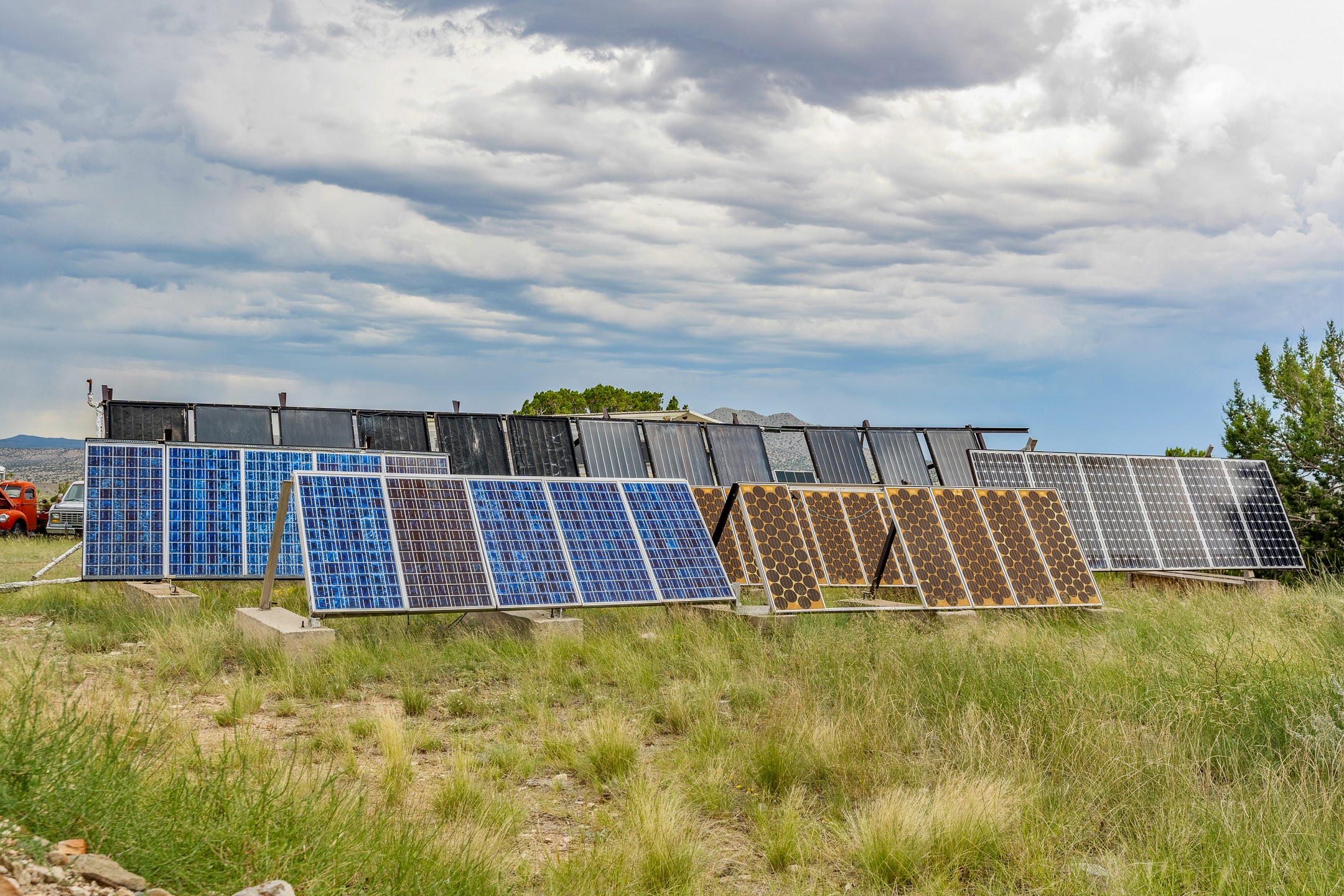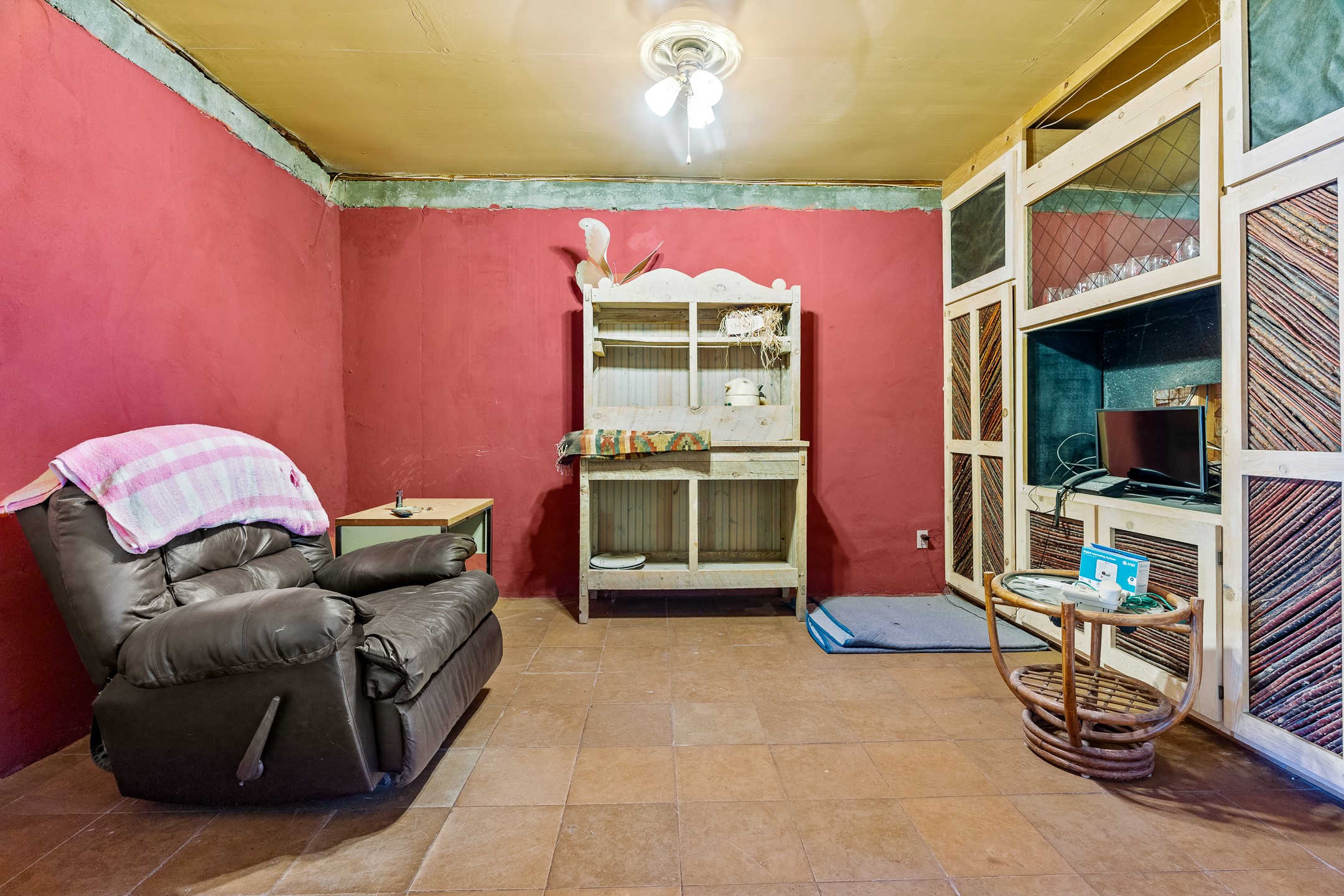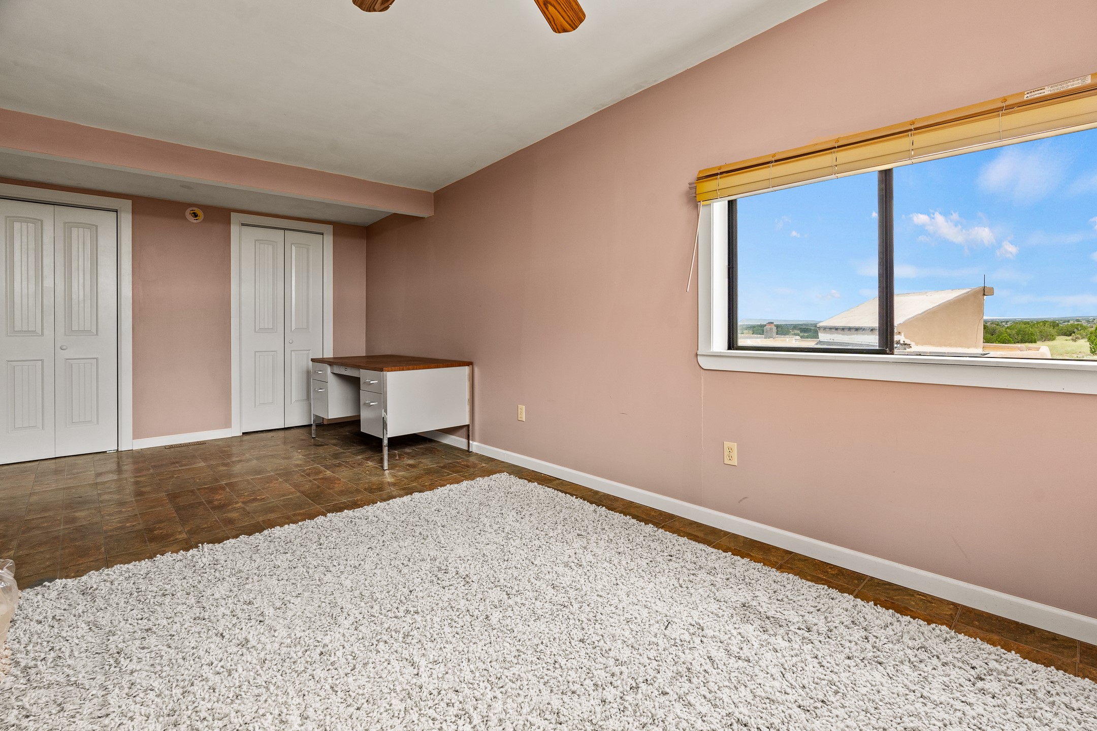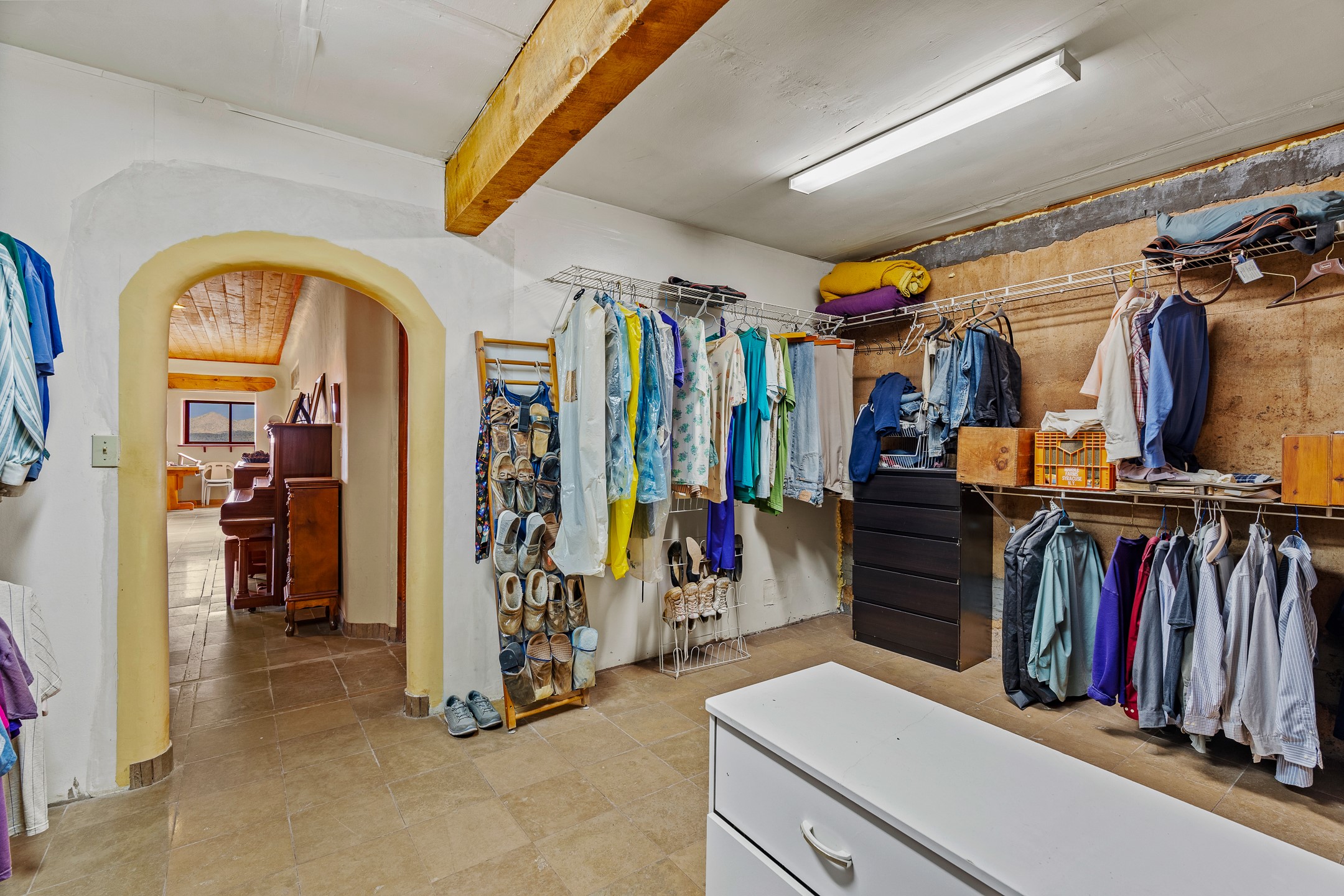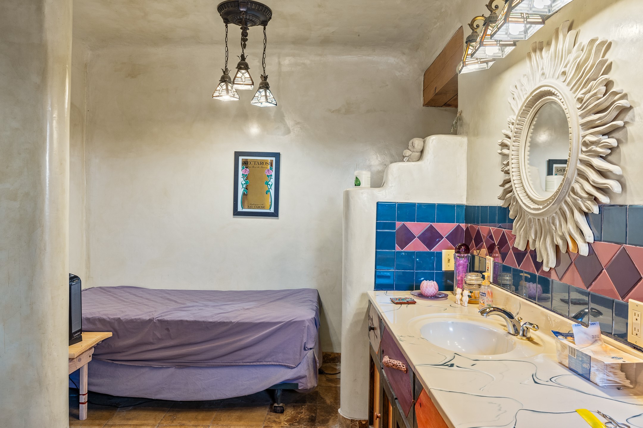 Mesa-top views, space and privacy from this substantial off-grid home on 53 acres, two miles from Madrid and Highway 14. Primary residence is 4474 square feet all on one level, with generous, ample rooms, an open concept kitchen, a separate media nook, home office, and a light-filled living room. A kiva fireplace warms the dining area. Two large bedrooms and two bathrooms are in the main home. A separate upstairs apartment has its own kitchen and bath. The home features rammed earth construction with exterior walls two feet thick, and plaster interiors, radiant flooring, and solar power. The upstairs apartment, with its own entrance, is 1008 sq. ft. and offers guest, caretaker, or rental opportunities. 1132 sq. ft. of shop and garage space provides room for parking up to 5 cars. Acreage would be ideal has for gardening, horses, etc. Home has some deferred maintenance and needs finishing in places, and is priced accordingly, bring your vision and energy for an opportunity for considerable sweat equity.