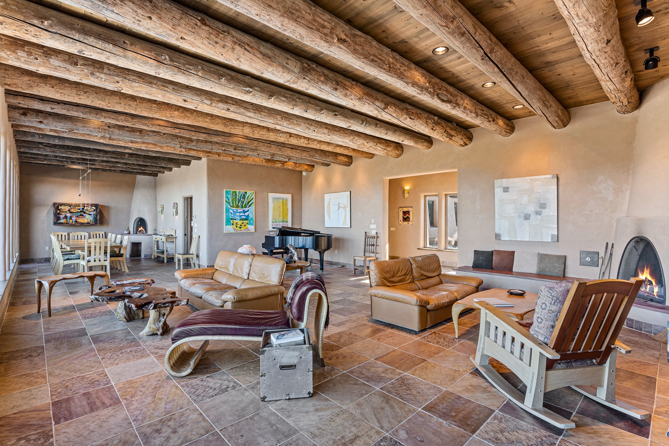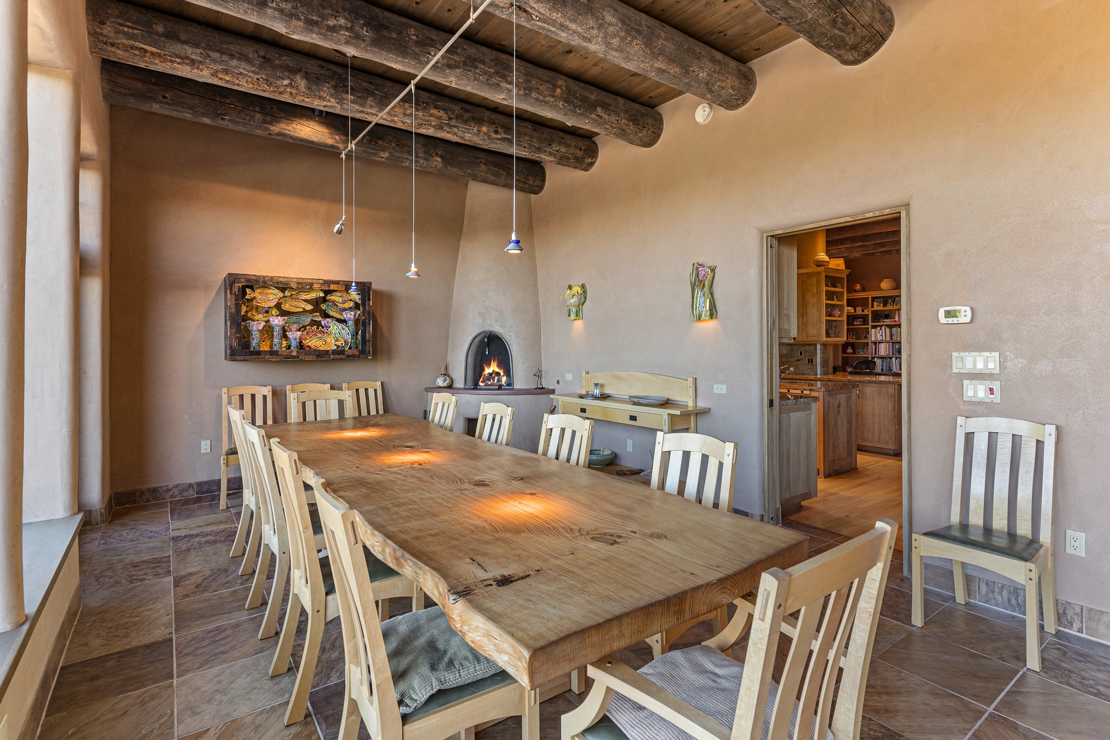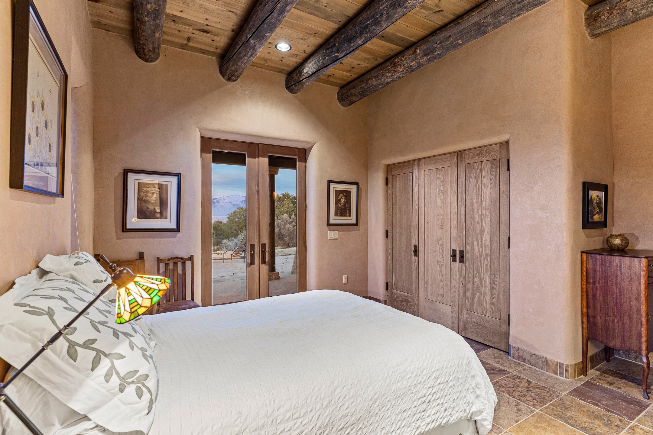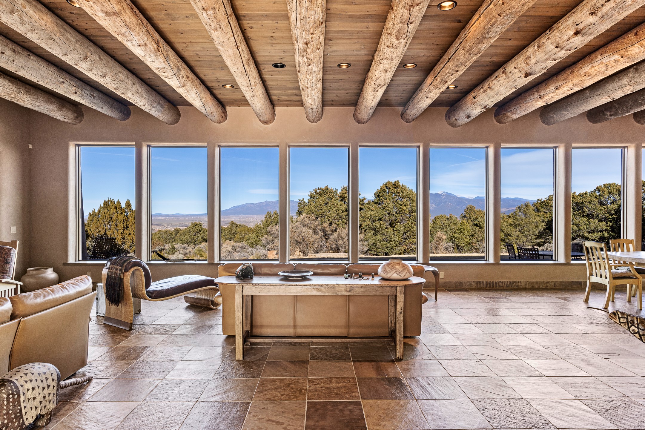 Experience the ultimate fusion of beauty, balance, and nature at this exclusive estate, tucked away on over 26 acres of pristine land. With sweeping views stretching from the Rio Grande Gorge to Taos Mountain, Abiquiu, and all the way to Colorado's Mt. Blanca, this exceptional property offers unrivaled vistas. The compound consists of a magnificent main residence, two spacious guesthouses (6 bedrooms, 4.5 bathrooms total), and an attached garage with laundry facilities, a fitness room, mechanical spaces, and a climate-controlled wine cellar. Designed by renowned Santa Fe architect John Barton and contractor Ken Wolosin, the estate combines contemporary luxury with the timeless charm of ancient Pueblo adobe architecture. The buildings are crafted using modern adobe construction, featuring gently tapered walls, stacked flagstone foundations, and elegant standing seam copper roofs. The main house is a true sanctuary, offering a sumptuous master suite, a gourmet kitchen, an elegant dining area, a spacious living room with two kiva fireplaces, and a guest suite. An inviting entry gallery leads into the expansive living area, where a wall of custom windows perfectly frames the awe-inspiring panoramic views of the valley and surrounding mountains. The guesthouses are equally well-appointed, each offering two bedrooms, a large bathroom, and an open kitchen-dining space. Throughout the compound, no detail has been overlooked, with kiva fireplaces, ample storage, custom tiles, stone floors, and granite countertops enriching every room. Perfectly attuned to its natural surroundings, the estate is designed to harmonize with the land. Thoughtfully crafted gardens and landscaping blend seamlessly with the wild beauty of the terrain, creating a tranquil balance between architecture and nature. This unique estate offers a serene retreat, where refined elegance meets the untouched splendor of the surrounding landscape.