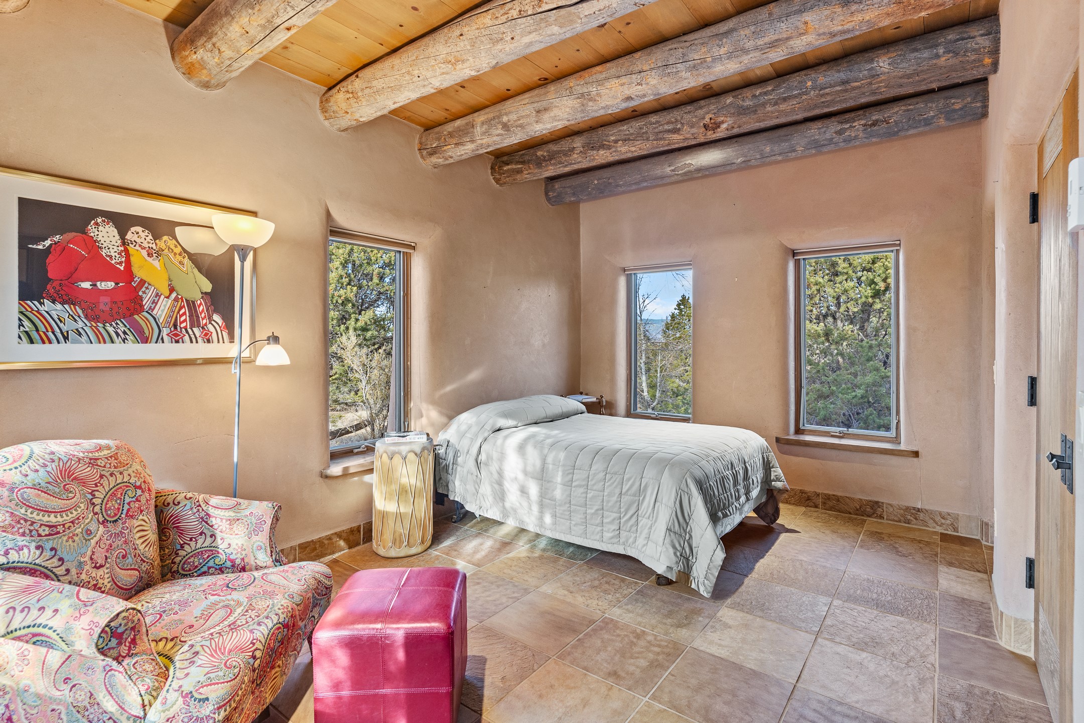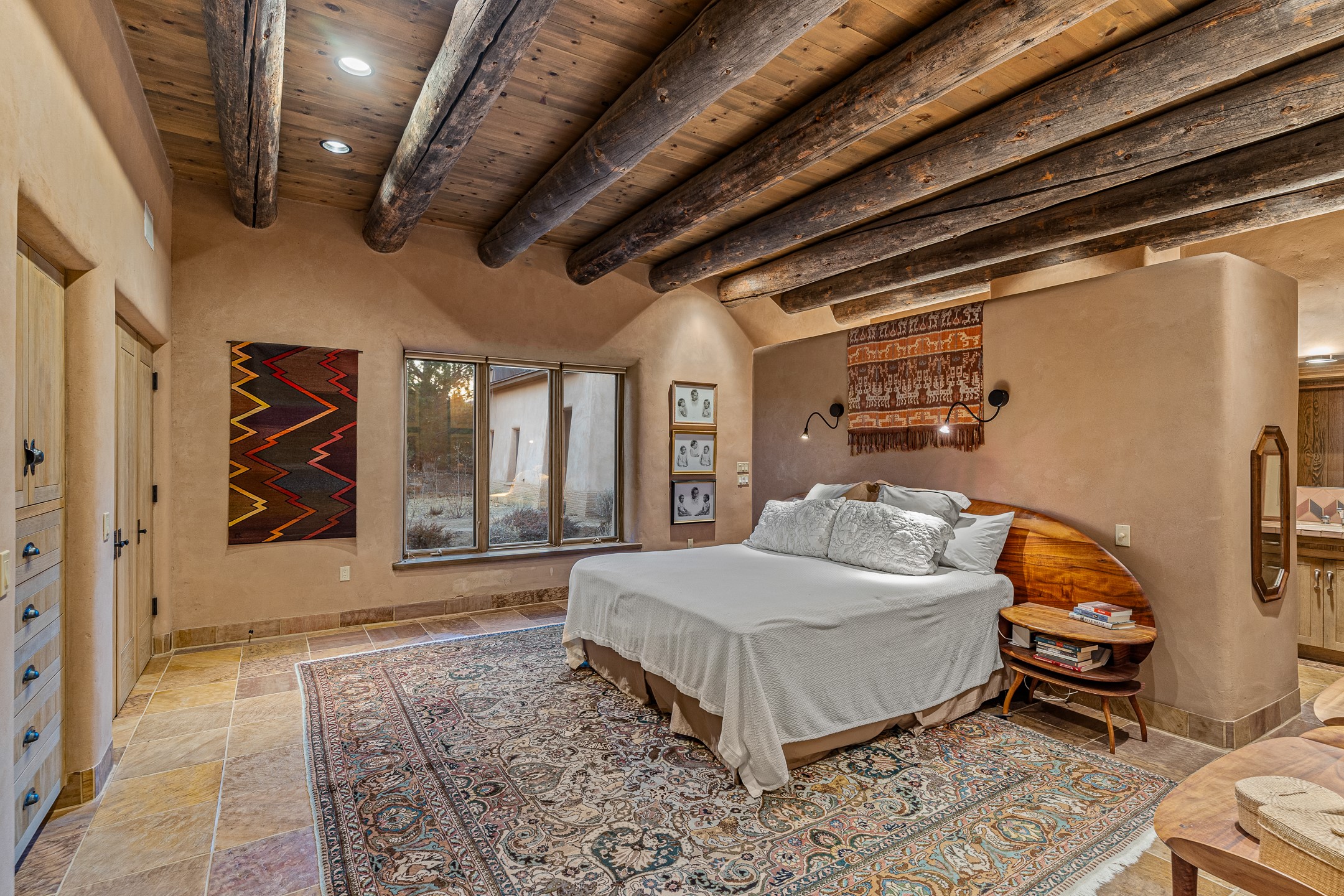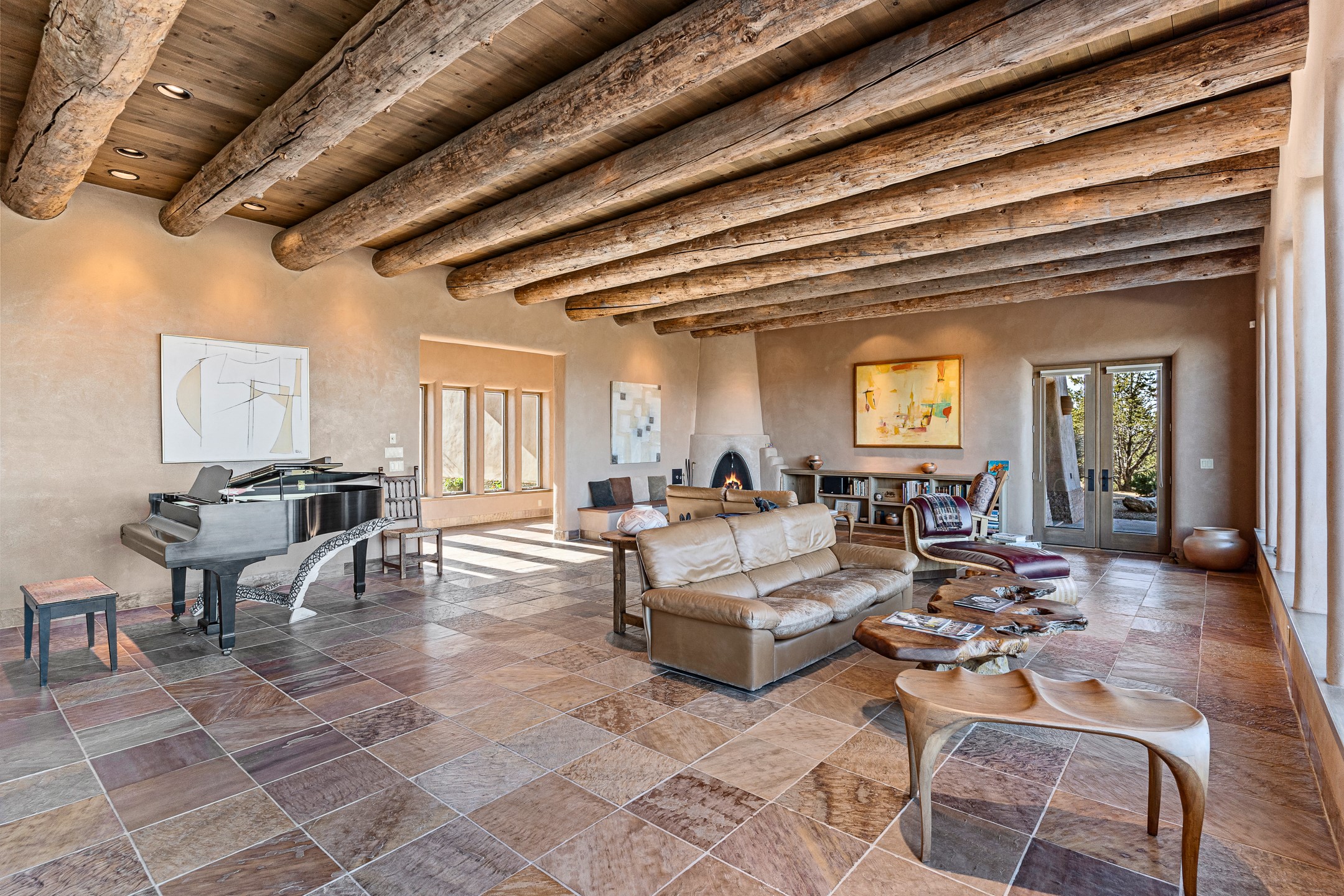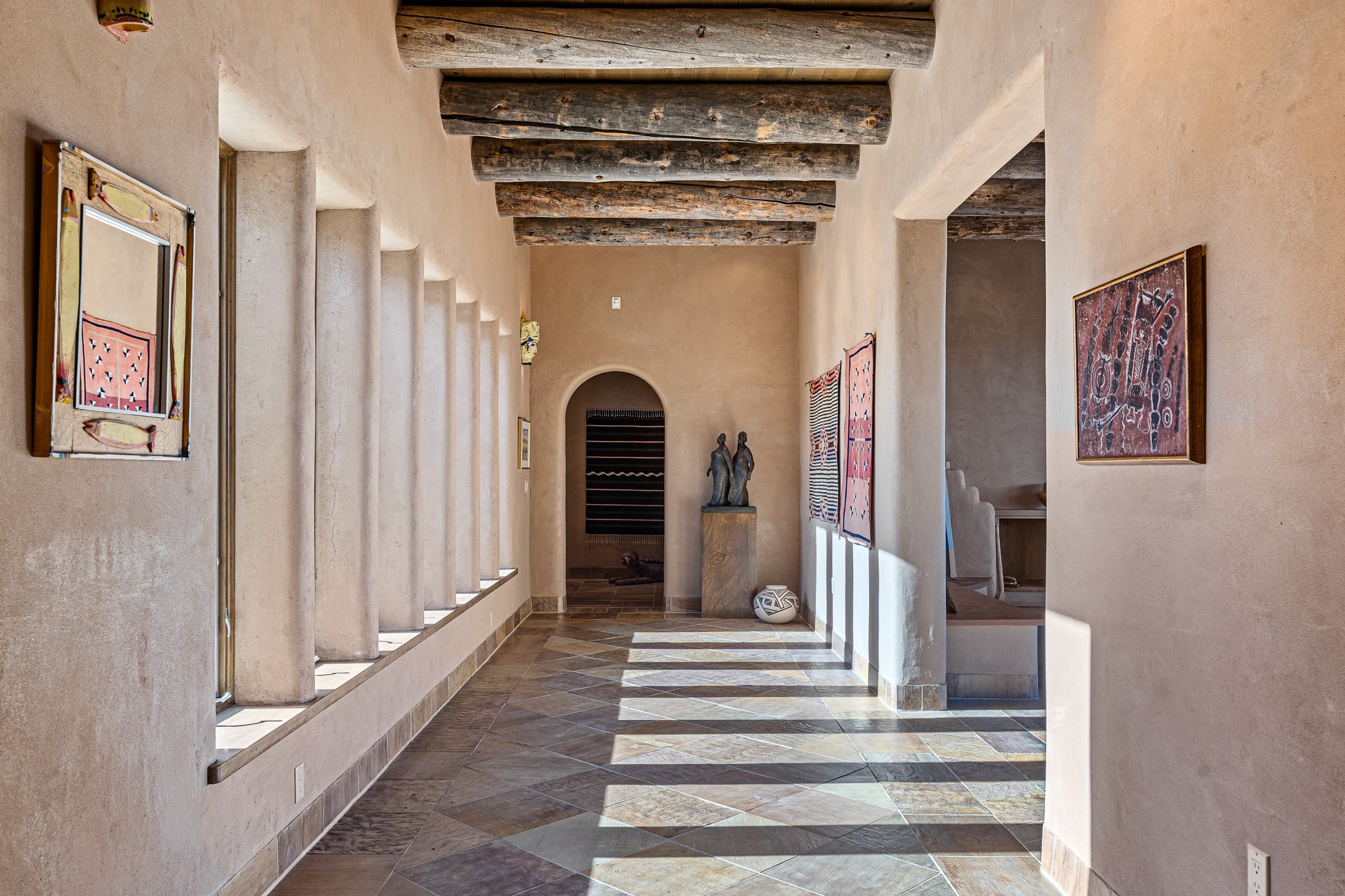 Experience the ultimate fusion of beauty, balance, and nature at this exclusive estate, tucked away on over 26 acres of pristine land. With sweeping views stretching from the Rio Grande Gorge to Taos Mountain, Abiquiu, and all the way to Colorado's Mt. Blanca, this exceptional property offers unrivaled vistas. The compound consists of a magnificent main residence, two spacious guesthouses (6 bedrooms, 4.5 bathrooms total), and an attached garage with laundry facilities, a fitness room, mechanical spaces, and a climate-controlled wine cellar. Designed by renowned Santa Fe architect John Barton and contractor Ken Wolosin, the estate combines contemporary luxury with the timeless charm of ancient Pueblo adobe architecture. The buildings are crafted using modern adobe construction, featuring gently tapered walls, stacked flagstone foundations, and elegant standing seam copper roofs. The main house is a true sanctuary, offering a sumptuous master suite, a gourmet kitchen, an elegant dining area, a spacious living room with two kiva fireplaces, and a guest suite. An inviting entry gallery leads into the expansive living area, where a wall of custom windows perfectly frames the awe-inspiring panoramic views of the valley and surrounding mountains. The guesthouses are equally well-appointed, each offering two bedrooms, a large bathroom, and an open kitchen-dining space. Throughout the compound, no detail has been overlooked, with kiva fireplaces, ample storage, custom tiles, stone floors, and granite countertops enriching every room. Perfectly attuned to its natural surroundings, the estate is designed to harmonize with the land. Thoughtfully crafted gardens and landscaping blend seamlessly with the wild beauty of the terrain, creating a tranquil balance between architecture and nature. This unique estate offers a serene retreat, where refined elegance meets the untouched splendor of the surrounding landscape.