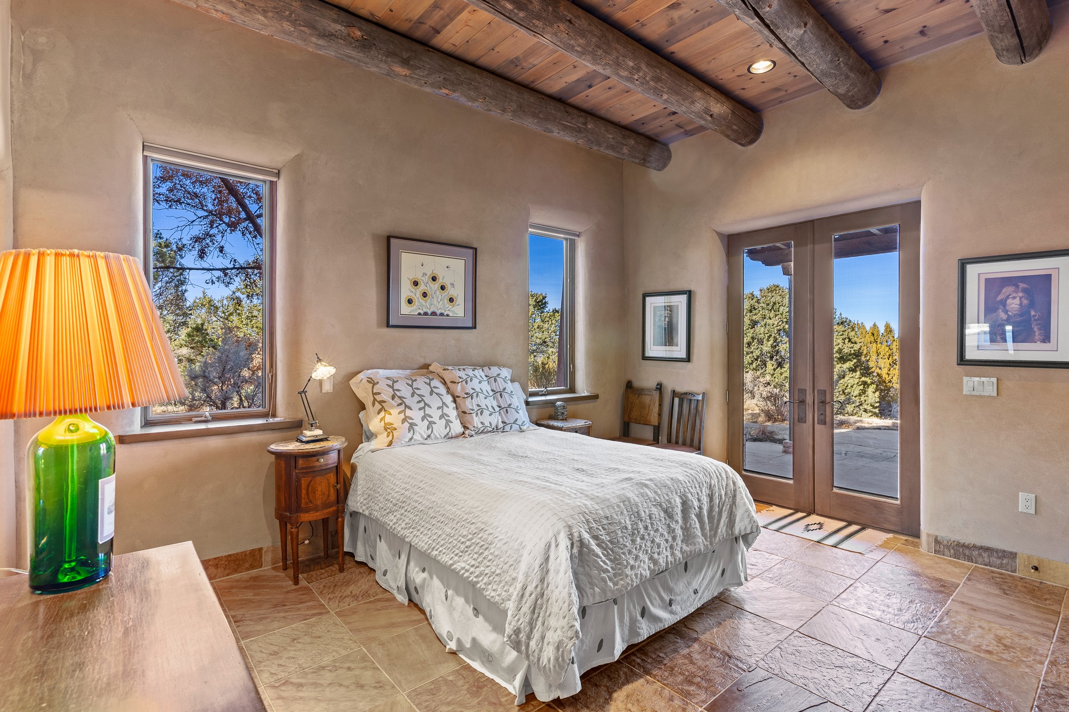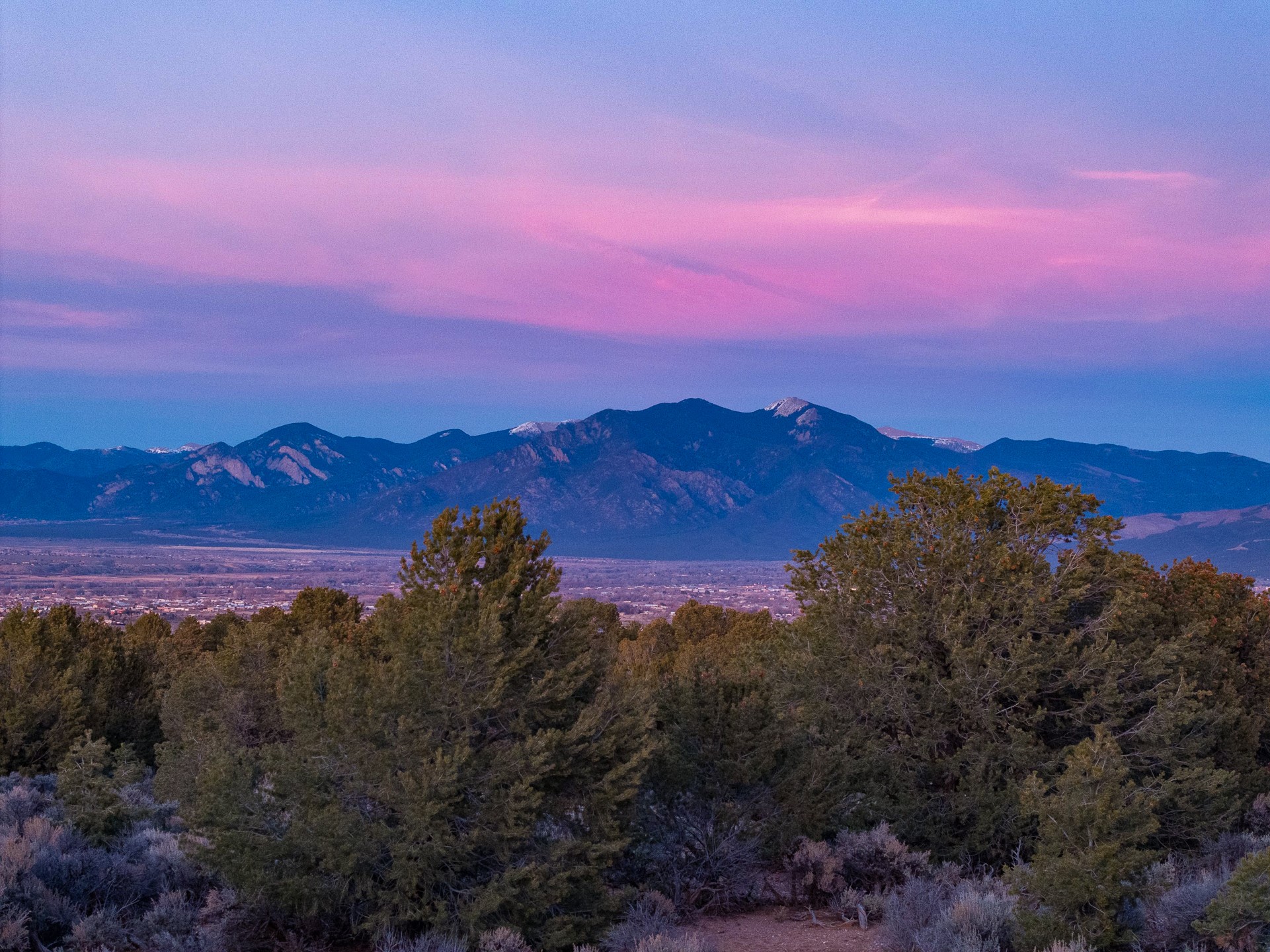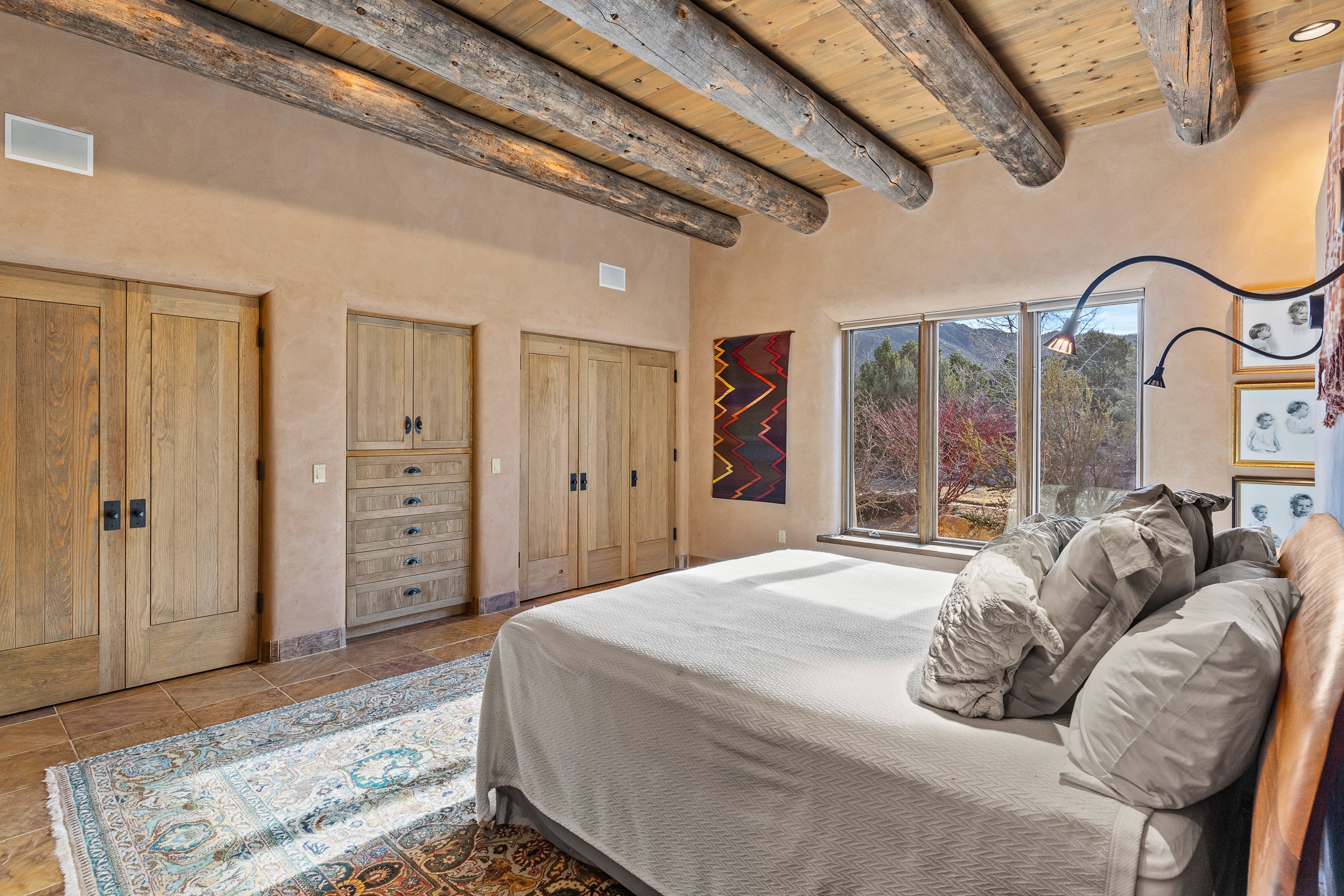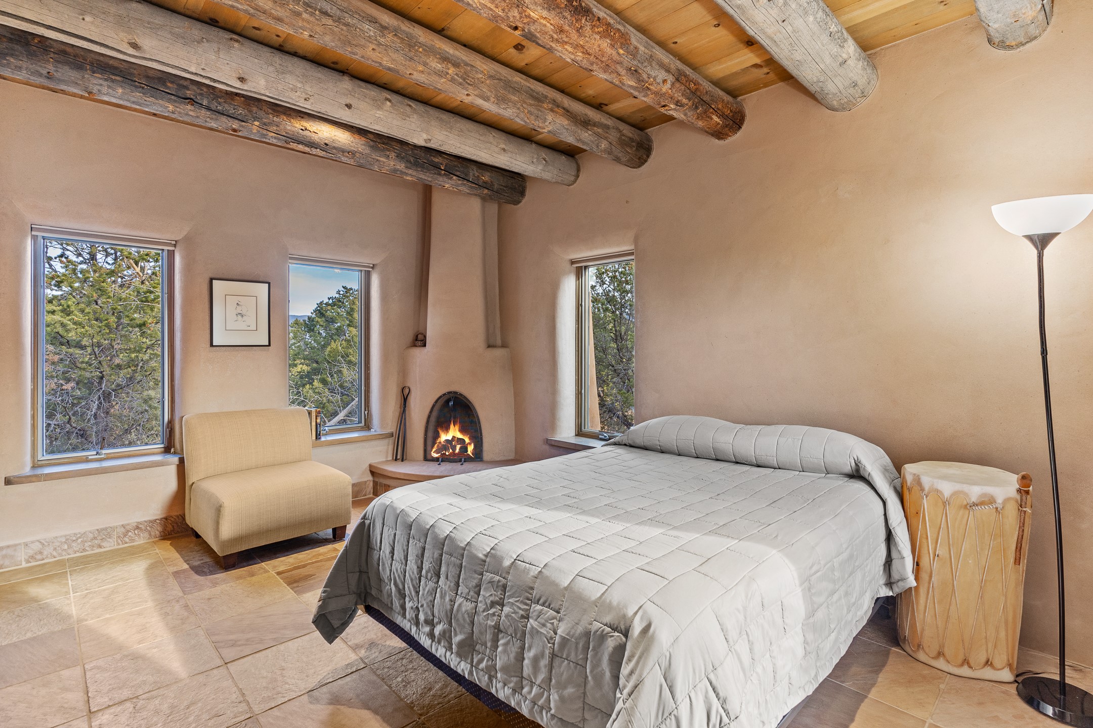 Experience the ultimate fusion of beauty, balance, and nature at this exclusive estate, tucked away on over 26 acres of pristine land. With sweeping views stretching from the Rio Grande Gorge to Taos Mountain, Abiquiu, and all the way to Colorado's Mt. Blanca, this exceptional property offers unrivaled vistas. The compound consists of a magnificent main residence, two spacious guesthouses (6 bedrooms, 4.5 bathrooms total), and an attached garage with laundry facilities, a fitness room, mechanical spaces, and a climate-controlled wine cellar. Designed by renowned Santa Fe architect John Barton and contractor Ken Wolosin, the estate combines contemporary luxury with the timeless charm of ancient Pueblo adobe architecture. The buildings are crafted using modern adobe construction, featuring gently tapered walls, stacked flagstone foundations, and elegant standing seam copper roofs. The main house is a true sanctuary, offering a sumptuous master suite, a gourmet kitchen, an elegant dining area, a spacious living room with two kiva fireplaces, and a guest suite. An inviting entry gallery leads into the expansive living area, where a wall of custom windows perfectly frames the awe-inspiring panoramic views of the valley and surrounding mountains. The guesthouses are equally well-appointed, each offering two bedrooms, a large bathroom, and an open kitchen-dining space. Throughout the compound, no detail has been overlooked, with kiva fireplaces, ample storage, custom tiles, stone floors, and granite countertops enriching every room. Perfectly attuned to its natural surroundings, the estate is designed to harmonize with the land. Thoughtfully crafted gardens and landscaping blend seamlessly with the wild beauty of the terrain, creating a tranquil balance between architecture and nature. This unique estate offers a serene retreat, where refined elegance meets the untouched splendor of the surrounding landscape.