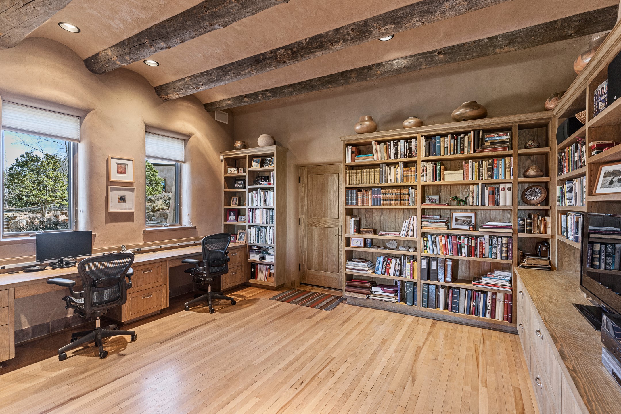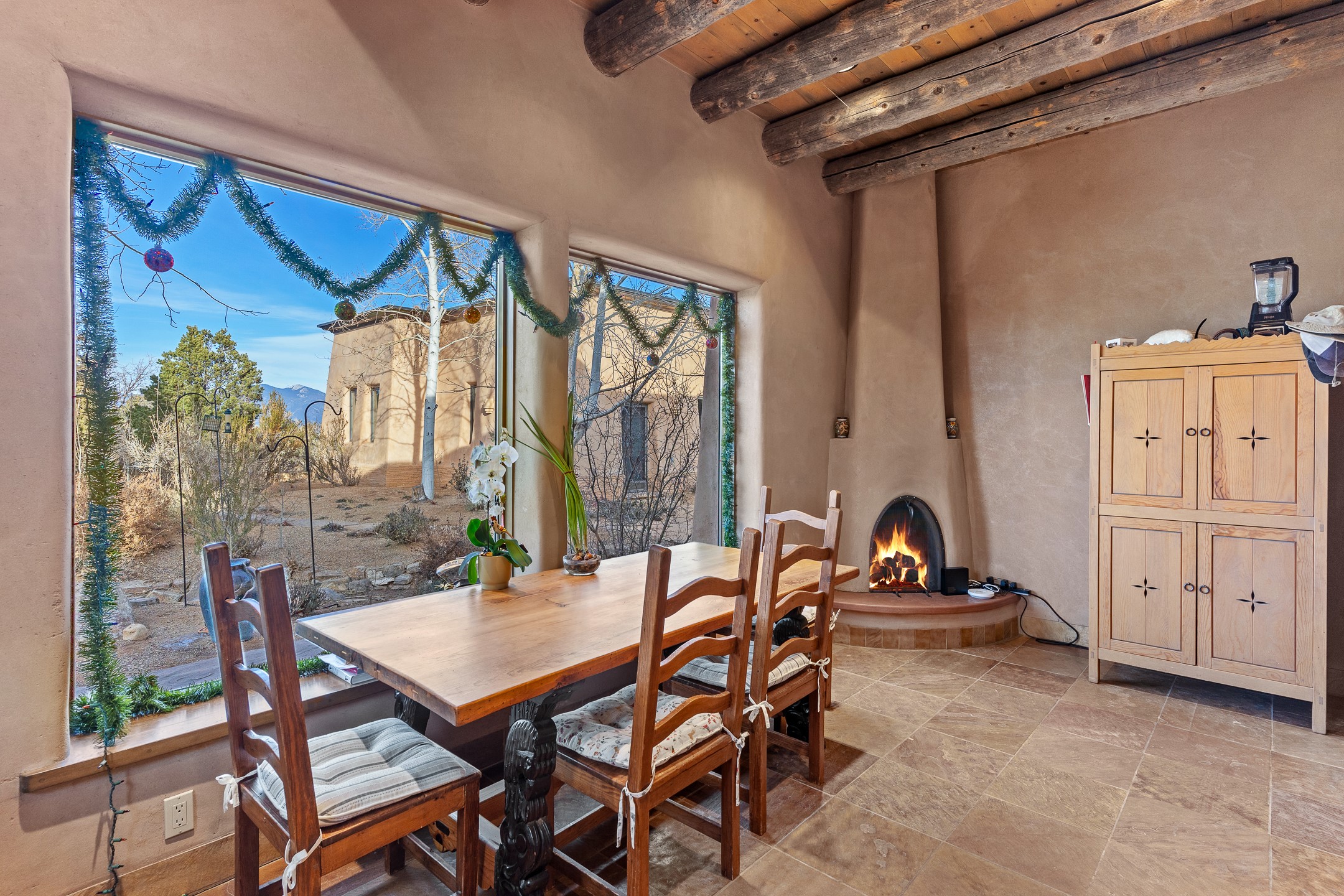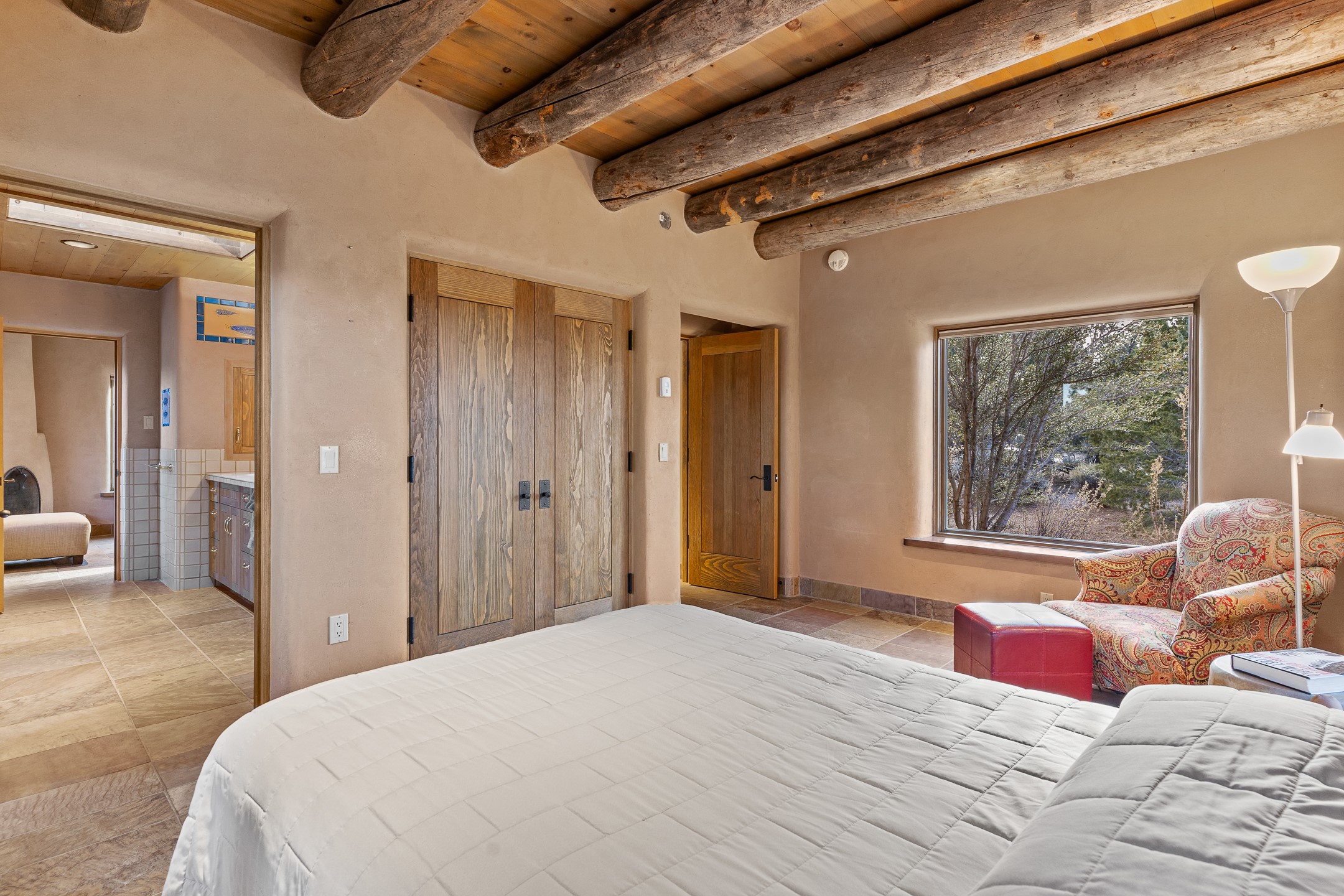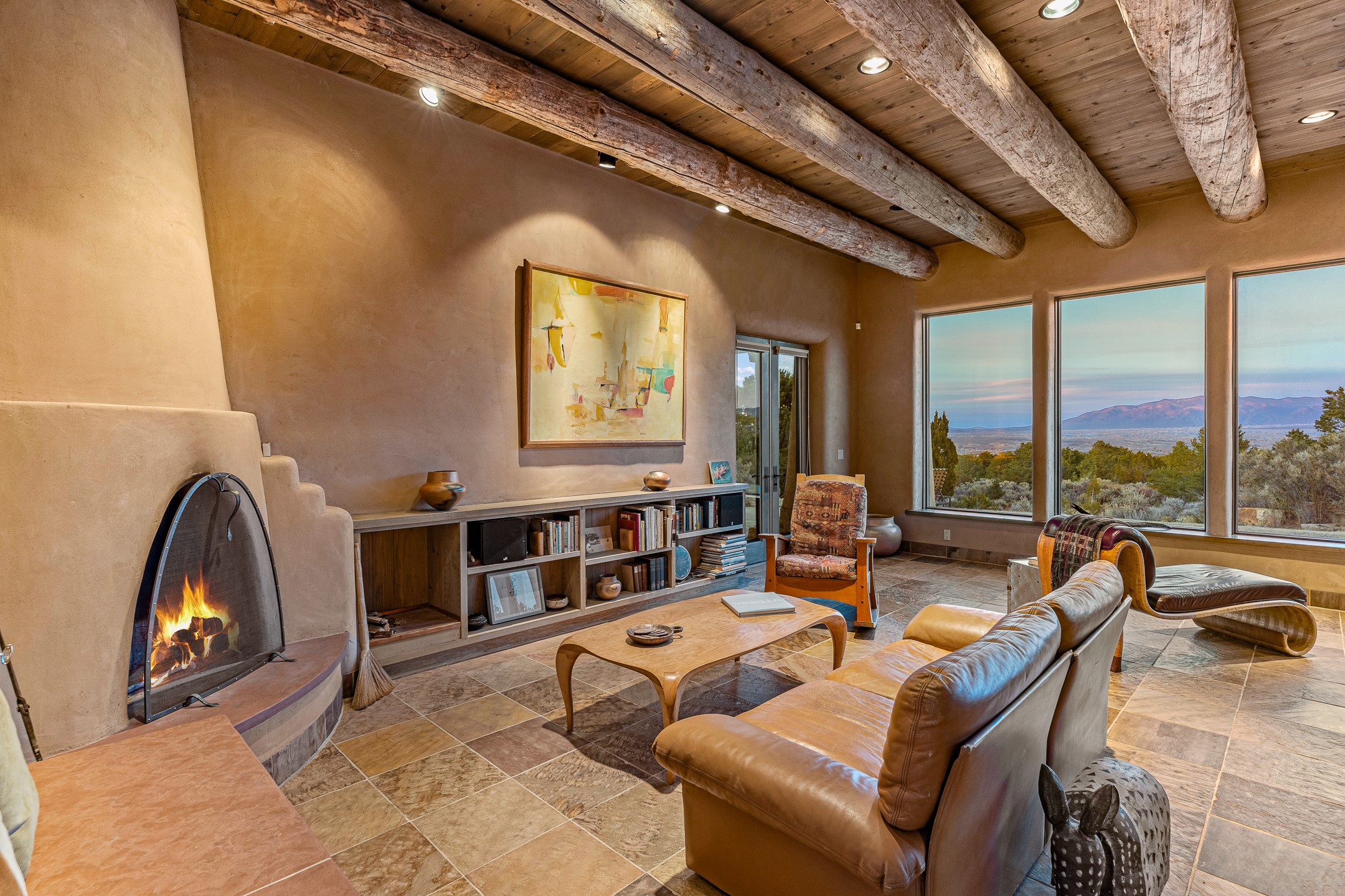 Experience the ultimate fusion of beauty, balance, and nature at this exclusive estate, tucked away on over 26 acres of pristine land. With sweeping views stretching from the Rio Grande Gorge to Taos Mountain, Abiquiu, and all the way to Colorado's Mt. Blanca, this exceptional property offers unrivaled vistas. The compound consists of a magnificent main residence, two spacious guesthouses (6 bedrooms, 4.5 bathrooms total), and an attached garage with laundry facilities, a fitness room, mechanical spaces, and a climate-controlled wine cellar. Designed by renowned Santa Fe architect John Barton and contractor Ken Wolosin, the estate combines contemporary luxury with the timeless charm of ancient Pueblo adobe architecture. The buildings are crafted using modern adobe construction, featuring gently tapered walls, stacked flagstone foundations, and elegant standing seam copper roofs. The main house is a true sanctuary, offering a sumptuous master suite, a gourmet kitchen, an elegant dining area, a spacious living room with two kiva fireplaces, and a guest suite. An inviting entry gallery leads into the expansive living area, where a wall of custom windows perfectly frames the awe-inspiring panoramic views of the valley and surrounding mountains. The guesthouses are equally well-appointed, each offering two bedrooms, a large bathroom, and an open kitchen-dining space. Throughout the compound, no detail has been overlooked, with kiva fireplaces, ample storage, custom tiles, stone floors, and granite countertops enriching every room. Perfectly attuned to its natural surroundings, the estate is designed to harmonize with the land. Thoughtfully crafted gardens and landscaping blend seamlessly with the wild beauty of the terrain, creating a tranquil balance between architecture and nature. This unique estate offers a serene retreat, where refined elegance meets the untouched splendor of the surrounding landscape.