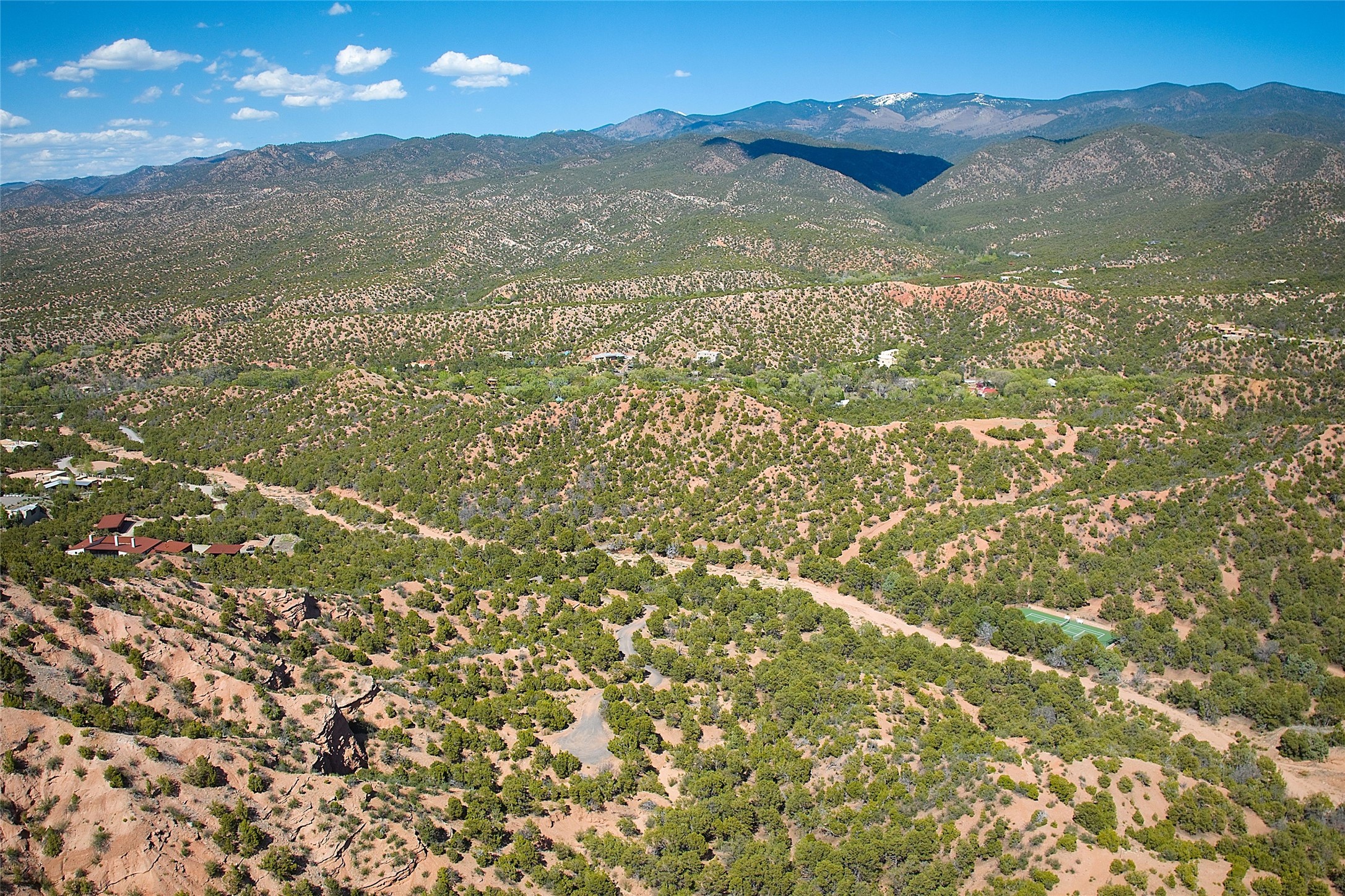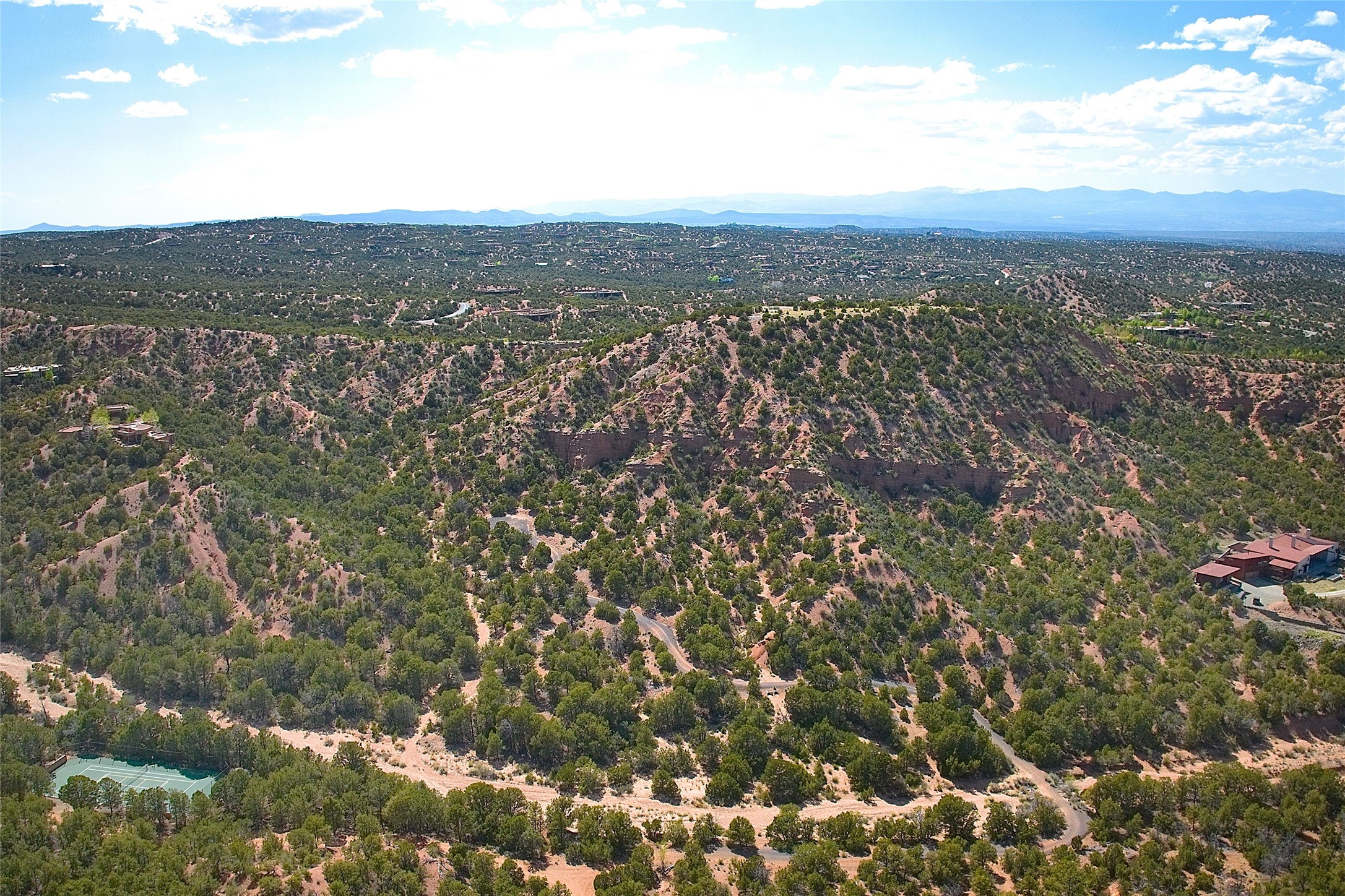 Rare opportunity to own 23.01-acres of residential land offering spectacular panoramic views of the Sangre de Cristo Mountains and the tranquil Tesuque Valley. This unique parcel consists of two separately deeded contiguous lots. Accessed through the prestigious gated Circle Drive Compound, this property ensures a sense of privacy and exclusivity while remaining connected to a vibrant community. With several designated building envelopes, you have the creative freedom to design a residence that perfectly complements the stunning surroundings. One of the deeded lots features a finished tennis court, a luxurious amenity that enhances your outdoor lifestyle while allowing for community access. Imagine enjoying sunny afternoons on the court or hosting gatherings with friends and family, all set against the backdrop of breathtaking natural beauty. Full plans for 4,738 sq. ft. 3 bedroom, 4 bath main house (with an approved permit for pool) and 1608 sq. ft. 2 bedroom, 2 bath casita from Craig Hoopes Architects could be included with sale. Underground utilities, and one shared well permitted for multiple domestic households. Zoning is Residential Fringe; District Density: RES-F; 1 dwelling per 5 acres. This prime location combines the best of both worlds: the serenity of rural living and the convenience of nearby amenities. Experience the rich culture and outdoor adventures that New Mexico has to offer, all while enjoying the comfort of your own private retreat.