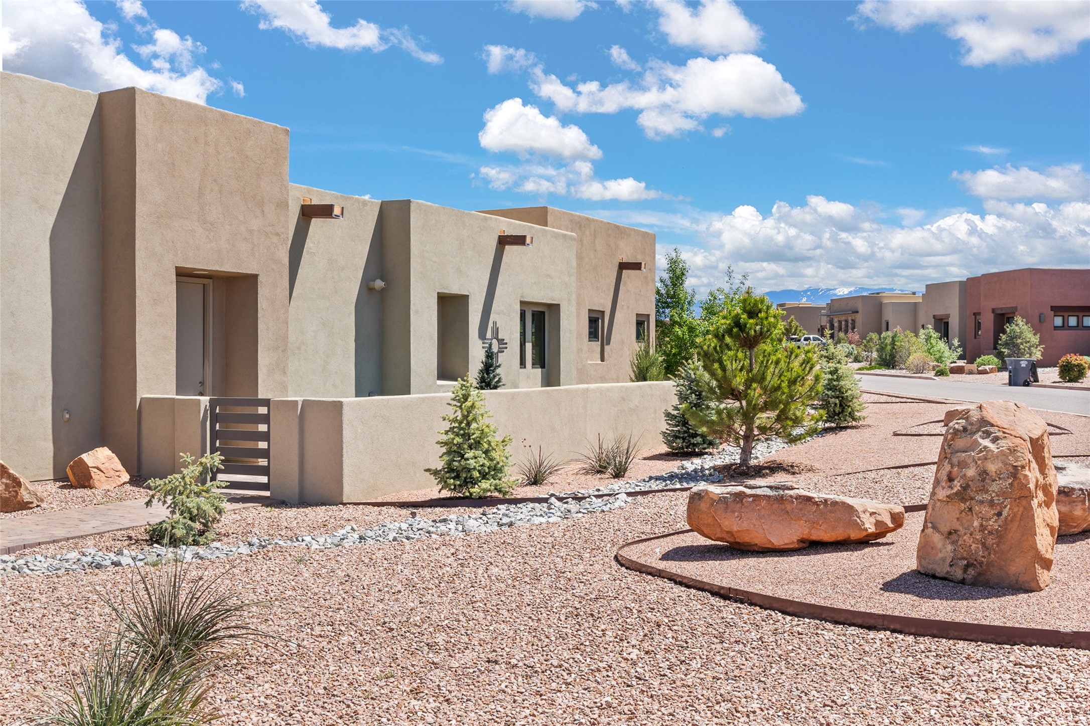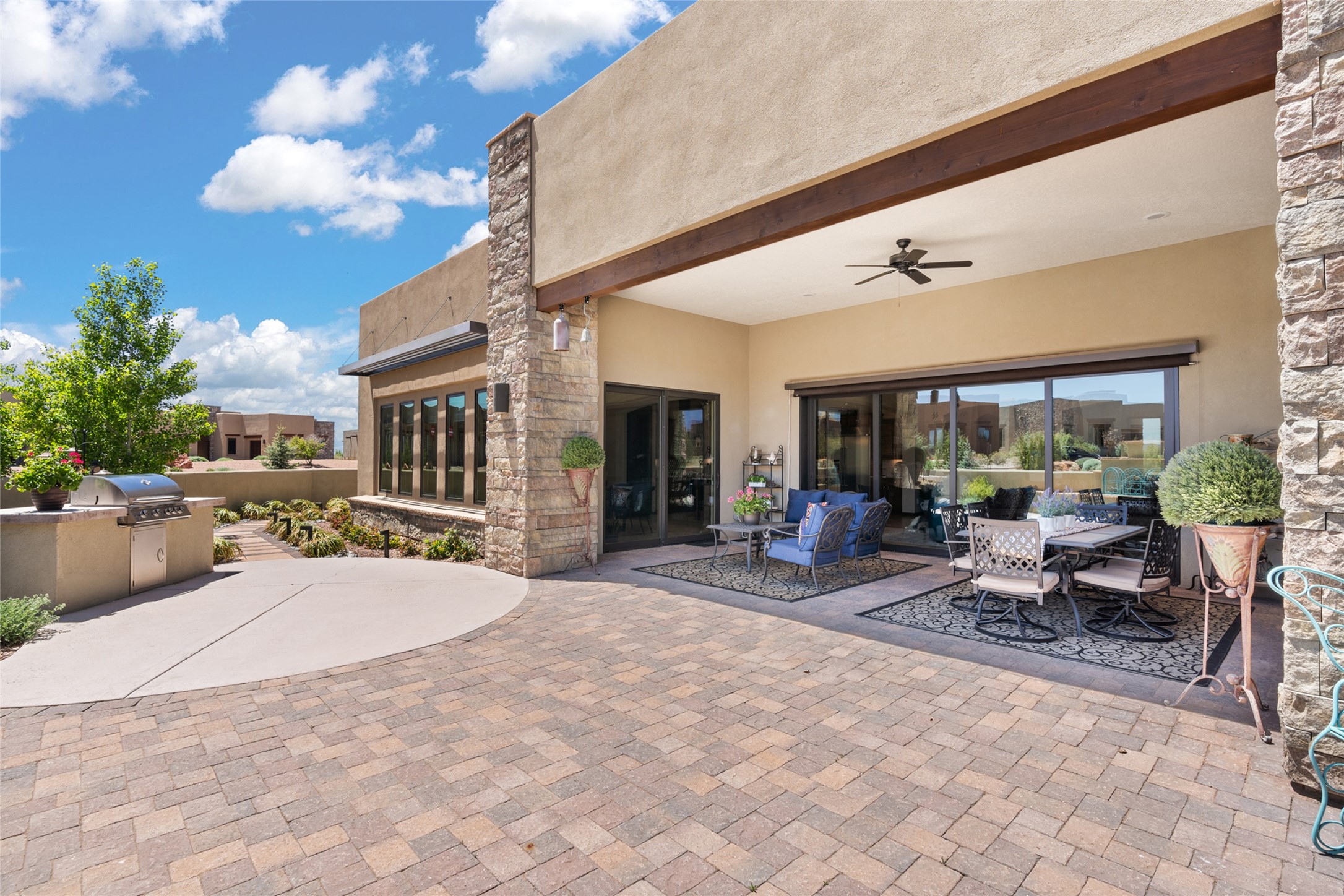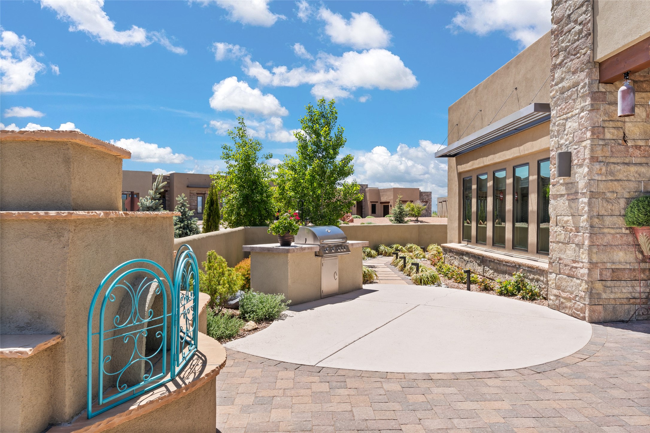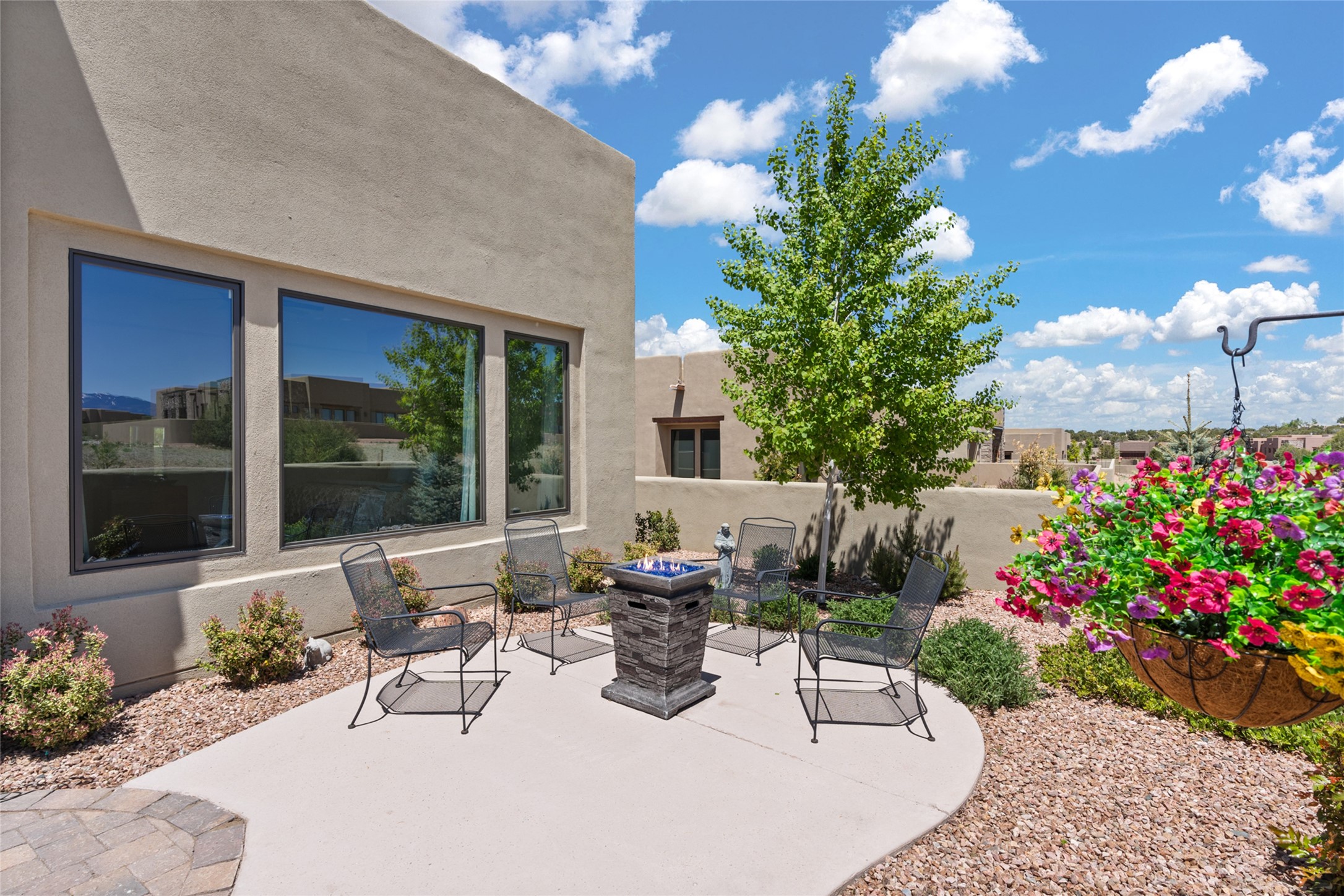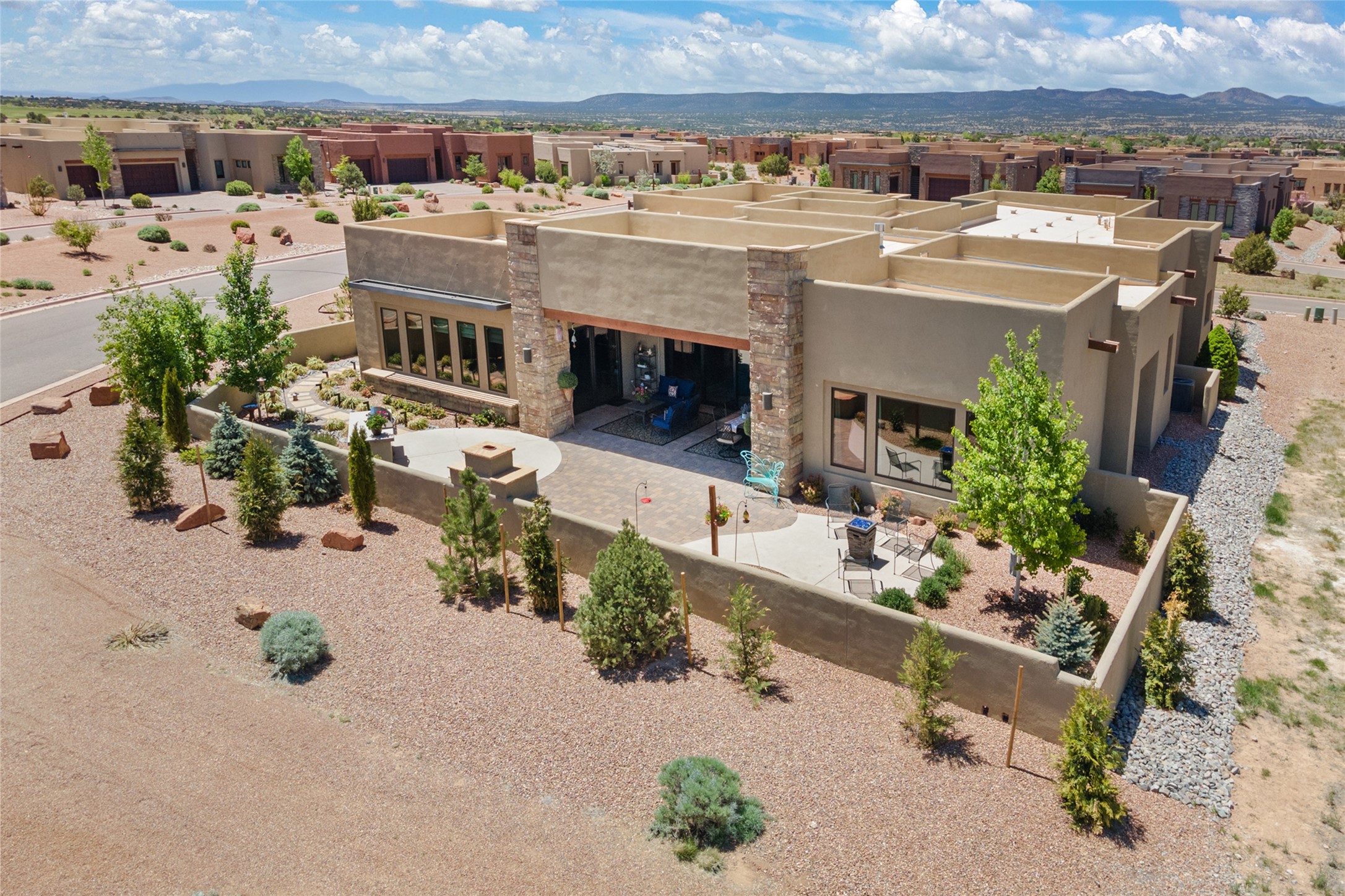 Imagine waking each morning to golden light painting the Sangre de Cristo mountains in shades of rose and amber, streaming through expansive east-facing windows. Nestled on a coveted corner lot in exclusive Las Campanas, this semi-custom property captures your heart from the moment you step through the welcoming courtyard. Picture yourself hosting sunset gatherings on beautifully landscaped brick and stone terraces that flow effortlessly indoors. The living room's dramatic four-panel sliding doors glide open, while your guests gather around the deep portal's romantic kiva-inspired fireplace as you prepare culinary favorites at the integrated outdoor gas kitchen. The gourmet kitchen is spectacular--top-tier appliances, a commanding 126-foot granite island, wine cooler, and walk-in pantry. The primary suite is pure tranquility with stunning mountain views, spa-inspired soaking tub, oversized walk-in shower, and dual closets. With five bedrooms and five baths, there's room for everything you love. Three of those bedrooms surround a spacious hub perfect for your home gym, meditation studio, or playroom, while the detached casita offers welcome privacy as a spacious office or en-suite guest quarters. Share tranquil mornings in the sunroom or cozy evenings in the living room by the six foot natural gas linear fireplace. This home shines with smart-home functionality, soaring arches, elegant tray ceilings, and authentic stone walls. Three lush green belts embrace the property, framing distant views of both the Sangre de Cristo and Jemez ranges. Watch spectacular sunrises and sunsets surrounded by three dozen evergreens and abundant birdlife in this Audubon Sanctuary neighborhood. Minutes from The Club at Las Campanas, enjoy world-class golf and resort amenities. Memberships are available for purchase and upon approval. The seller offers curated furnishings as a separate bill-of-sale for an effortless, move-in-ready experience.