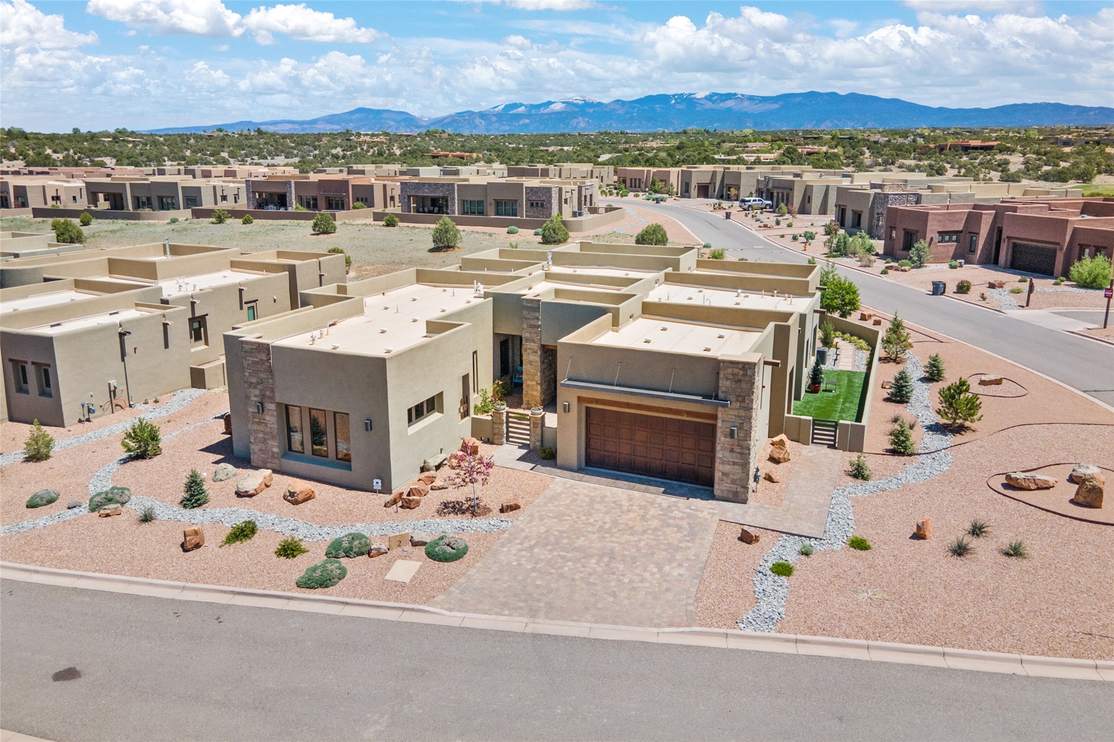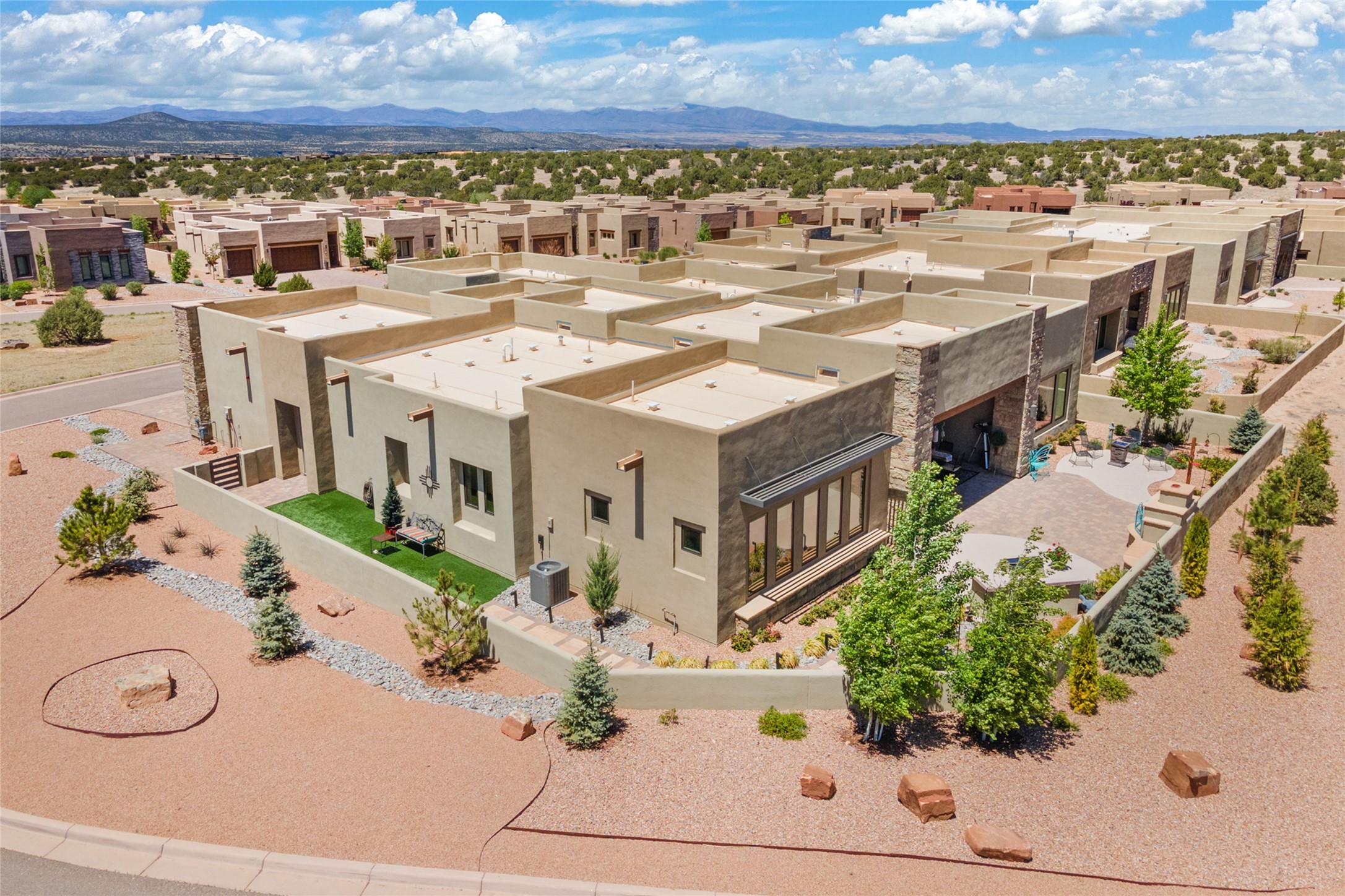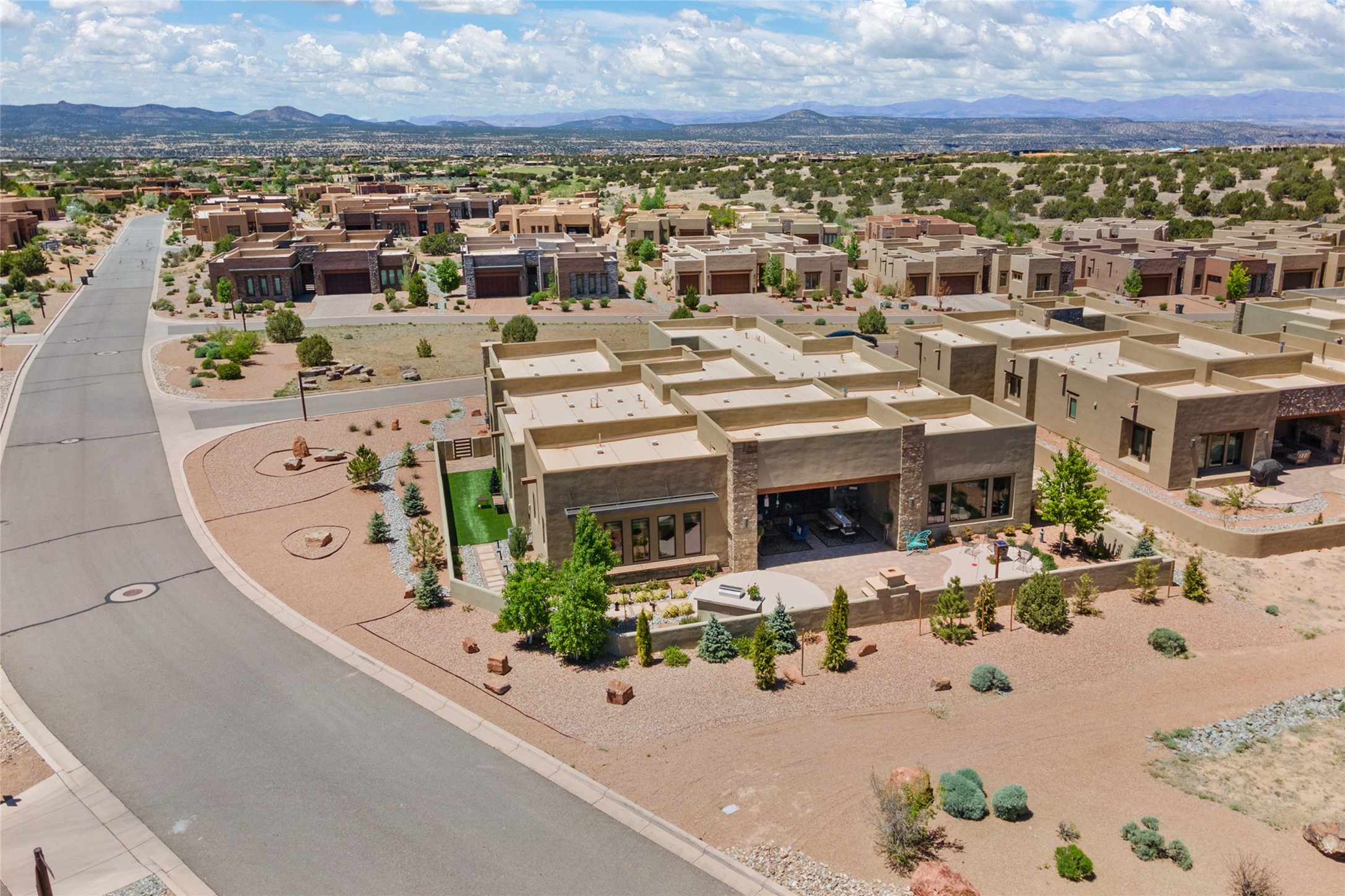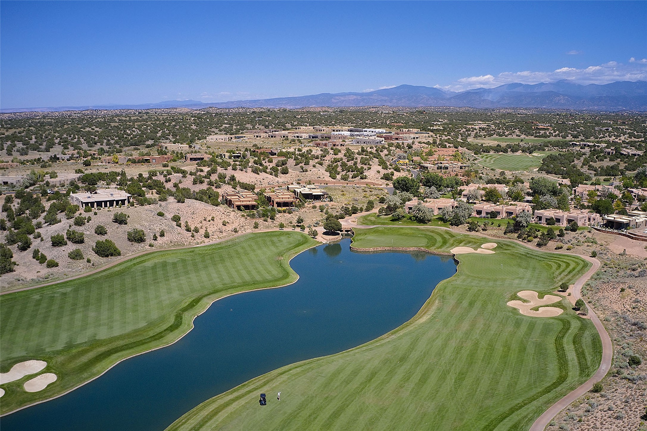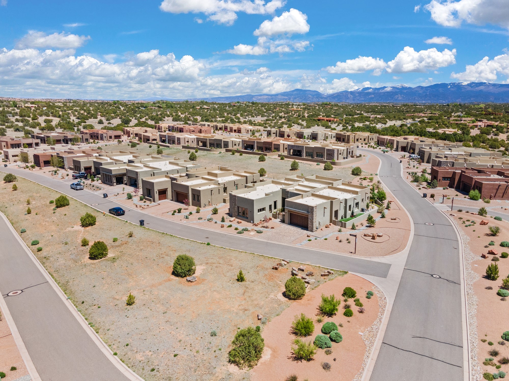 Imagine waking each morning to golden light painting the Sangre de Cristo mountains in shades of rose and amber, streaming through expansive east-facing windows. Nestled on a coveted corner lot in exclusive Las Campanas, this semi-custom property captures your heart from the moment you step through the welcoming courtyard. Picture yourself hosting sunset gatherings on beautifully landscaped brick and stone terraces that flow effortlessly indoors. The living room's dramatic four-panel sliding doors glide open, while your guests gather around the deep portal's romantic kiva-inspired fireplace as you prepare culinary favorites at the integrated outdoor gas kitchen. The gourmet kitchen is spectacular--top-tier appliances, a commanding 126-foot granite island, wine cooler, and walk-in pantry. The primary suite is pure tranquility with stunning mountain views, spa-inspired soaking tub, oversized walk-in shower, and dual closets. With five bedrooms and five baths, there's room for everything you love. Three of those bedrooms surround a spacious hub perfect for your home gym, meditation studio, or playroom, while the detached casita offers welcome privacy as a spacious office or en-suite guest quarters. Share tranquil mornings in the sunroom or cozy evenings in the living room by the six foot natural gas linear fireplace. This home shines with smart-home functionality, soaring arches, elegant tray ceilings, and authentic stone walls. Three lush green belts embrace the property, framing distant views of both the Sangre de Cristo and Jemez ranges. Watch spectacular sunrises and sunsets surrounded by three dozen evergreens and abundant birdlife in this Audubon Sanctuary neighborhood. Minutes from The Club at Las Campanas, enjoy world-class golf and resort amenities. Memberships are available for purchase and upon approval. The seller offers curated furnishings as a separate bill-of-sale for an effortless, move-in-ready experience.