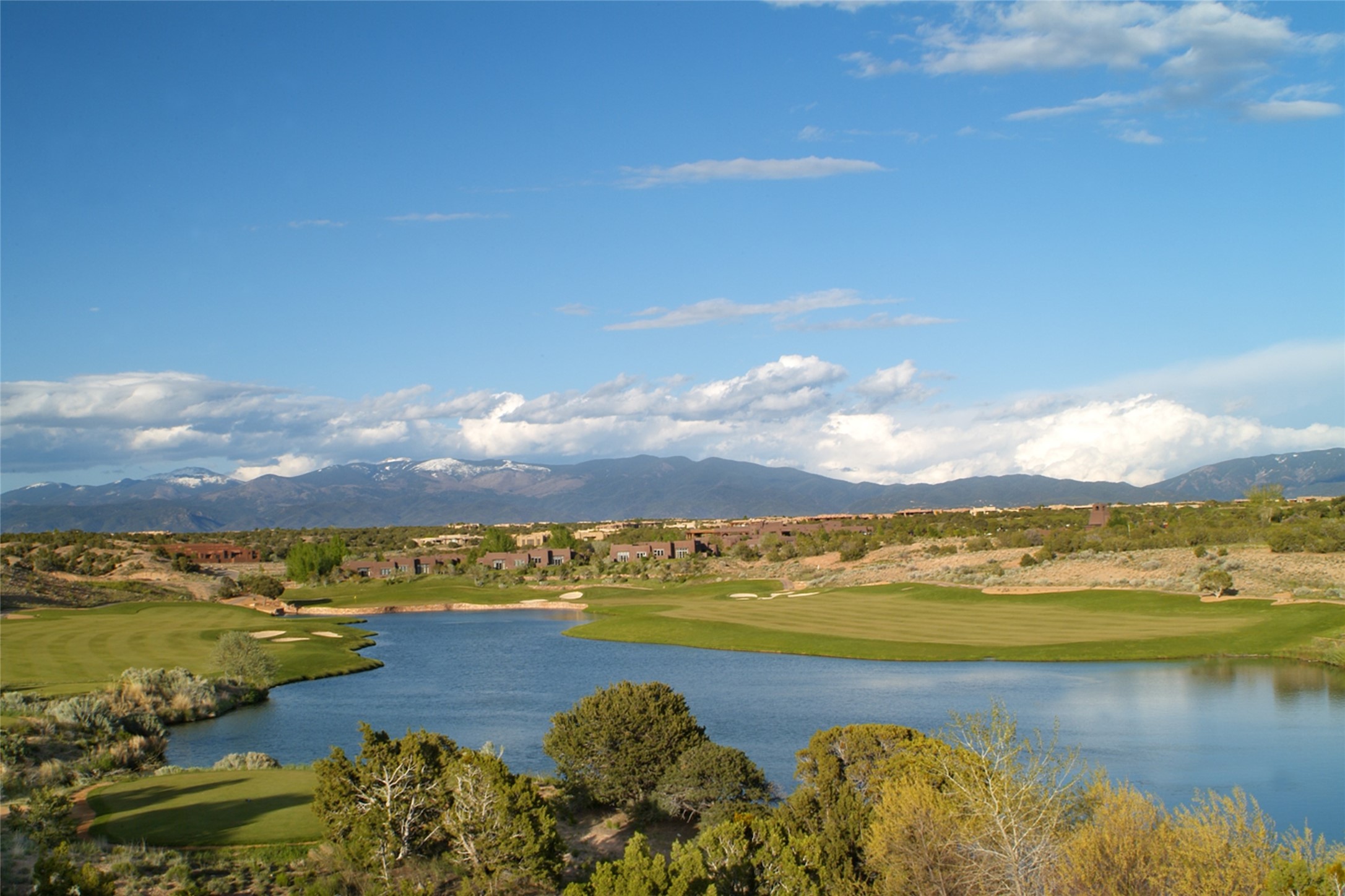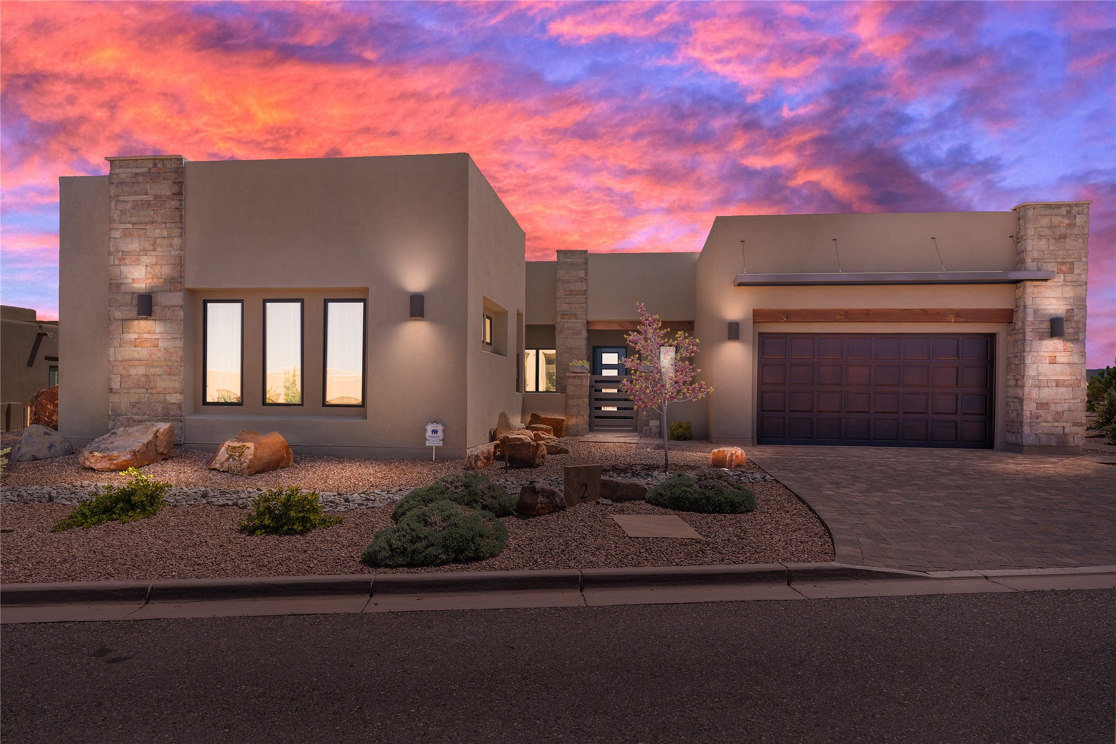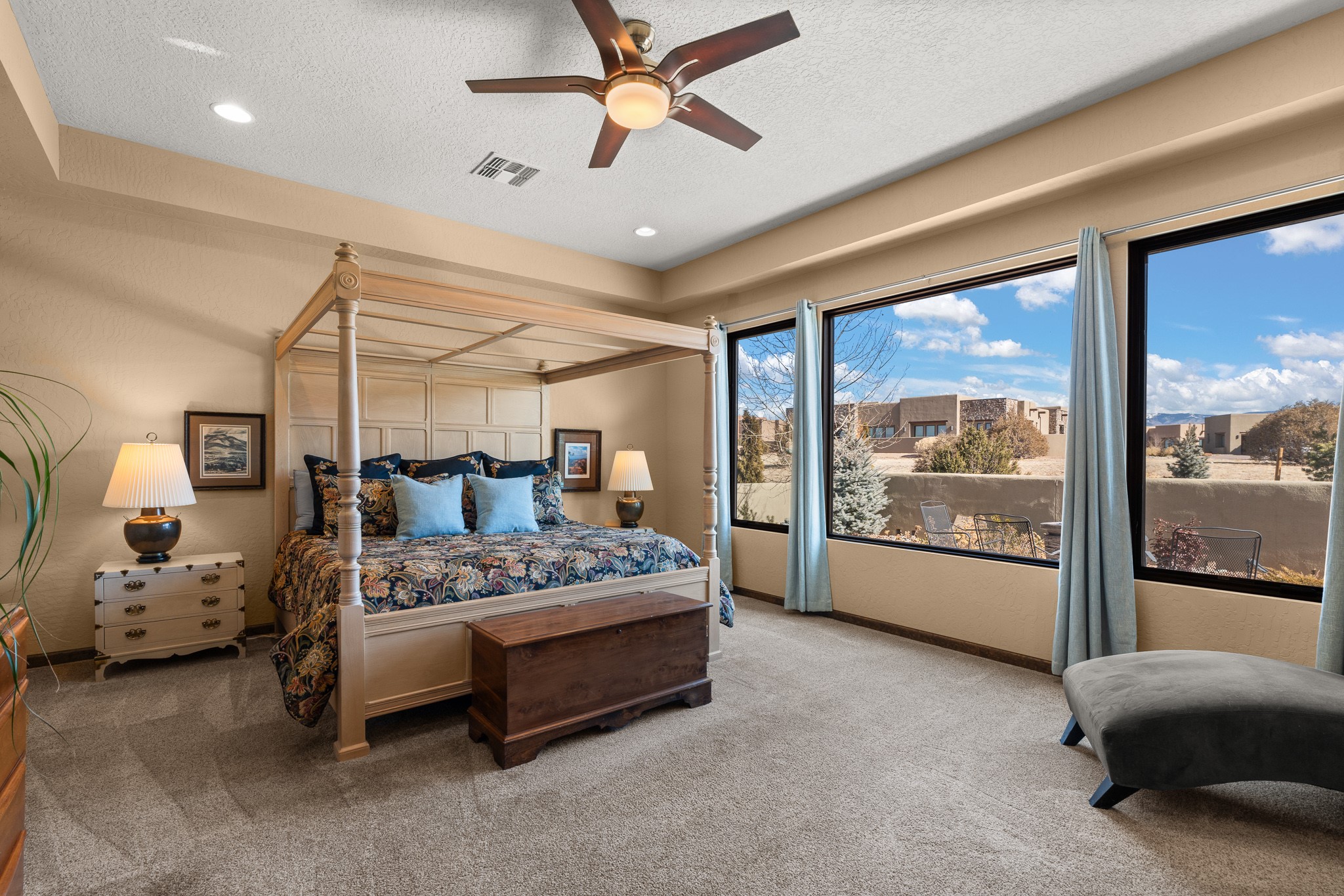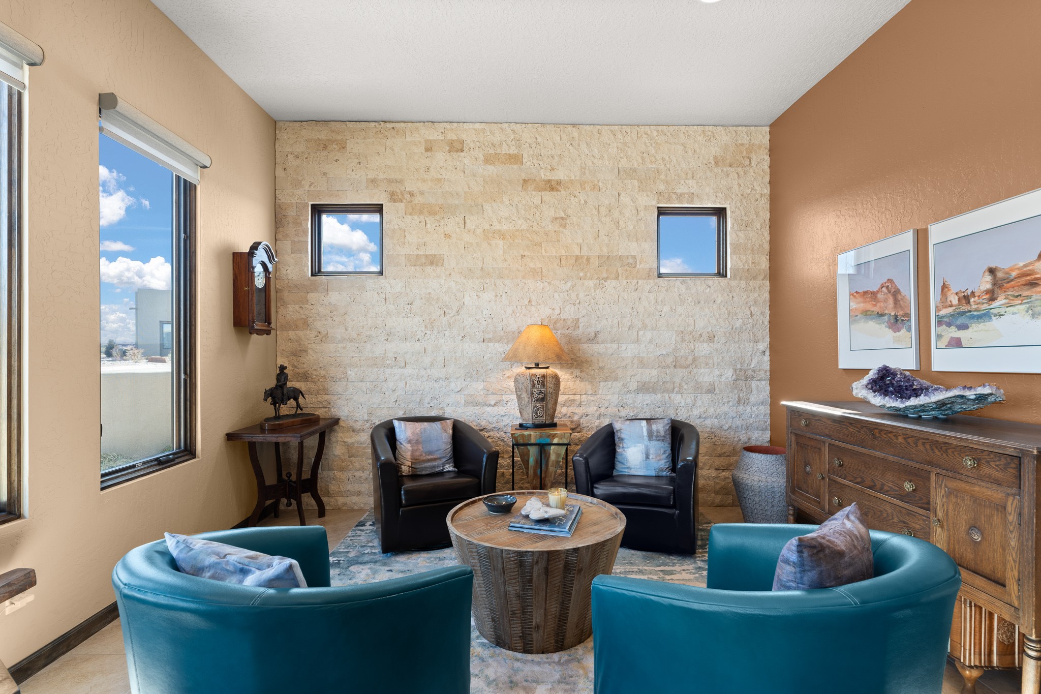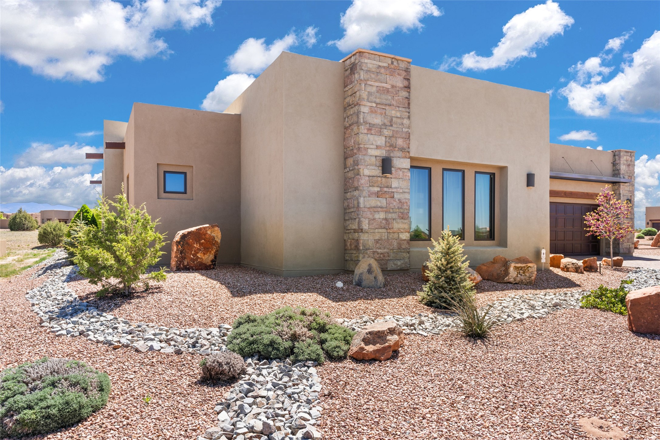 Imagine waking each morning to golden light painting the Sangre de Cristo mountains in shades of rose and amber, streaming through expansive east-facing windows. Nestled on a coveted corner lot in exclusive Las Campanas, this semi-custom property captures your heart from the moment you step through the welcoming courtyard. Picture yourself hosting sunset gatherings on beautifully landscaped brick and stone terraces that flow effortlessly indoors. The living room's dramatic four-panel sliding doors glide open, while your guests gather around the deep portal's romantic kiva-inspired fireplace as you prepare culinary favorites at the integrated outdoor gas kitchen. The gourmet kitchen is spectacular--top-tier appliances, a commanding 126-foot granite island, wine cooler, and walk-in pantry. The primary suite is pure tranquility with stunning mountain views, spa-inspired soaking tub, oversized walk-in shower, and dual closets. With five bedrooms and five baths, there's room for everything you love. Three of those bedrooms surround a spacious hub perfect for your home gym, meditation studio, or playroom, while the detached casita offers welcome privacy as a spacious office or en-suite guest quarters. Share tranquil mornings in the sunroom or cozy evenings in the living room by the six foot natural gas linear fireplace. This home shines with smart-home functionality, soaring arches, elegant tray ceilings, and authentic stone walls. Three lush green belts embrace the property, framing distant views of both the Sangre de Cristo and Jemez ranges. Watch spectacular sunrises and sunsets surrounded by three dozen evergreens and abundant birdlife in this Audubon Sanctuary neighborhood. Minutes from The Club at Las Campanas, enjoy world-class golf and resort amenities. Memberships are available for purchase and upon approval. The seller offers curated furnishings as a separate bill-of-sale for an effortless, move-in-ready experience.