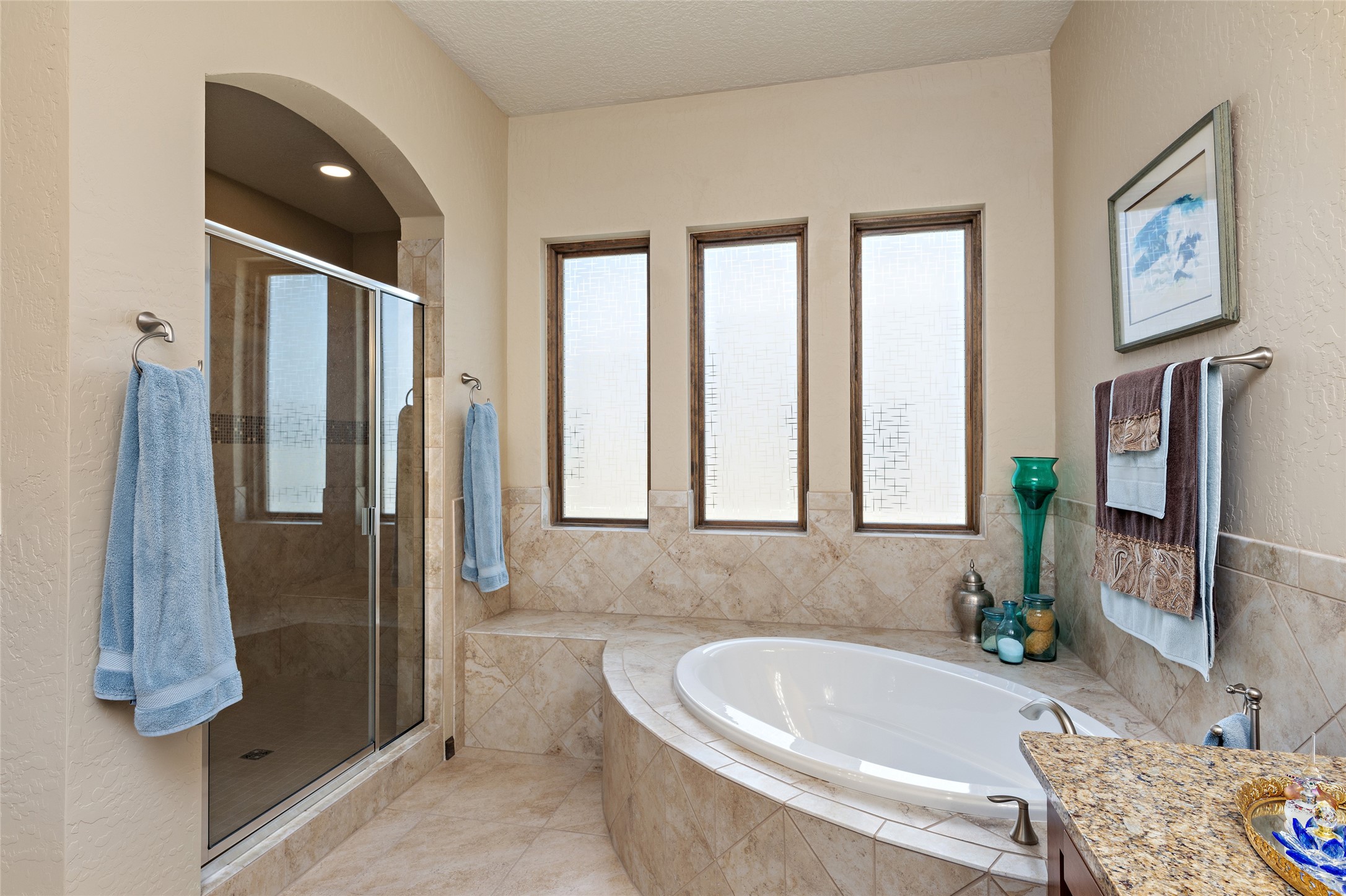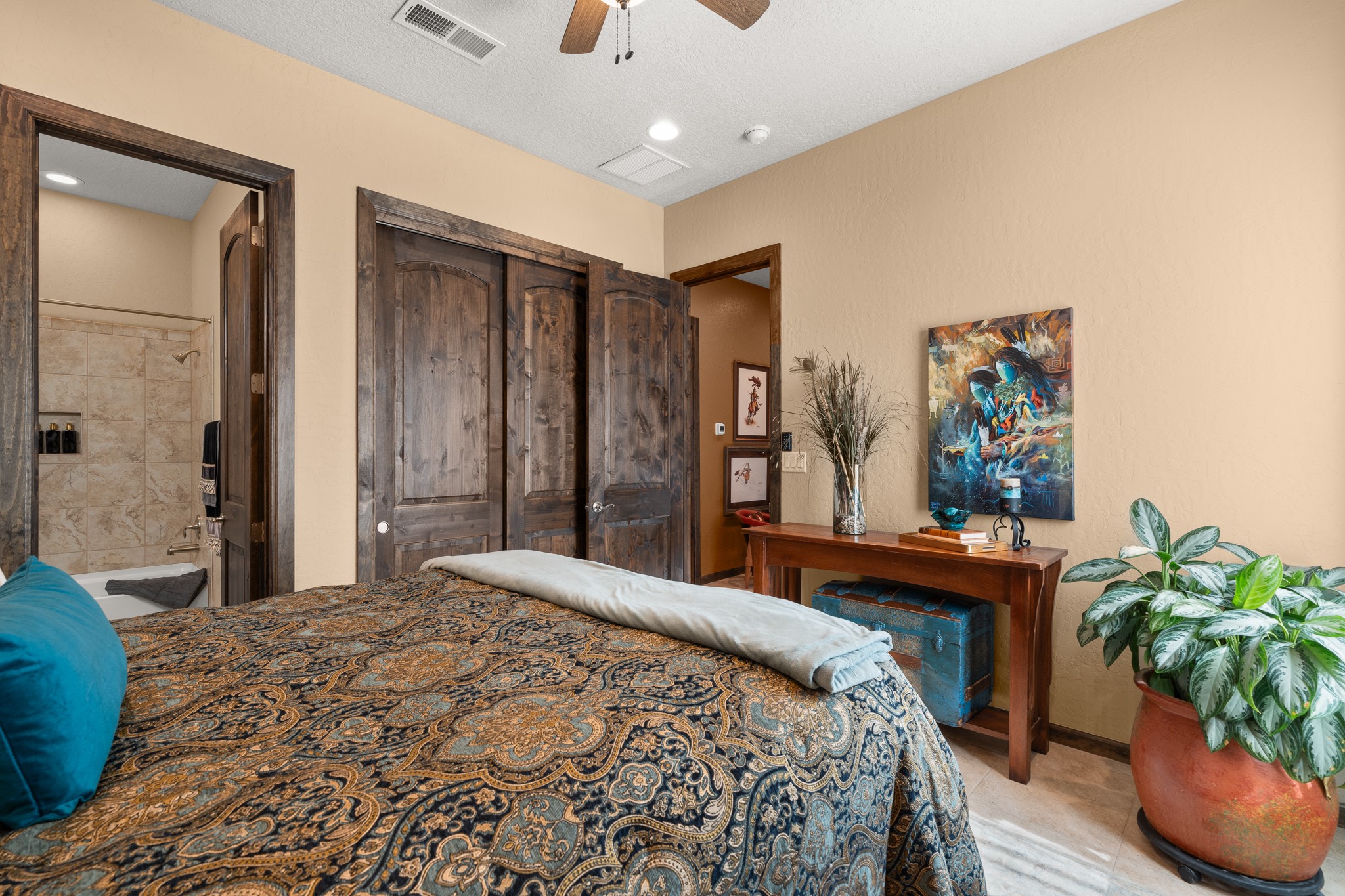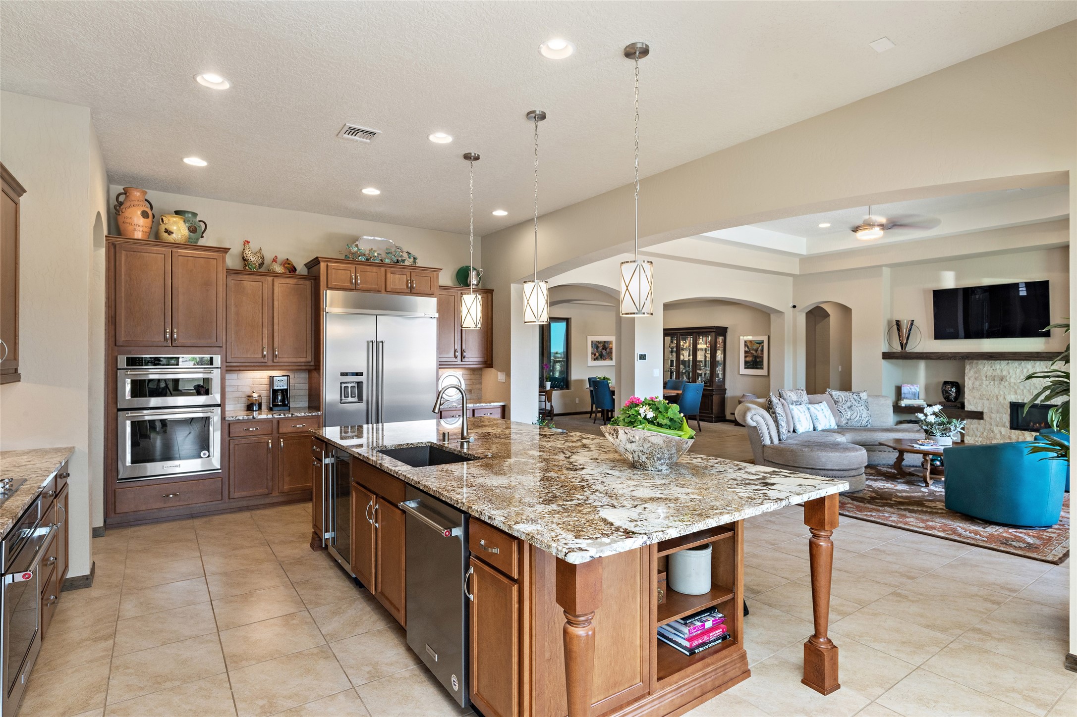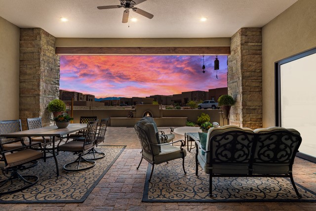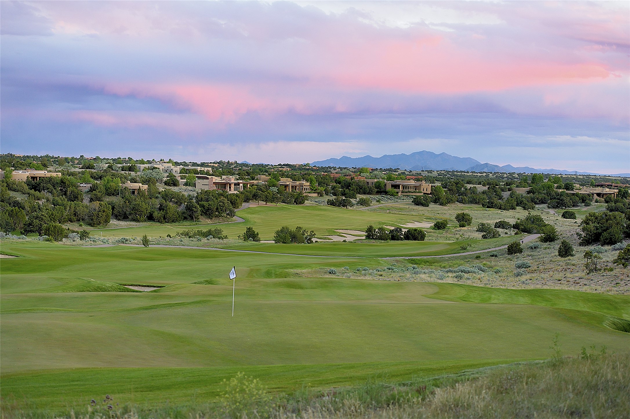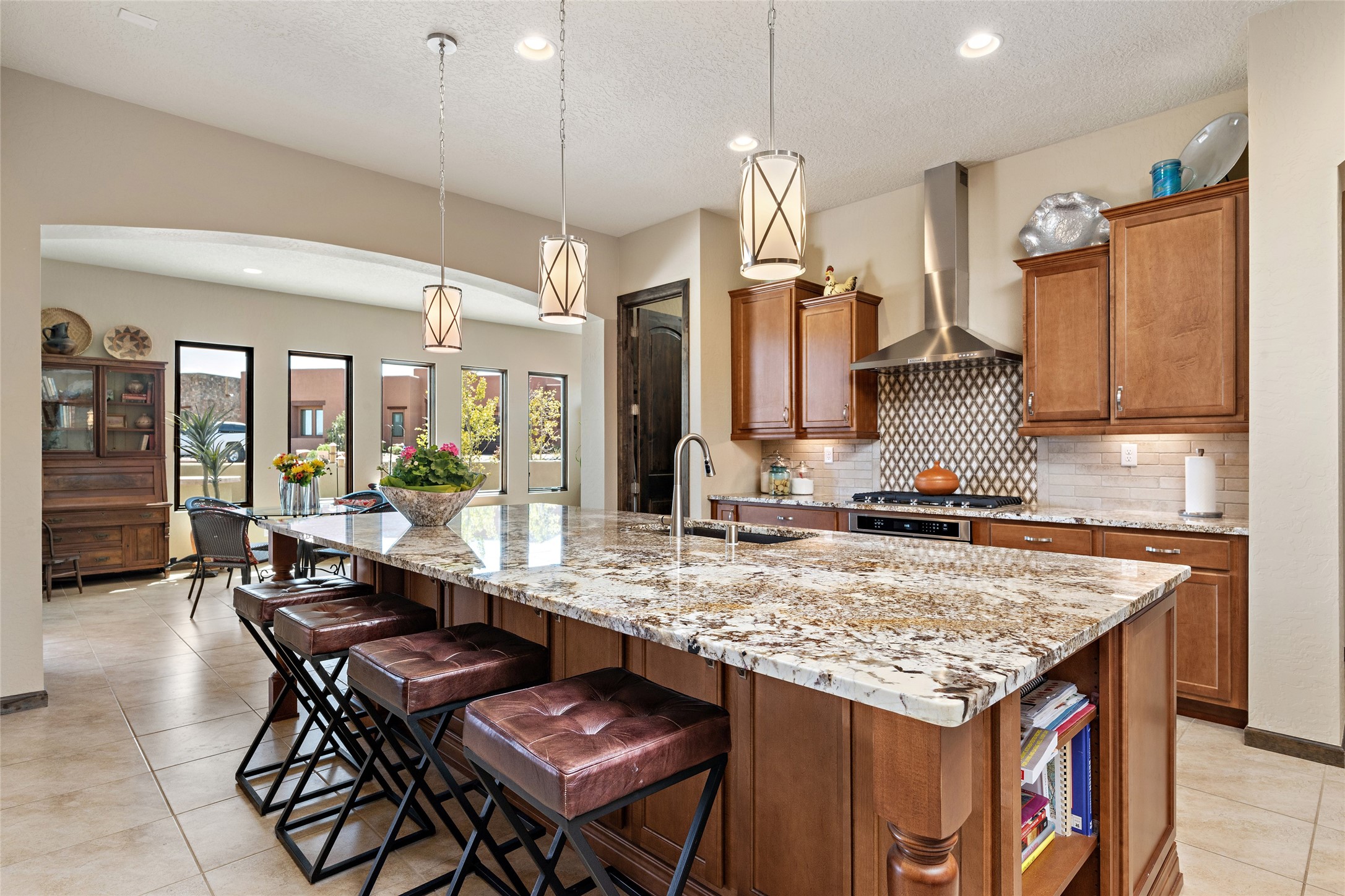 Imagine waking each morning to golden light painting the Sangre de Cristo mountains in shades of rose and amber, streaming through expansive east-facing windows. Nestled on a coveted corner lot in exclusive Las Campanas, this semi-custom property captures your heart from the moment you step through the welcoming courtyard. Picture yourself hosting sunset gatherings on beautifully landscaped brick and stone terraces that flow effortlessly indoors. The living room's dramatic four-panel sliding doors glide open, while your guests gather around the deep portal's romantic kiva-inspired fireplace as you prepare culinary favorites at the integrated outdoor gas kitchen. The gourmet kitchen is spectacular--top-tier appliances, a commanding 126-foot granite island, wine cooler, and walk-in pantry. The primary suite is pure tranquility with stunning mountain views, spa-inspired soaking tub, oversized walk-in shower, and dual closets. With five bedrooms and five baths, there's room for everything you love. Three of those bedrooms surround a spacious hub perfect for your home gym, meditation studio, or playroom, while the detached casita offers welcome privacy as a spacious office or en-suite guest quarters. Share tranquil mornings in the sunroom or cozy evenings in the living room by the six foot natural gas linear fireplace. This home shines with smart-home functionality, soaring arches, elegant tray ceilings, and authentic stone walls. Three lush green belts embrace the property, framing distant views of both the Sangre de Cristo and Jemez ranges. Watch spectacular sunrises and sunsets surrounded by three dozen evergreens and abundant birdlife in this Audubon Sanctuary neighborhood. Minutes from The Club at Las Campanas, enjoy world-class golf and resort amenities. Memberships are available for purchase and upon approval. The seller offers curated furnishings as a separate bill-of-sale for an effortless, move-in-ready experience.