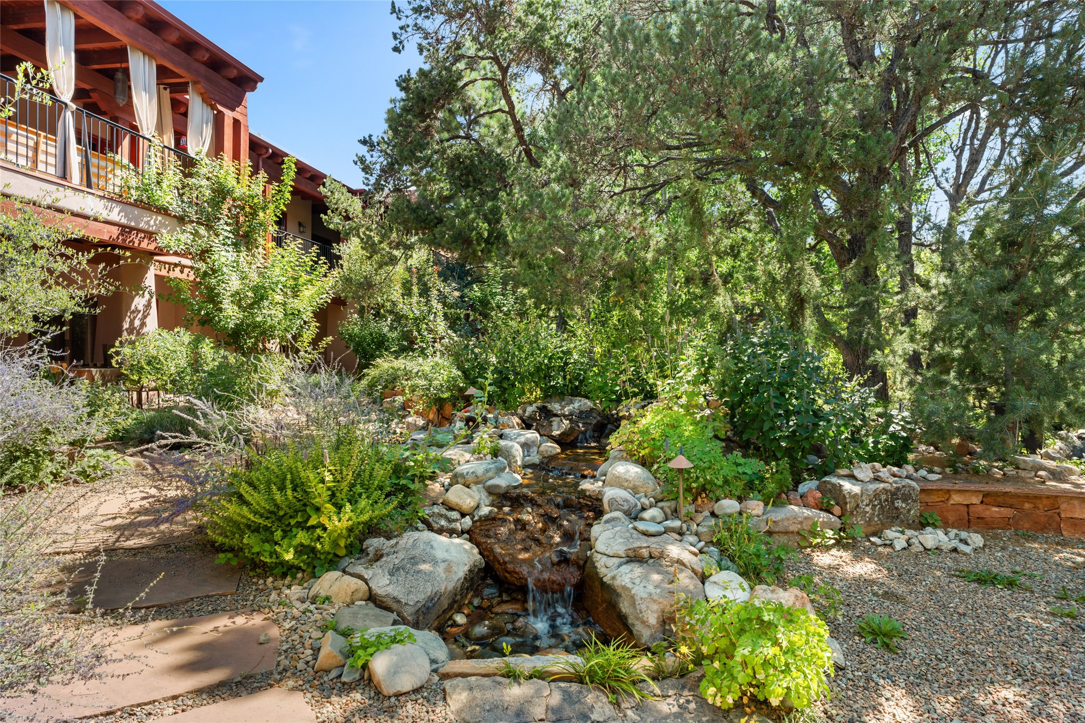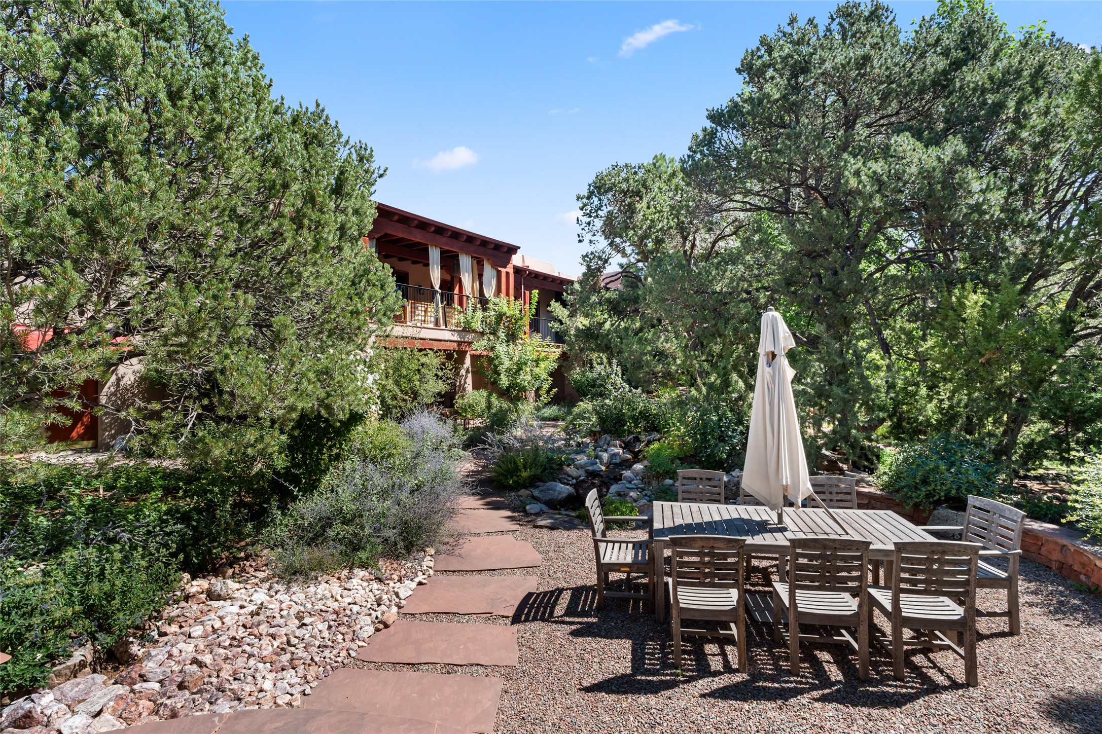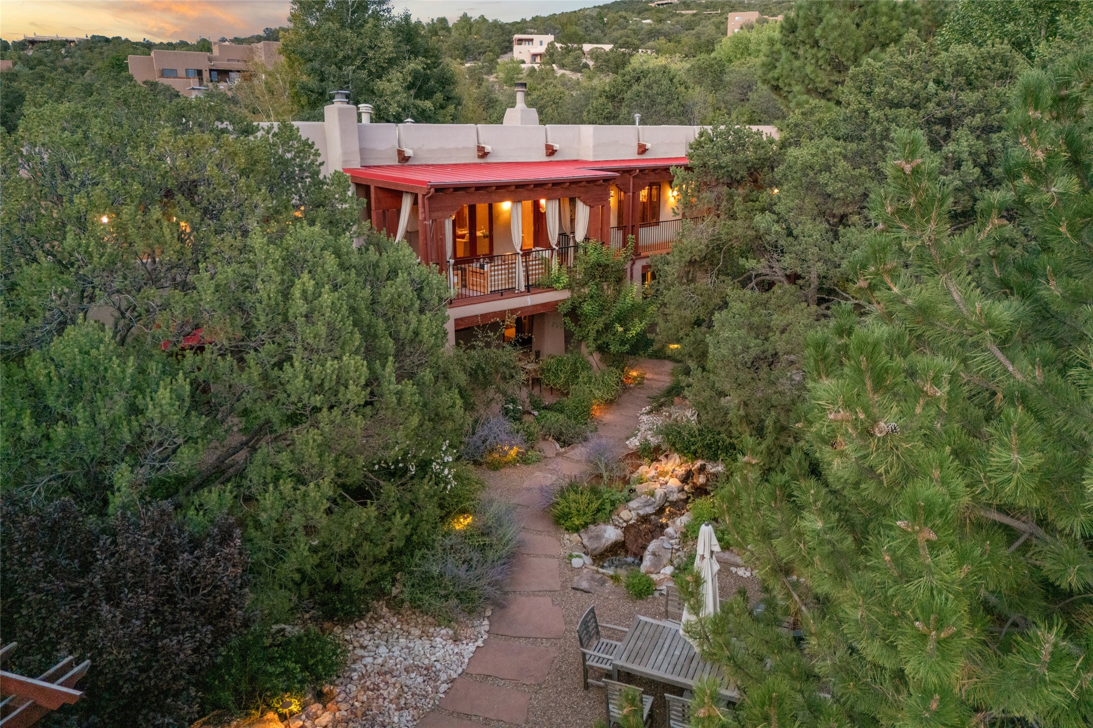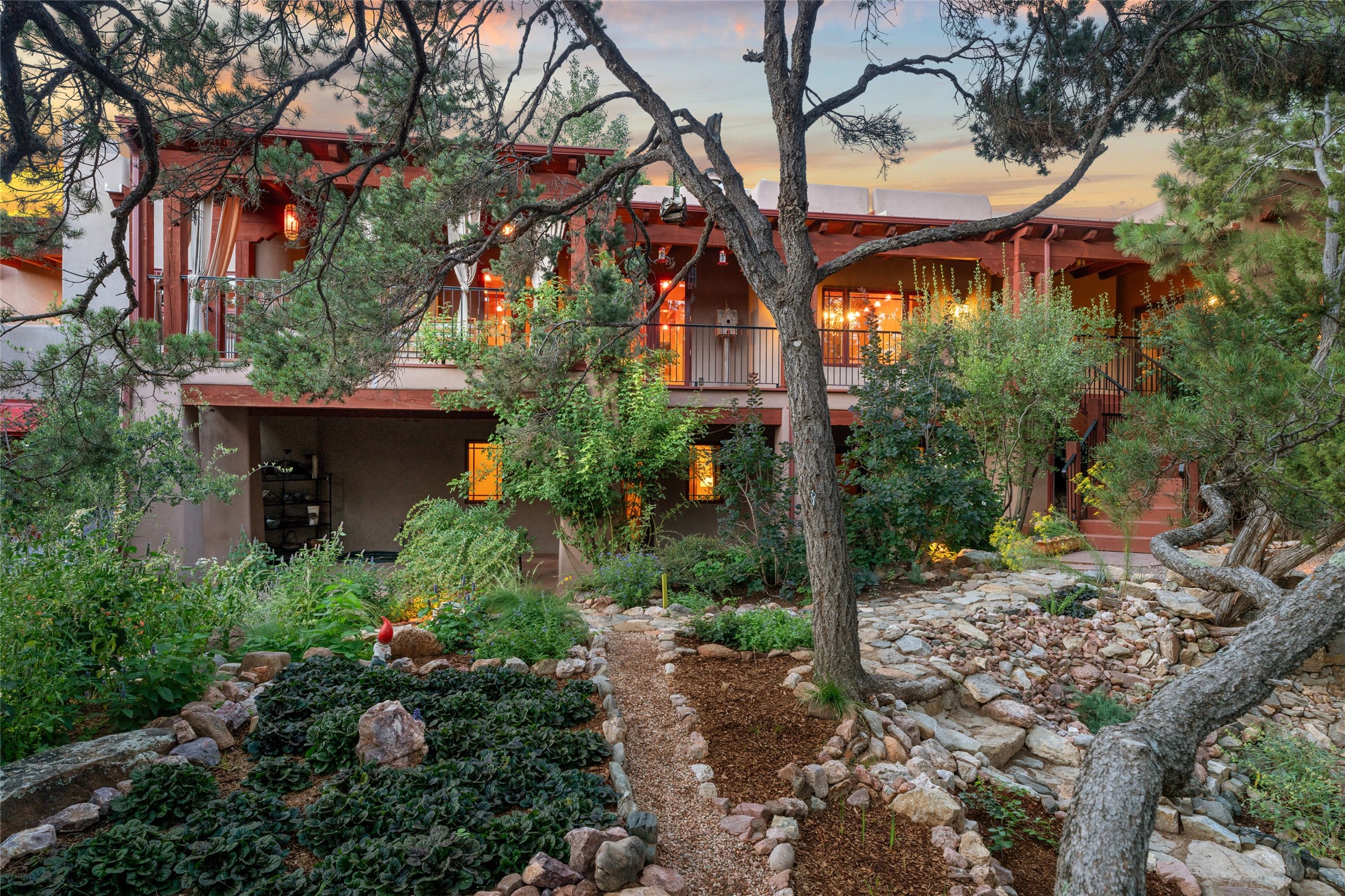 The owners have created a very special sanctuary in the highly desirable Sierra Del Norte neighborhood. The home is a picture of high-end elegance with an incredible outdoor living room portal for entertaining overlooking the gardens and so much more. This is a gardeners dream with outdoor spaces you must see to believe. From the cottonwoods, aspens, walking paths, water features, garden pergola with hot tub and fire pit to the lavishly and tastefully landscaped surroundings, this property is both one of kind intriguing and blissful. The gorgeous kitchen and wet bar, main living spaces and primary suite on the first floor are stunning in every way. Three bedrooms each with their own bathrooms provide ample space and privacy for guests. There is a beautiful double sided fireplace. A kiva in the primary suite and a kiva in the outdoor entertainment area. The home is six minutes from the Plaza. The roads are paved and maintained. The home is insurable.