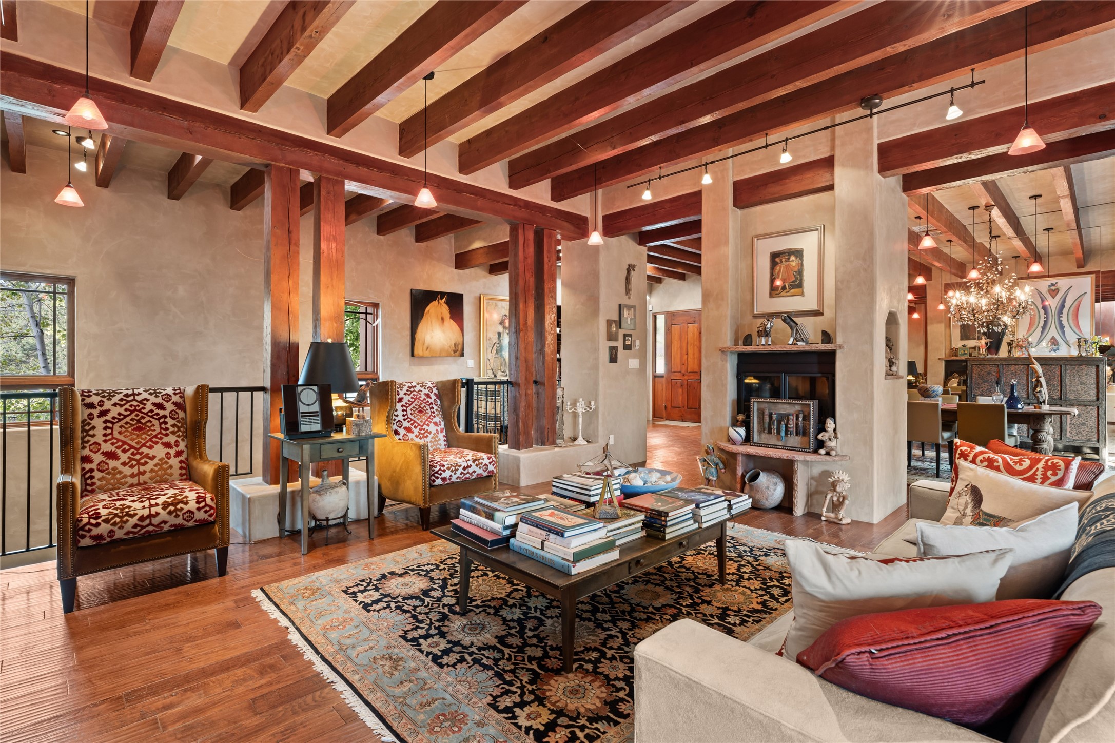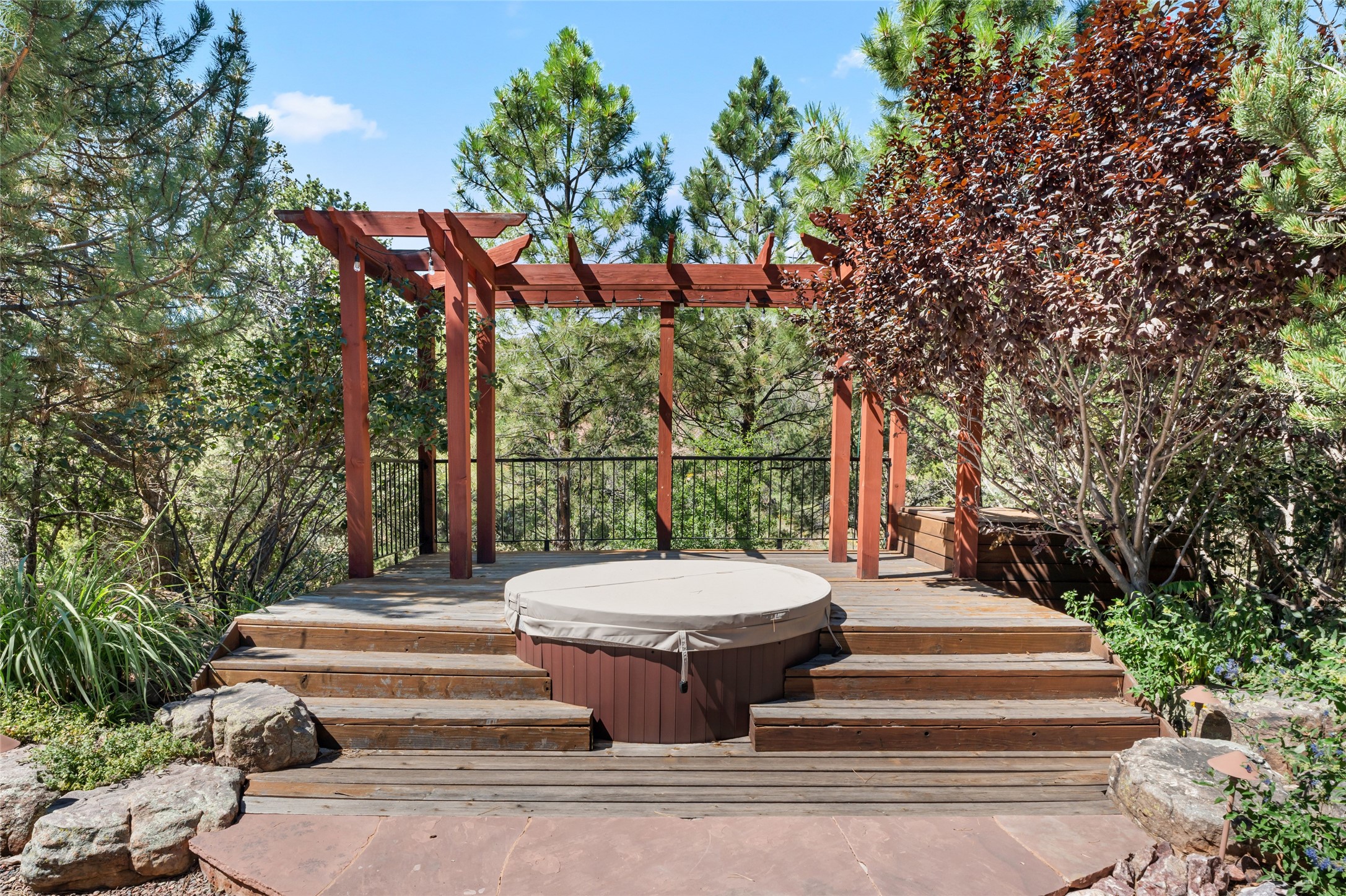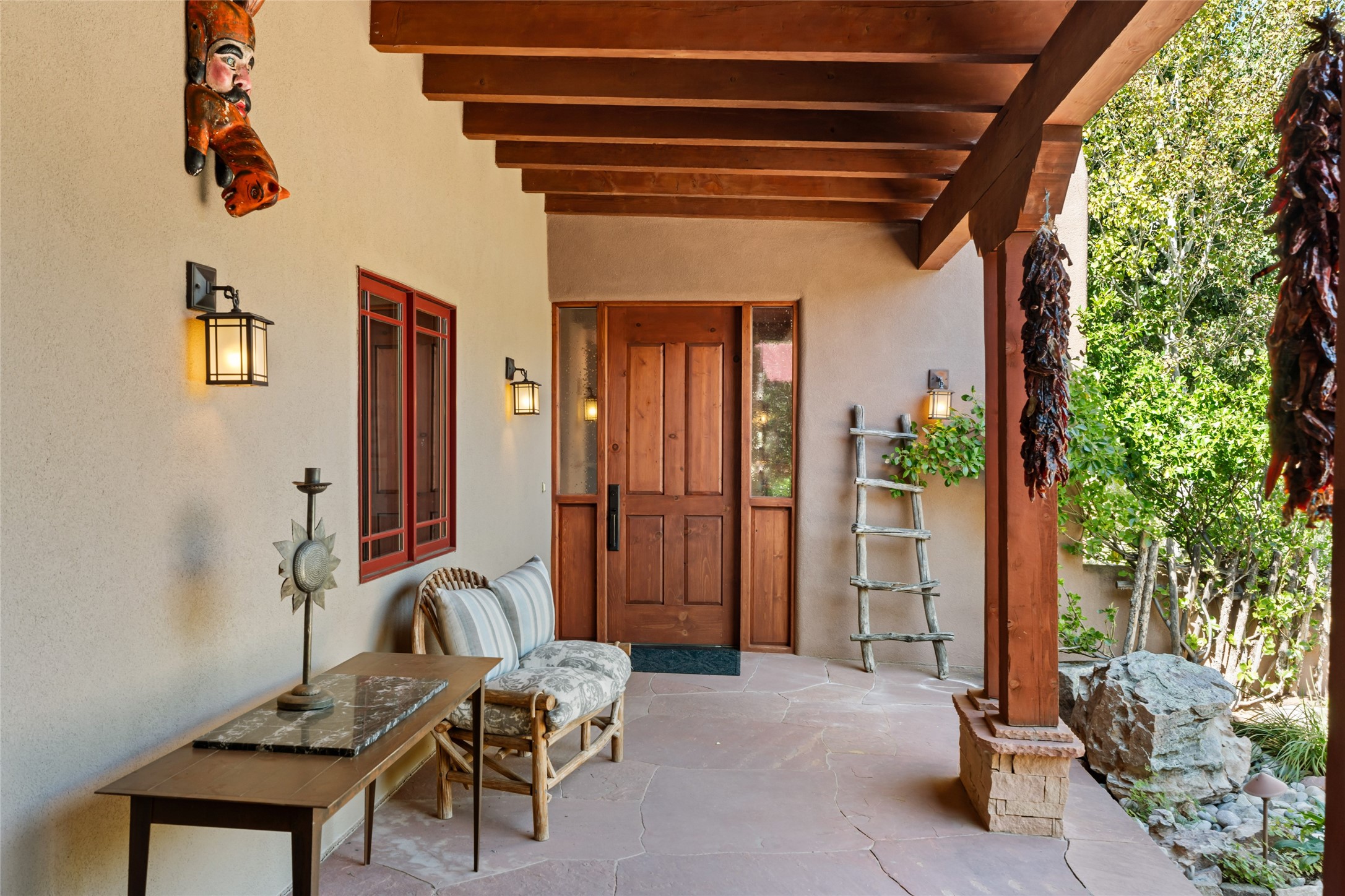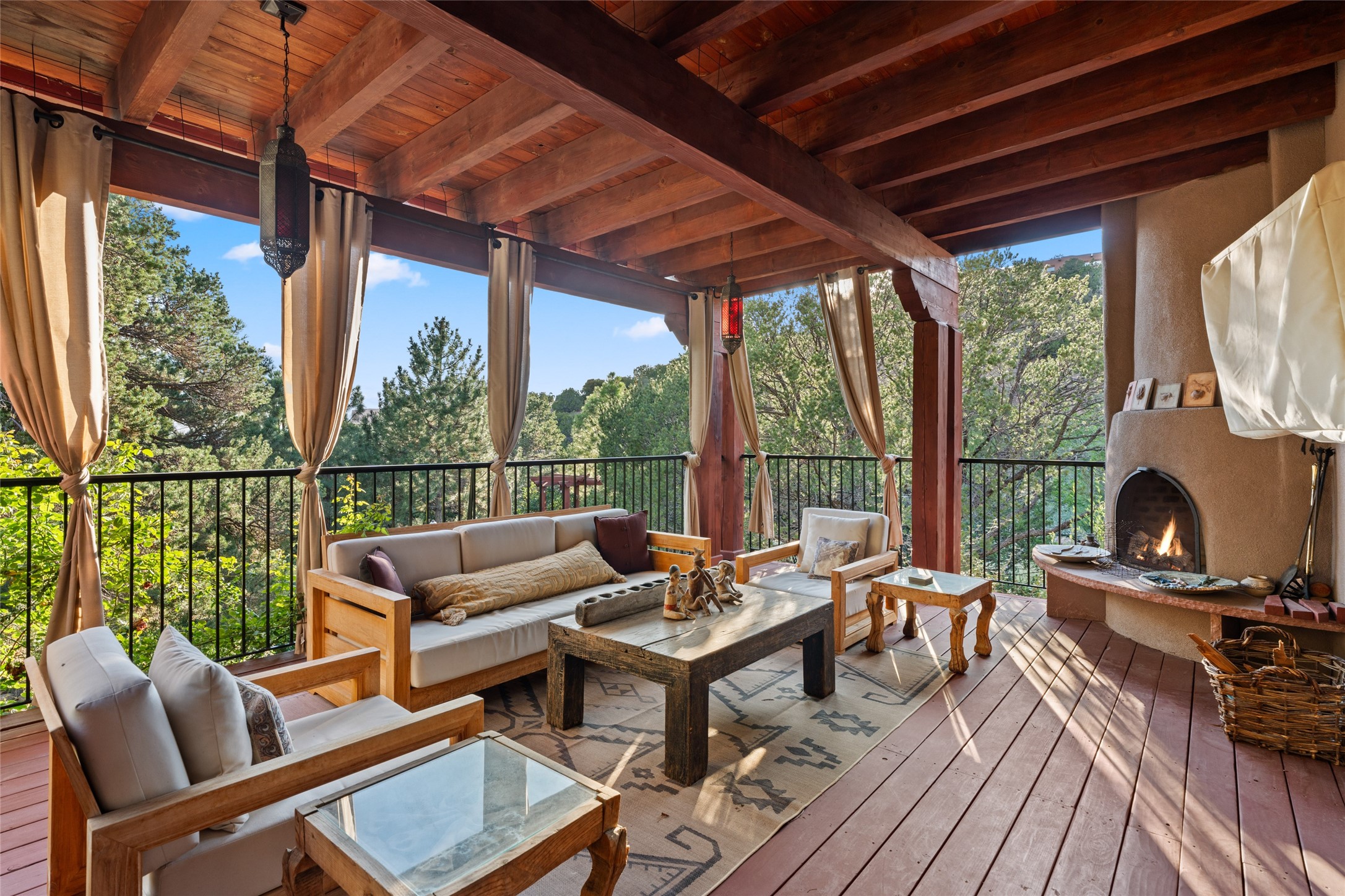 The owners have created a very special sanctuary in the highly desirable Sierra Del Norte neighborhood. The home is a picture of high-end elegance with an incredible outdoor living room portal for entertaining overlooking the gardens and so much more. This is a gardeners dream with outdoor spaces you must see to believe. From the cottonwoods, aspens, walking paths, water features, garden pergola with hot tub and fire pit to the lavishly and tastefully landscaped surroundings, this property is both one of kind intriguing and blissful. The gorgeous kitchen and wet bar, main living spaces and primary suite on the first floor are stunning in every way. Three bedrooms each with their own bathrooms provide ample space and privacy for guests. There is a beautiful double sided fireplace. A kiva in the primary suite and a kiva in the outdoor entertainment area. The home is six minutes from the Plaza. The roads are paved and maintained. The home is insurable.
