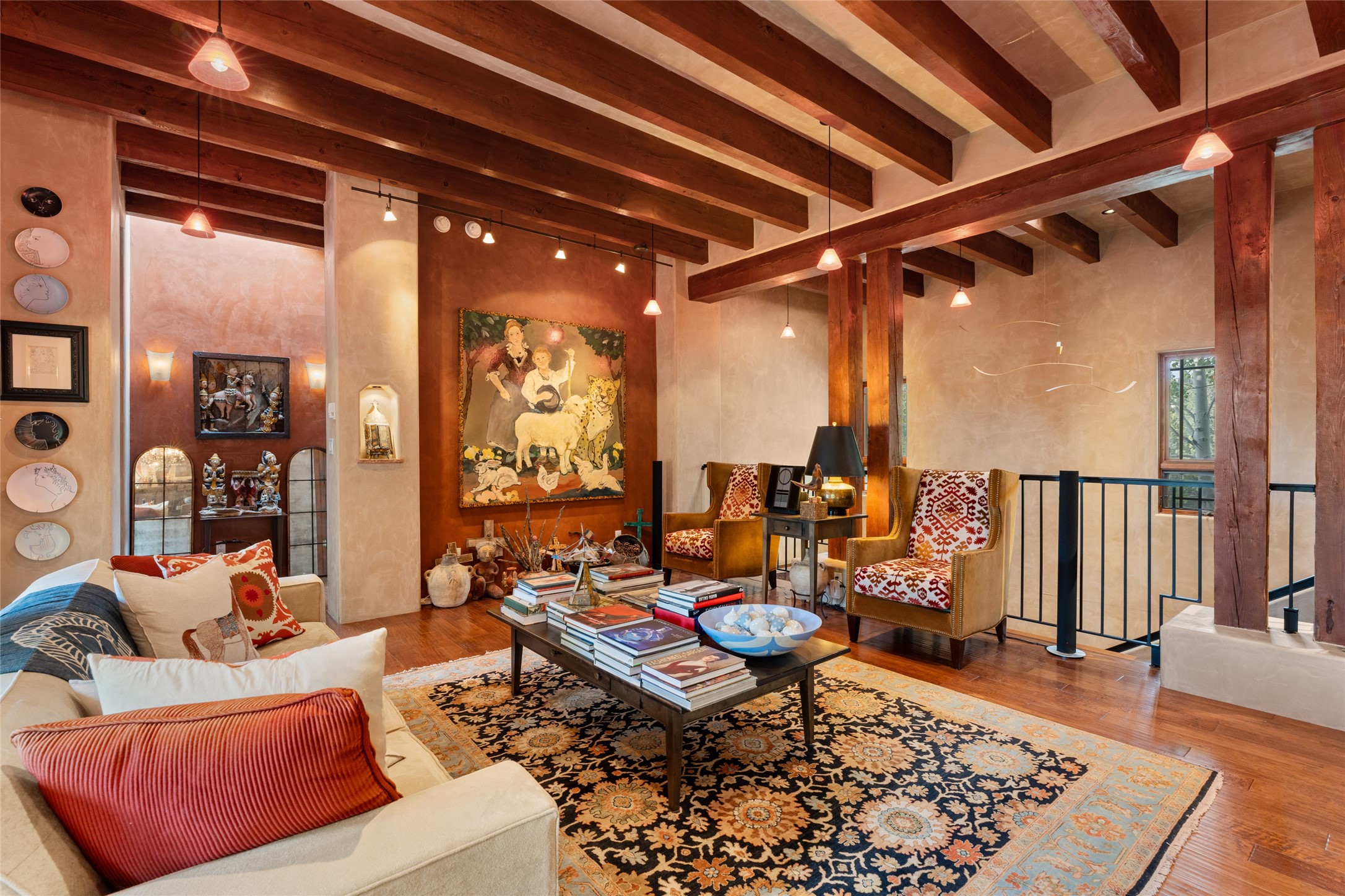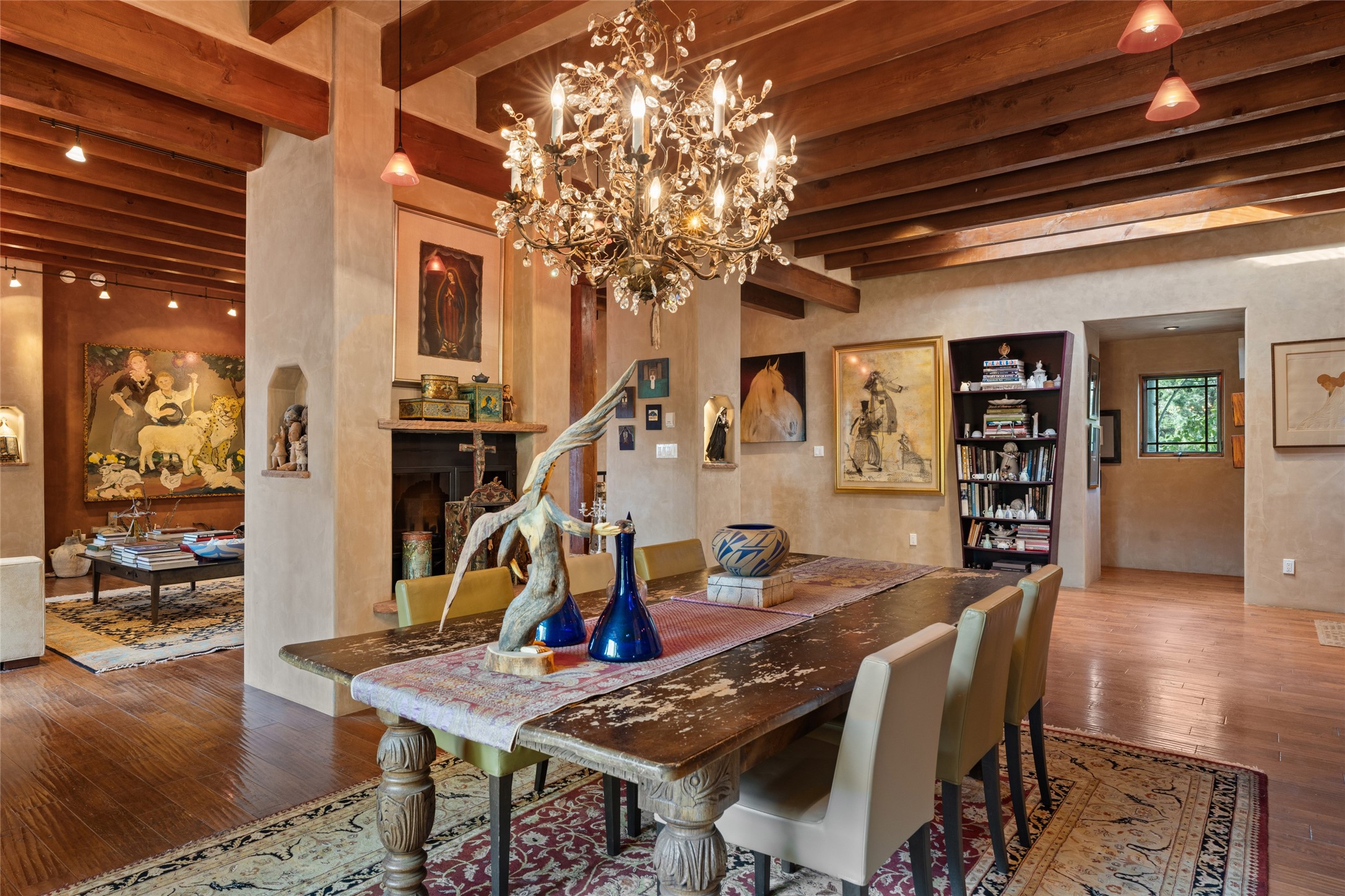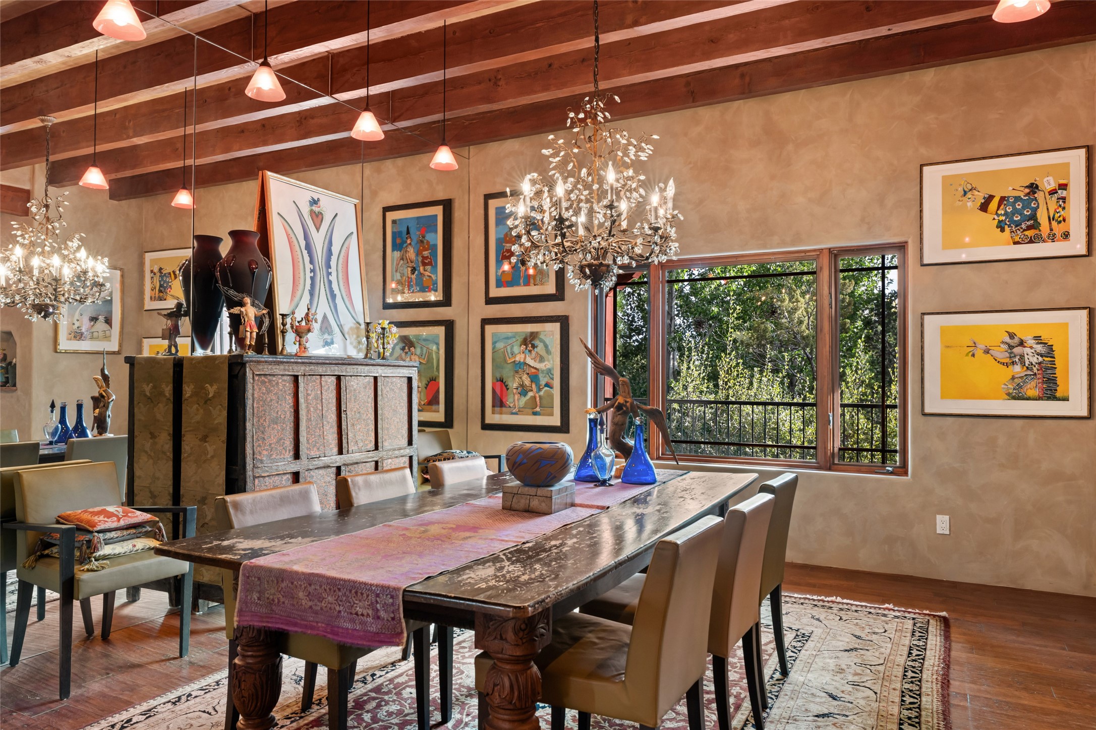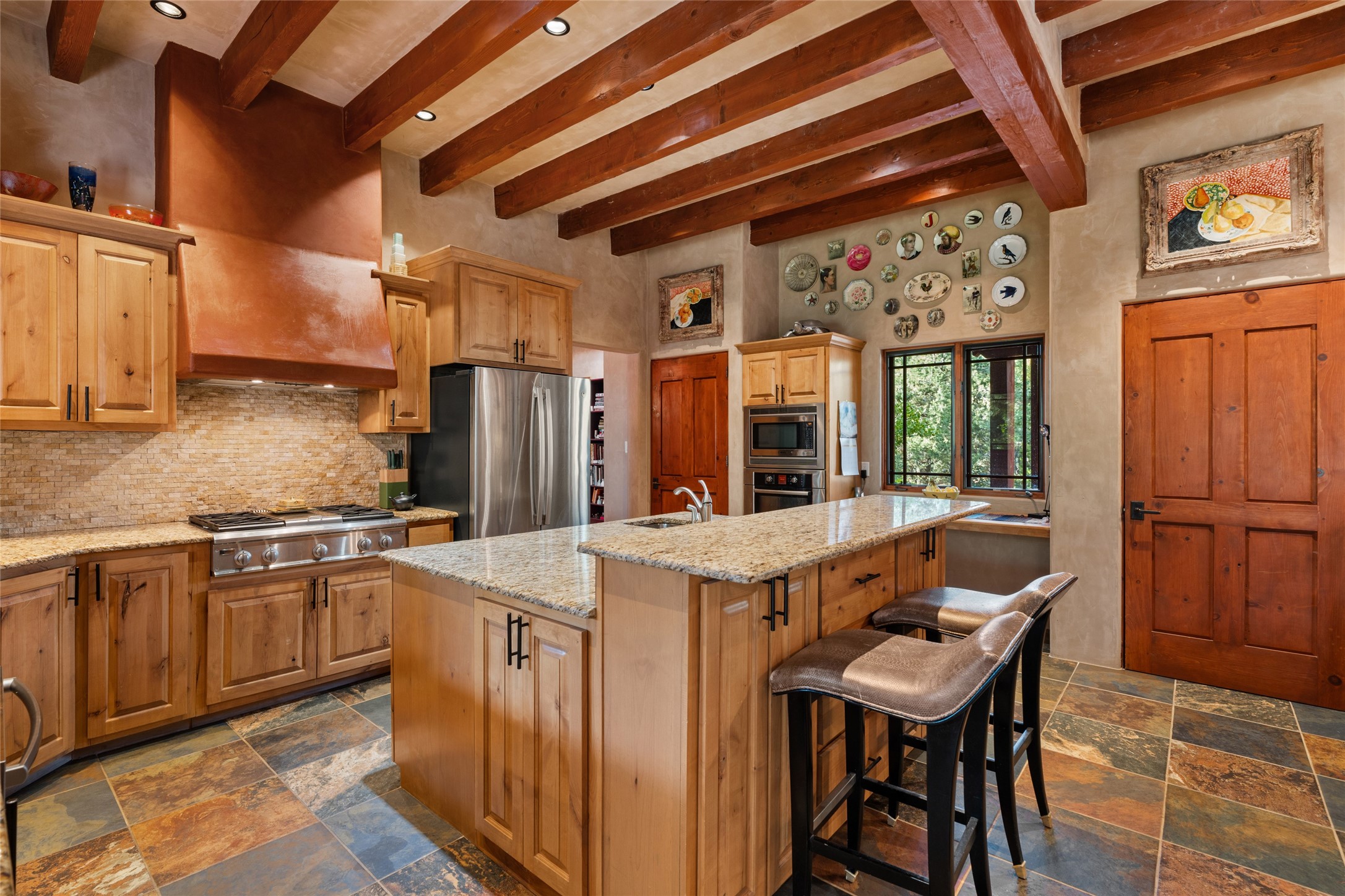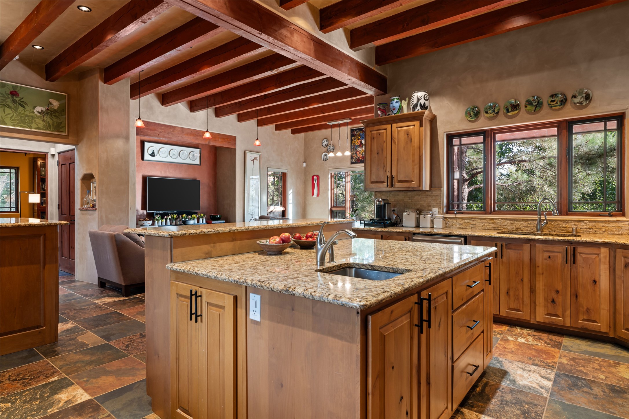 The owners have created a very special sanctuary in the highly desirable Sierra Del Norte neighborhood. The home is a picture of high-end elegance with an incredible outdoor living room portal for entertaining overlooking the gardens and so much more. This is a gardeners dream with outdoor spaces you must see to believe. From the cottonwoods, aspens, walking paths, water features, garden pergola with hot tub and fire pit to the lavishly and tastefully landscaped surroundings, this property is both one of kind intriguing and blissful. The gorgeous kitchen and wet bar, main living spaces and primary suite on the first floor are stunning in every way. Three bedrooms each with their own bathrooms provide ample space and privacy for guests. There is a beautiful double sided fireplace. A kiva in the primary suite and a kiva in the outdoor entertainment area. The home is six minutes from the Plaza. The roads are paved and maintained. The home is insurable.