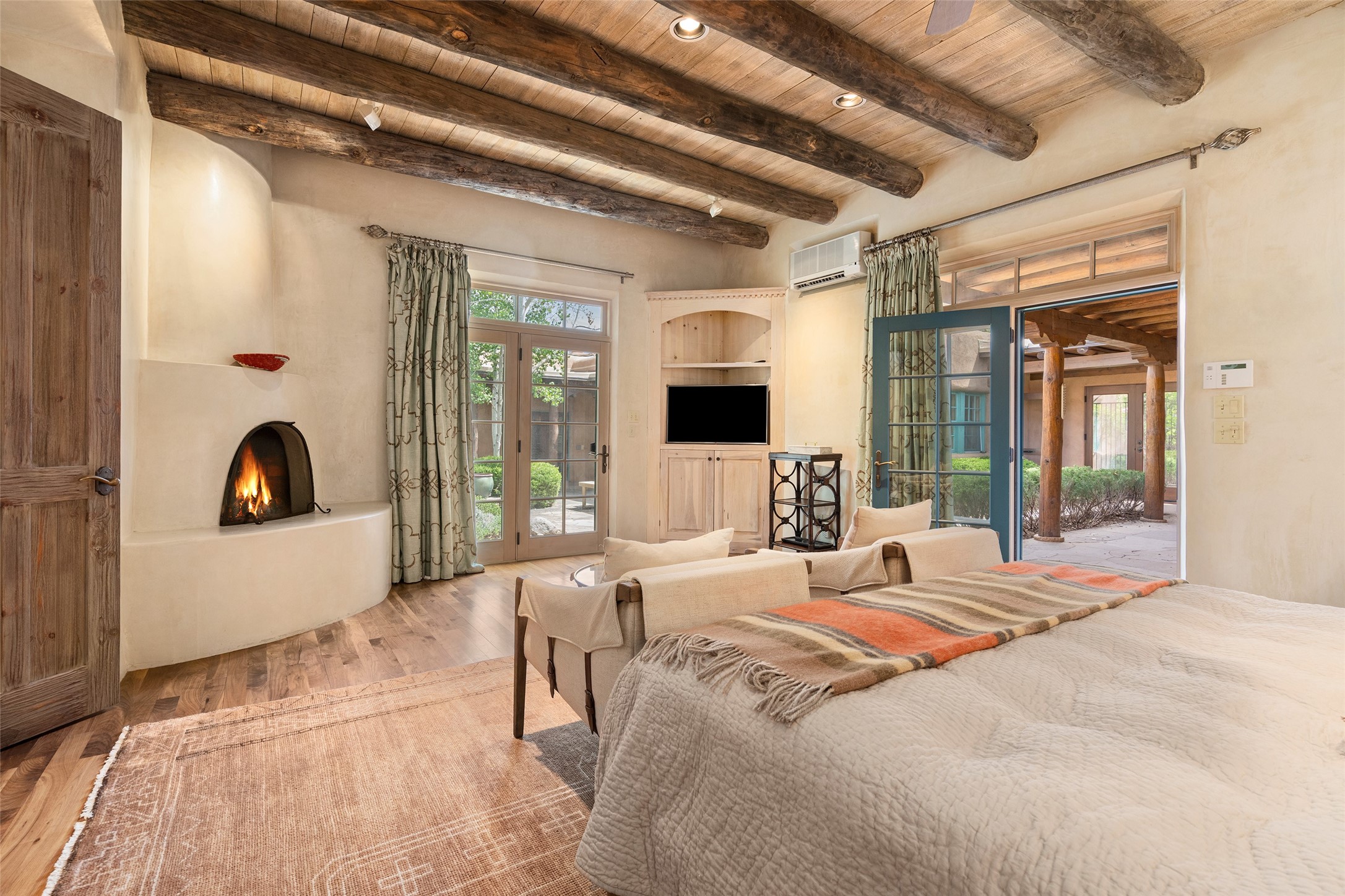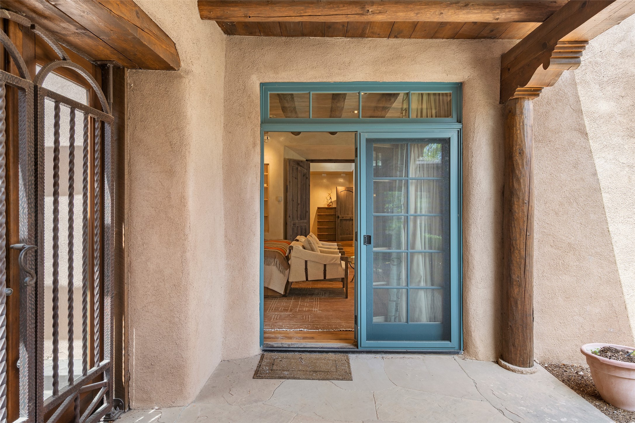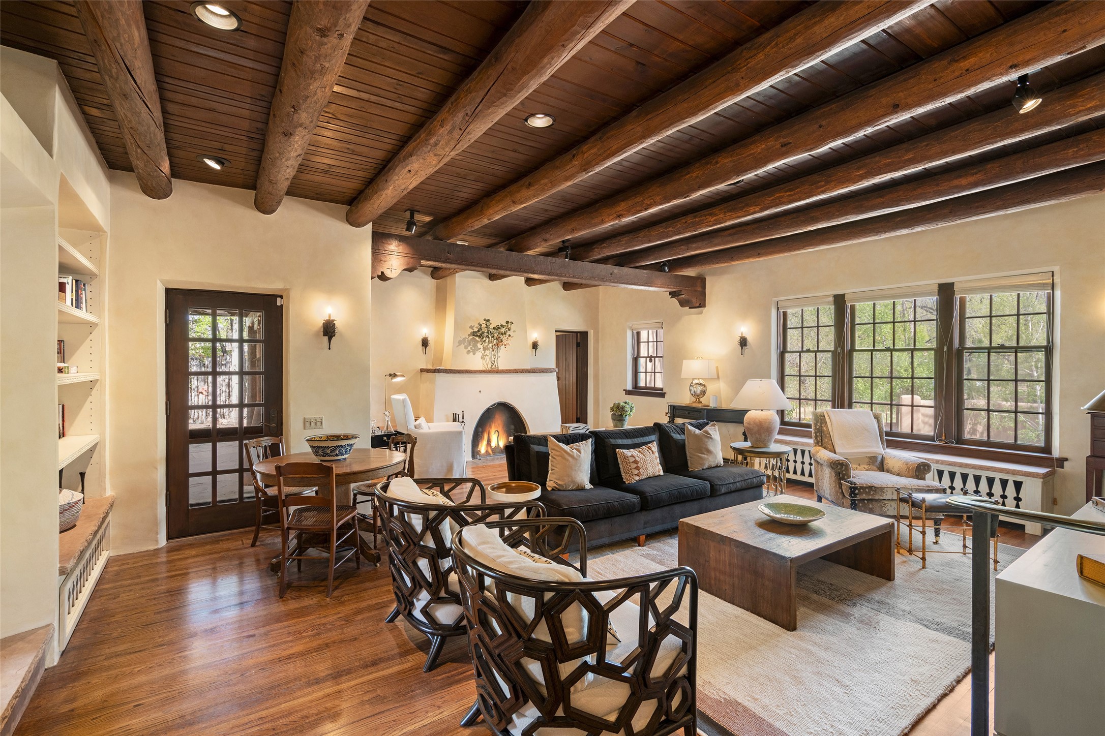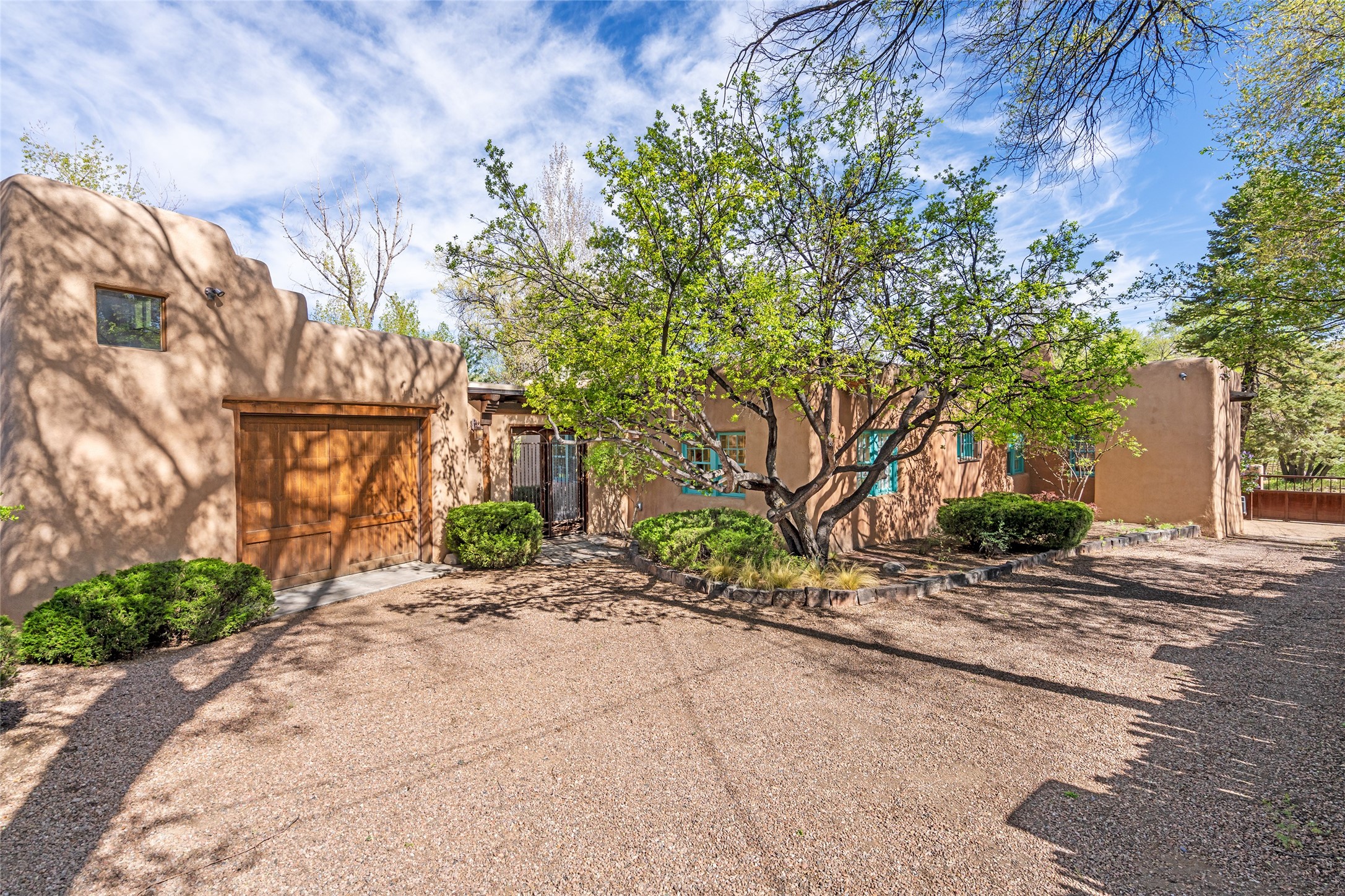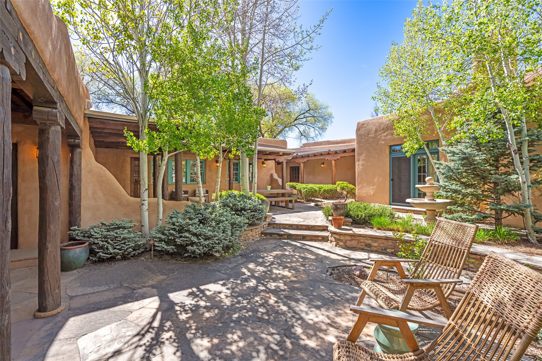 Tucked discreetly behind gates on the quiet, unpaved stretch of East Alameda, this exceptional property offers a rare chance to own one of Santa Fe's Historic Eastside compounds. Centered around a private, lushly landscaped courtyard, the residence includes a classic 3-bedroom main house and a charming casita. The main home is steeped in rich history--its 1929 addition is believe to be the first commission awarded to renowned architect John Gaw Meem. Authentic New Mexican details abound, from hand-hewn vigas to rich wood floors, adobe walls and hand-poured glass windows that speak to the home's timeless character. The chef's kitchen anchors the main house, featuring granite countertops, Wolf and Subzero appliances, and luxurious touches such as a pot filler, wine cooler, wet bar, and generous workspace. There's a small room off the front portal with its own kiva fireplace - an ideal office. The third bedroom has shelving, a sink and extra studio lighting. Added later the casita mirrors the charm of the main house with classic finishes blended seamlessly with modern comforts. Designed to function as a deluxe primary suite, it boasts two elegant bathrooms, a second bedroom that could be used as workout room. The primary bedroom has a kiva and doors opening to the courtyard. The central courtyard, ringed with mature aspens and vibrant flowering plants, offers an enchanting backdrop for al fresco dining or quiet moments of reflection. With a new roof in spring 2024 and mini splits this home is ready for its new owners to move in. It's rare to find these oversized lots in the Historic Eastside, a one-car garage with extra storage and ample parking--so close to the historic Plaza. Located just steps from the Santa Fe River Trail, Canyon Road galleries and restaurants; this walled compound offers an unparalleled blend of privacy and classic Santa Fe charm in one of the city's most beloved neighborhoods.