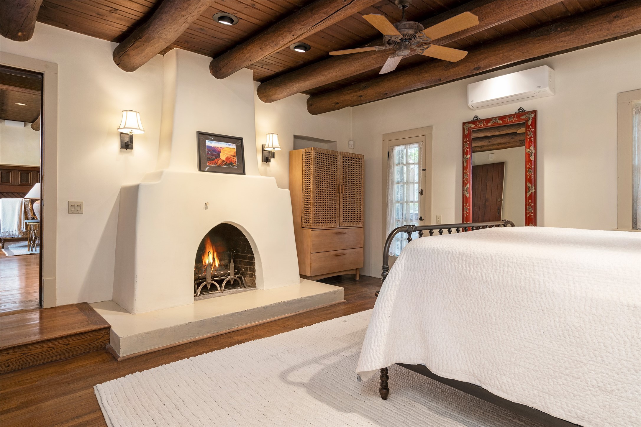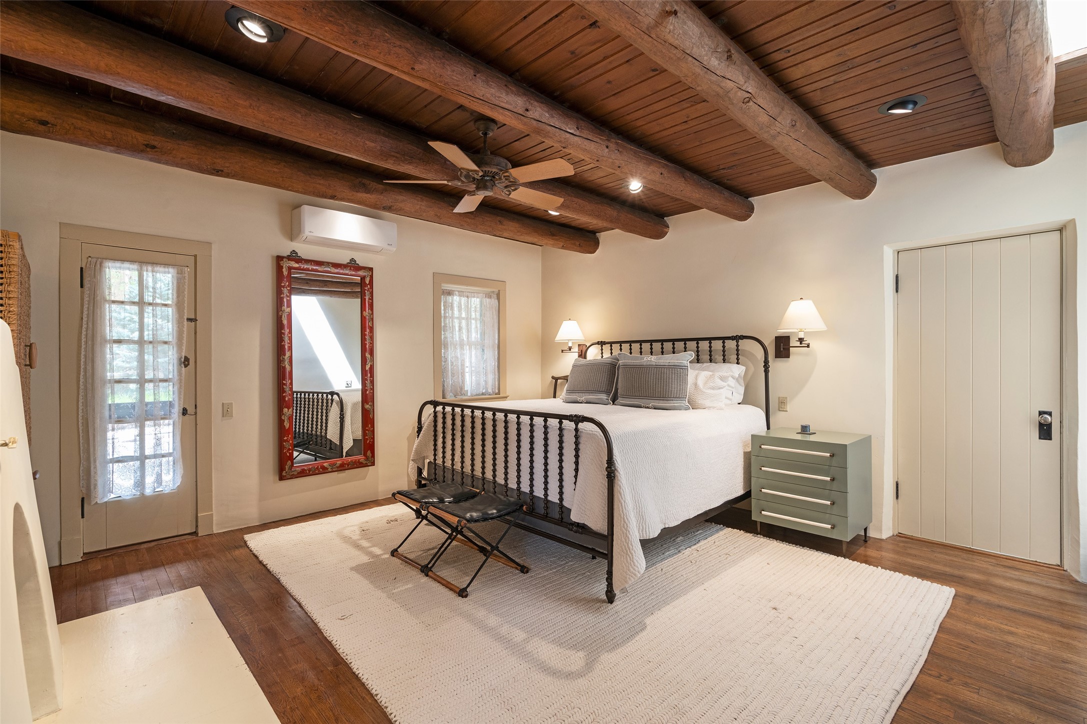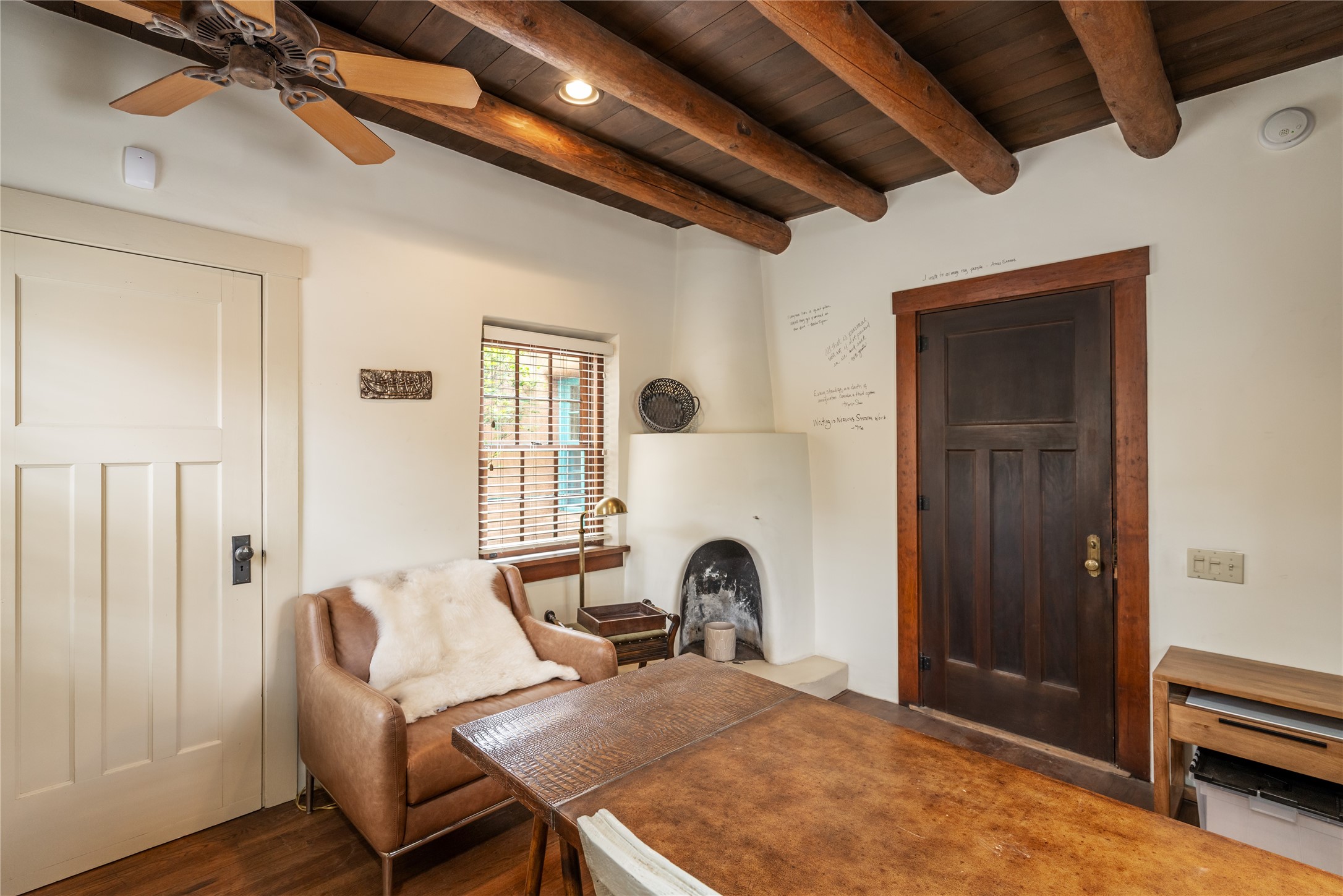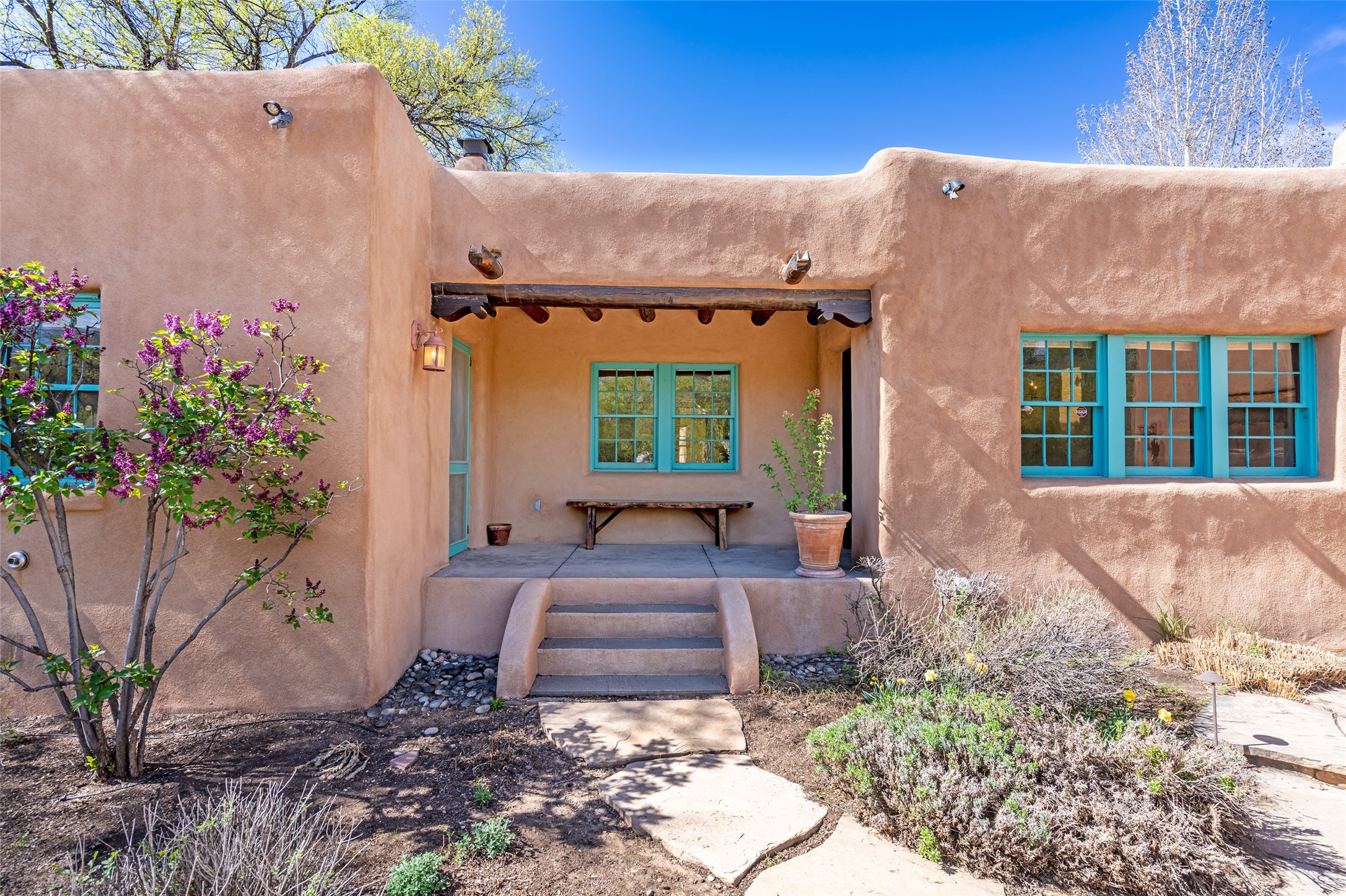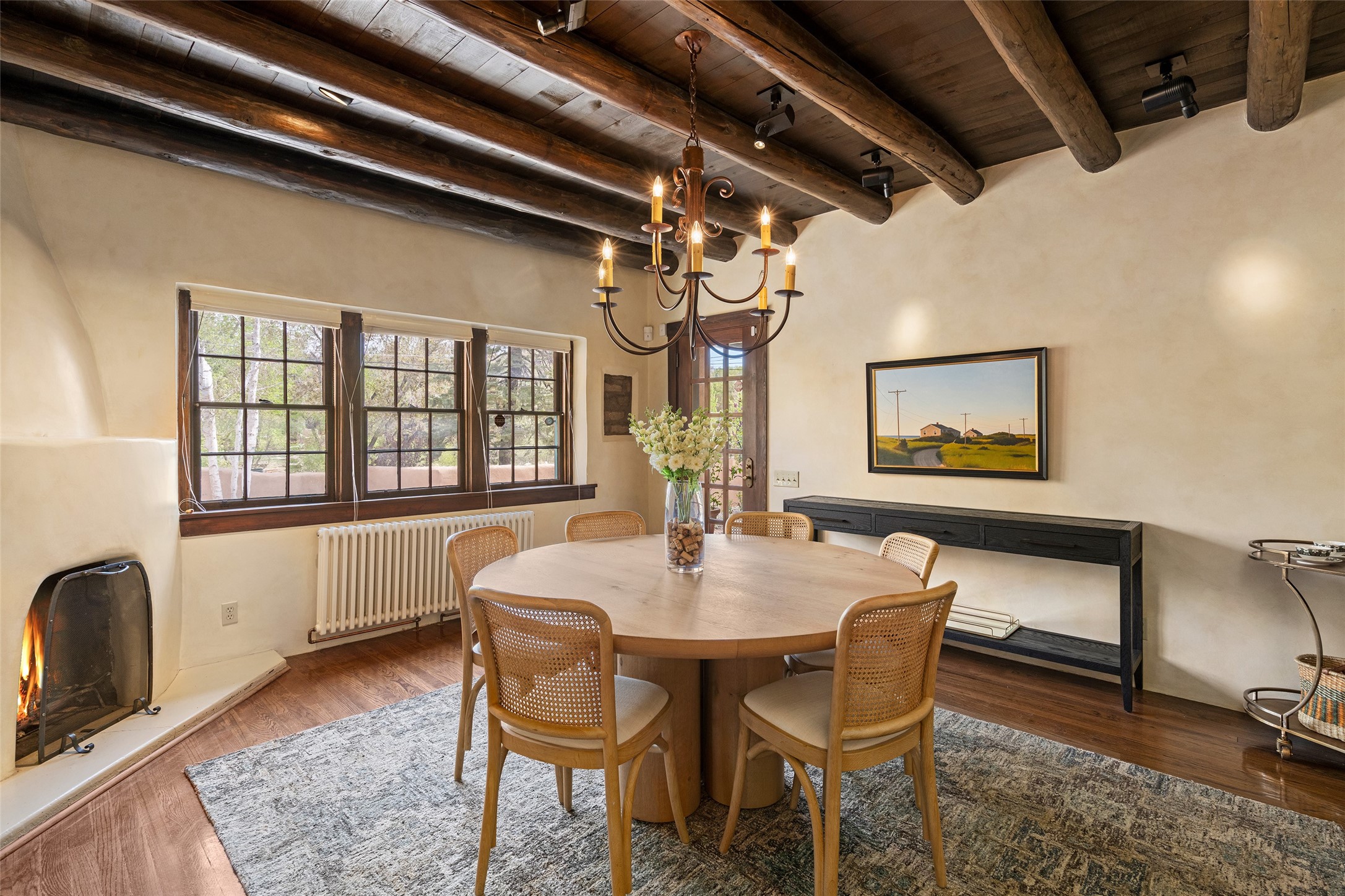 Tucked discreetly behind gates on the quiet, unpaved stretch of East Alameda, this exceptional property offers a rare chance to own one of Santa Fe's Historic Eastside compounds. Centered around a private, lushly landscaped courtyard, the residence includes a classic 3-bedroom main house and a charming casita. The main home is steeped in rich history--its 1929 addition is believe to be the first commission awarded to renowned architect John Gaw Meem. Authentic New Mexican details abound, from hand-hewn vigas to rich wood floors, adobe walls and hand-poured glass windows that speak to the home's timeless character. The chef's kitchen anchors the main house, featuring granite countertops, Wolf and Subzero appliances, and luxurious touches such as a pot filler, wine cooler, wet bar, and generous workspace. There's a small room off the front portal with its own kiva fireplace - an ideal office. The third bedroom has shelving, a sink and extra studio lighting. Added later the casita mirrors the charm of the main house with classic finishes blended seamlessly with modern comforts. Designed to function as a deluxe primary suite, it boasts two elegant bathrooms, a second bedroom that could be used as workout room. The primary bedroom has a kiva and doors opening to the courtyard. The central courtyard, ringed with mature aspens and vibrant flowering plants, offers an enchanting backdrop for al fresco dining or quiet moments of reflection. With a new roof in spring 2024 and mini splits this home is ready for its new owners to move in. It's rare to find these oversized lots in the Historic Eastside, a one-car garage with extra storage and ample parking--so close to the historic Plaza. Located just steps from the Santa Fe River Trail, Canyon Road galleries and restaurants; this walled compound offers an unparalleled blend of privacy and classic Santa Fe charm in one of the city's most beloved neighborhoods.