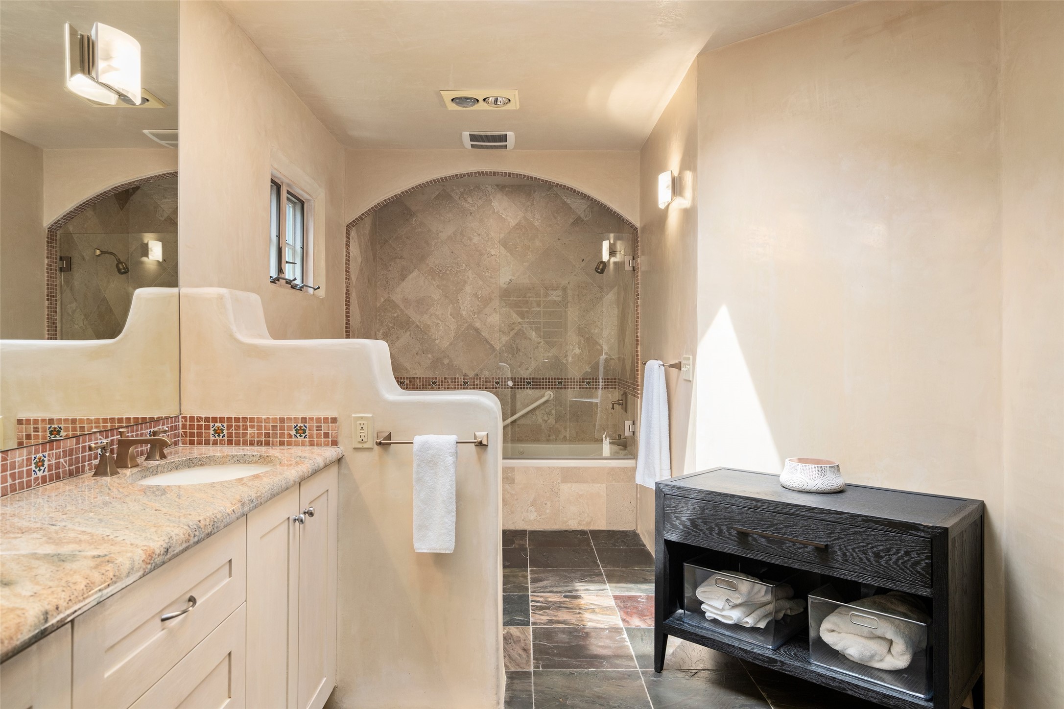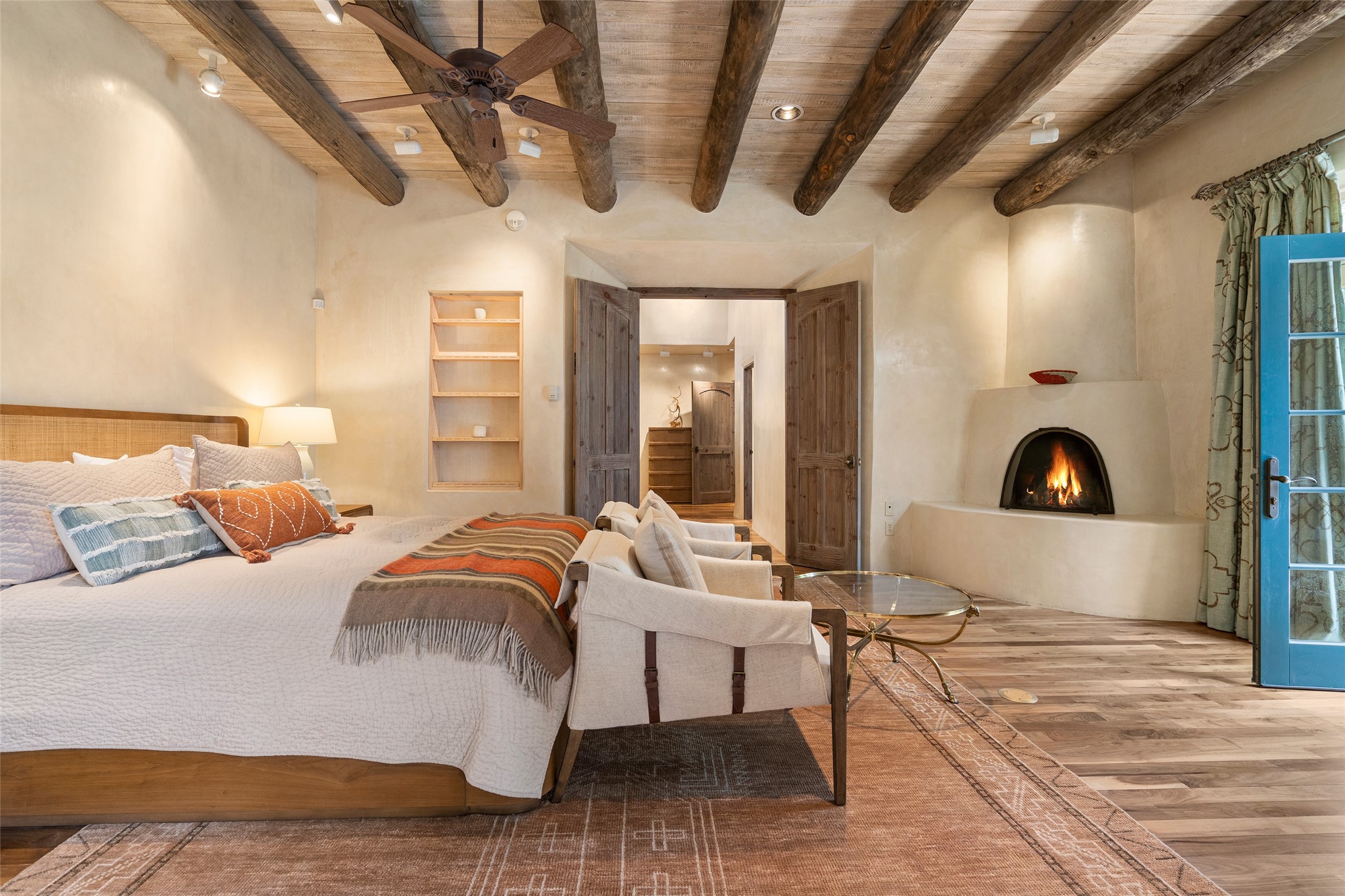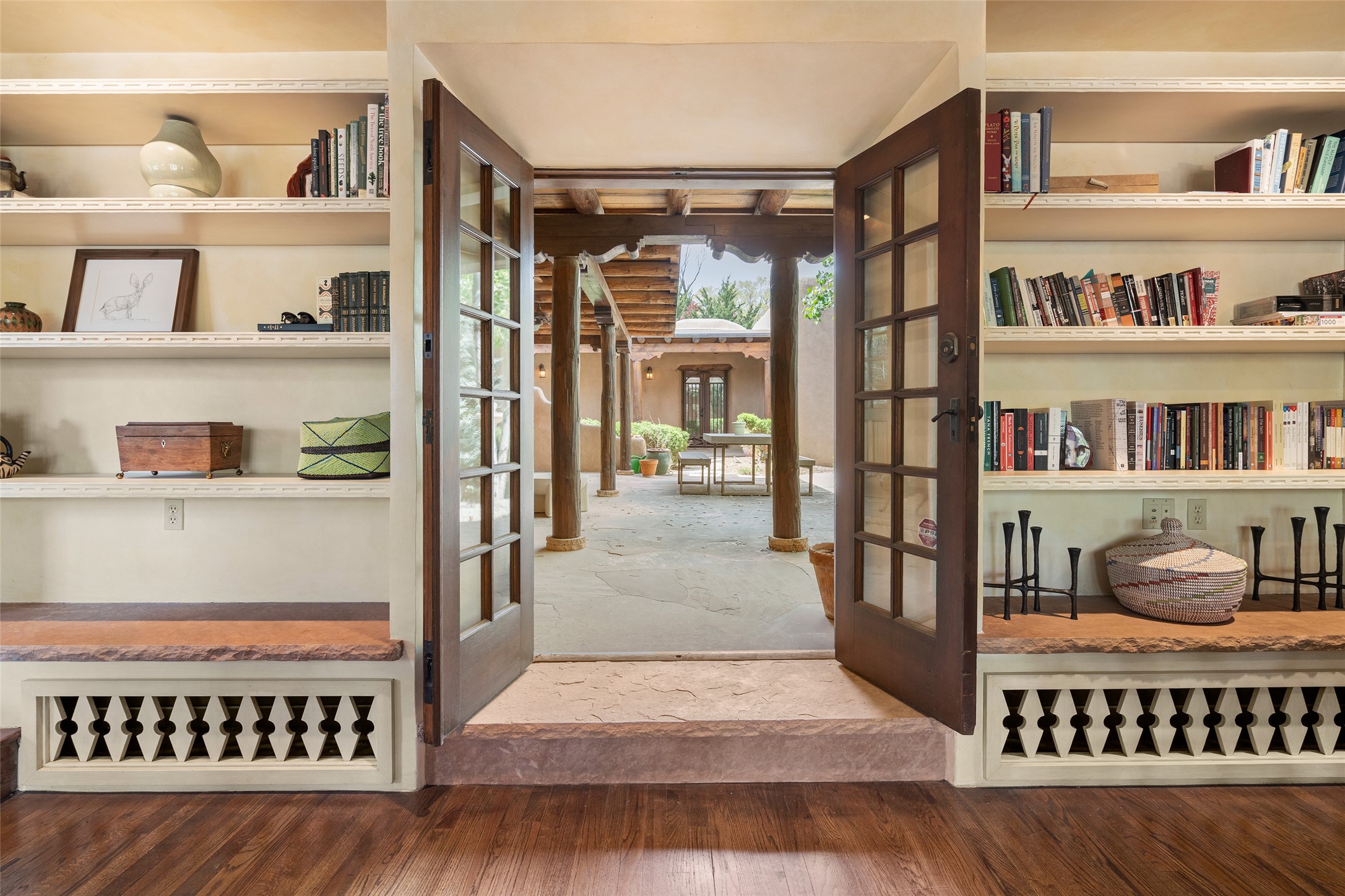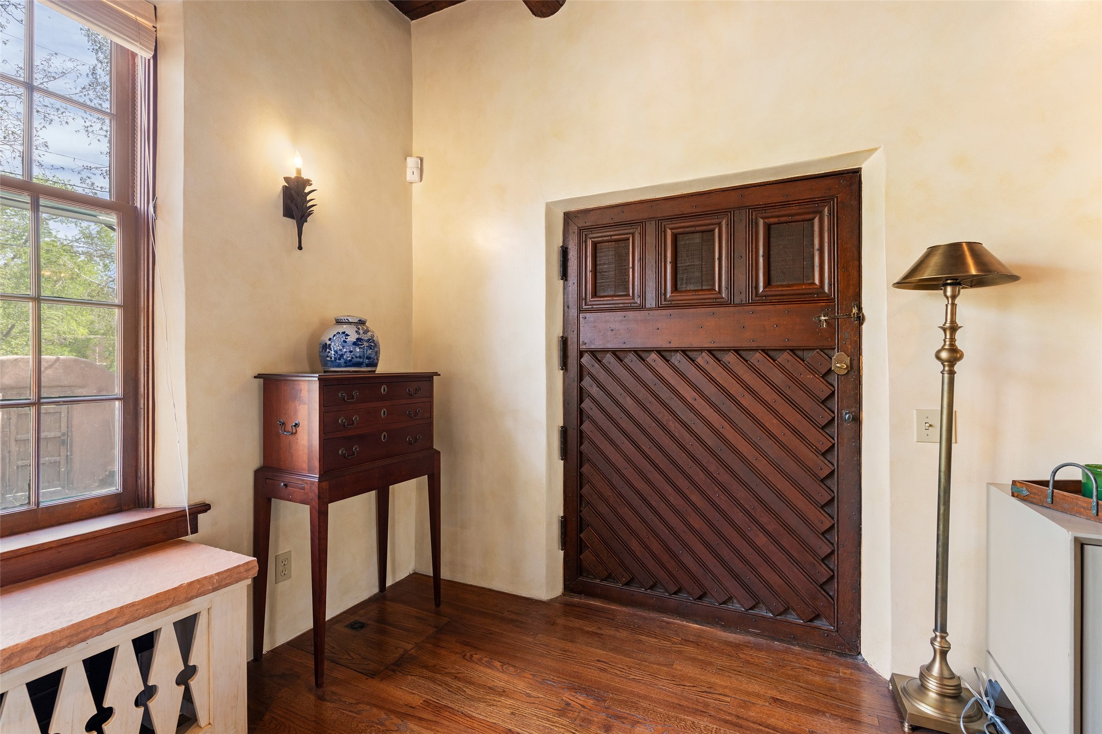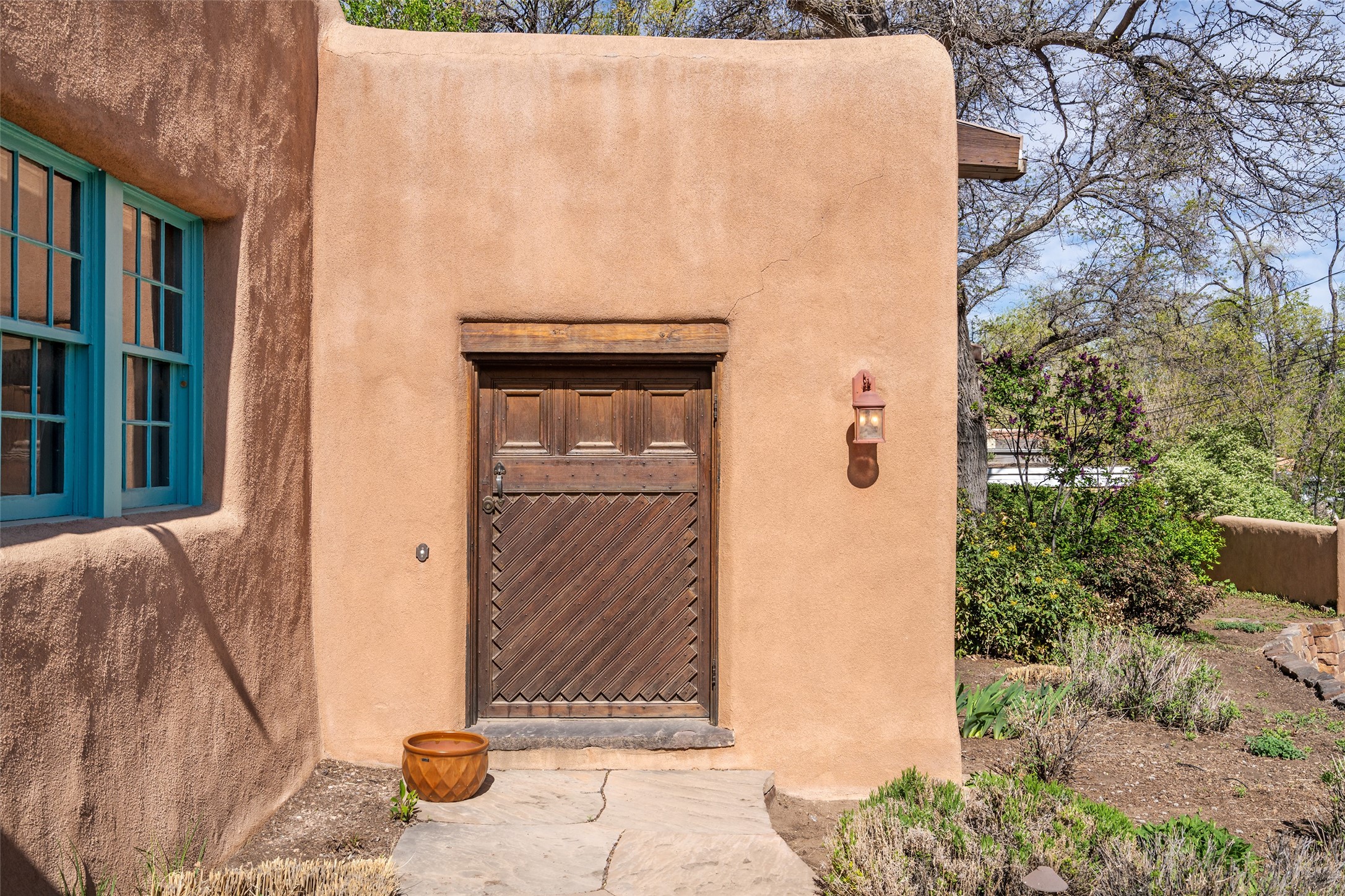 Tucked discreetly behind gates on the quiet, unpaved stretch of East Alameda, this exceptional property offers a rare chance to own one of Santa Fe's Historic Eastside compounds. Centered around a private, lushly landscaped courtyard, the residence includes a classic 3-bedroom main house and a charming casita. The main home is steeped in rich history--its 1929 addition is believe to be the first commission awarded to renowned architect John Gaw Meem. Authentic New Mexican details abound, from hand-hewn vigas to rich wood floors, adobe walls and hand-poured glass windows that speak to the home's timeless character. The chef's kitchen anchors the main house, featuring granite countertops, Wolf and Subzero appliances, and luxurious touches such as a pot filler, wine cooler, wet bar, and generous workspace. There's a small room off the front portal with its own kiva fireplace - an ideal office. The third bedroom has shelving, a sink and extra studio lighting. Added later the casita mirrors the charm of the main house with classic finishes blended seamlessly with modern comforts. Designed to function as a deluxe primary suite, it boasts two elegant bathrooms, a second bedroom that could be used as workout room. The primary bedroom has a kiva and doors opening to the courtyard. The central courtyard, ringed with mature aspens and vibrant flowering plants, offers an enchanting backdrop for al fresco dining or quiet moments of reflection. With a new roof in spring 2024 and mini splits this home is ready for its new owners to move in. It's rare to find these oversized lots in the Historic Eastside, a one-car garage with extra storage and ample parking--so close to the historic Plaza. Located just steps from the Santa Fe River Trail, Canyon Road galleries and restaurants; this walled compound offers an unparalleled blend of privacy and classic Santa Fe charm in one of the city's most beloved neighborhoods.