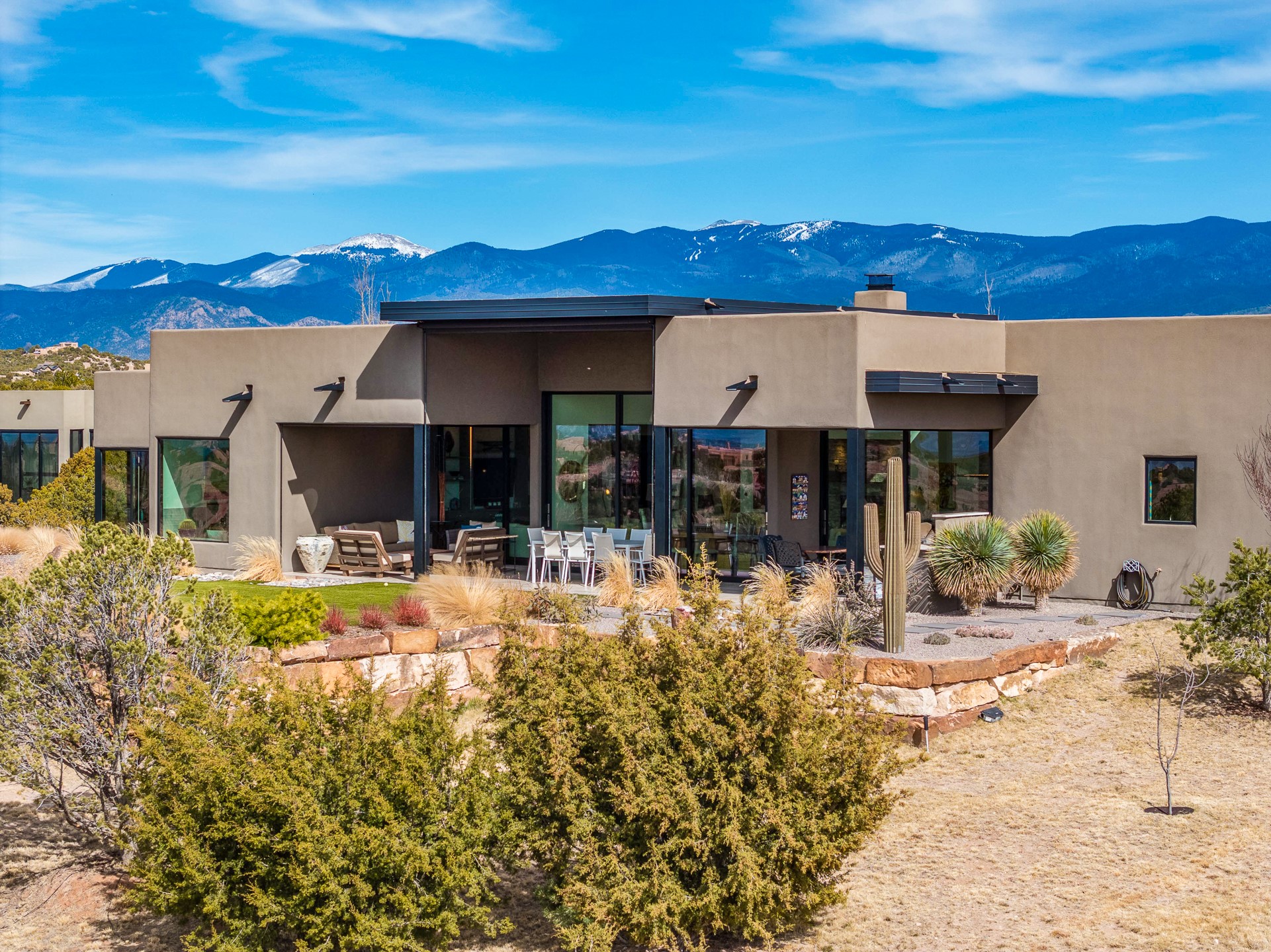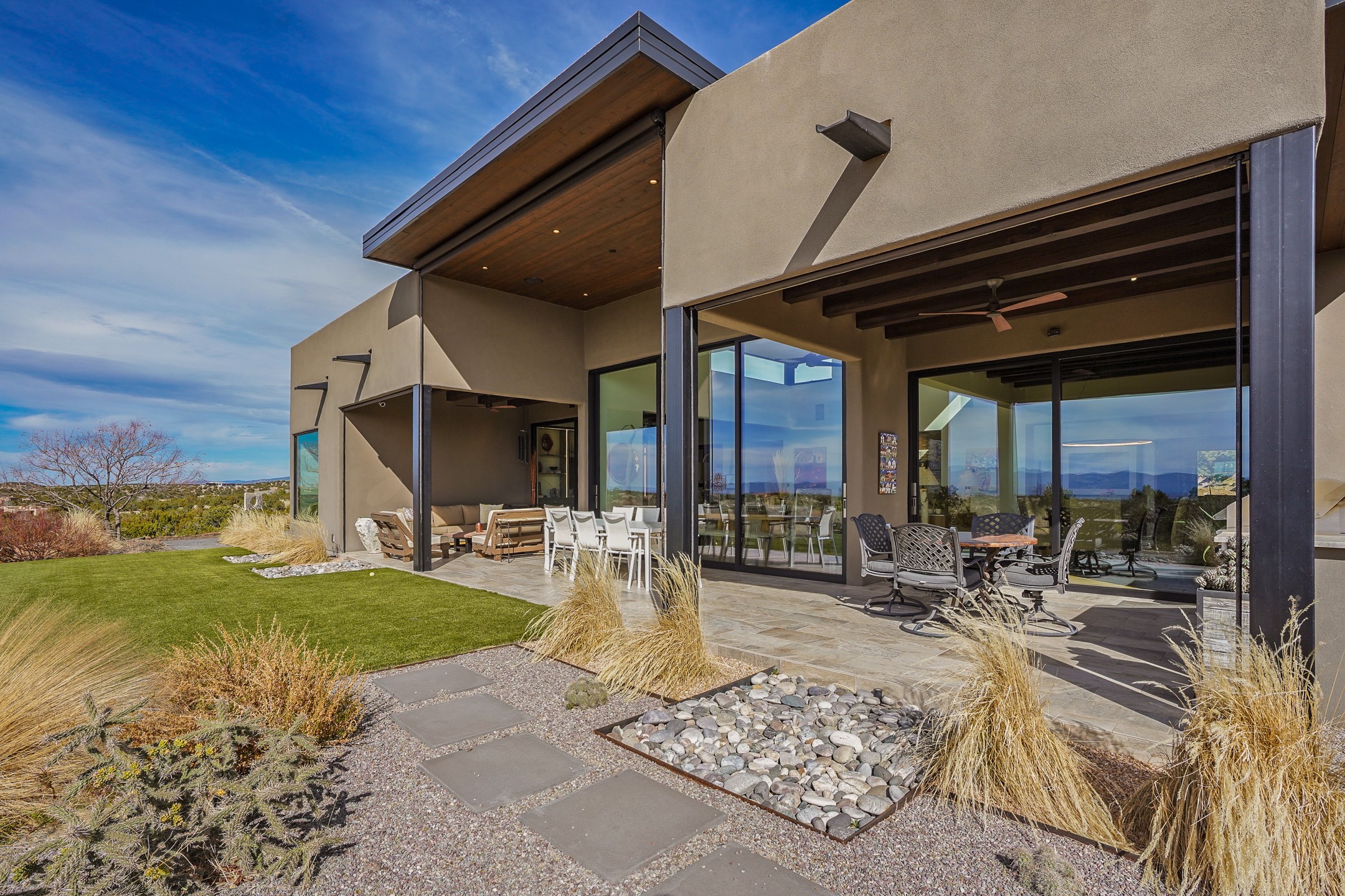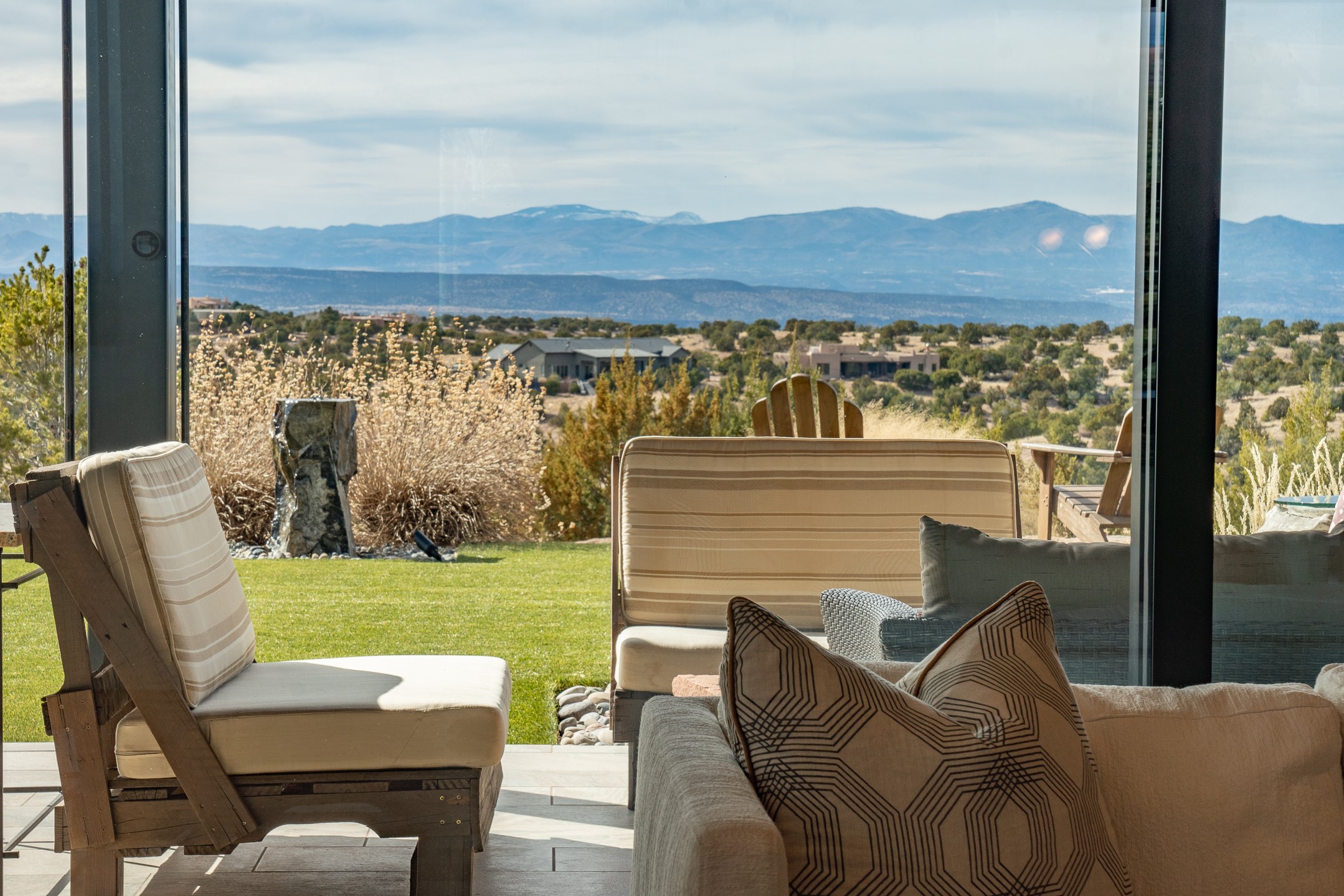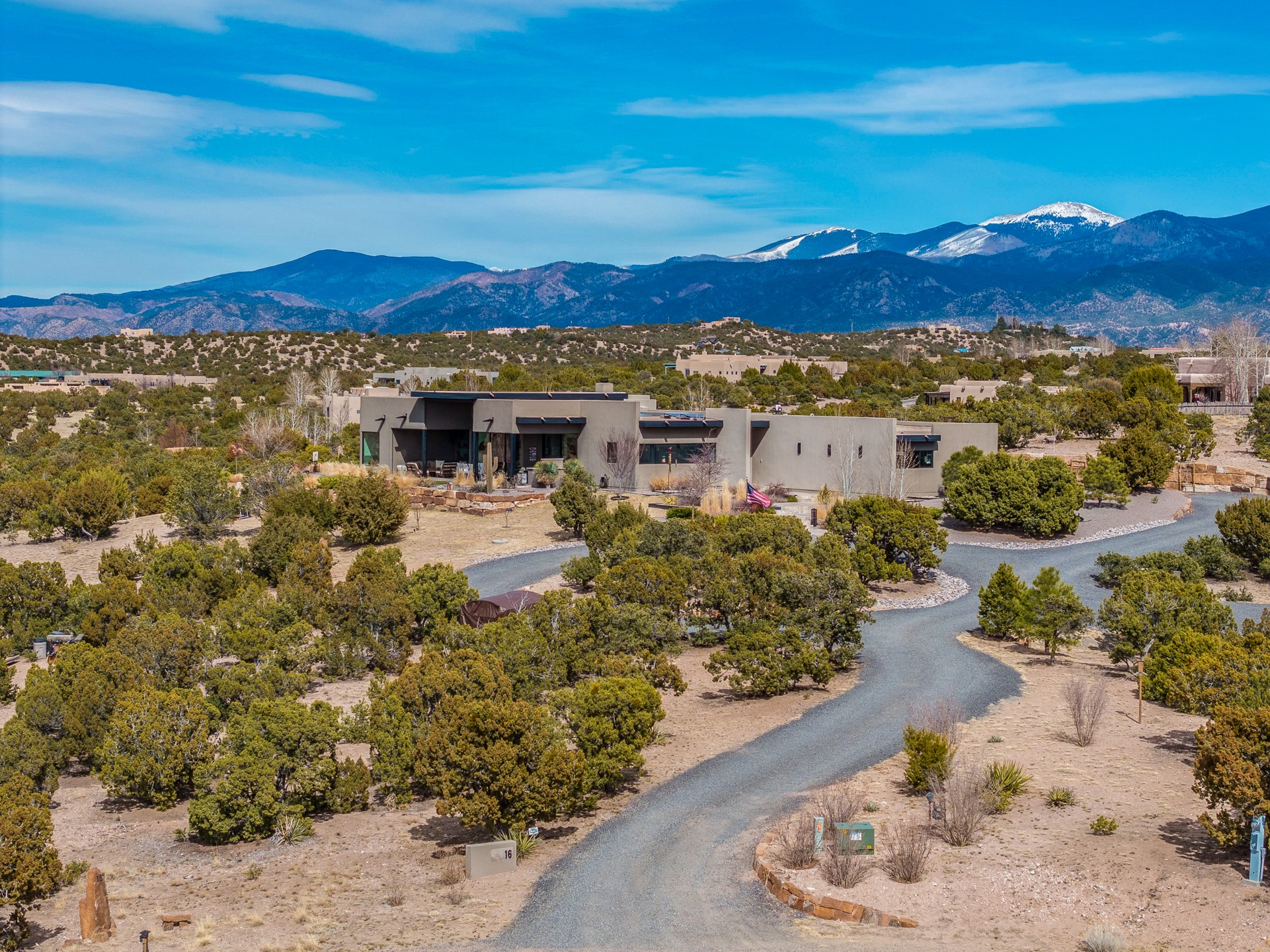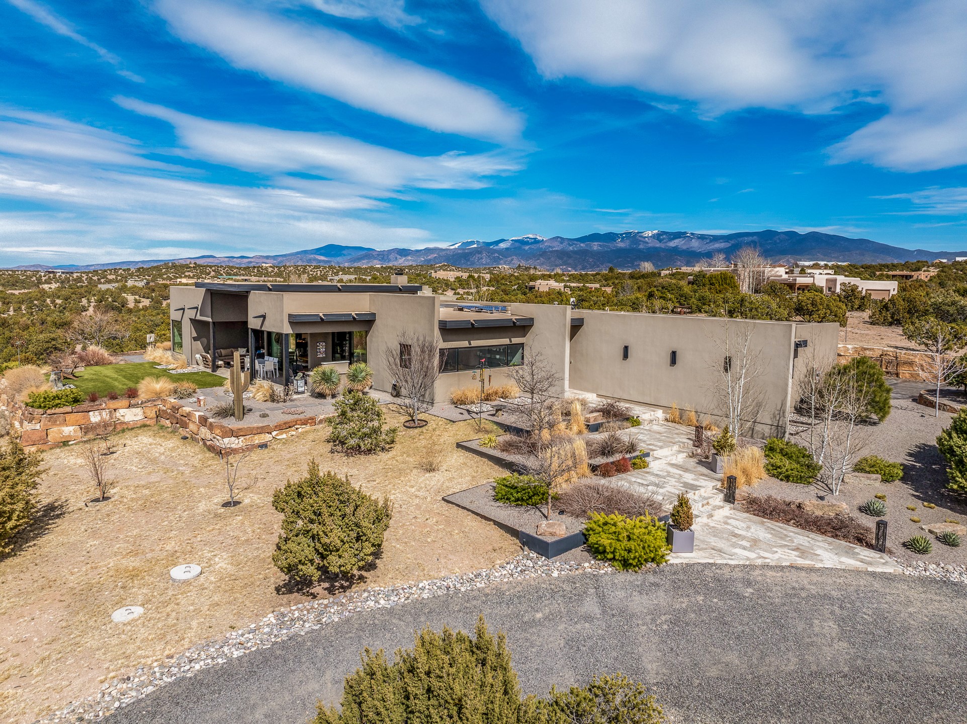 Step into this supremely livable and private, award-winning masterpiece filled with extraordinary features and amazing views just minutes from Las Campanas and town. Modern elegance & comfort await you as you enter this single-level home. Wood, glass & steel blend flawlessly to create an interior space with clean lines & abundant natural light. Amenities of the generous gourmet kitchen include an induction cooktop, dual Fisher & Paykel ovens & refrigerators, 2 dishwashers & 2 sinks, as well as a wine fridge & Scotsman Brilliance nugget ice machine. Remote controlled blinds, Lutron Caseta light switches, a Sonos wired sound system throughout, a Nest temperature system & cameras operated by smartphone or computer enhance further the comfort & livability of this age-in-place home. At the end of the day, enjoy the view as you linger in the luxurious BainUltra soaking tub with air-jet technology. An easily accessible three-car garage with geothermal heating & epoxy floor also houses a woodworking/craft area. Perfectly situated on 2.5 elevated acres with sweeping views of four mountain ranges, the home boasts a gorgeous portal designed for gracious outdoor living & entertaining. Additional charming outdoor areas allow you to relax as you take in the breathtaking vistas & savor the award-winning landscaping that includes two fountains. Winner of the 2021 Parade of Homes Ted Swisher Green Building Award, this stunning home also swept the awards for Best Overall Design, Best Craftsmanship & Best Kitchen. That says it all. Arriving at the magnificent entryway atop the circular drive confirms that this is a smartly designed, luxurious, sophisticated home not to be missed.