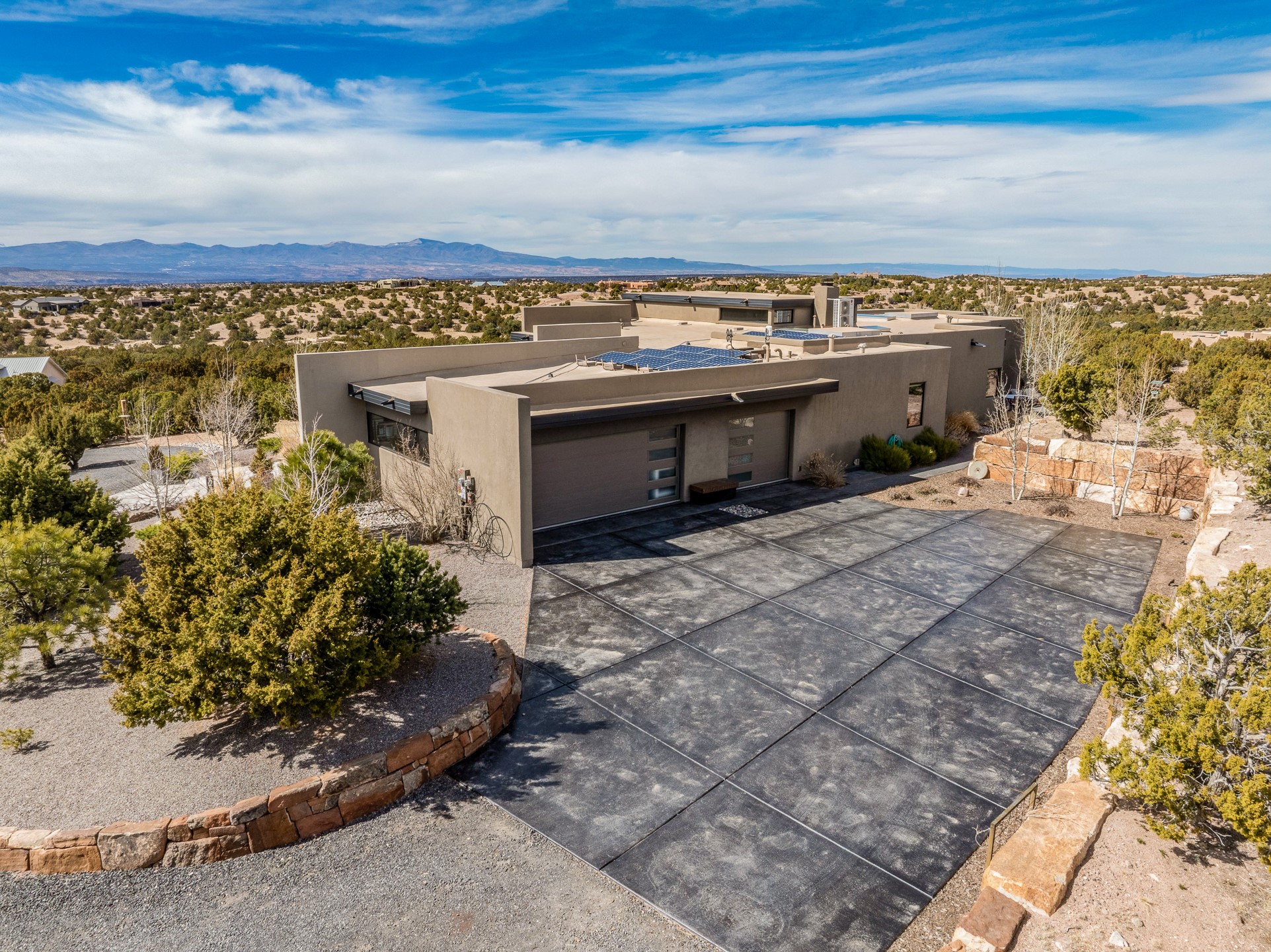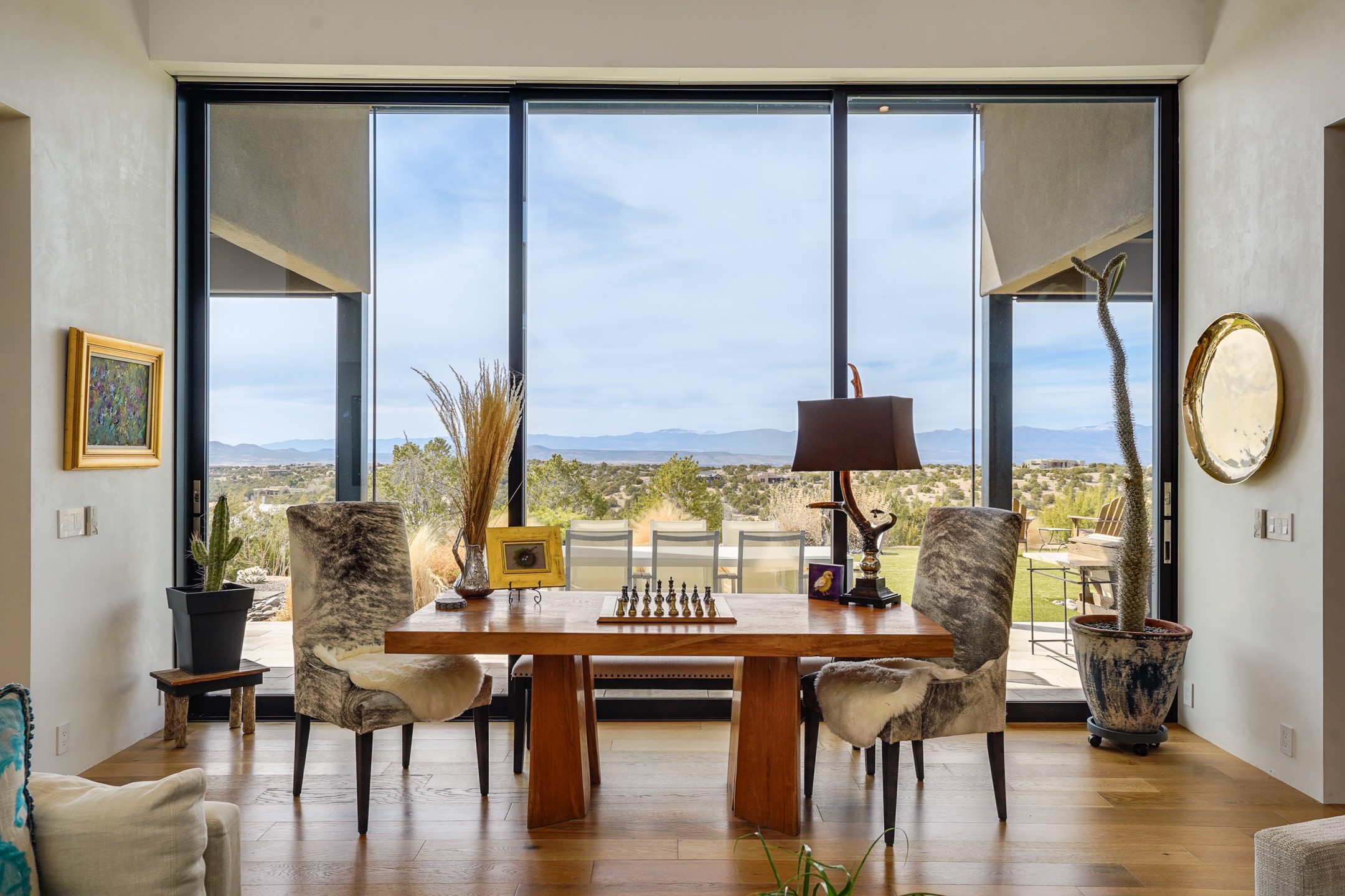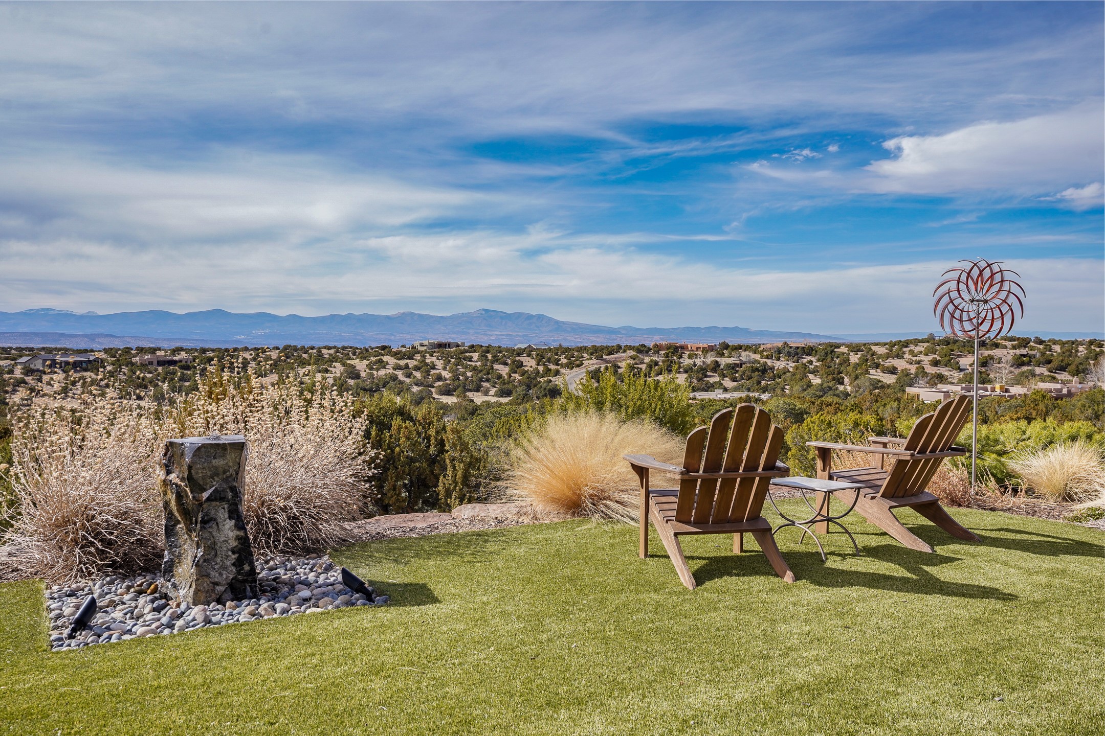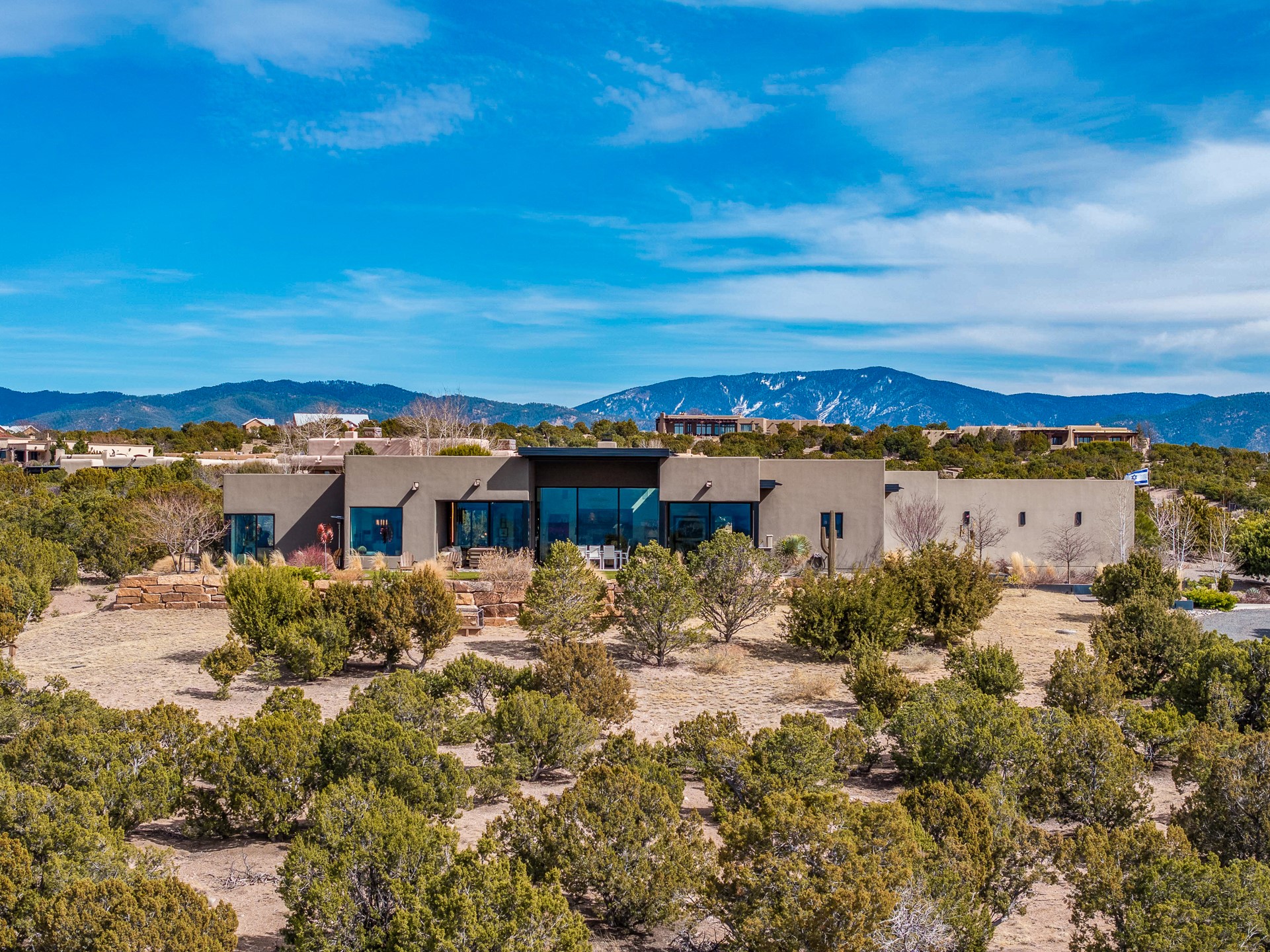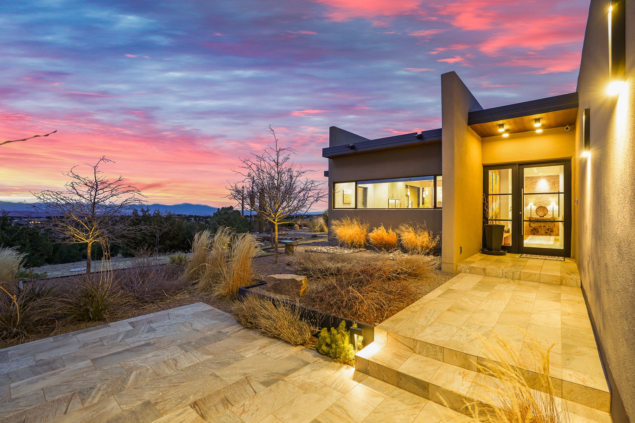 Step into this supremely livable and private, award-winning masterpiece filled with extraordinary features and amazing views just minutes from Las Campanas and town. Modern elegance & comfort await you as you enter this single-level home. Wood, glass & steel blend flawlessly to create an interior space with clean lines & abundant natural light. Amenities of the generous gourmet kitchen include an induction cooktop, dual Fisher & Paykel ovens & refrigerators, 2 dishwashers & 2 sinks, as well as a wine fridge & Scotsman Brilliance nugget ice machine. Remote controlled blinds, Lutron Caseta light switches, a Sonos wired sound system throughout, a Nest temperature system & cameras operated by smartphone or computer enhance further the comfort & livability of this age-in-place home. At the end of the day, enjoy the view as you linger in the luxurious BainUltra soaking tub with air-jet technology. An easily accessible three-car garage with geothermal heating & epoxy floor also houses a woodworking/craft area. Perfectly situated on 2.5 elevated acres with sweeping views of four mountain ranges, the home boasts a gorgeous portal designed for gracious outdoor living & entertaining. Additional charming outdoor areas allow you to relax as you take in the breathtaking vistas & savor the award-winning landscaping that includes two fountains. Winner of the 2021 Parade of Homes Ted Swisher Green Building Award, this stunning home also swept the awards for Best Overall Design, Best Craftsmanship & Best Kitchen. That says it all. Arriving at the magnificent entryway atop the circular drive confirms that this is a smartly designed, luxurious, sophisticated home not to be missed.