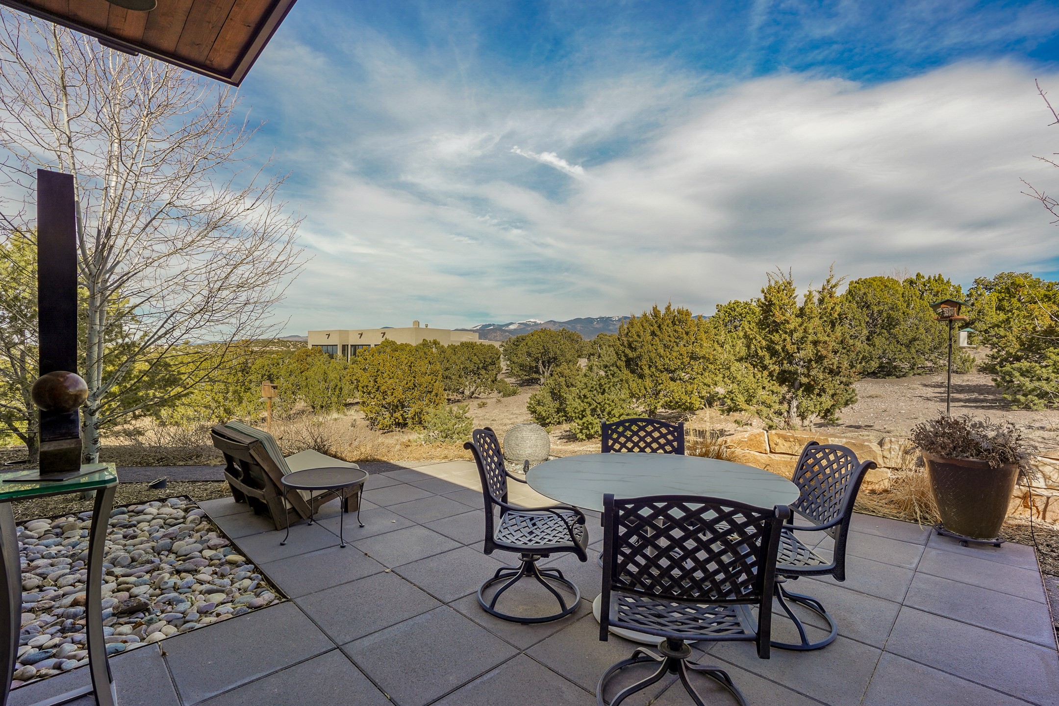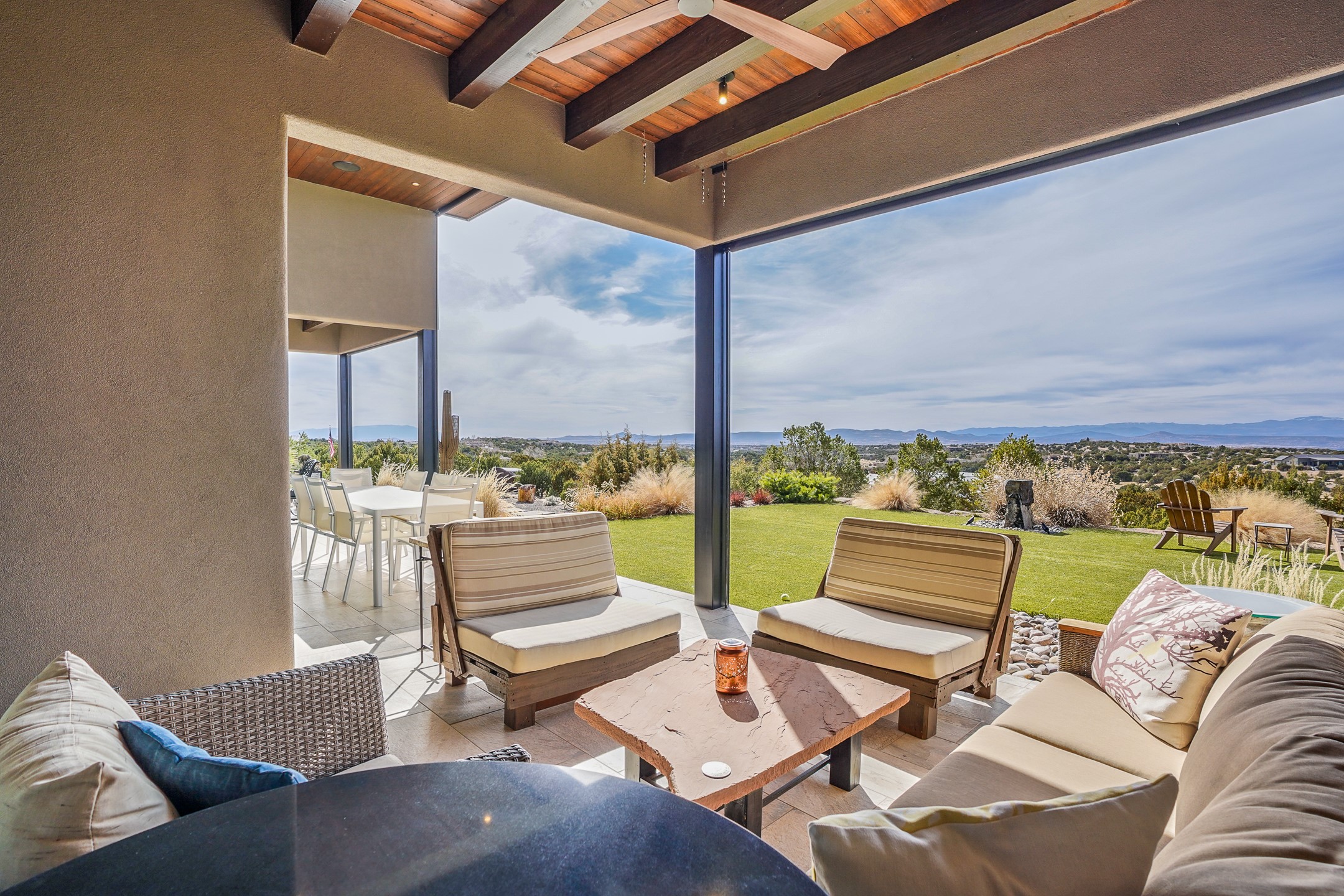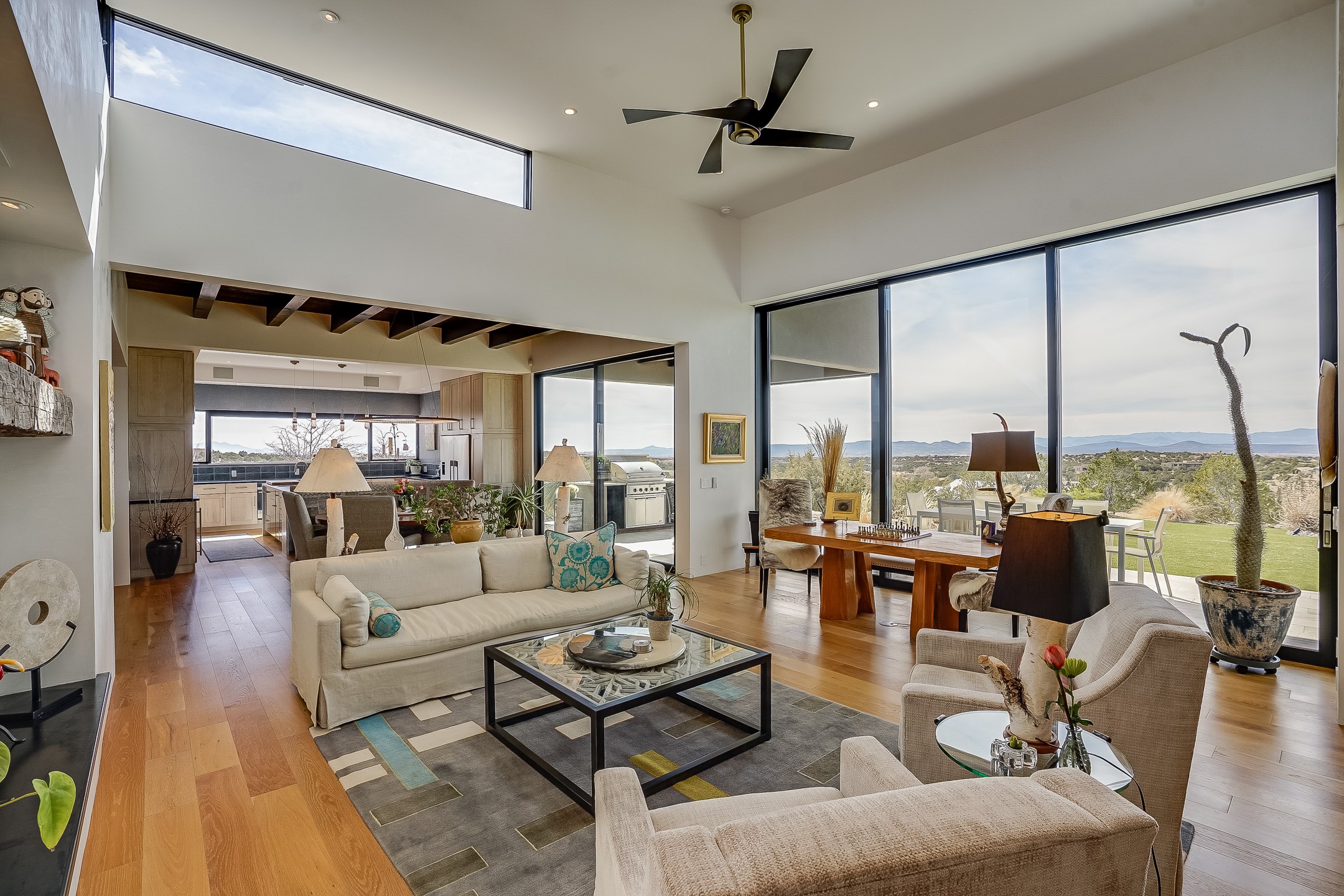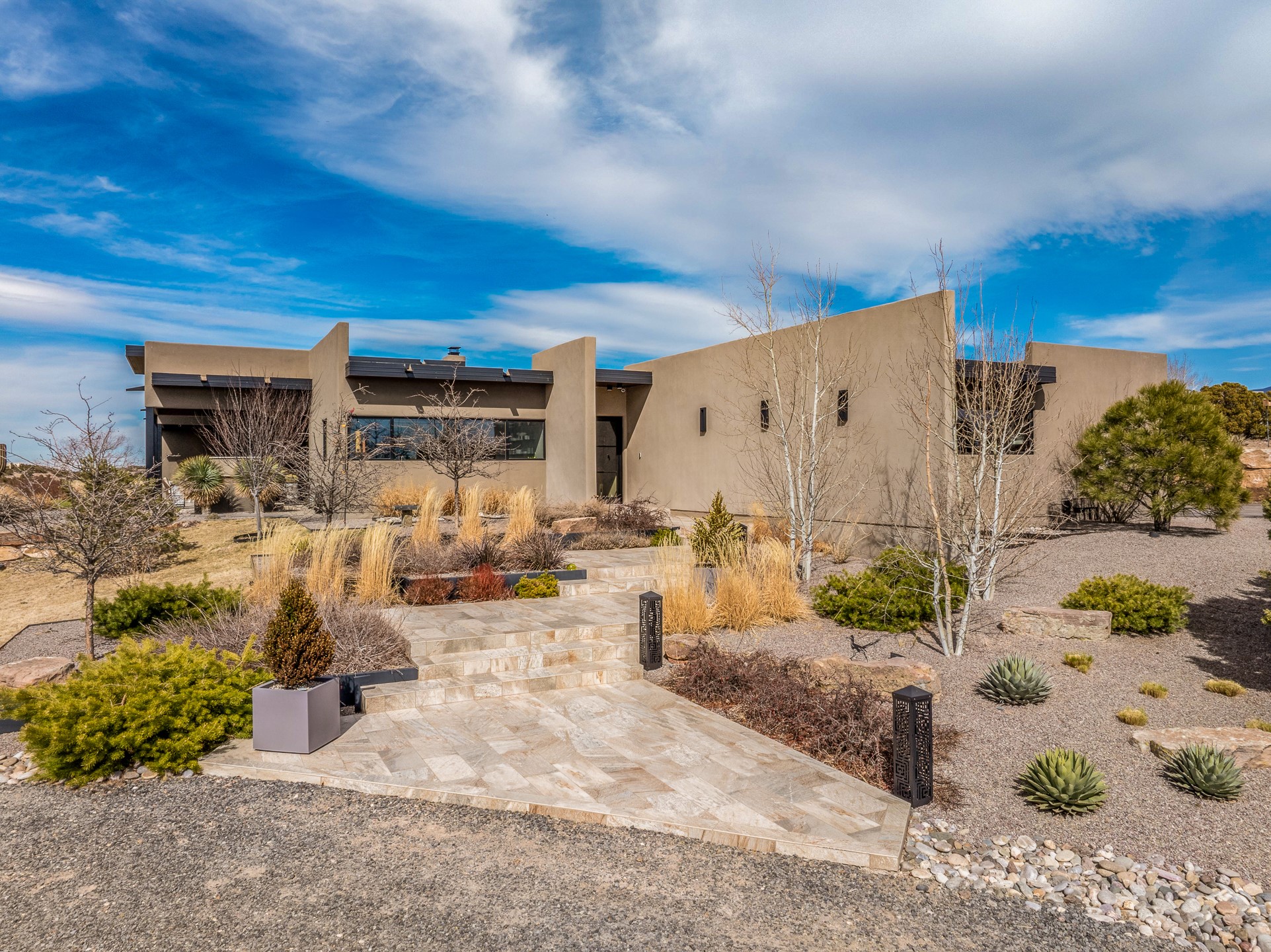 Step into this supremely livable and private, award-winning masterpiece filled with extraordinary features and amazing views just minutes from Las Campanas and town. Modern elegance & comfort await you as you enter this single-level home. Wood, glass & steel blend flawlessly to create an interior space with clean lines & abundant natural light. Amenities of the generous gourmet kitchen include an induction cooktop, dual Fisher & Paykel ovens & refrigerators, 2 dishwashers & 2 sinks, as well as a wine fridge & Scotsman Brilliance nugget ice machine. Remote controlled blinds, Lutron Caseta light switches, a Sonos wired sound system throughout, a Nest temperature system & cameras operated by smartphone or computer enhance further the comfort & livability of this age-in-place home. At the end of the day, enjoy the view as you linger in the luxurious BainUltra soaking tub with air-jet technology. An easily accessible three-car garage with geothermal heating & epoxy floor also houses a woodworking/craft area. Perfectly situated on 2.5 elevated acres with sweeping views of four mountain ranges, the home boasts a gorgeous portal designed for gracious outdoor living & entertaining. Additional charming outdoor areas allow you to relax as you take in the breathtaking vistas & savor the award-winning landscaping that includes two fountains. Winner of the 2021 Parade of Homes Ted Swisher Green Building Award, this stunning home also swept the awards for Best Overall Design, Best Craftsmanship & Best Kitchen. That says it all. Arriving at the magnificent entryway atop the circular drive confirms that this is a smartly designed, luxurious, sophisticated home not to be missed.
