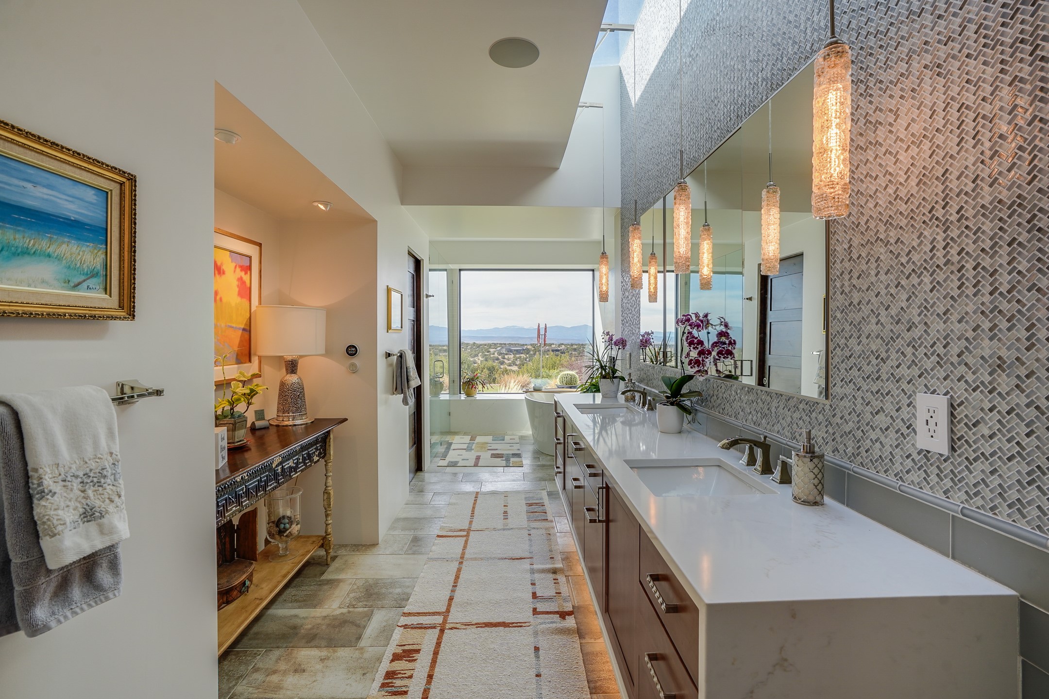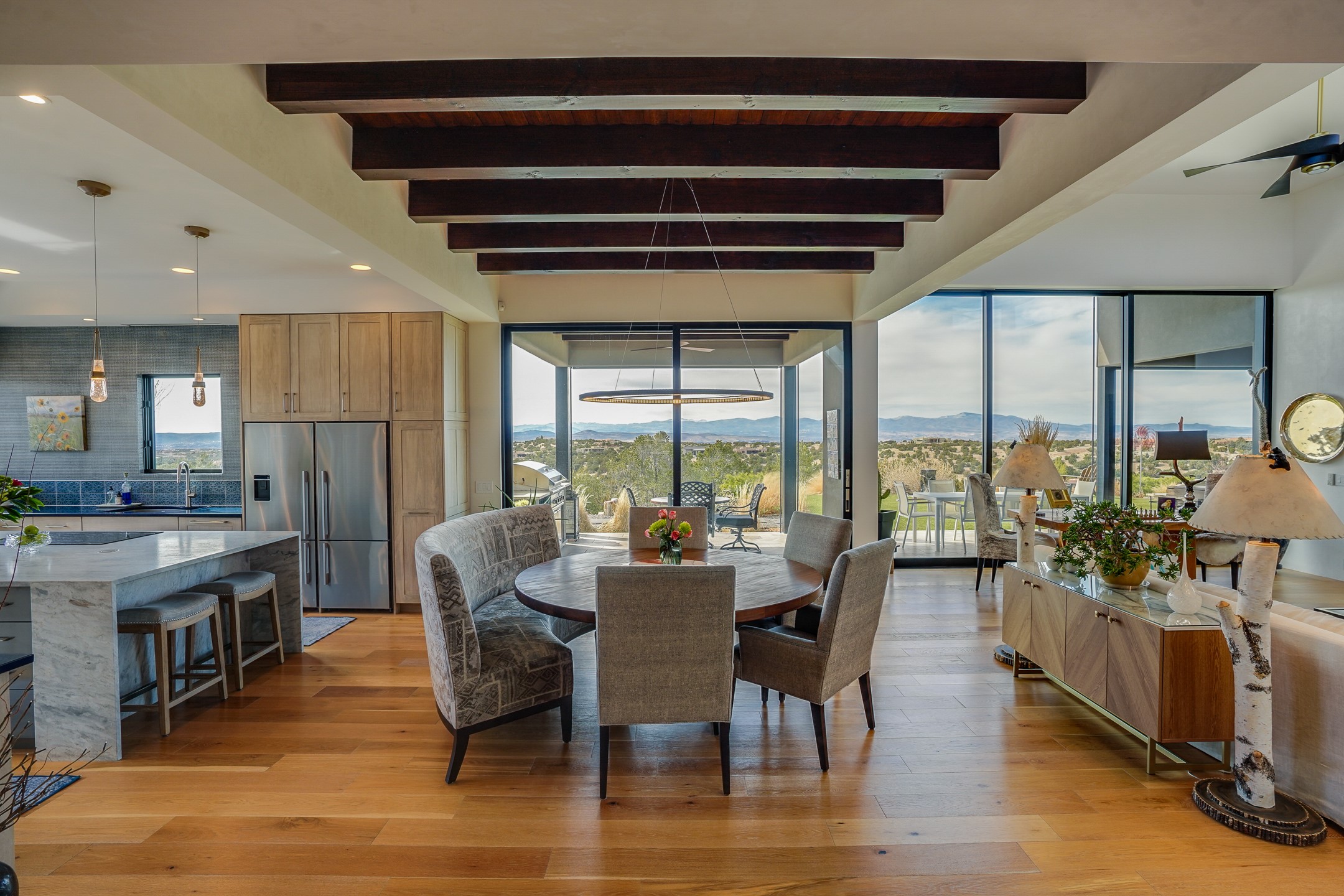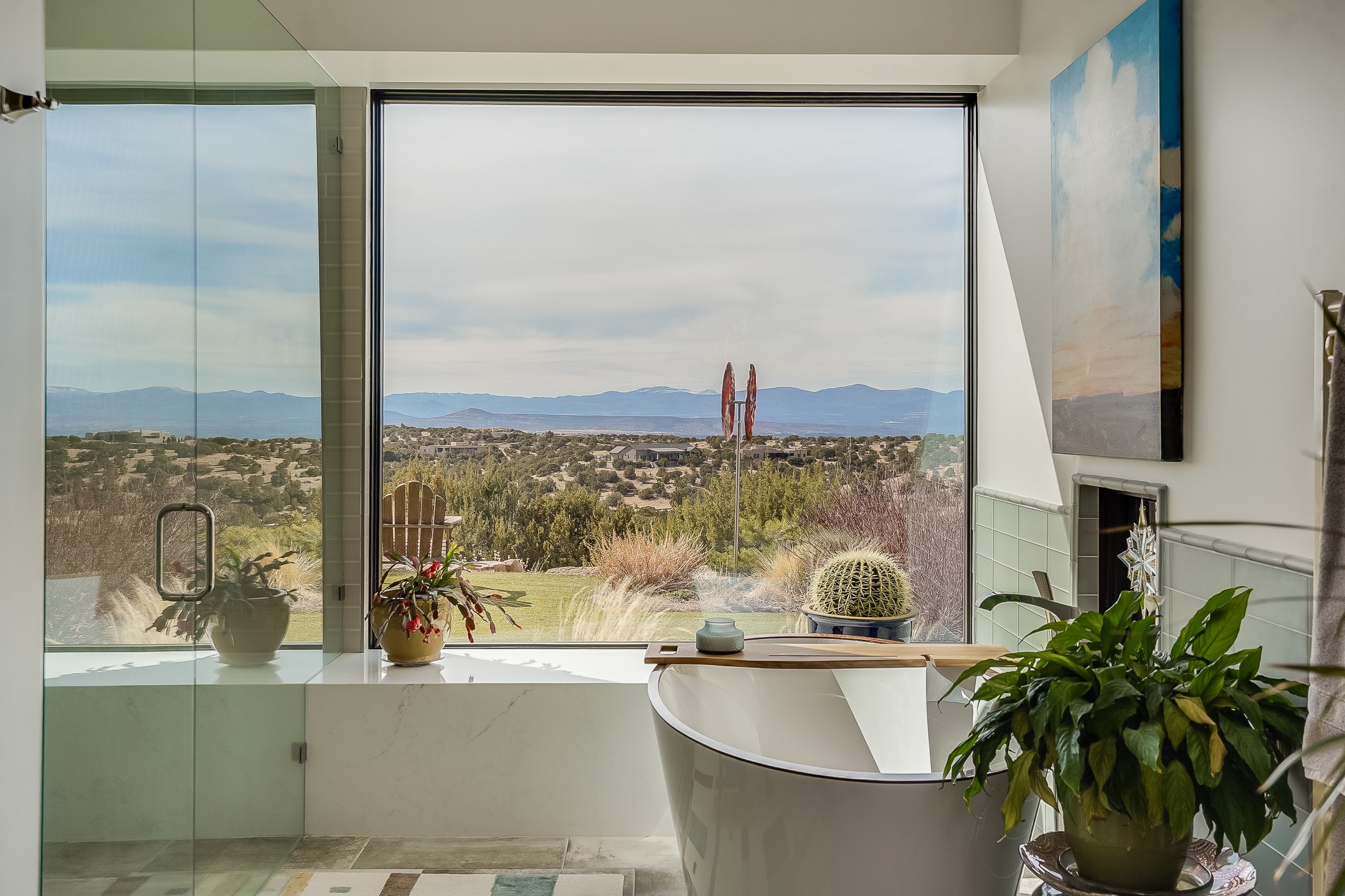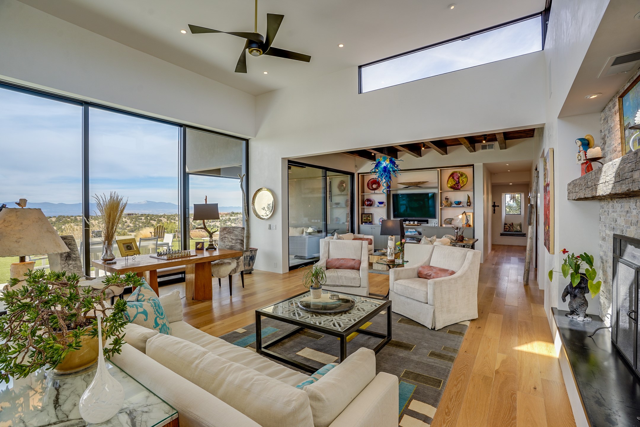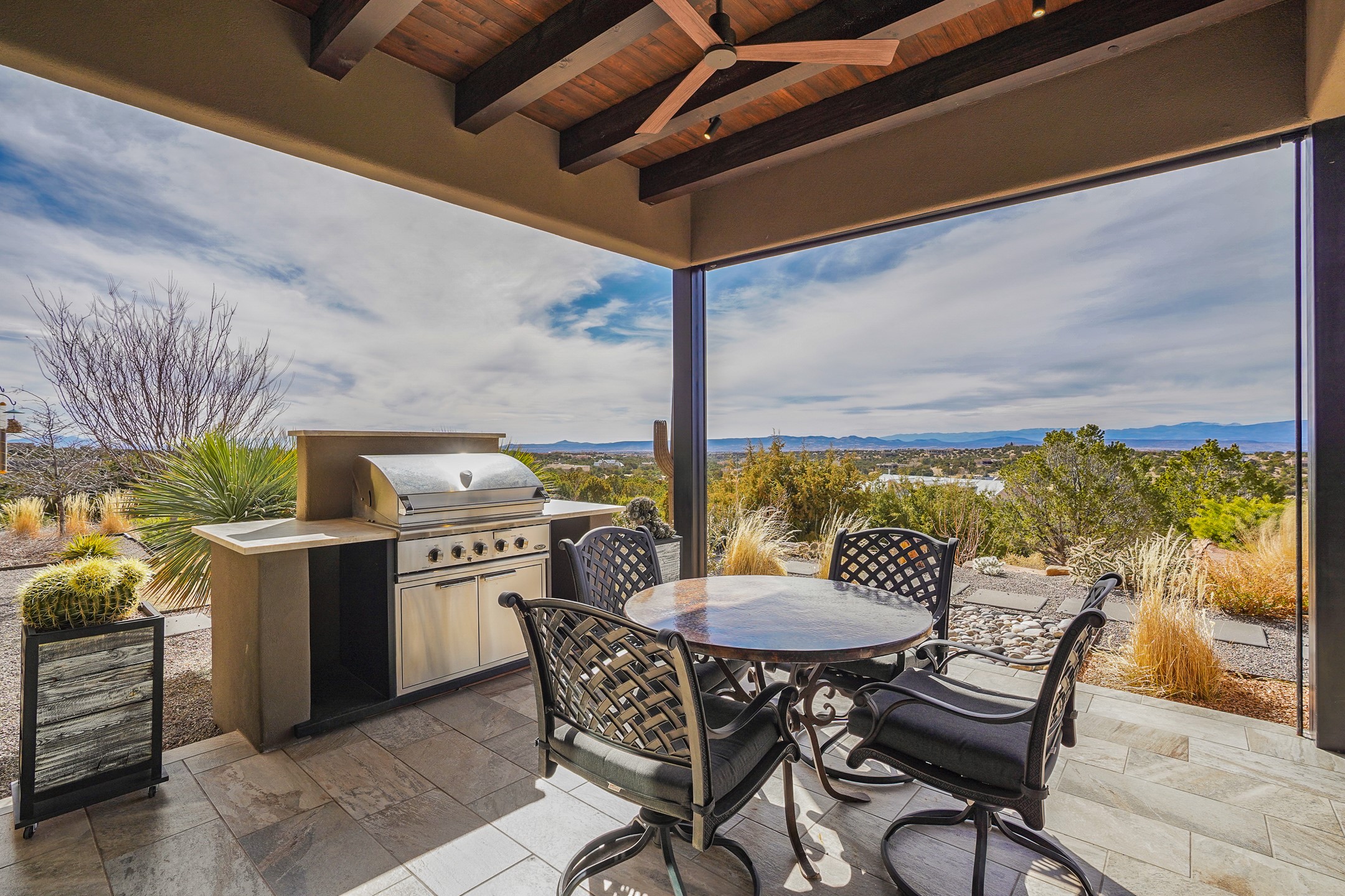 Step into this supremely livable and private, award-winning masterpiece filled with extraordinary features and amazing views just minutes from Las Campanas and town. Modern elegance & comfort await you as you enter this single-level home. Wood, glass & steel blend flawlessly to create an interior space with clean lines & abundant natural light. Amenities of the generous gourmet kitchen include an induction cooktop, dual Fisher & Paykel ovens & refrigerators, 2 dishwashers & 2 sinks, as well as a wine fridge & Scotsman Brilliance nugget ice machine. Remote controlled blinds, Lutron Caseta light switches, a Sonos wired sound system throughout, a Nest temperature system & cameras operated by smartphone or computer enhance further the comfort & livability of this age-in-place home. At the end of the day, enjoy the view as you linger in the luxurious BainUltra soaking tub with air-jet technology. An easily accessible three-car garage with geothermal heating & epoxy floor also houses a woodworking/craft area. Perfectly situated on 2.5 elevated acres with sweeping views of four mountain ranges, the home boasts a gorgeous portal designed for gracious outdoor living & entertaining. Additional charming outdoor areas allow you to relax as you take in the breathtaking vistas & savor the award-winning landscaping that includes two fountains. Winner of the 2021 Parade of Homes Ted Swisher Green Building Award, this stunning home also swept the awards for Best Overall Design, Best Craftsmanship & Best Kitchen. That says it all. Arriving at the magnificent entryway atop the circular drive confirms that this is a smartly designed, luxurious, sophisticated home not to be missed.