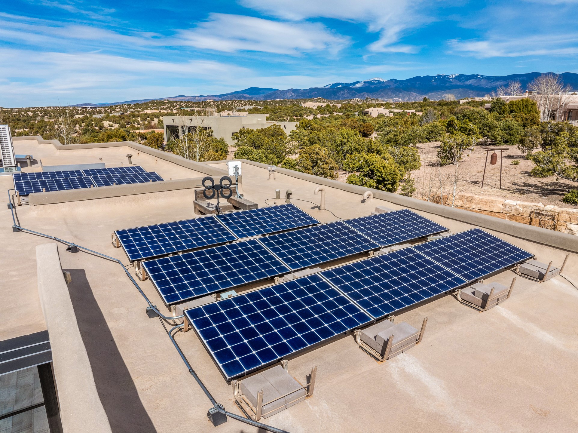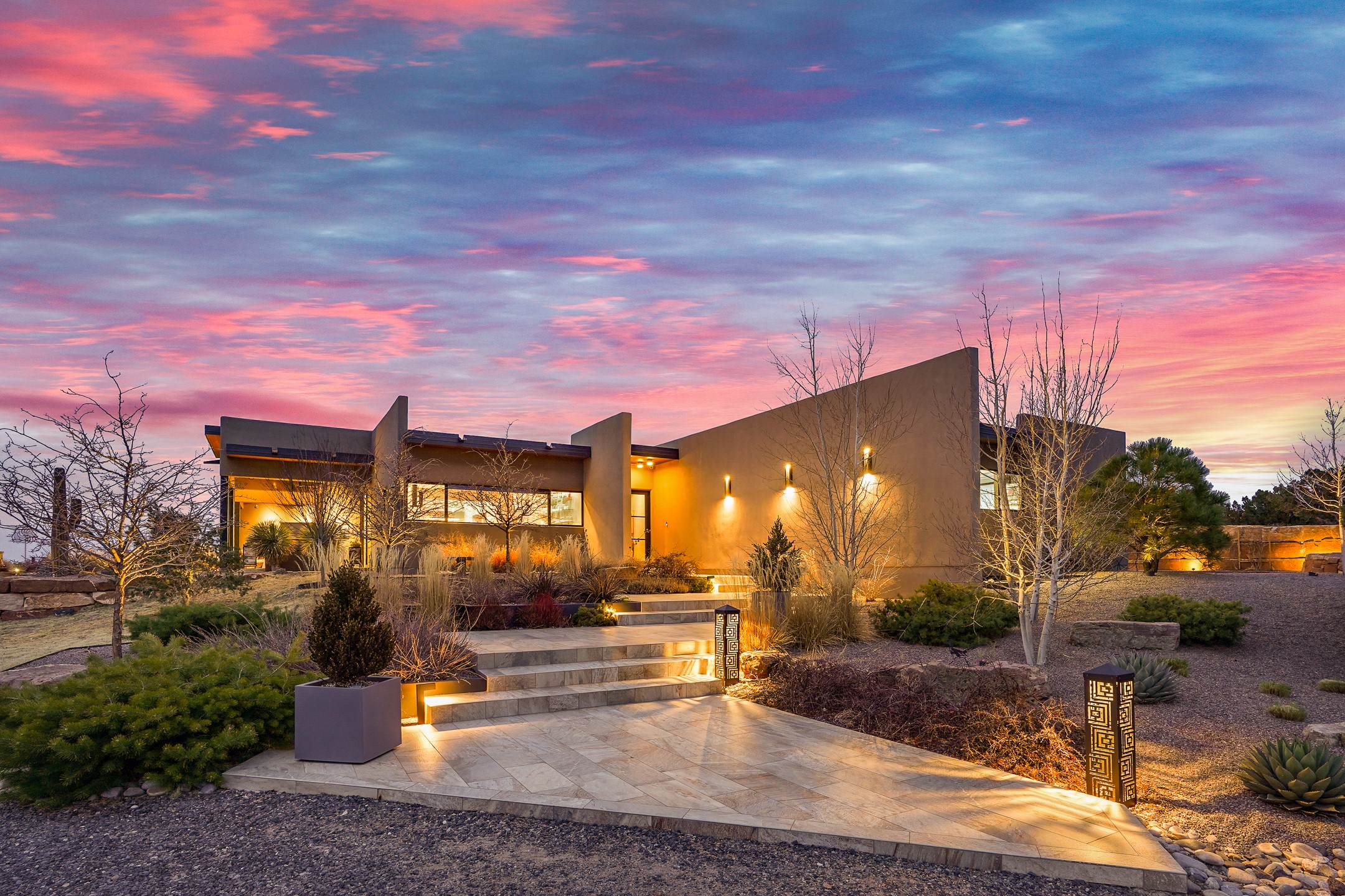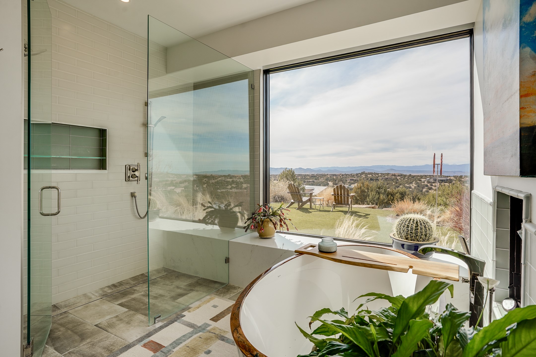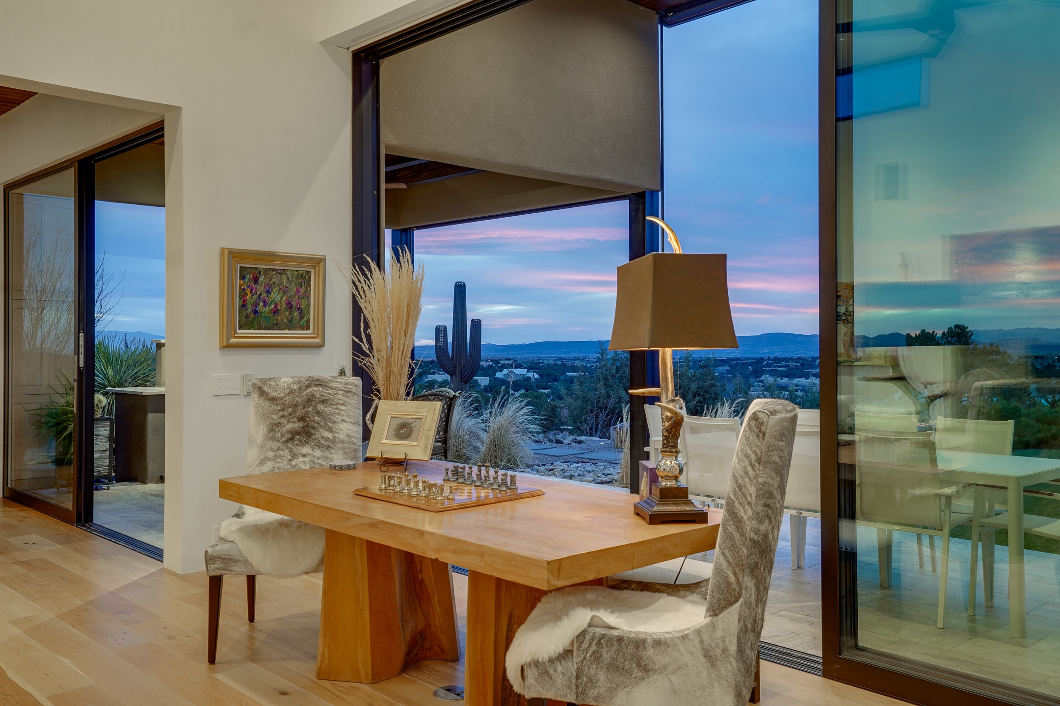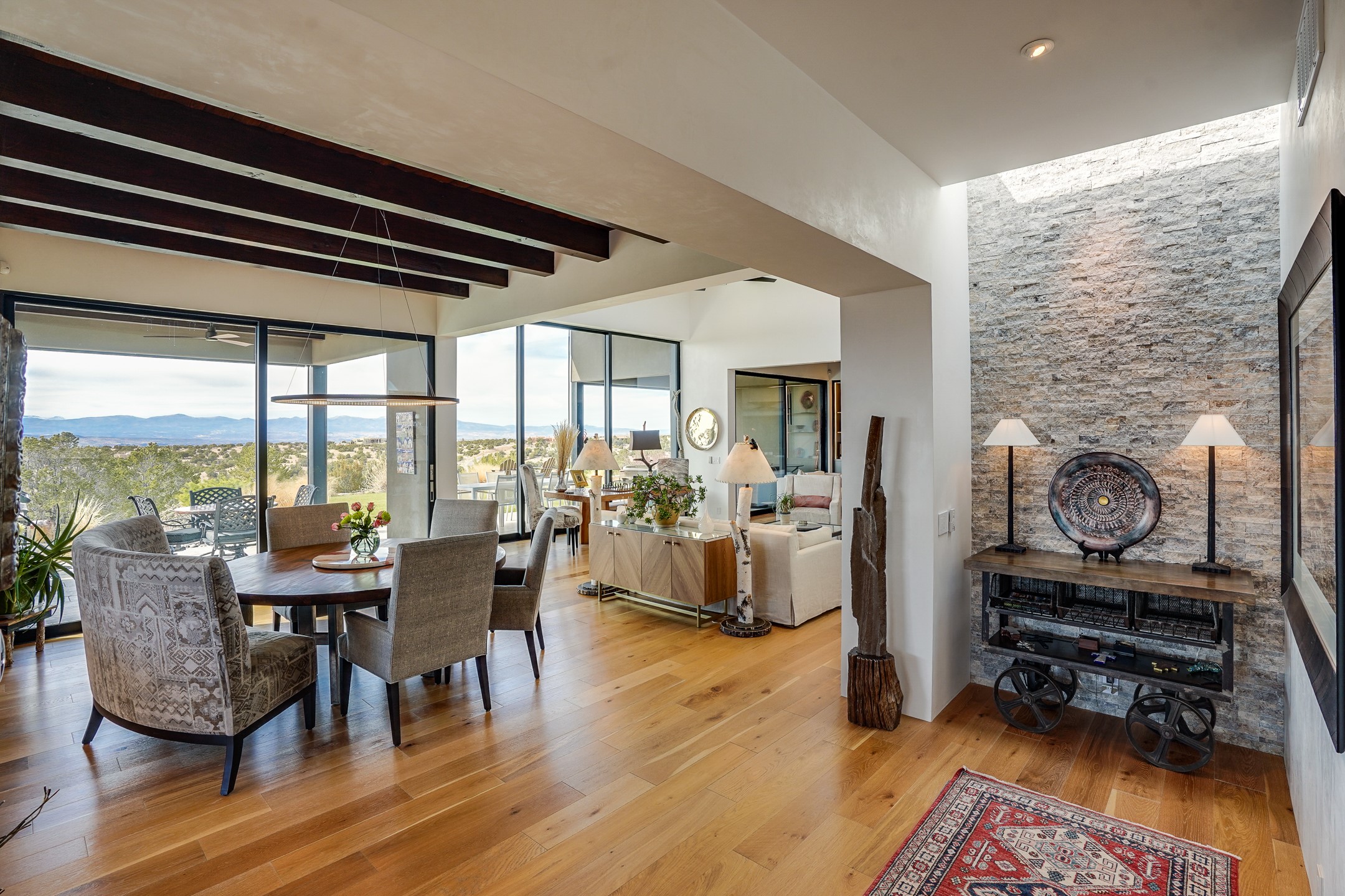 Step into this supremely livable and private, award-winning masterpiece filled with extraordinary features and amazing views just minutes from Las Campanas and town. Modern elegance & comfort await you as you enter this single-level home. Wood, glass & steel blend flawlessly to create an interior space with clean lines & abundant natural light. Amenities of the generous gourmet kitchen include an induction cooktop, dual Fisher & Paykel ovens & refrigerators, 2 dishwashers & 2 sinks, as well as a wine fridge & Scotsman Brilliance nugget ice machine. Remote controlled blinds, Lutron Caseta light switches, a Sonos wired sound system throughout, a Nest temperature system & cameras operated by smartphone or computer enhance further the comfort & livability of this age-in-place home. At the end of the day, enjoy the view as you linger in the luxurious BainUltra soaking tub with air-jet technology. An easily accessible three-car garage with geothermal heating & epoxy floor also houses a woodworking/craft area. Perfectly situated on 2.5 elevated acres with sweeping views of four mountain ranges, the home boasts a gorgeous portal designed for gracious outdoor living & entertaining. Additional charming outdoor areas allow you to relax as you take in the breathtaking vistas & savor the award-winning landscaping that includes two fountains. Winner of the 2021 Parade of Homes Ted Swisher Green Building Award, this stunning home also swept the awards for Best Overall Design, Best Craftsmanship & Best Kitchen. That says it all. Arriving at the magnificent entryway atop the circular drive confirms that this is a smartly designed, luxurious, sophisticated home not to be missed.