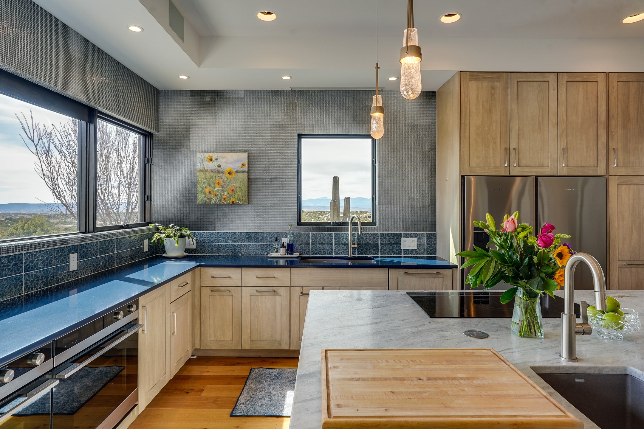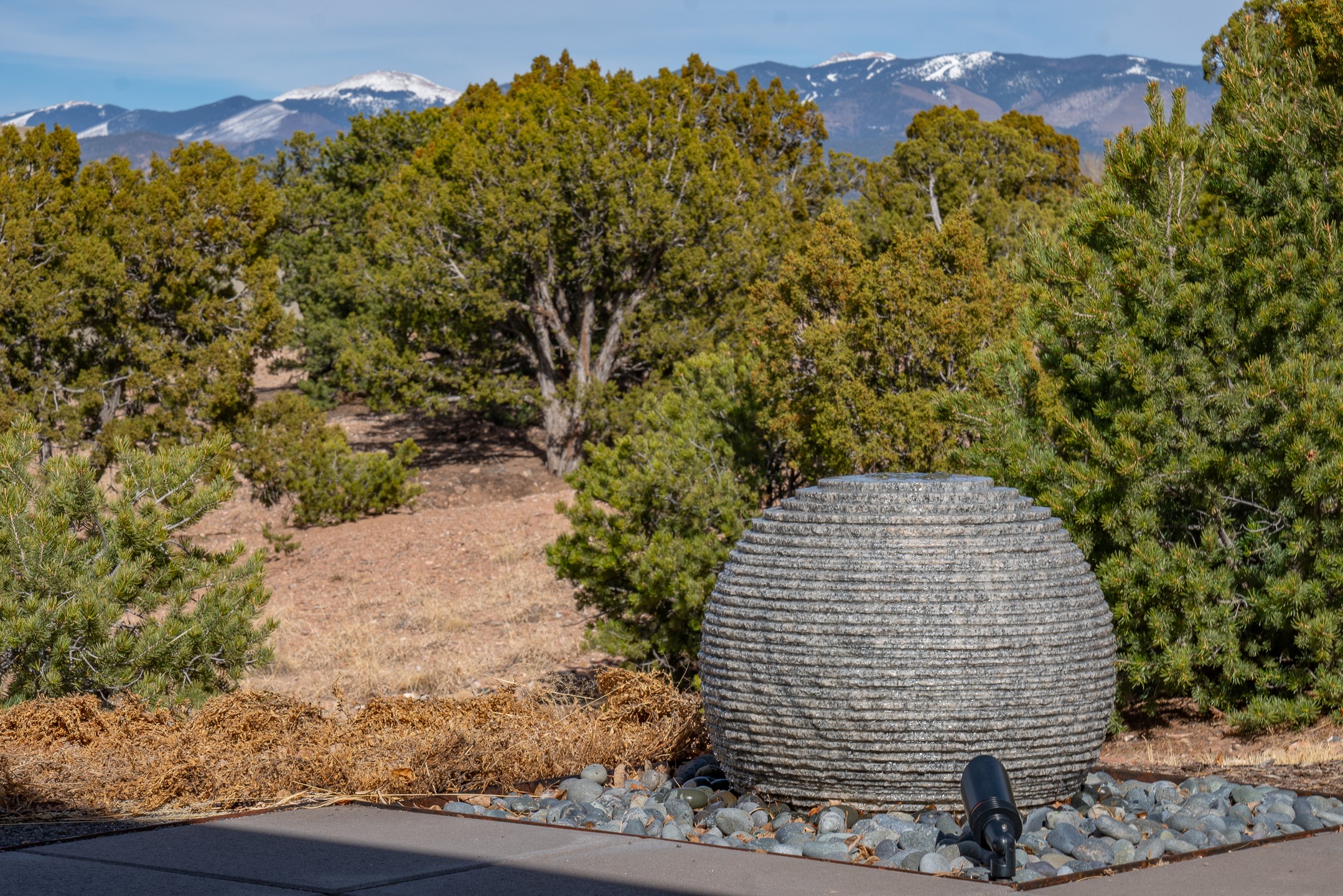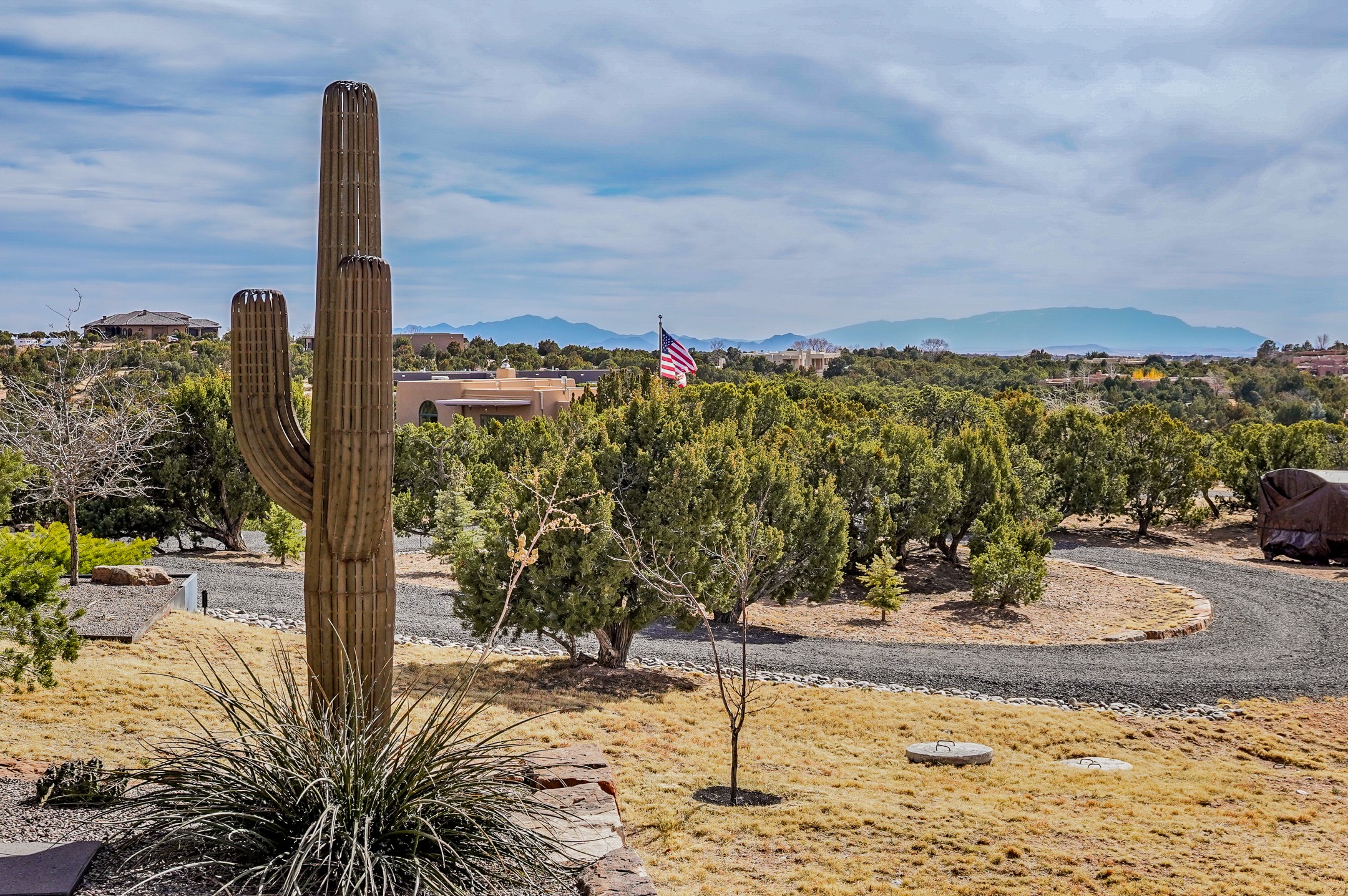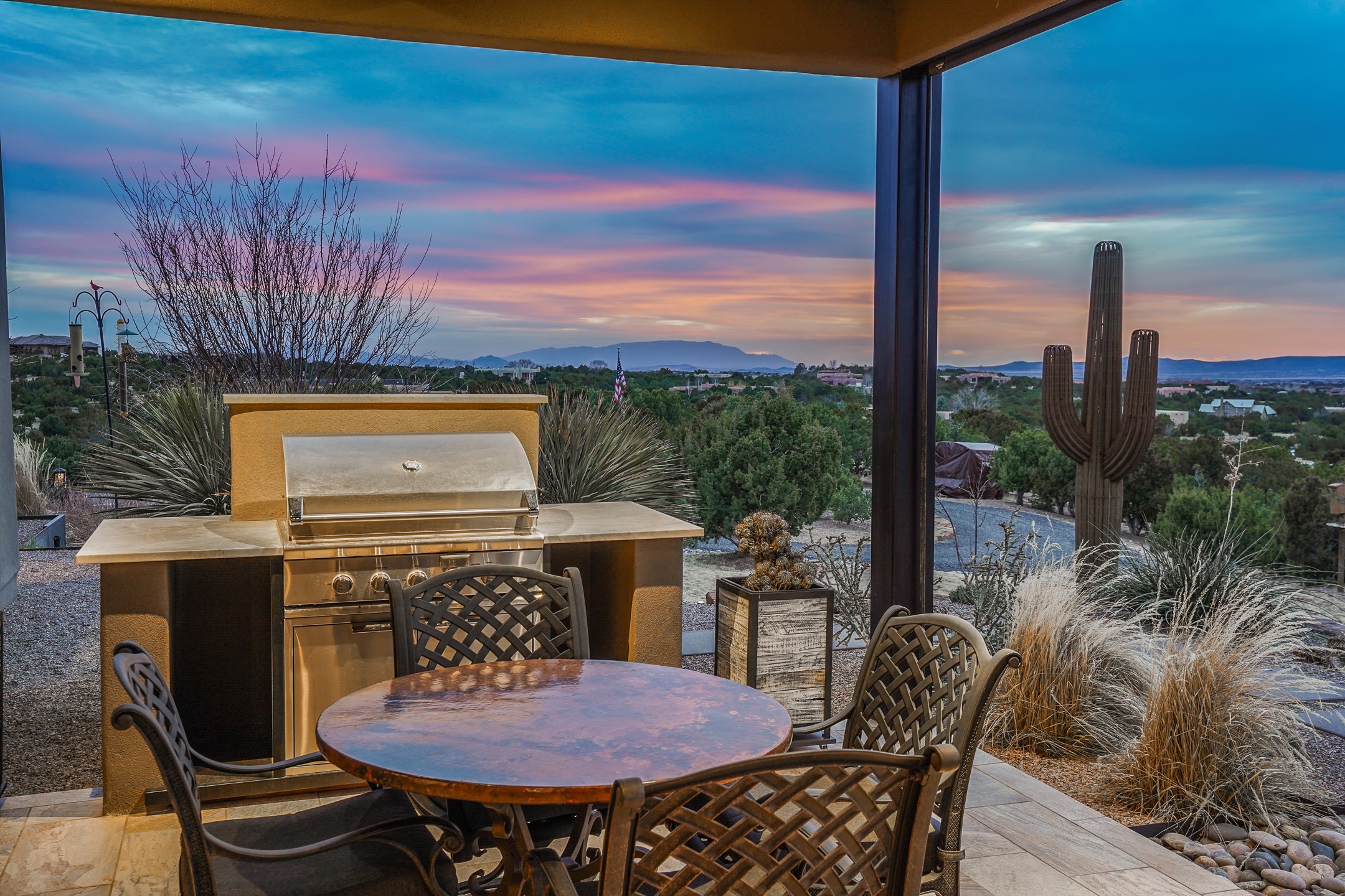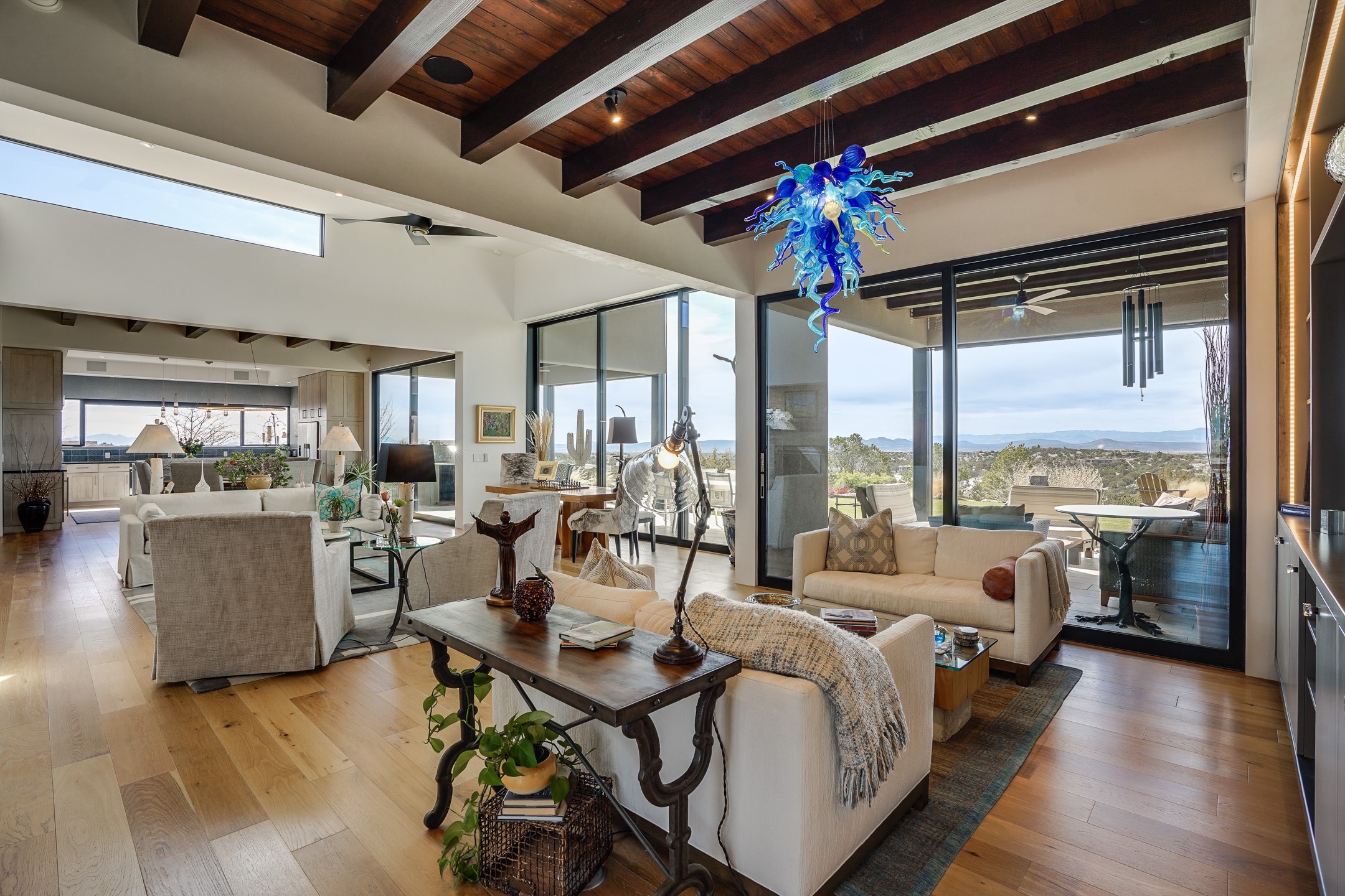 Step into this supremely livable and private, award-winning masterpiece filled with extraordinary features and amazing views just minutes from Las Campanas and town. Modern elegance & comfort await you as you enter this single-level home. Wood, glass & steel blend flawlessly to create an interior space with clean lines & abundant natural light. Amenities of the generous gourmet kitchen include an induction cooktop, dual Fisher & Paykel ovens & refrigerators, 2 dishwashers & 2 sinks, as well as a wine fridge & Scotsman Brilliance nugget ice machine. Remote controlled blinds, Lutron Caseta light switches, a Sonos wired sound system throughout, a Nest temperature system & cameras operated by smartphone or computer enhance further the comfort & livability of this age-in-place home. At the end of the day, enjoy the view as you linger in the luxurious BainUltra soaking tub with air-jet technology. An easily accessible three-car garage with geothermal heating & epoxy floor also houses a woodworking/craft area. Perfectly situated on 2.5 elevated acres with sweeping views of four mountain ranges, the home boasts a gorgeous portal designed for gracious outdoor living & entertaining. Additional charming outdoor areas allow you to relax as you take in the breathtaking vistas & savor the award-winning landscaping that includes two fountains. Winner of the 2021 Parade of Homes Ted Swisher Green Building Award, this stunning home also swept the awards for Best Overall Design, Best Craftsmanship & Best Kitchen. That says it all. Arriving at the magnificent entryway atop the circular drive confirms that this is a smartly designed, luxurious, sophisticated home not to be missed.