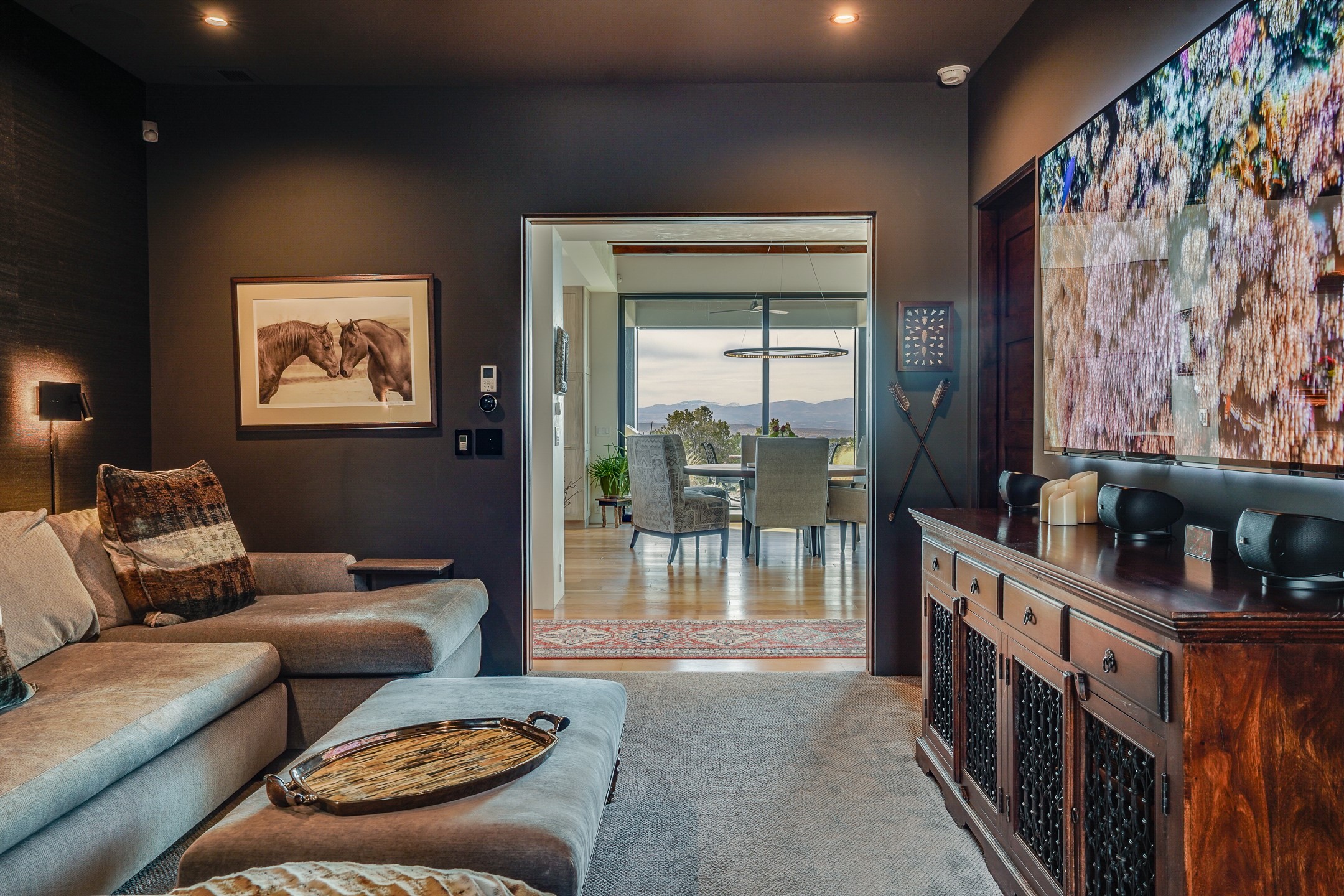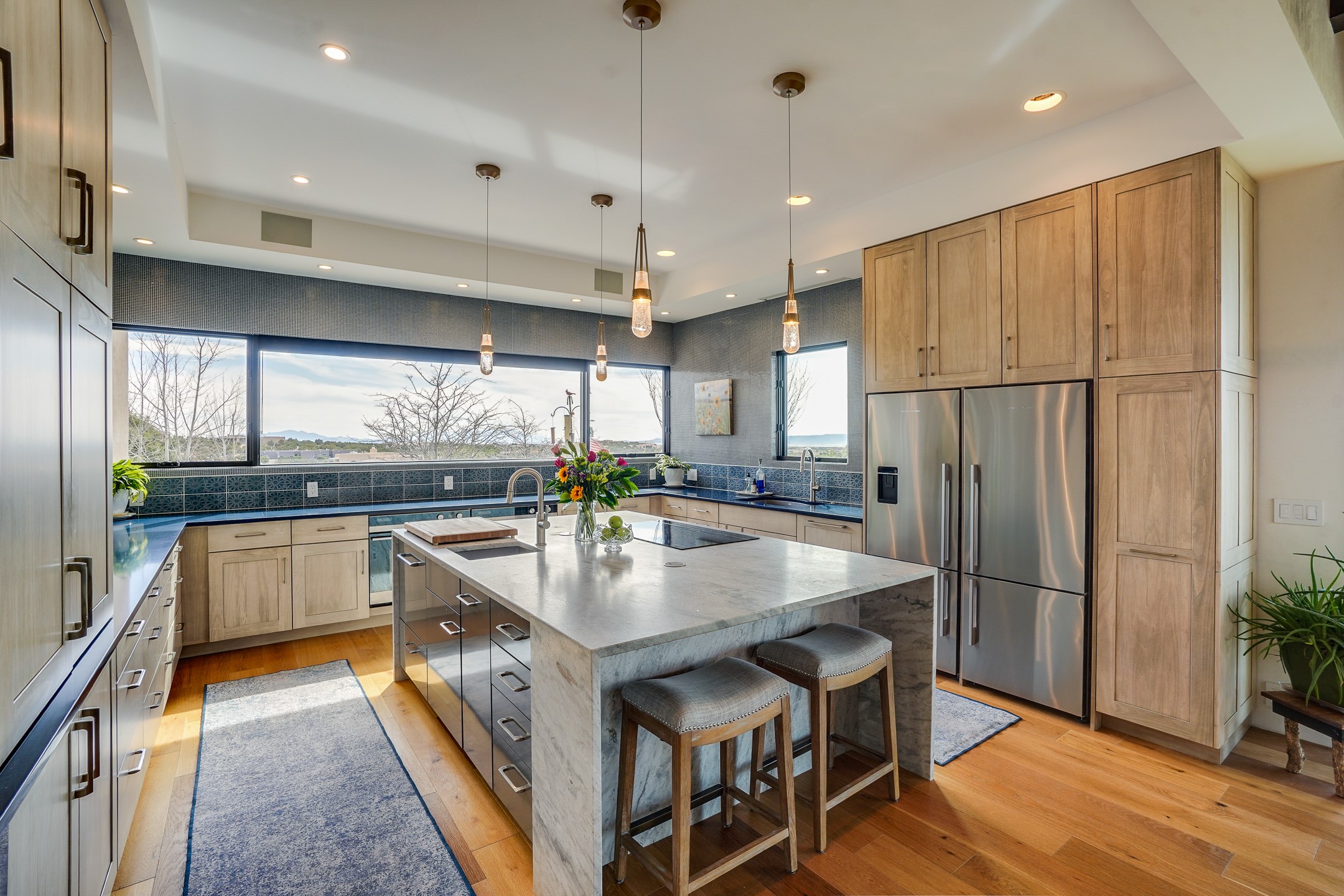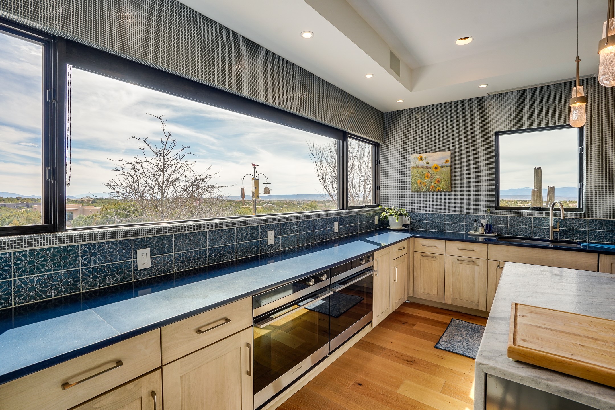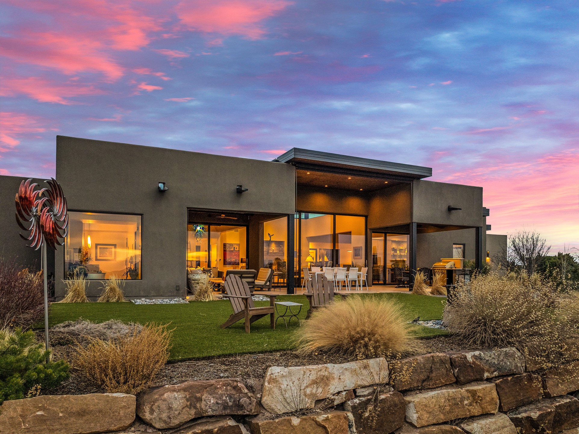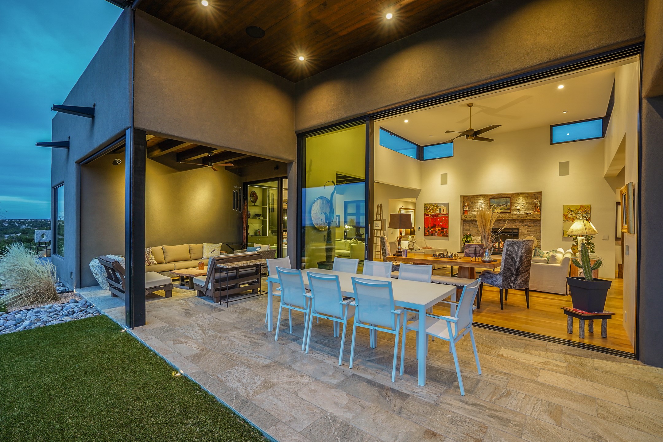 Step into this supremely livable and private, award-winning masterpiece filled with extraordinary features and amazing views just minutes from Las Campanas and town. Modern elegance & comfort await you as you enter this single-level home. Wood, glass & steel blend flawlessly to create an interior space with clean lines & abundant natural light. Amenities of the generous gourmet kitchen include an induction cooktop, dual Fisher & Paykel ovens & refrigerators, 2 dishwashers & 2 sinks, as well as a wine fridge & Scotsman Brilliance nugget ice machine. Remote controlled blinds, Lutron Caseta light switches, a Sonos wired sound system throughout, a Nest temperature system & cameras operated by smartphone or computer enhance further the comfort & livability of this age-in-place home. At the end of the day, enjoy the view as you linger in the luxurious BainUltra soaking tub with air-jet technology. An easily accessible three-car garage with geothermal heating & epoxy floor also houses a woodworking/craft area. Perfectly situated on 2.5 elevated acres with sweeping views of four mountain ranges, the home boasts a gorgeous portal designed for gracious outdoor living & entertaining. Additional charming outdoor areas allow you to relax as you take in the breathtaking vistas & savor the award-winning landscaping that includes two fountains. Winner of the 2021 Parade of Homes Ted Swisher Green Building Award, this stunning home also swept the awards for Best Overall Design, Best Craftsmanship & Best Kitchen. That says it all. Arriving at the magnificent entryway atop the circular drive confirms that this is a smartly designed, luxurious, sophisticated home not to be missed.