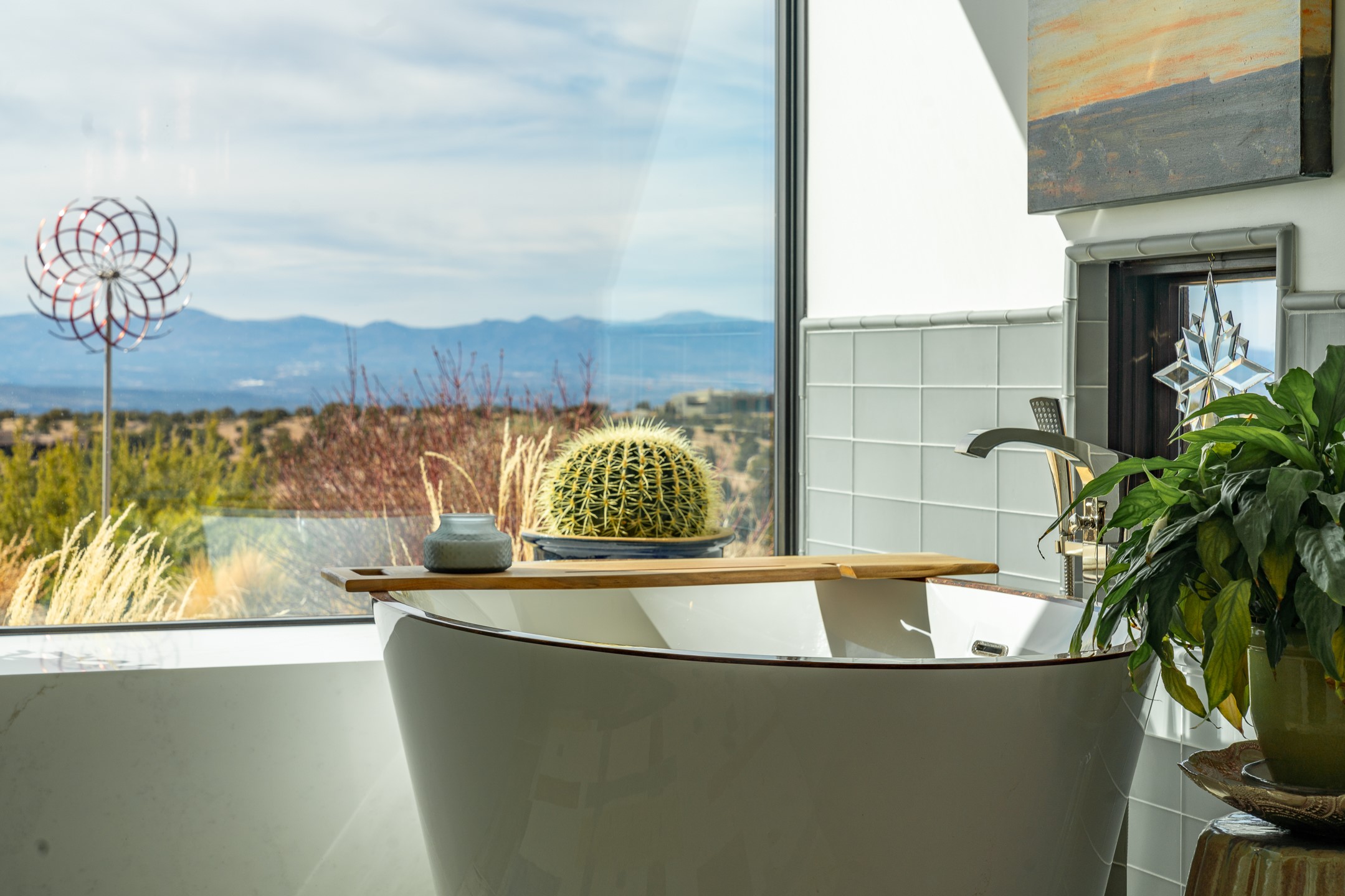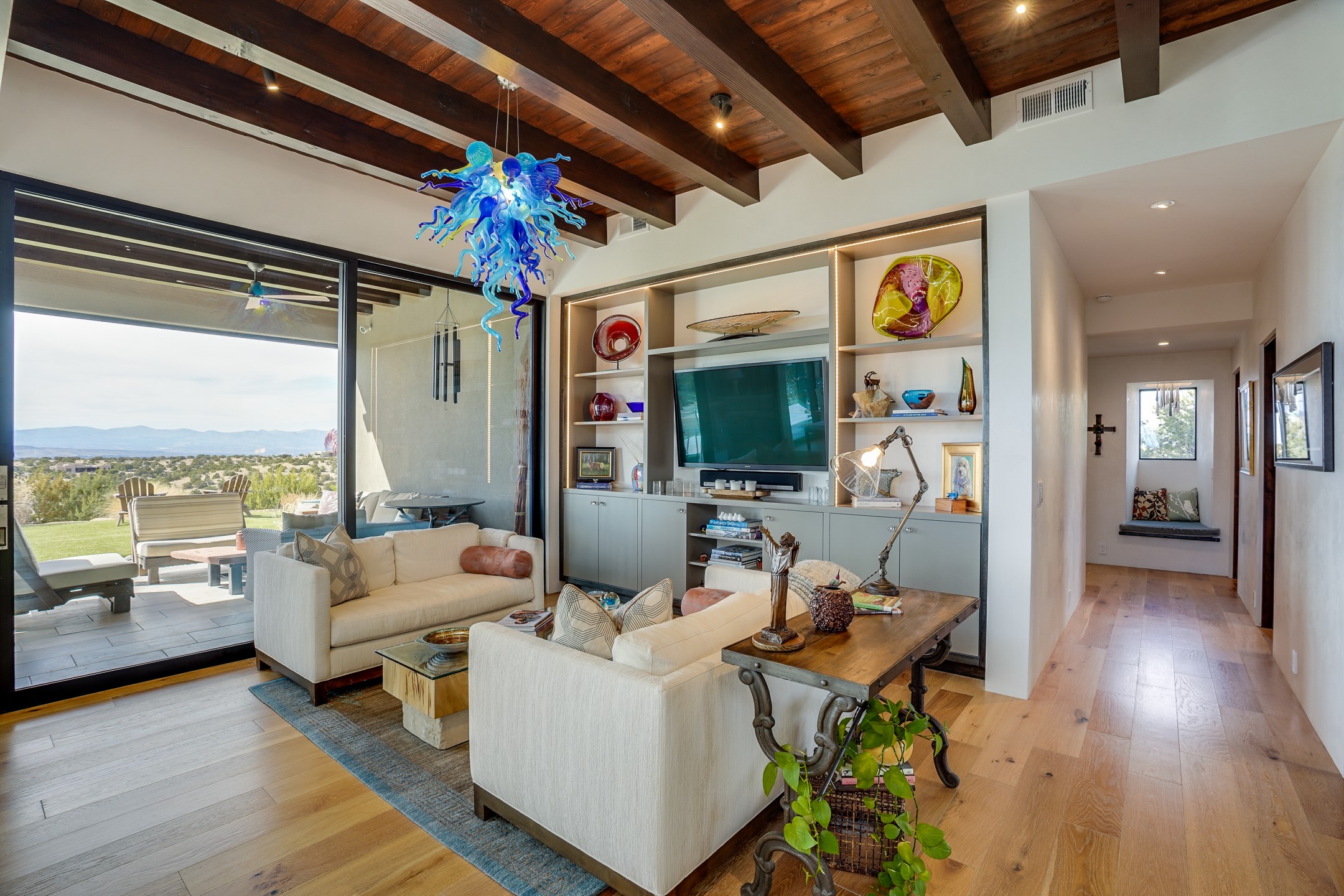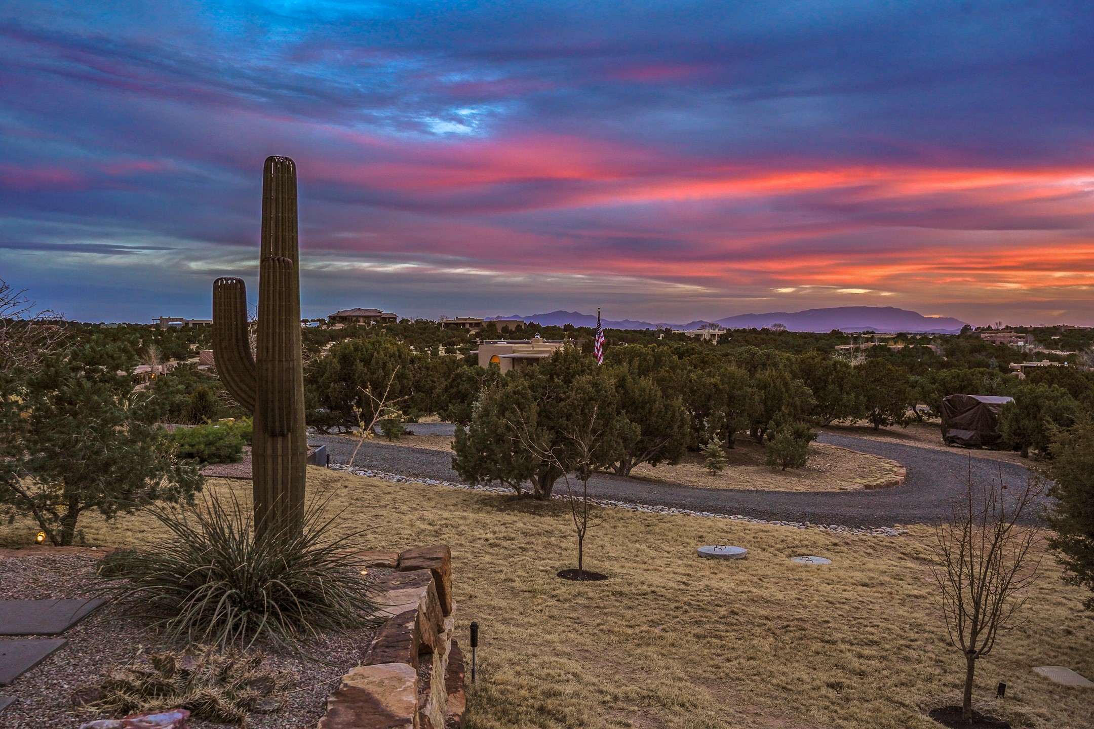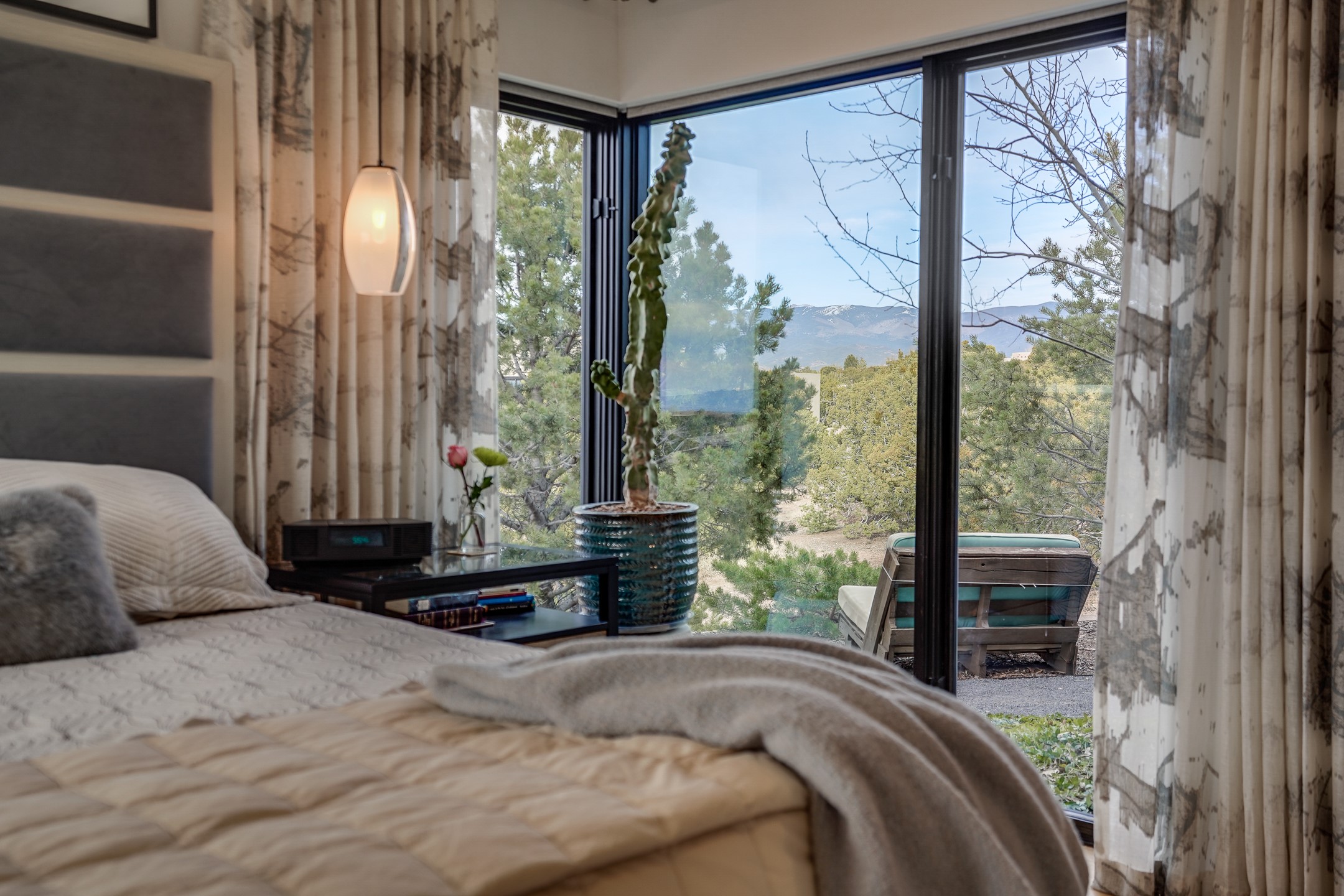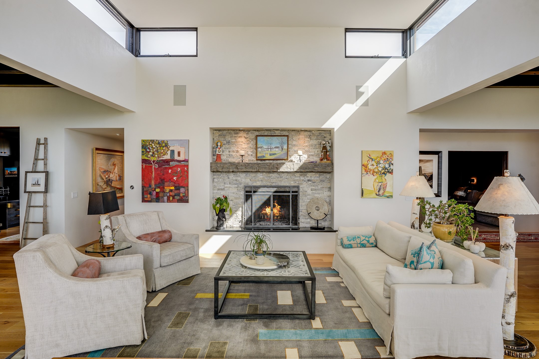 Step into this supremely livable and private, award-winning masterpiece filled with extraordinary features and amazing views just minutes from Las Campanas and town. Modern elegance & comfort await you as you enter this single-level home. Wood, glass & steel blend flawlessly to create an interior space with clean lines & abundant natural light. Amenities of the generous gourmet kitchen include an induction cooktop, dual Fisher & Paykel ovens & refrigerators, 2 dishwashers & 2 sinks, as well as a wine fridge & Scotsman Brilliance nugget ice machine. Remote controlled blinds, Lutron Caseta light switches, a Sonos wired sound system throughout, a Nest temperature system & cameras operated by smartphone or computer enhance further the comfort & livability of this age-in-place home. At the end of the day, enjoy the view as you linger in the luxurious BainUltra soaking tub with air-jet technology. An easily accessible three-car garage with geothermal heating & epoxy floor also houses a woodworking/craft area. Perfectly situated on 2.5 elevated acres with sweeping views of four mountain ranges, the home boasts a gorgeous portal designed for gracious outdoor living & entertaining. Additional charming outdoor areas allow you to relax as you take in the breathtaking vistas & savor the award-winning landscaping that includes two fountains. Winner of the 2021 Parade of Homes Ted Swisher Green Building Award, this stunning home also swept the awards for Best Overall Design, Best Craftsmanship & Best Kitchen. That says it all. Arriving at the magnificent entryway atop the circular drive confirms that this is a smartly designed, luxurious, sophisticated home not to be missed.