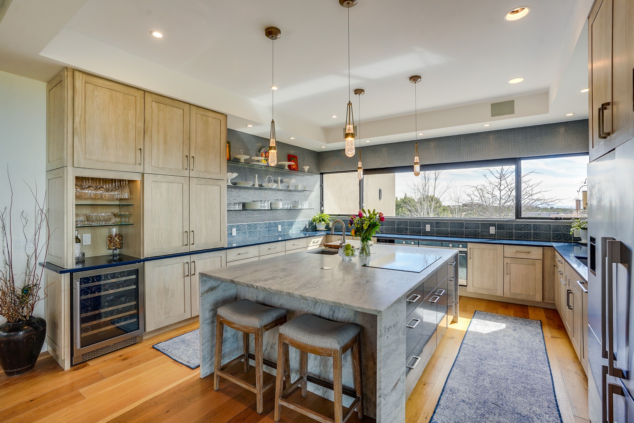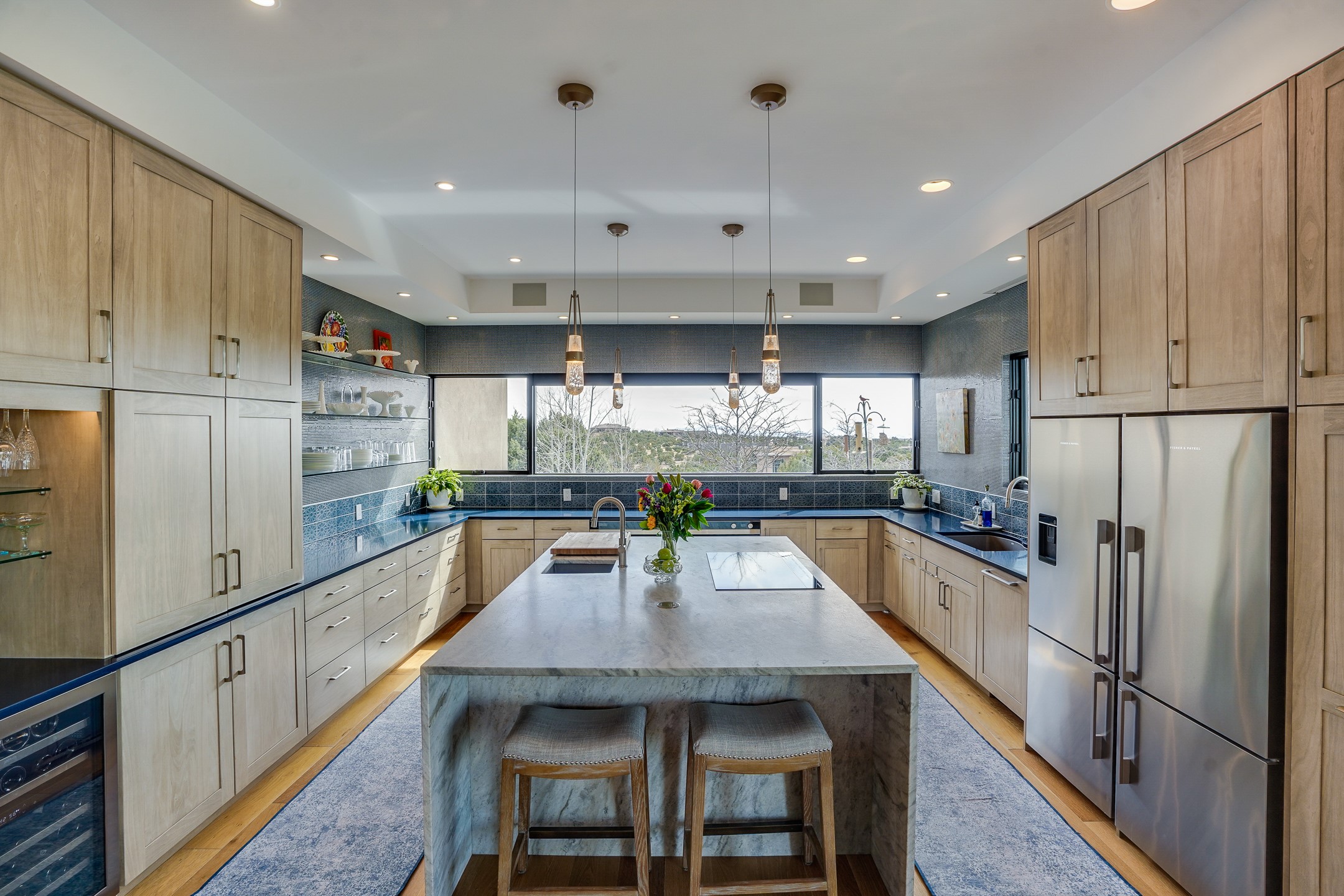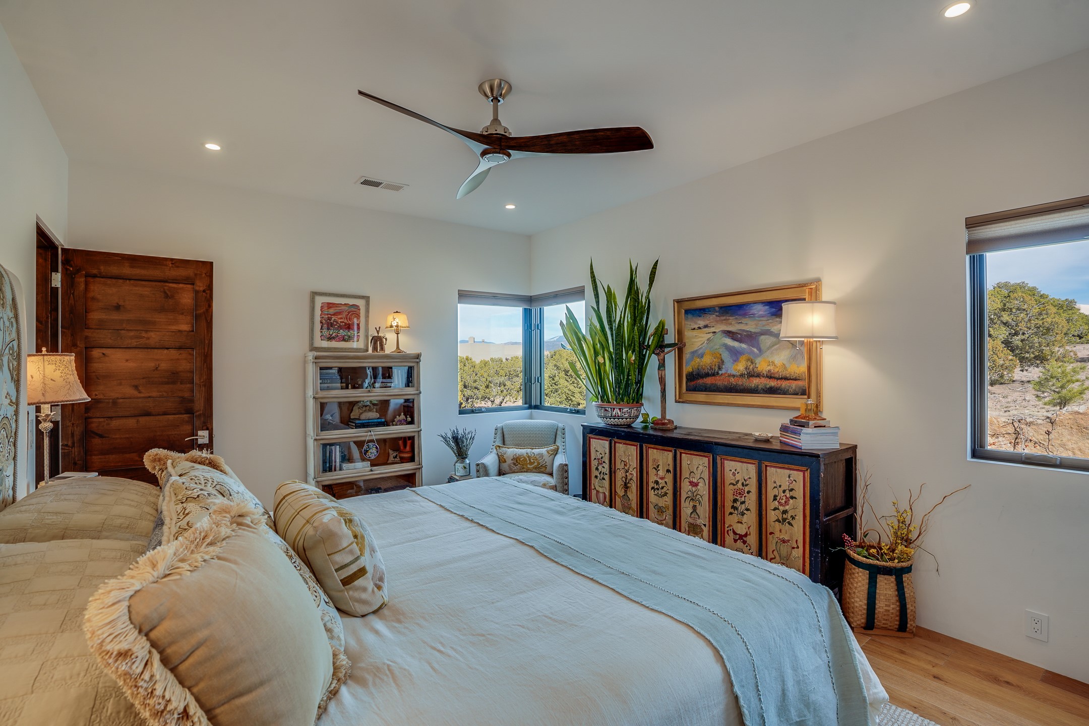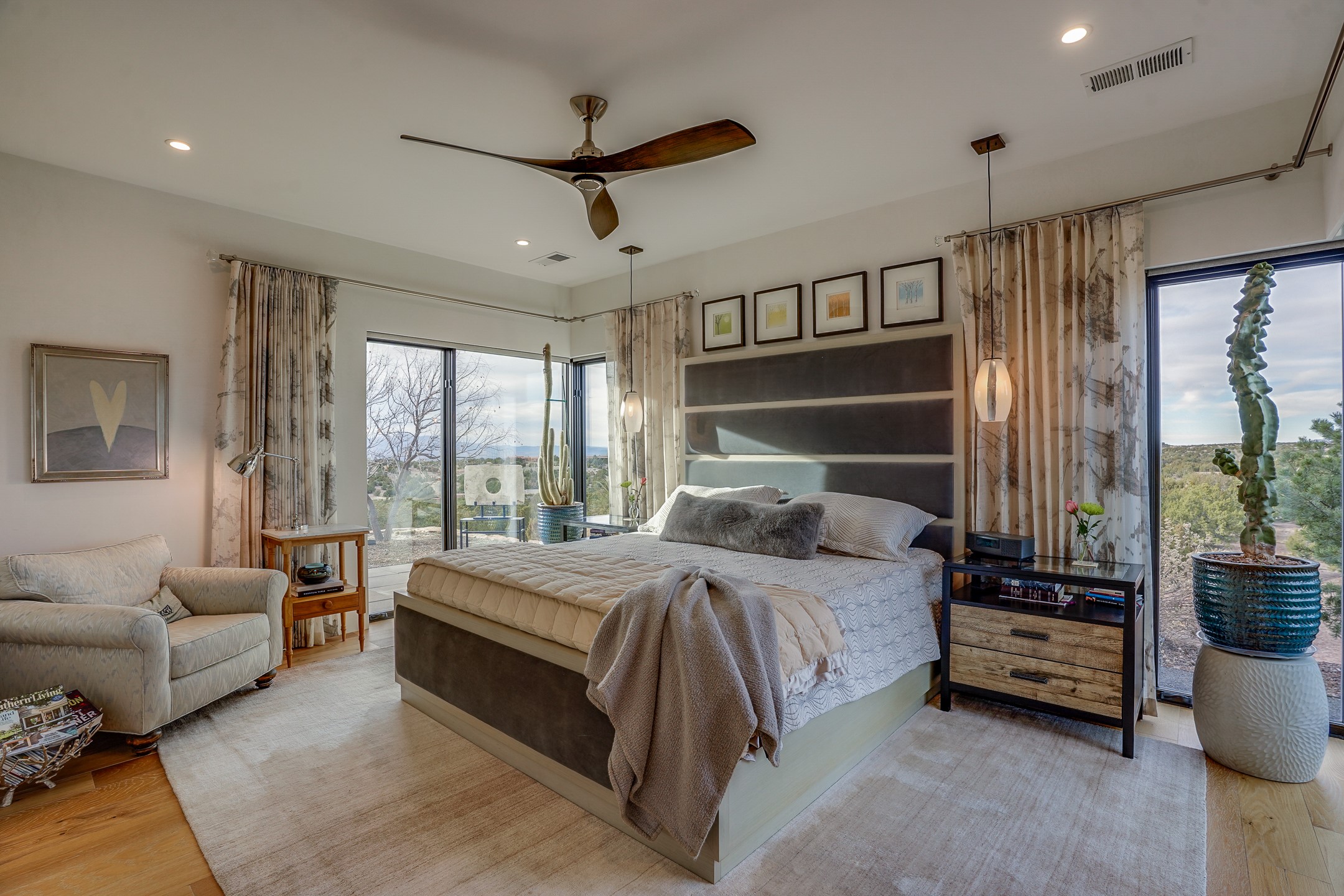Step into this supremely livable and private, award-winning masterpiece filled with extraordinary features and amazing views just minutes from Las Campanas and town. Modern elegance & comfort await you as you enter this single-level home. Wood, glass & steel blend flawlessly to create an interior space with clean lines & abundant natural light. Amenities of the generous gourmet kitchen include an induction cooktop, dual Fisher & Paykel ovens & refrigerators, 2 dishwashers & 2 sinks, as well as a wine fridge & Scotsman Brilliance nugget ice machine. Remote controlled blinds, Lutron Caseta light switches, a Sonos wired sound system throughout, a Nest temperature system & cameras operated by smartphone or computer enhance further the comfort & livability of this age-in-place home. At the end of the day, enjoy the view as you linger in the luxurious BainUltra soaking tub with air-jet technology. An easily accessible three-car garage with geothermal heating & epoxy floor also houses a woodworking/craft area. Perfectly situated on 2.5 elevated acres with sweeping views of four mountain ranges, the home boasts a gorgeous portal designed for gracious outdoor living & entertaining. Additional charming outdoor areas allow you to relax as you take in the breathtaking vistas & savor the award-winning landscaping that includes two fountains. Winner of the 2021 Parade of Homes Ted Swisher Green Building Award, this stunning home also swept the awards for Best Overall Design, Best Craftsmanship & Best Kitchen. That says it all. Arriving at the magnificent entryway atop the circular drive confirms that this is a smartly designed, luxurious, sophisticated home not to be missed.