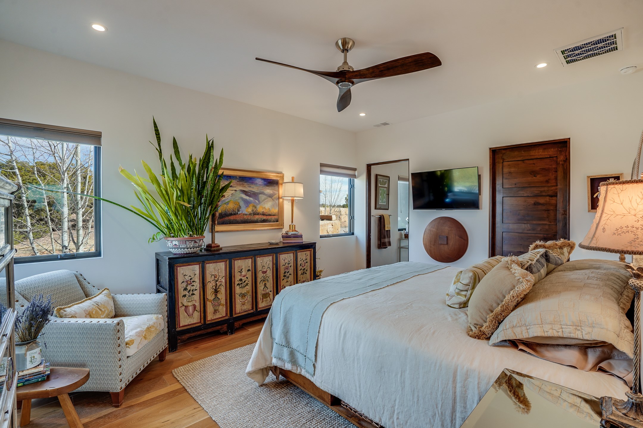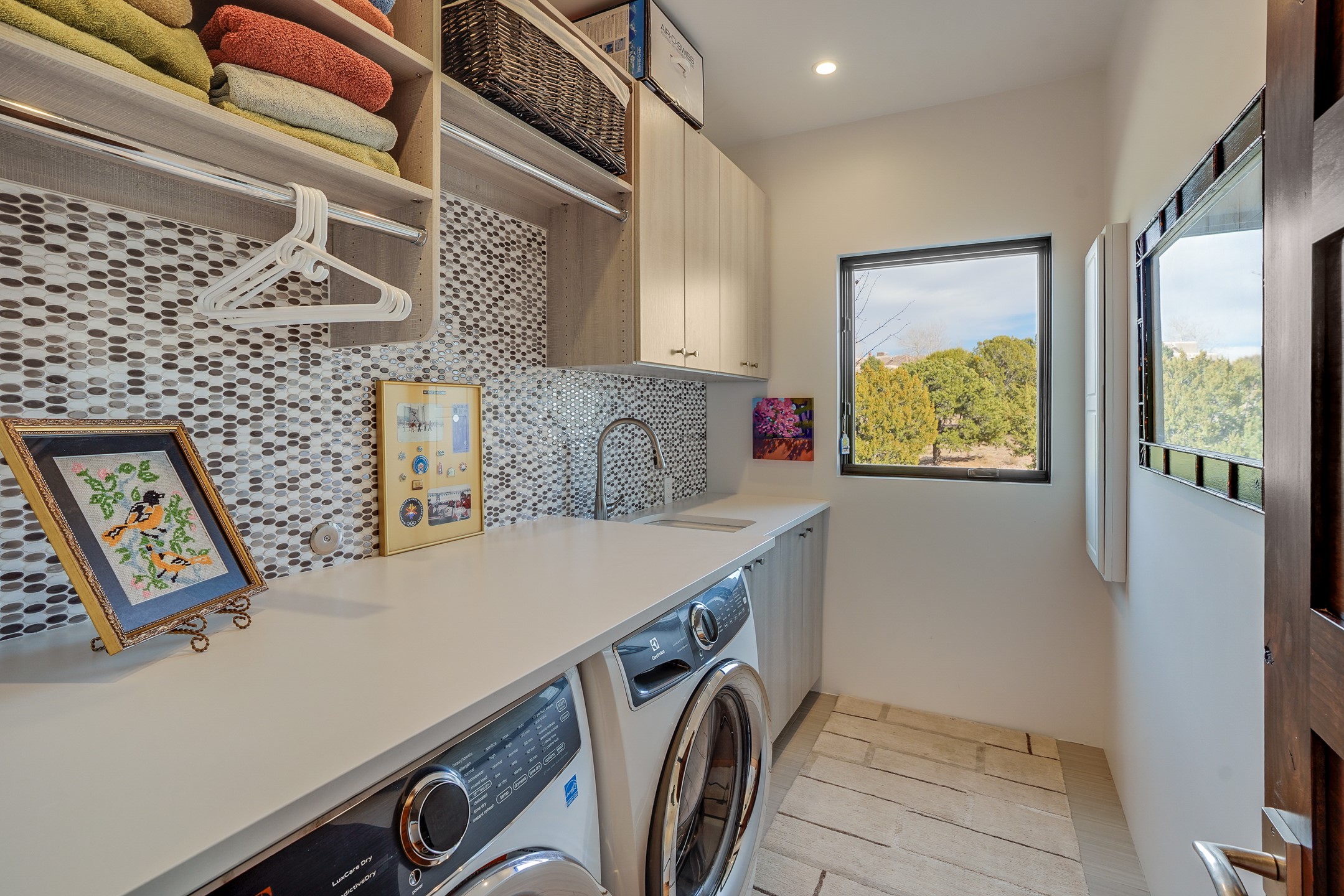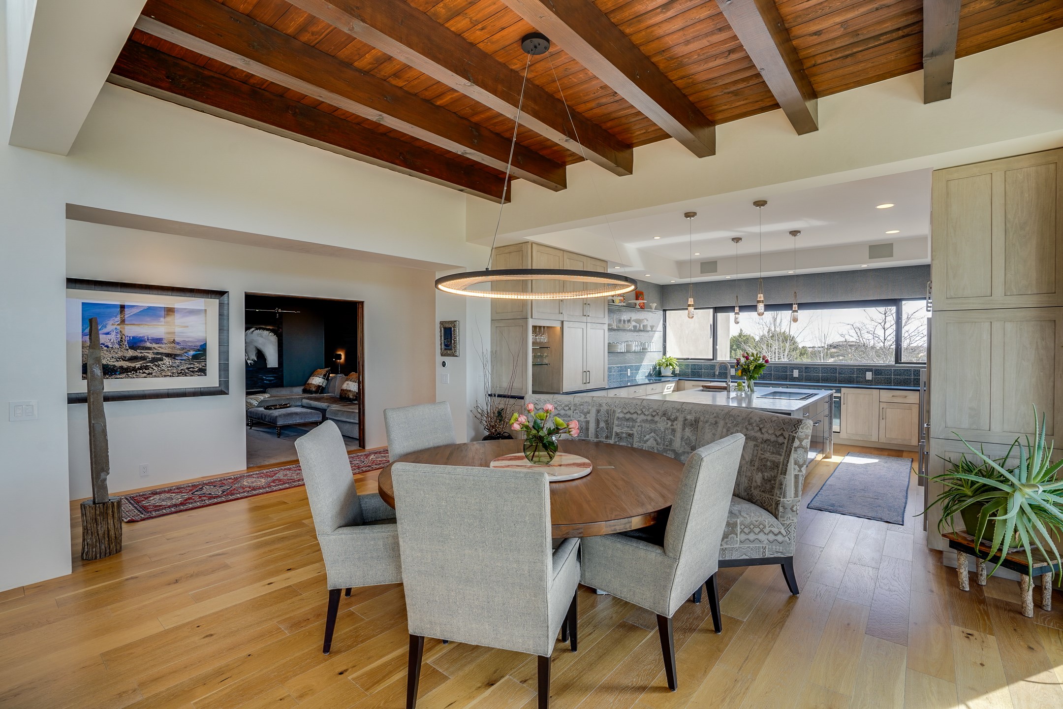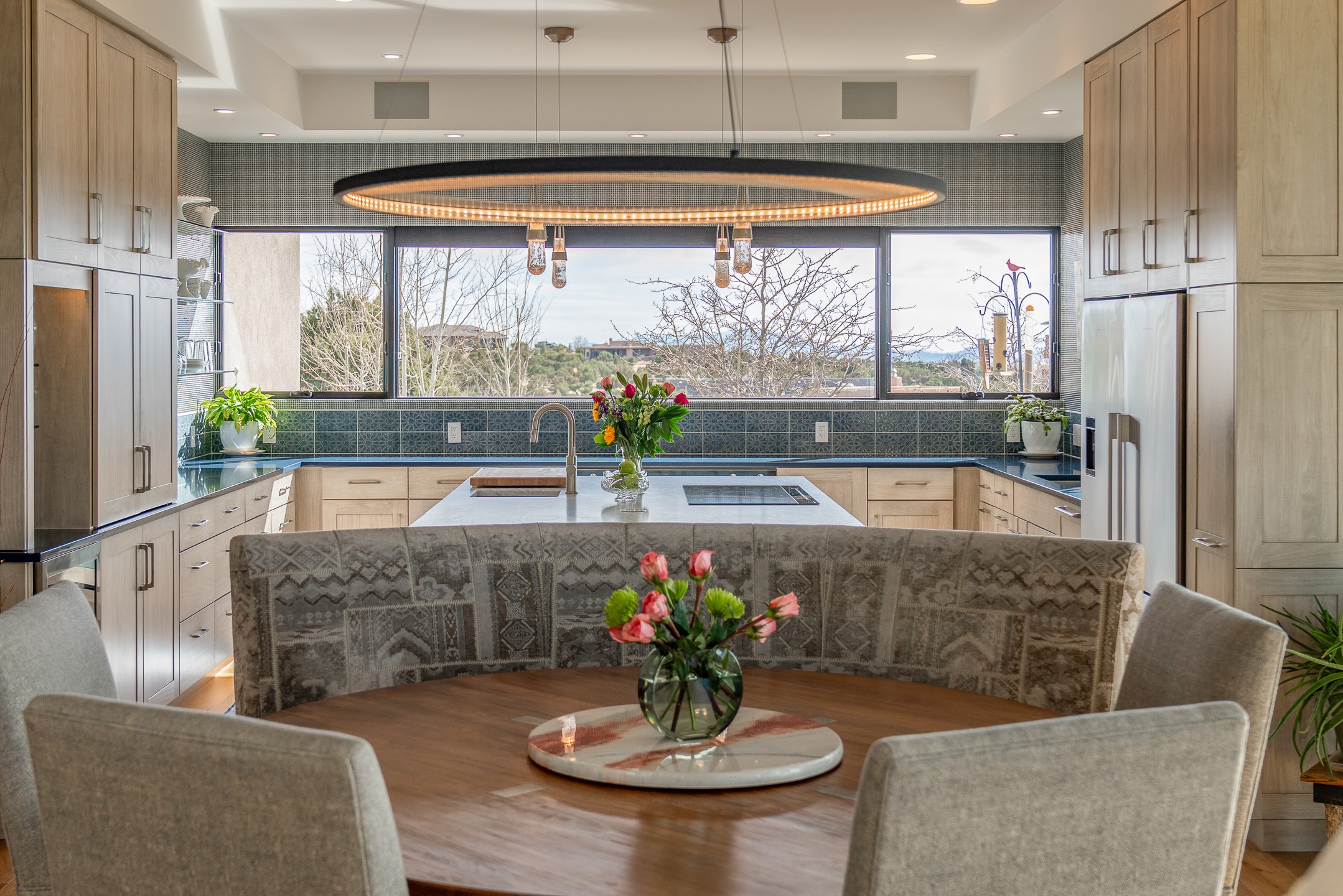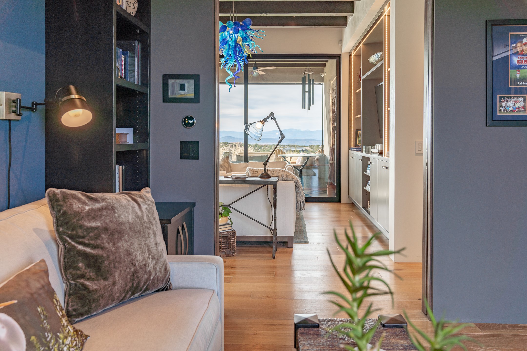 Step into this supremely livable and private, award-winning masterpiece filled with extraordinary features and amazing views just minutes from Las Campanas and town. Modern elegance & comfort await you as you enter this single-level home. Wood, glass & steel blend flawlessly to create an interior space with clean lines & abundant natural light. Amenities of the generous gourmet kitchen include an induction cooktop, dual Fisher & Paykel ovens & refrigerators, 2 dishwashers & 2 sinks, as well as a wine fridge & Scotsman Brilliance nugget ice machine. Remote controlled blinds, Lutron Caseta light switches, a Sonos wired sound system throughout, a Nest temperature system & cameras operated by smartphone or computer enhance further the comfort & livability of this age-in-place home. At the end of the day, enjoy the view as you linger in the luxurious BainUltra soaking tub with air-jet technology. An easily accessible three-car garage with geothermal heating & epoxy floor also houses a woodworking/craft area. Perfectly situated on 2.5 elevated acres with sweeping views of four mountain ranges, the home boasts a gorgeous portal designed for gracious outdoor living & entertaining. Additional charming outdoor areas allow you to relax as you take in the breathtaking vistas & savor the award-winning landscaping that includes two fountains. Winner of the 2021 Parade of Homes Ted Swisher Green Building Award, this stunning home also swept the awards for Best Overall Design, Best Craftsmanship & Best Kitchen. That says it all. Arriving at the magnificent entryway atop the circular drive confirms that this is a smartly designed, luxurious, sophisticated home not to be missed.