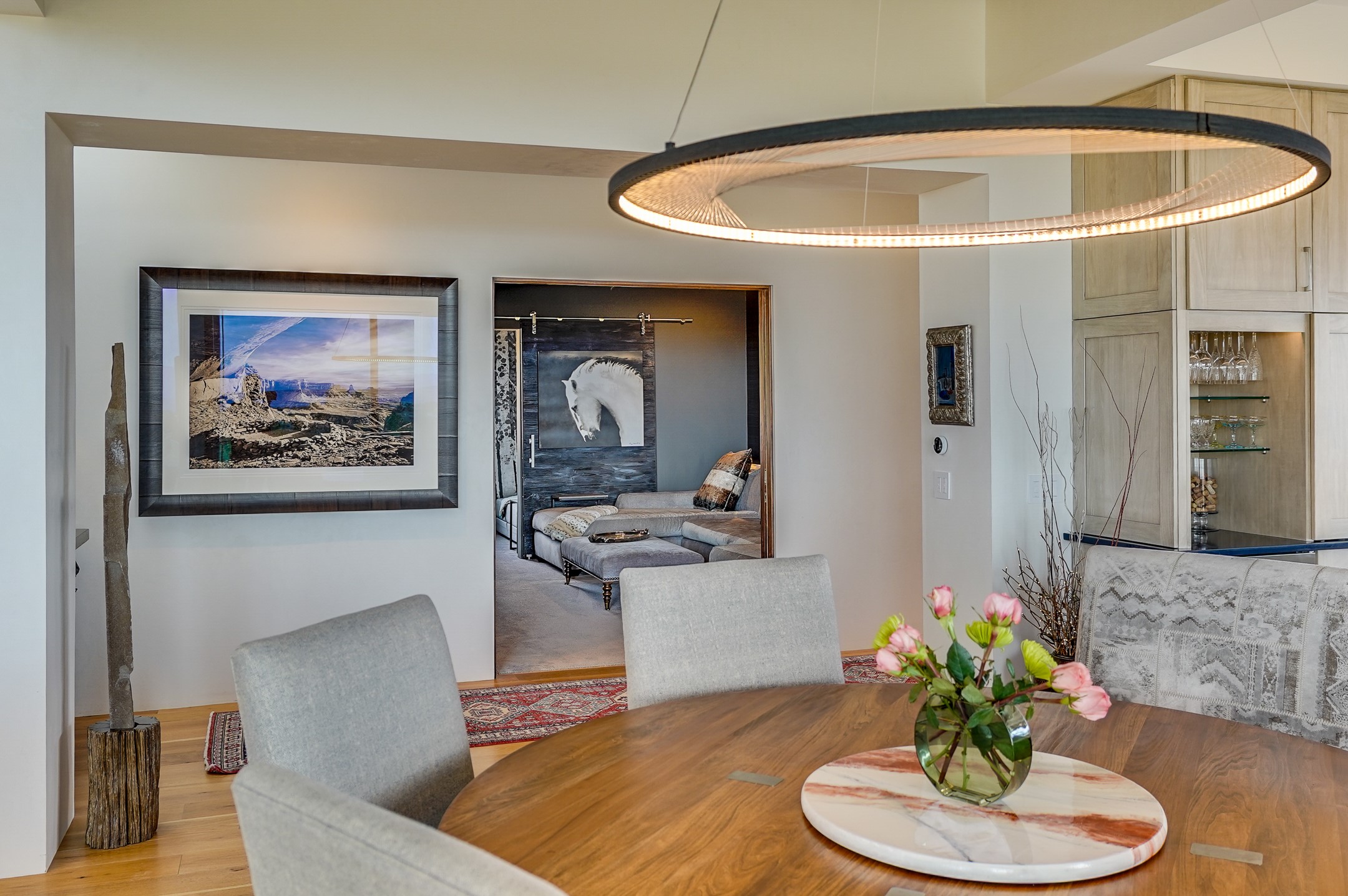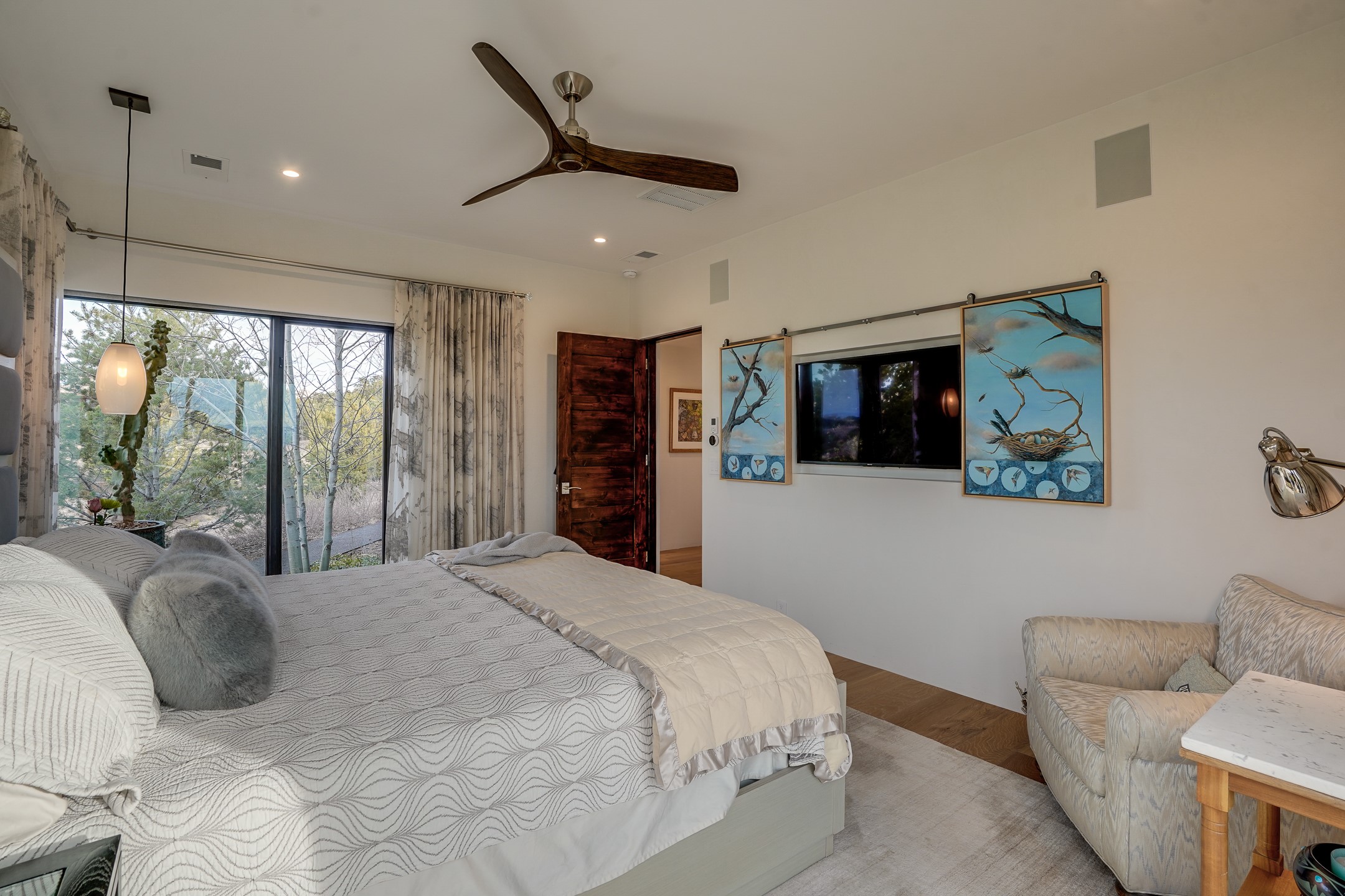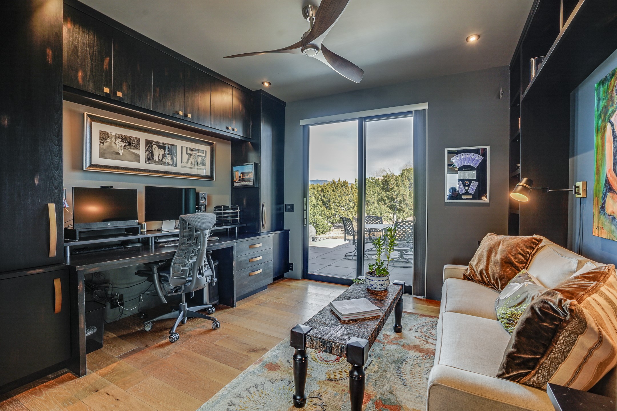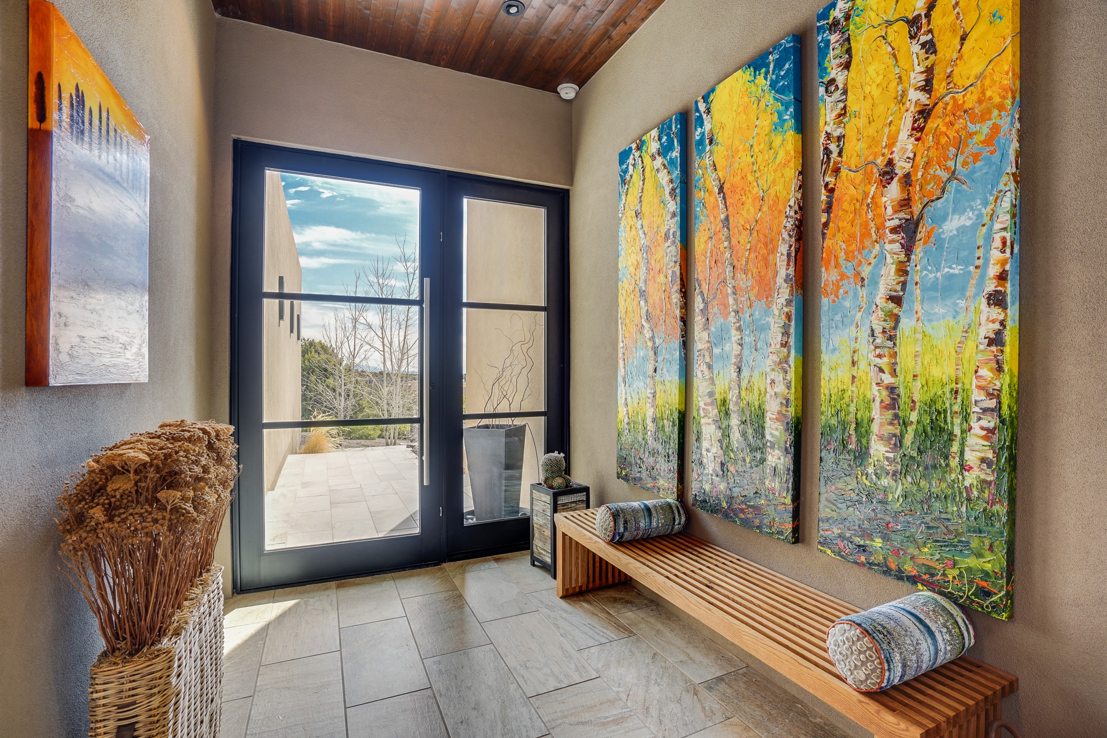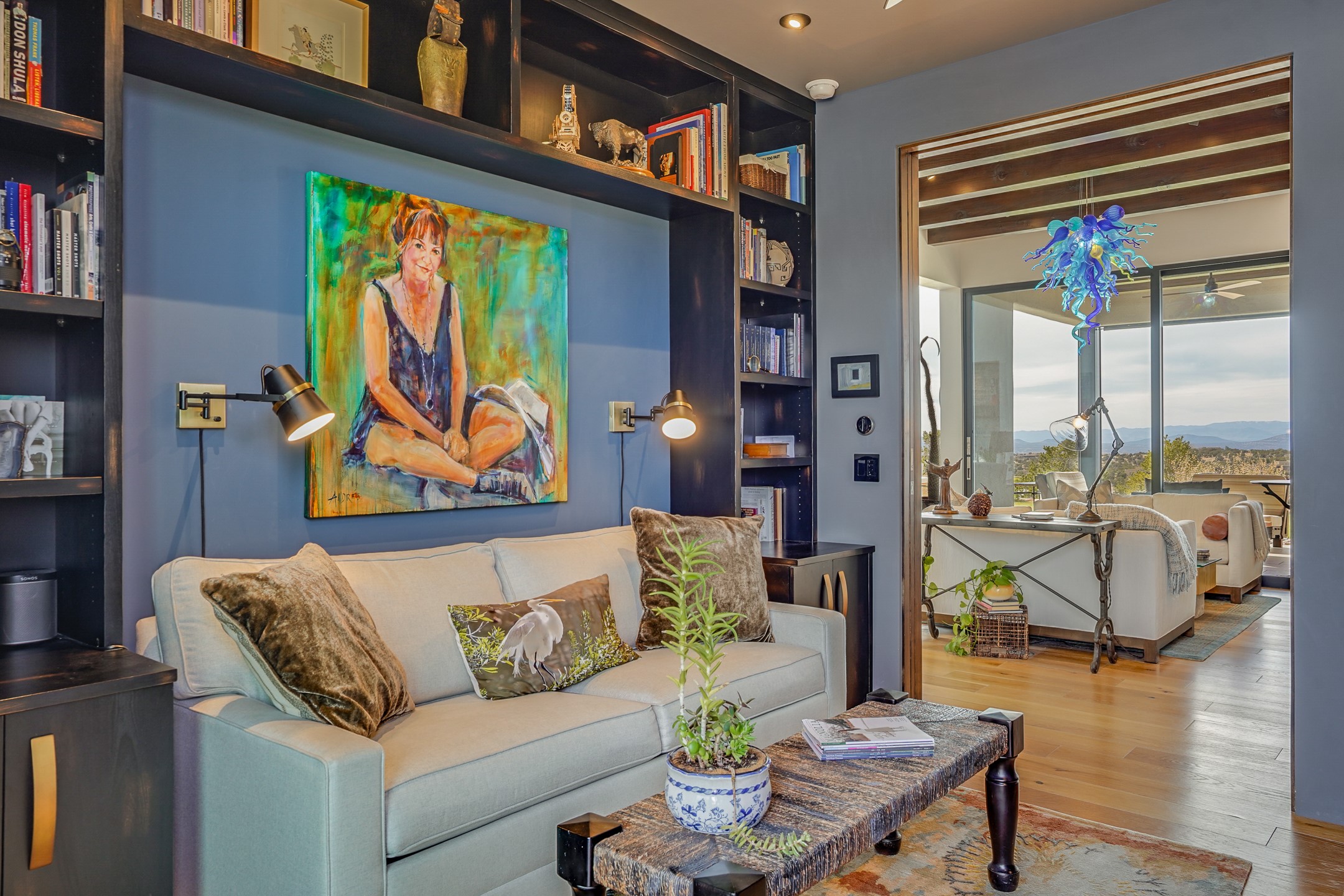 Step into this supremely livable and private, award-winning masterpiece filled with extraordinary features and amazing views just minutes from Las Campanas and town. Modern elegance & comfort await you as you enter this single-level home. Wood, glass & steel blend flawlessly to create an interior space with clean lines & abundant natural light. Amenities of the generous gourmet kitchen include an induction cooktop, dual Fisher & Paykel ovens & refrigerators, 2 dishwashers & 2 sinks, as well as a wine fridge & Scotsman Brilliance nugget ice machine. Remote controlled blinds, Lutron Caseta light switches, a Sonos wired sound system throughout, a Nest temperature system & cameras operated by smartphone or computer enhance further the comfort & livability of this age-in-place home. At the end of the day, enjoy the view as you linger in the luxurious BainUltra soaking tub with air-jet technology. An easily accessible three-car garage with geothermal heating & epoxy floor also houses a woodworking/craft area. Perfectly situated on 2.5 elevated acres with sweeping views of four mountain ranges, the home boasts a gorgeous portal designed for gracious outdoor living & entertaining. Additional charming outdoor areas allow you to relax as you take in the breathtaking vistas & savor the award-winning landscaping that includes two fountains. Winner of the 2021 Parade of Homes Ted Swisher Green Building Award, this stunning home also swept the awards for Best Overall Design, Best Craftsmanship & Best Kitchen. That says it all. Arriving at the magnificent entryway atop the circular drive confirms that this is a smartly designed, luxurious, sophisticated home not to be missed.