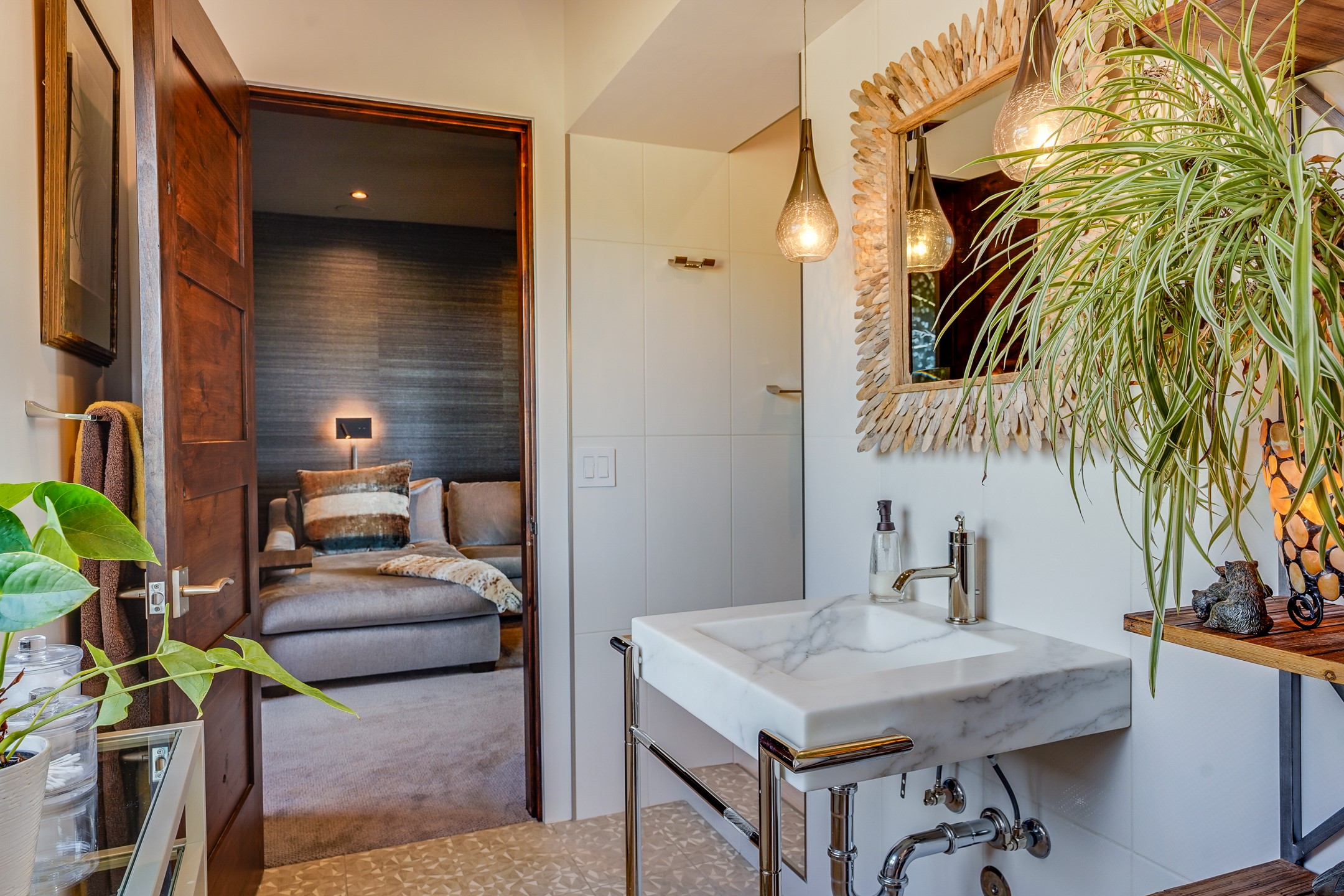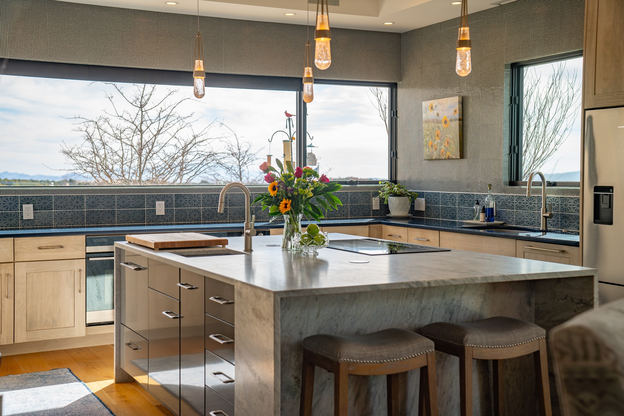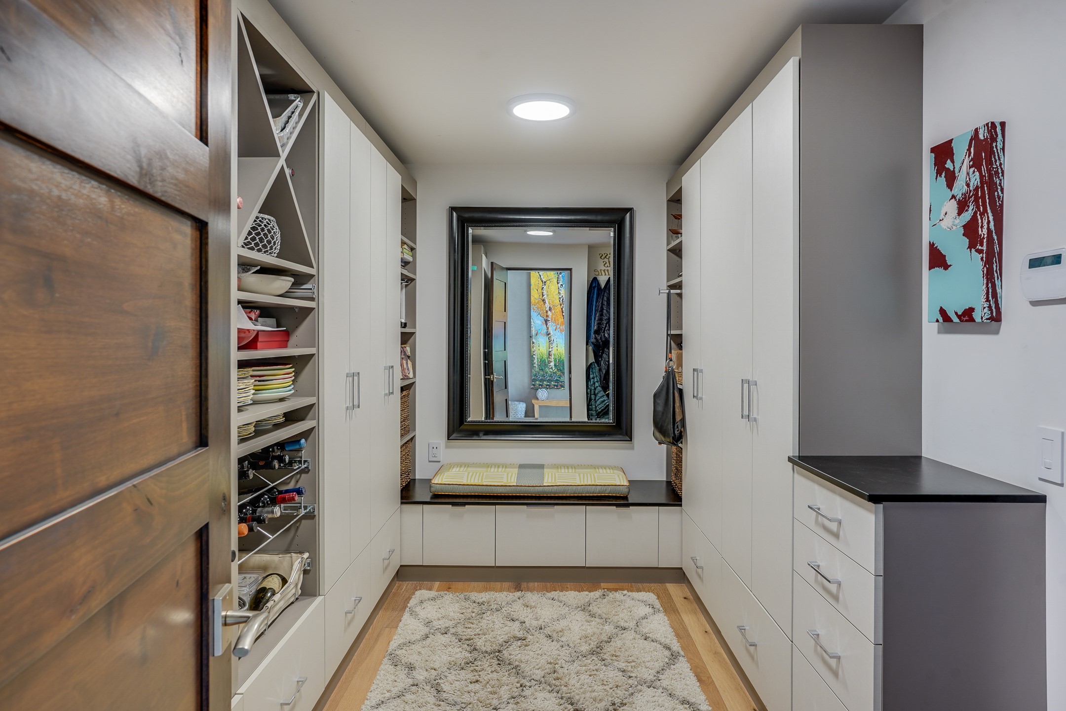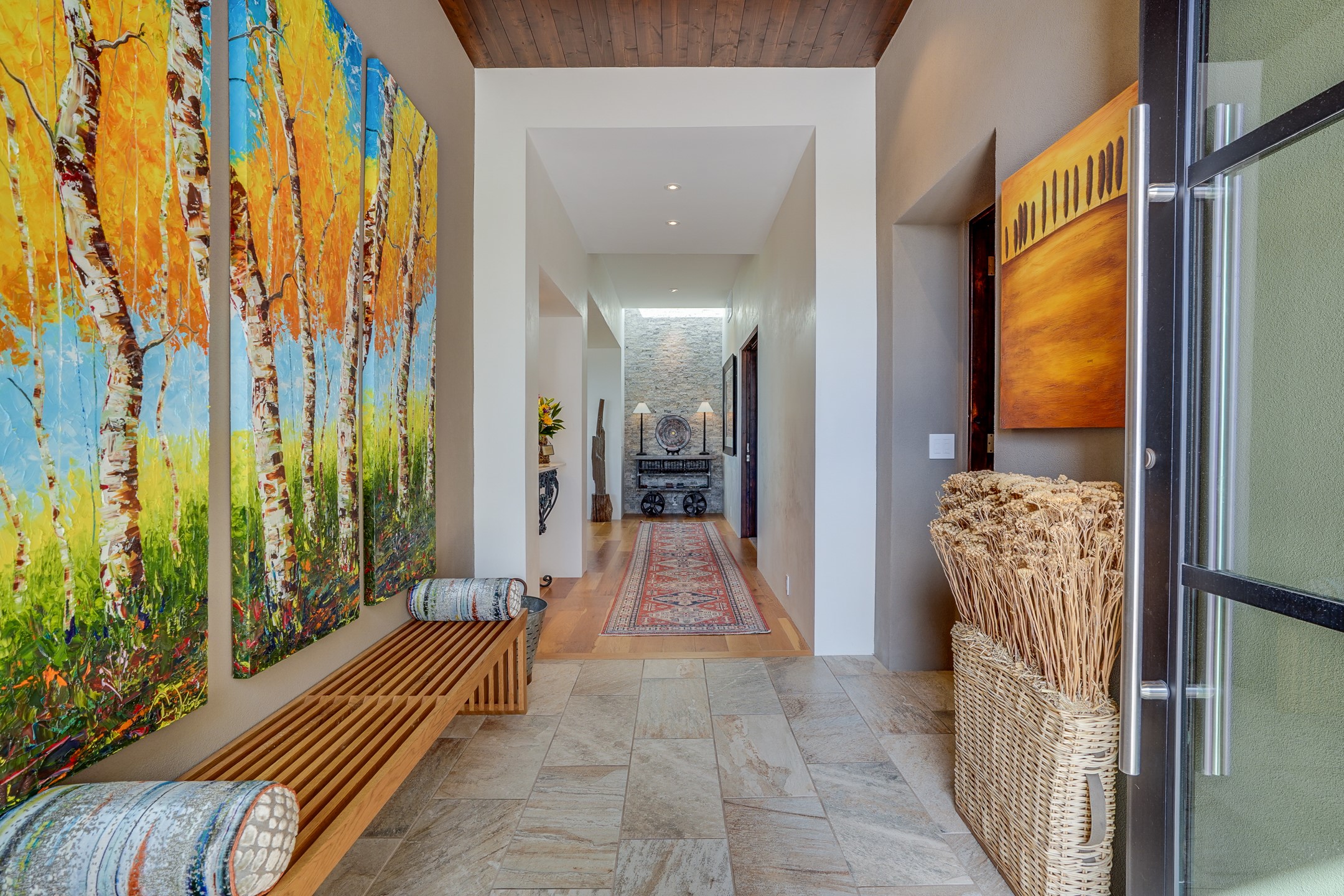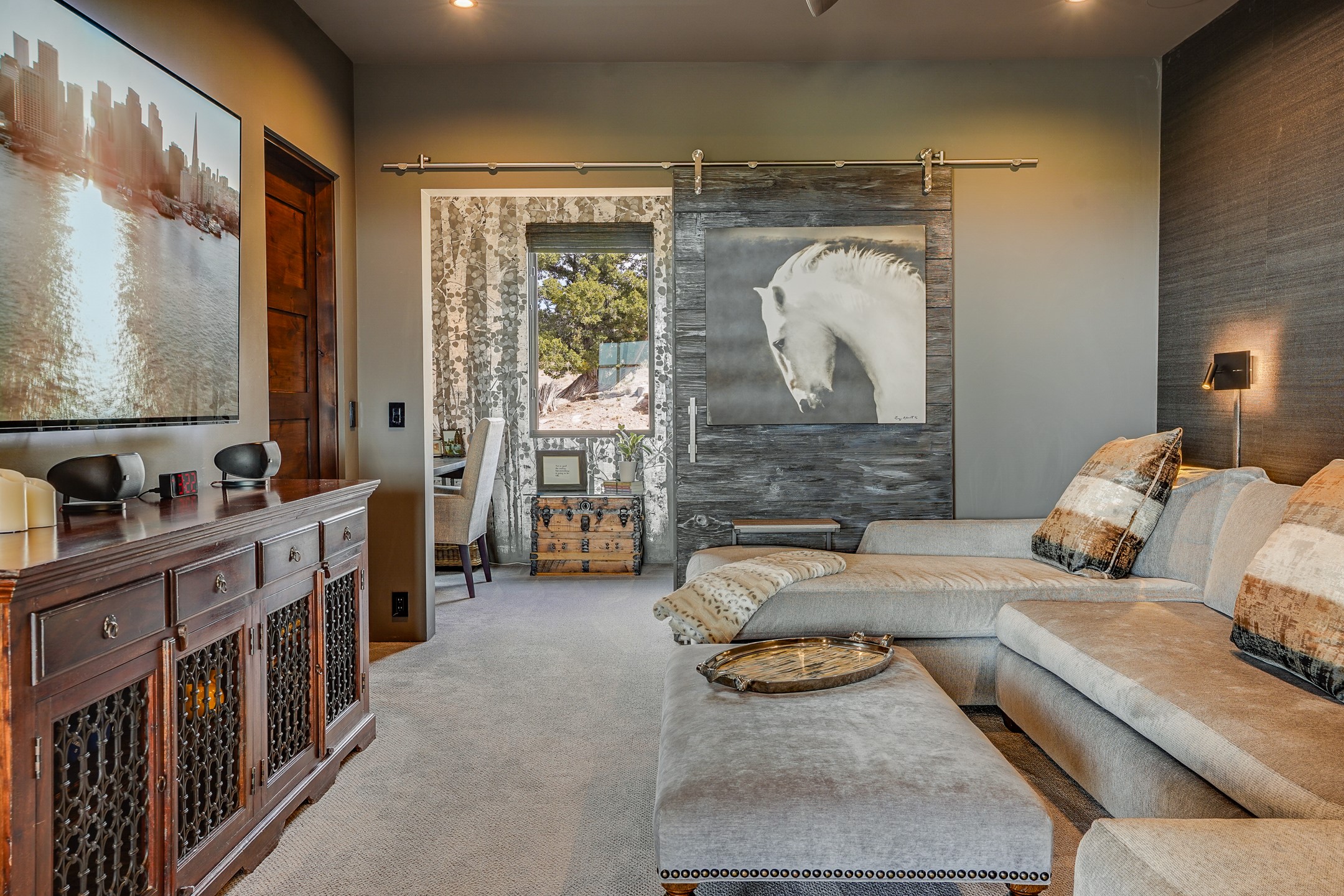 Step into this supremely livable and private, award-winning masterpiece filled with extraordinary features and amazing views just minutes from Las Campanas and town. Modern elegance & comfort await you as you enter this single-level home. Wood, glass & steel blend flawlessly to create an interior space with clean lines & abundant natural light. Amenities of the generous gourmet kitchen include an induction cooktop, dual Fisher & Paykel ovens & refrigerators, 2 dishwashers & 2 sinks, as well as a wine fridge & Scotsman Brilliance nugget ice machine. Remote controlled blinds, Lutron Caseta light switches, a Sonos wired sound system throughout, a Nest temperature system & cameras operated by smartphone or computer enhance further the comfort & livability of this age-in-place home. At the end of the day, enjoy the view as you linger in the luxurious BainUltra soaking tub with air-jet technology. An easily accessible three-car garage with geothermal heating & epoxy floor also houses a woodworking/craft area. Perfectly situated on 2.5 elevated acres with sweeping views of four mountain ranges, the home boasts a gorgeous portal designed for gracious outdoor living & entertaining. Additional charming outdoor areas allow you to relax as you take in the breathtaking vistas & savor the award-winning landscaping that includes two fountains. Winner of the 2021 Parade of Homes Ted Swisher Green Building Award, this stunning home also swept the awards for Best Overall Design, Best Craftsmanship & Best Kitchen. That says it all. Arriving at the magnificent entryway atop the circular drive confirms that this is a smartly designed, luxurious, sophisticated home not to be missed.