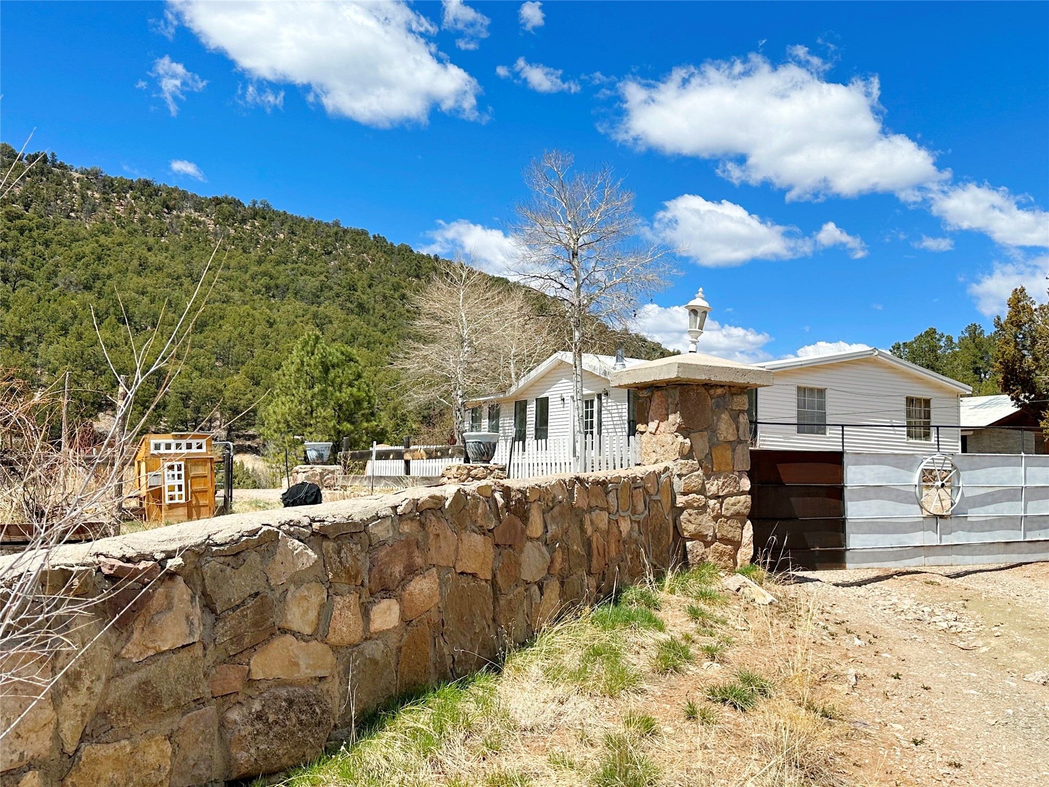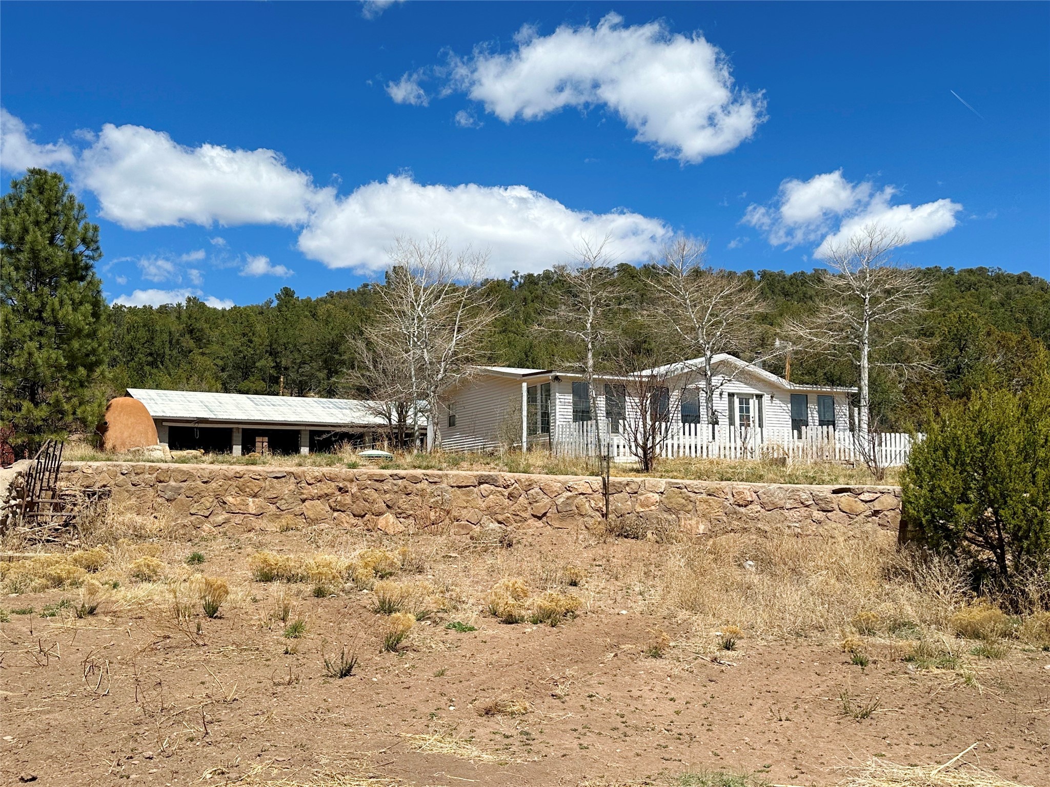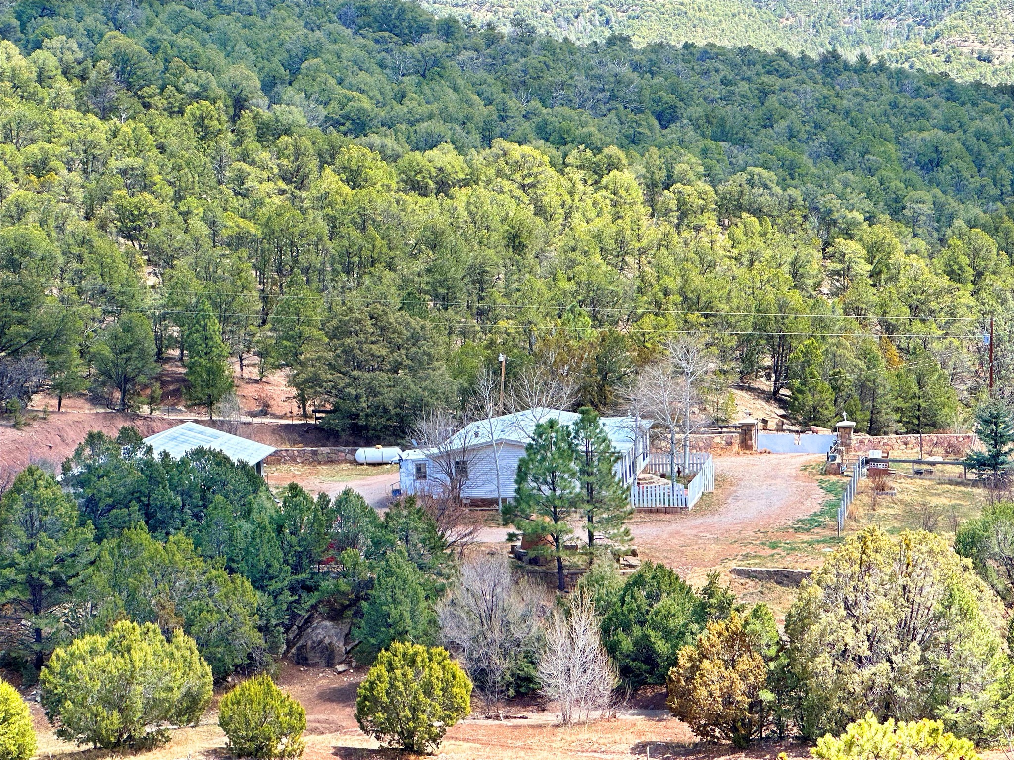 This 27+ acre northern New Mexico homestead features a 3-bed, 2-bath manufactured home, ready for your updates. Recent infrastructure upgrades include a new well pump and updated septic system. Natural water flow is guided by erosion control efforts and engineered drainage that feeds into a small seasonal pond. The property has been lovingly used as a small livestock farm with pens for pigs, goats, and chickens, plus corrals that can accommodate horses. The fenced pasture allows for some rotational grazing (electric fencing may need regular maintenance). A mature grapevine and a young orchard of apple and pear trees near the home offer food production potential, with space for expanded gardening. A large workshop/garage provides excellent storage for vehicles, tools, and ATVs, and includes an electric RV hookup. The acreage rises into a well-maintained pion forest, which has been selectively thinned to provide both grazing and usable timber. The topography is steep in places but accessible from the northern boundary, where a natural shelf offers a potential wooded build site. The property shares a boundary with National Forest and is located near Bull Creek, offering both privacy and direct access to public land. Just 50 minutes from Santa Fe via well-maintained roads, this versatile property is ready for homesteading, recreation, or peaceful rural living with existing agricultural infrastructure and stunning natural surroundings.