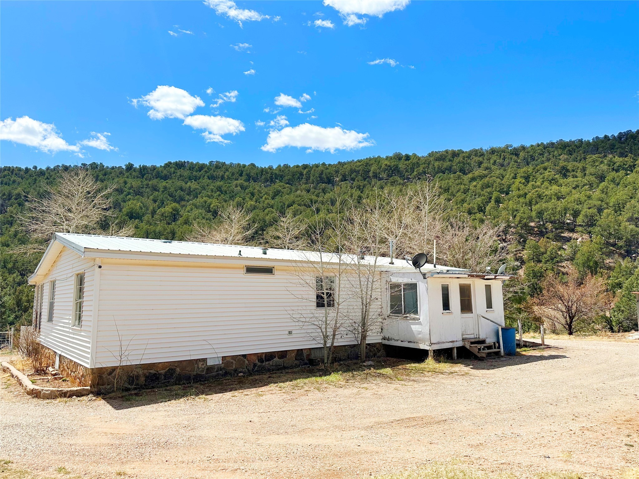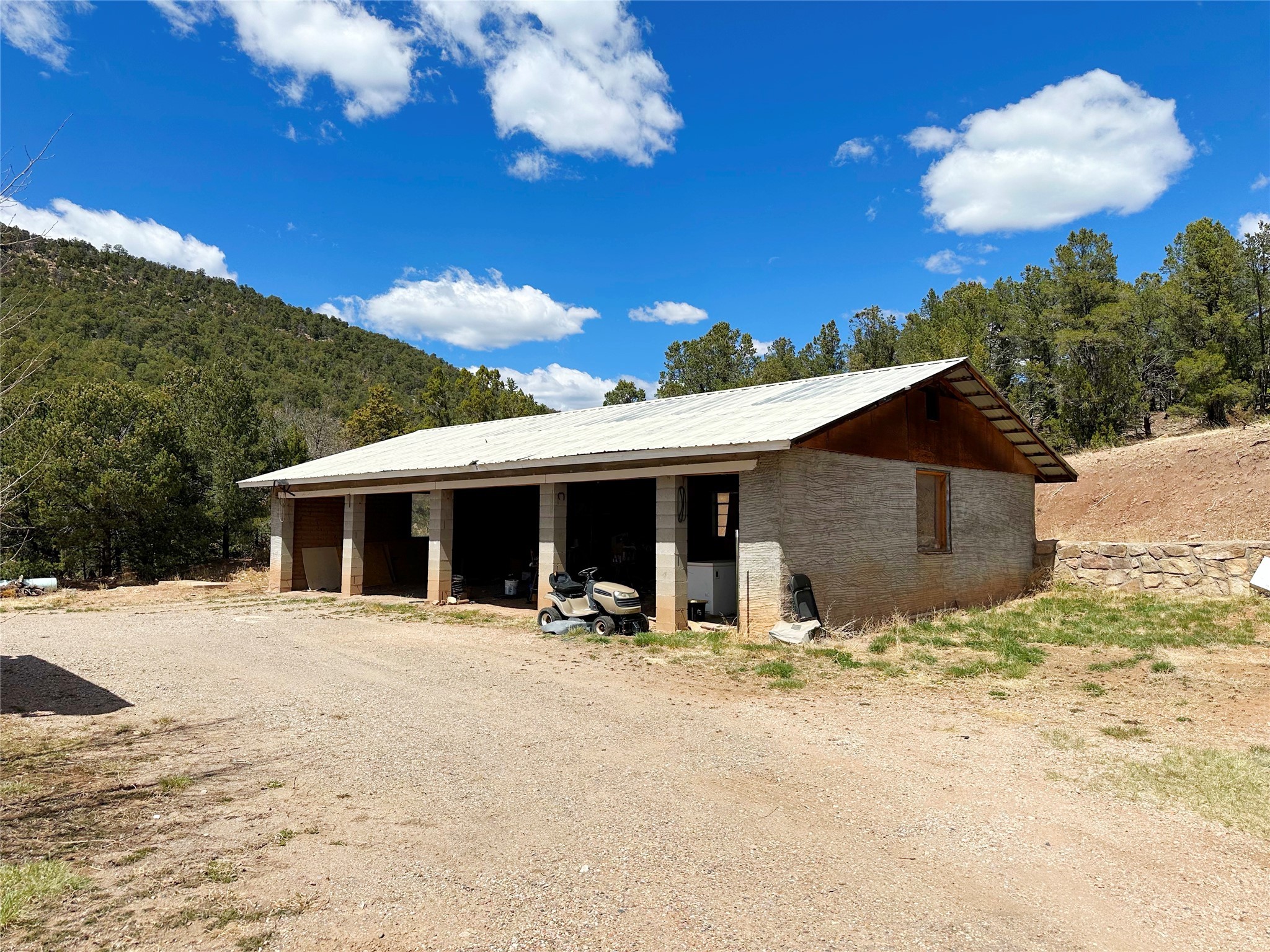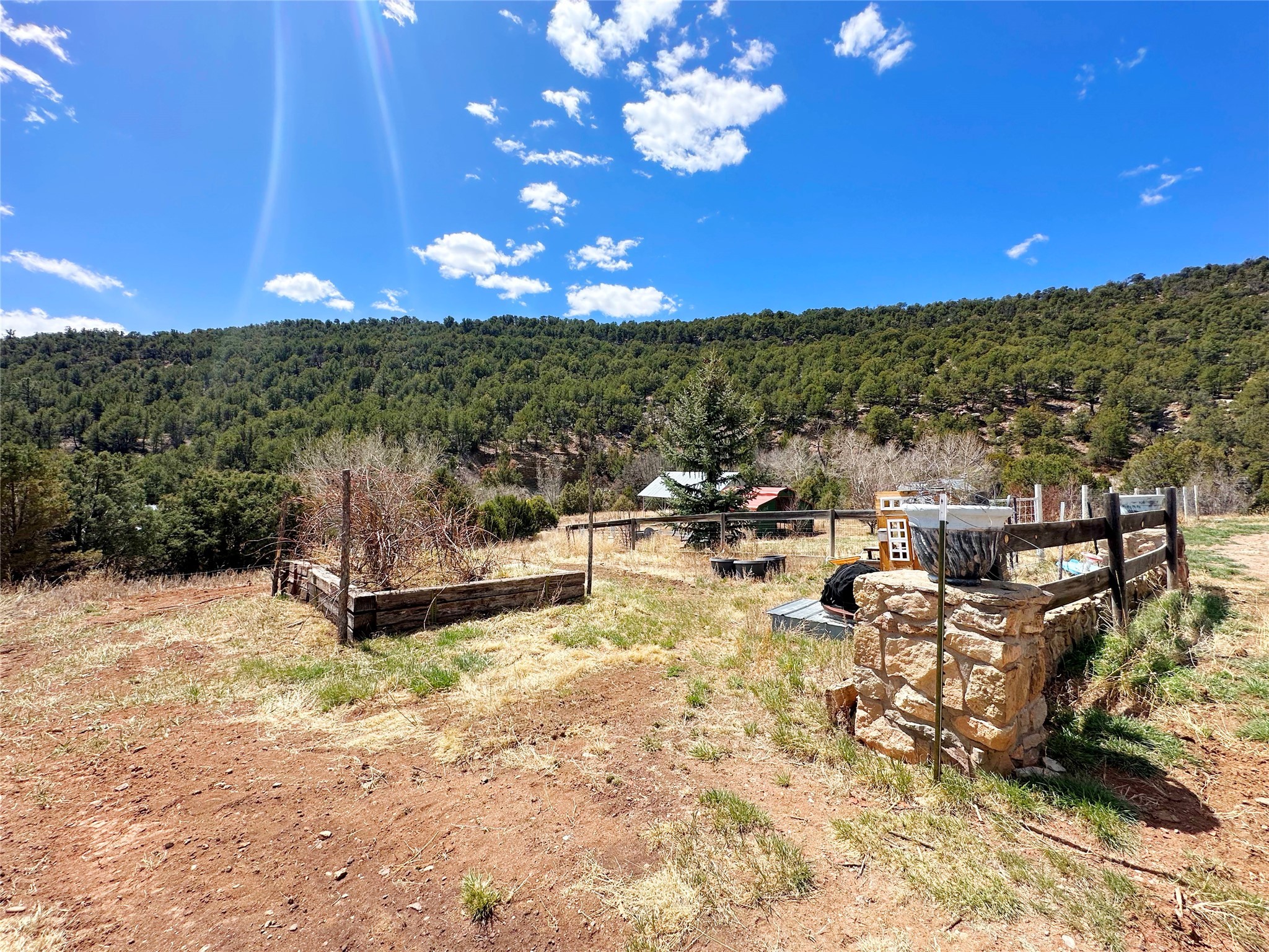 This 27+ acre northern New Mexico homestead features a 3-bed, 2-bath manufactured home, ready for your updates. Recent infrastructure upgrades include a new well pump and updated septic system. Natural water flow is guided by erosion control efforts and engineered drainage that feeds into a small seasonal pond. The property has been lovingly used as a small livestock farm with pens for pigs, goats, and chickens, plus corrals that can accommodate horses. The fenced pasture allows for some rotational grazing (electric fencing may need regular maintenance). A mature grapevine and a young orchard of apple and pear trees near the home offer food production potential, with space for expanded gardening. A large workshop/garage provides excellent storage for vehicles, tools, and ATVs, and includes an electric RV hookup. The acreage rises into a well-maintained pion forest, which has been selectively thinned to provide both grazing and usable timber. The topography is steep in places but accessible from the northern boundary, where a natural shelf offers a potential wooded build site. The property shares a boundary with National Forest and is located near Bull Creek, offering both privacy and direct access to public land. Just 50 minutes from Santa Fe via well-maintained roads, this versatile property is ready for homesteading, recreation, or peaceful rural living with existing agricultural infrastructure and stunning natural surroundings.