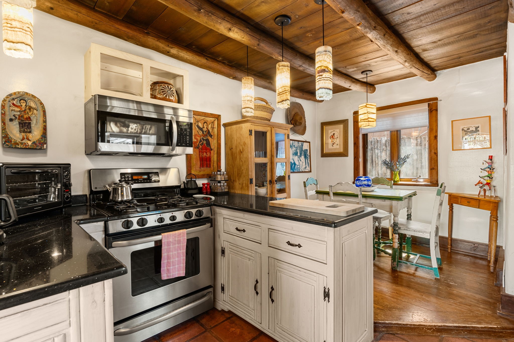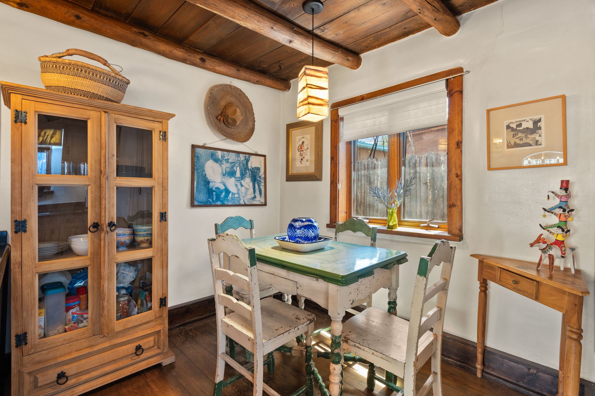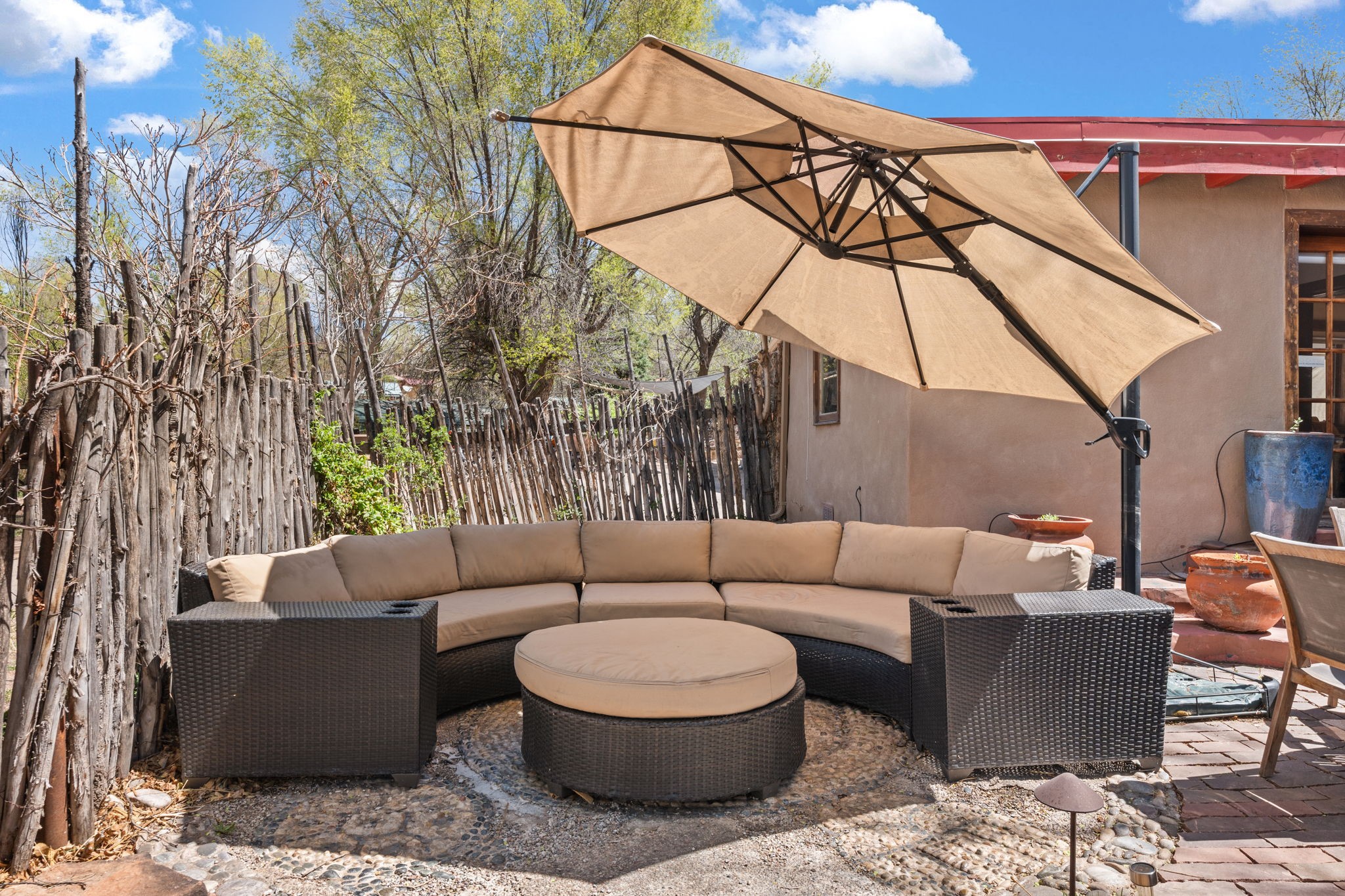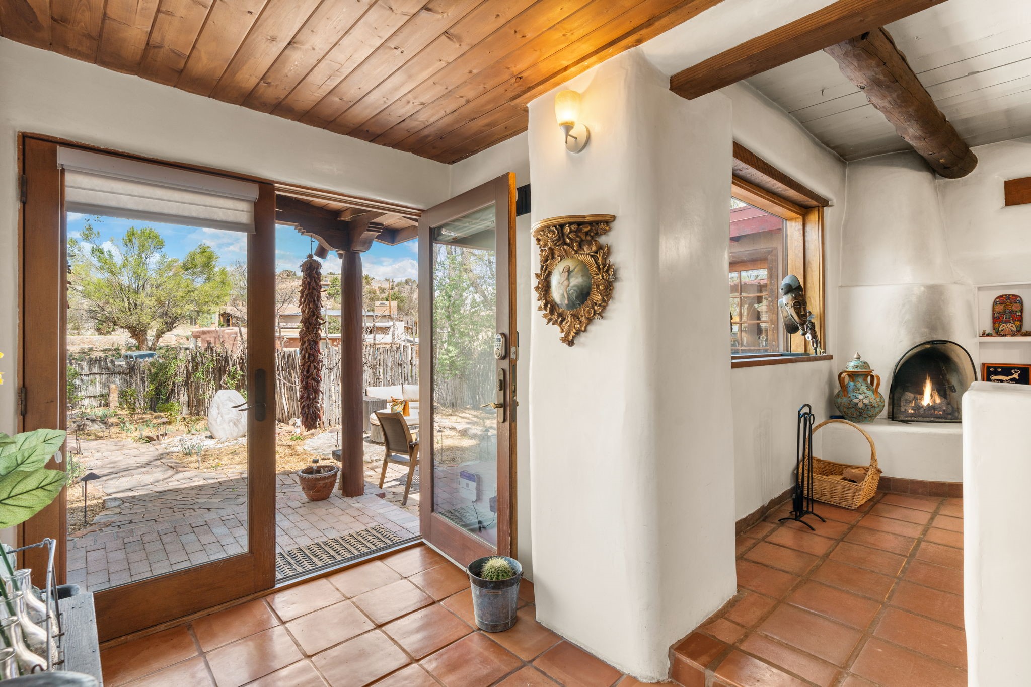 Nestled on a quiet, wooded lane just moments from the beloved Tesuque Market, this enchanting adobe residence, with its metal propanel roof, offers timeless New Mexico charm paired with thoughtful updates and serene outdoor living. A meandering brick pathway, lined with blooming tulips and spring bulbs, leads you from the front gate to a welcoming portal, setting the tone for the beauty that awaits inside. Step through the door and into a world of warmth and authenticity--hand-troweled plaster walls, Saltillo tile floors, and wide plank wood flooring create a rich, textured palette. The living room is a showstopper, infused with character featuring Mesquite wood end cut flooring. Eat-in kitchen area is grounded in history with rare 400-year-old walnut flooring. Coved ceilings with hand-hewn vigas add depth and tradition throughout the home. The sun-filled dining room is the heart of the home, featuring a striking corner Kiva fireplace with a cozy banco, perfect for intimate gatherings or peaceful mornings. A large picture window frames the lush, landscaped gardens like a living painting, making every meal feel like a celebration of nature. Newer windows throughout the home invite natural light while enhancing comfort and efficiency. Outside, your private oasis awaits. A tranquil onyx fountain adds gentle music to the air just below the shaded patio--an ideal setting for both relaxed lounging and al fresco dining. The fully fenced lot offers peace, privacy, and a connection to nature that's hard to find so close to town.This is more than a home--it's a soulful retreat that captures the essence of Tesuque living.