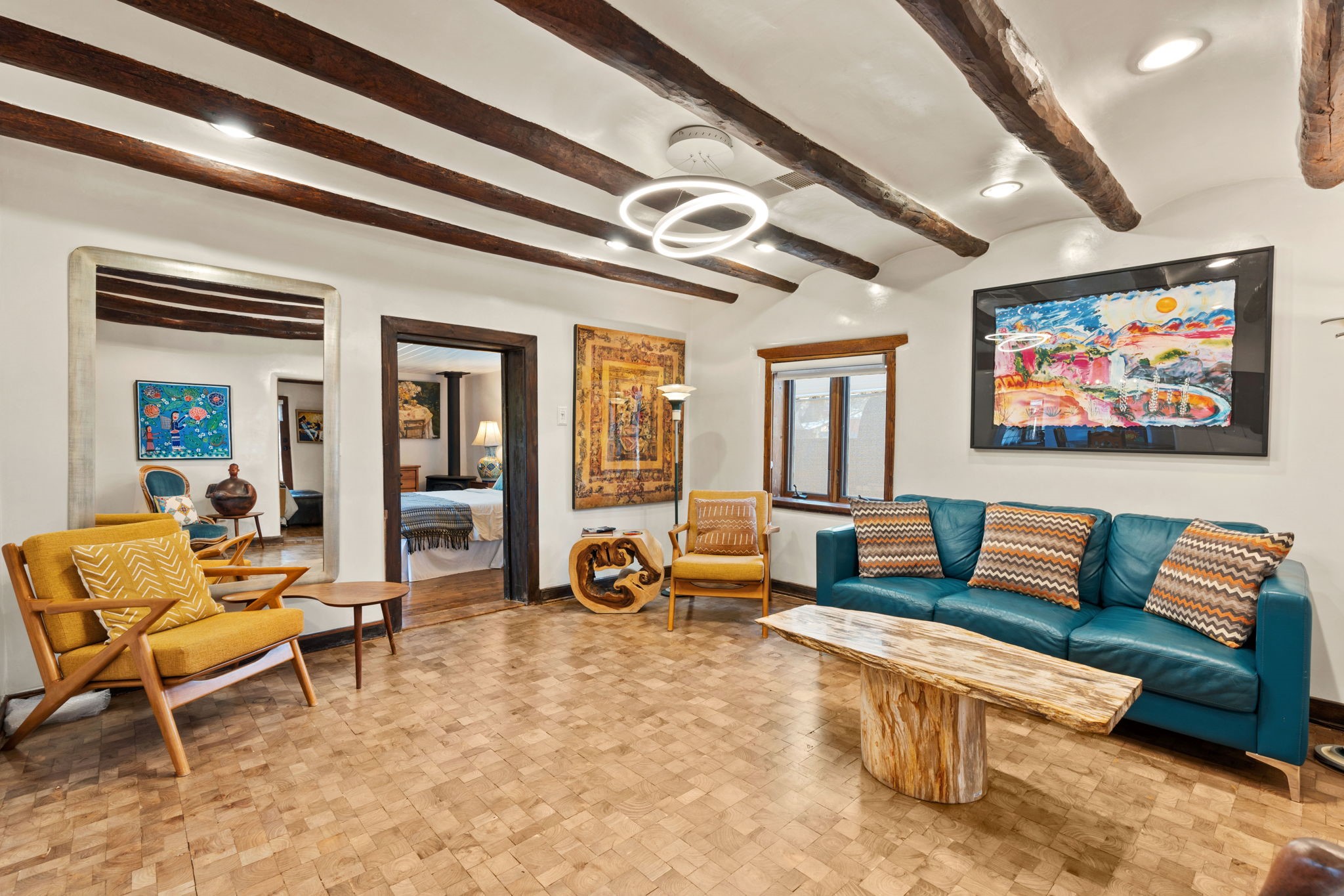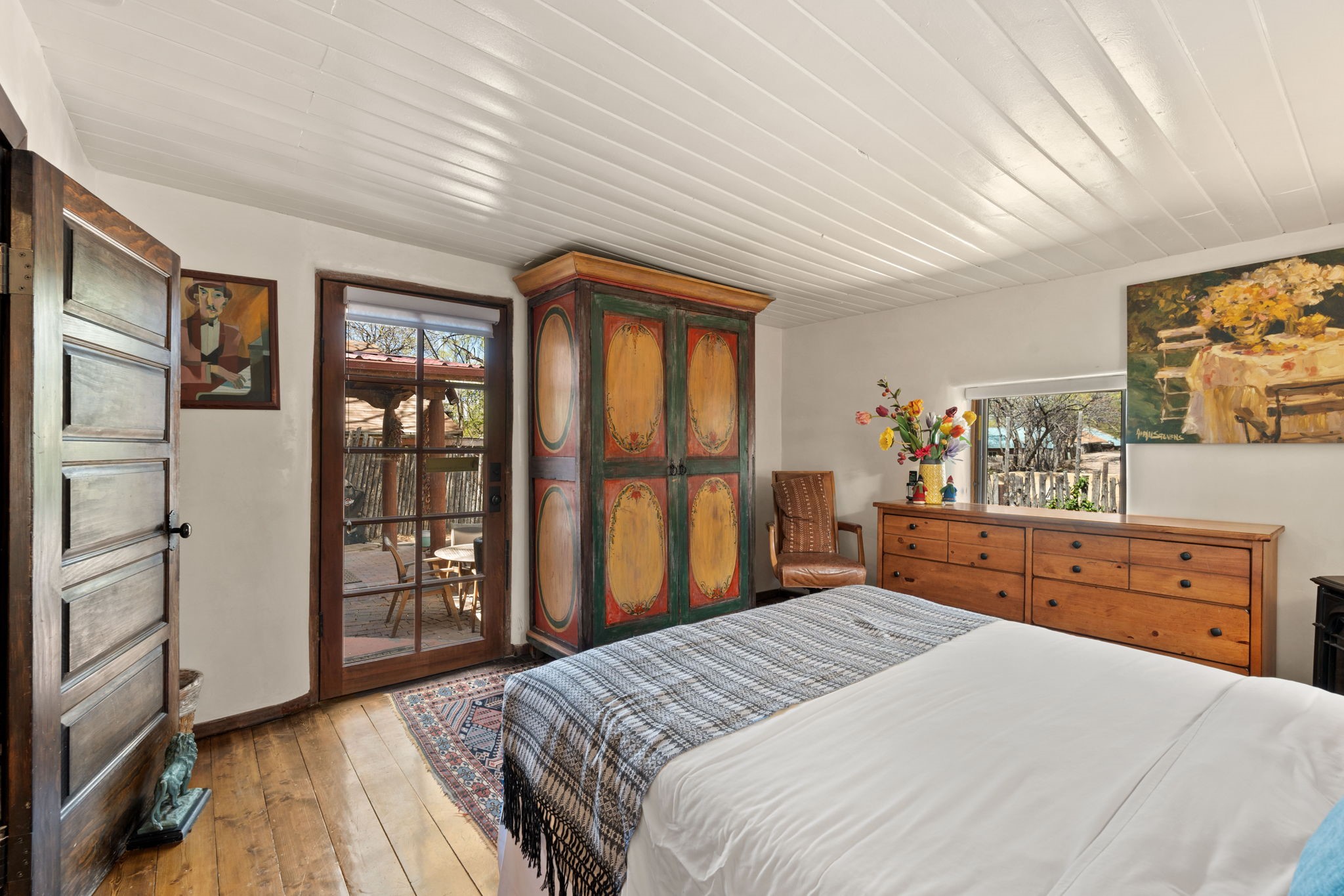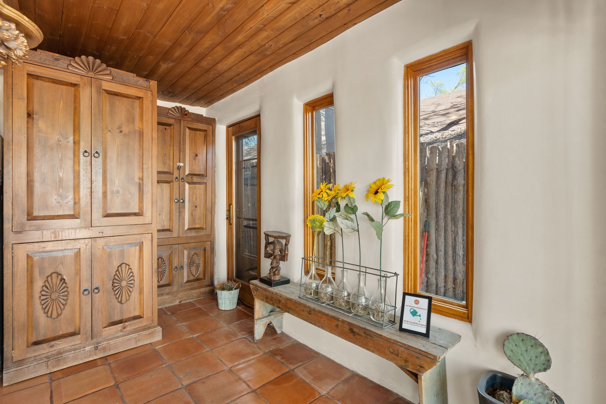 Nestled on a quiet, wooded lane just moments from the beloved Tesuque Market, this enchanting adobe residence, with its metal propanel roof, offers timeless New Mexico charm paired with thoughtful updates and serene outdoor living. A meandering brick pathway, lined with blooming tulips and spring bulbs, leads you from the front gate to a welcoming portal, setting the tone for the beauty that awaits inside. Step through the door and into a world of warmth and authenticity--hand-troweled plaster walls, Saltillo tile floors, and wide plank wood flooring create a rich, textured palette. The living room is a showstopper, infused with character featuring Mesquite wood end cut flooring. Eat-in kitchen area is grounded in history with rare 400-year-old walnut flooring. Coved ceilings with hand-hewn vigas add depth and tradition throughout the home. The sun-filled dining room is the heart of the home, featuring a striking corner Kiva fireplace with a cozy banco, perfect for intimate gatherings or peaceful mornings. A large picture window frames the lush, landscaped gardens like a living painting, making every meal feel like a celebration of nature. Newer windows throughout the home invite natural light while enhancing comfort and efficiency. Outside, your private oasis awaits. A tranquil onyx fountain adds gentle music to the air just below the shaded patio--an ideal setting for both relaxed lounging and al fresco dining. The fully fenced lot offers peace, privacy, and a connection to nature that's hard to find so close to town.This is more than a home--it's a soulful retreat that captures the essence of Tesuque living.