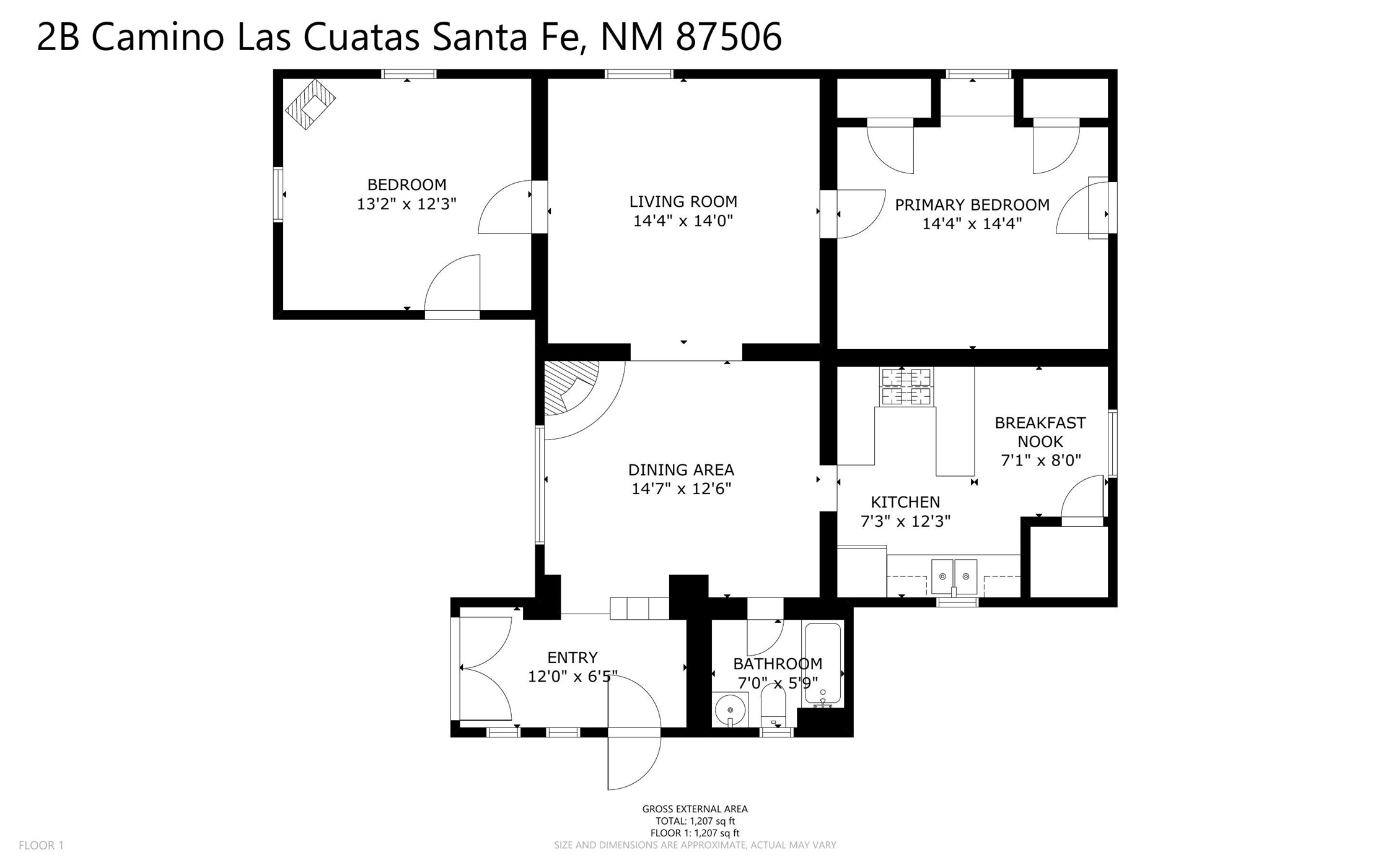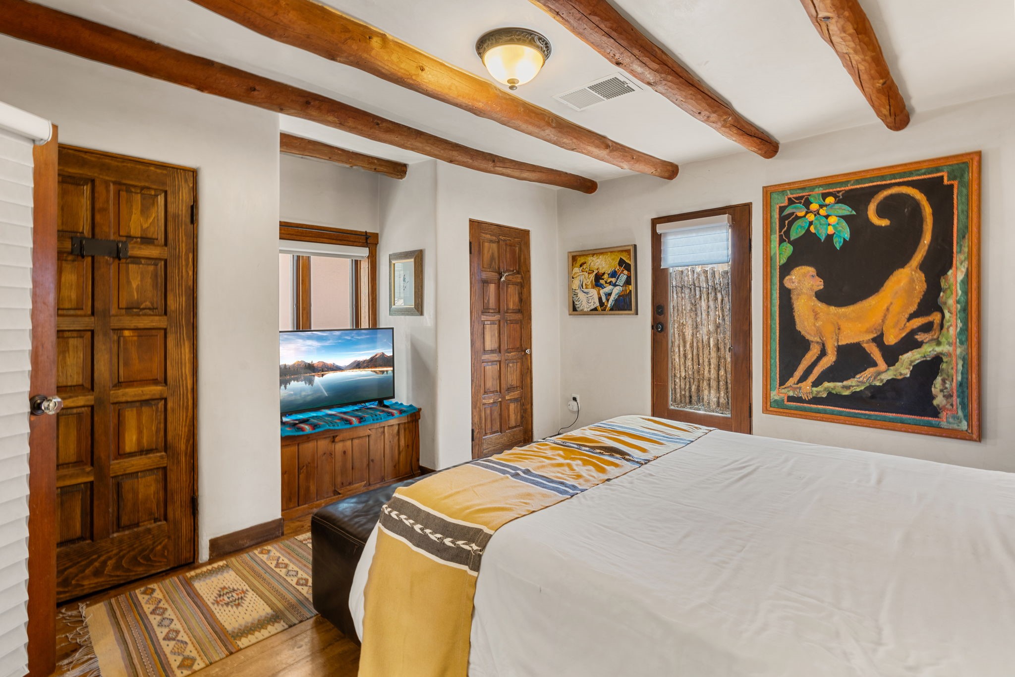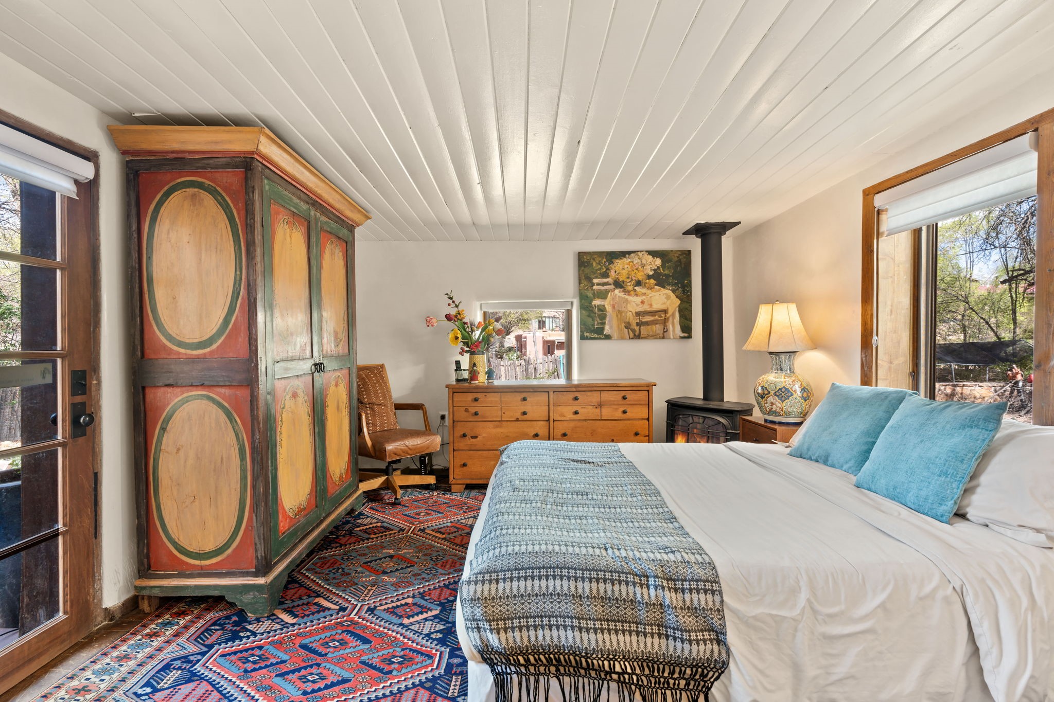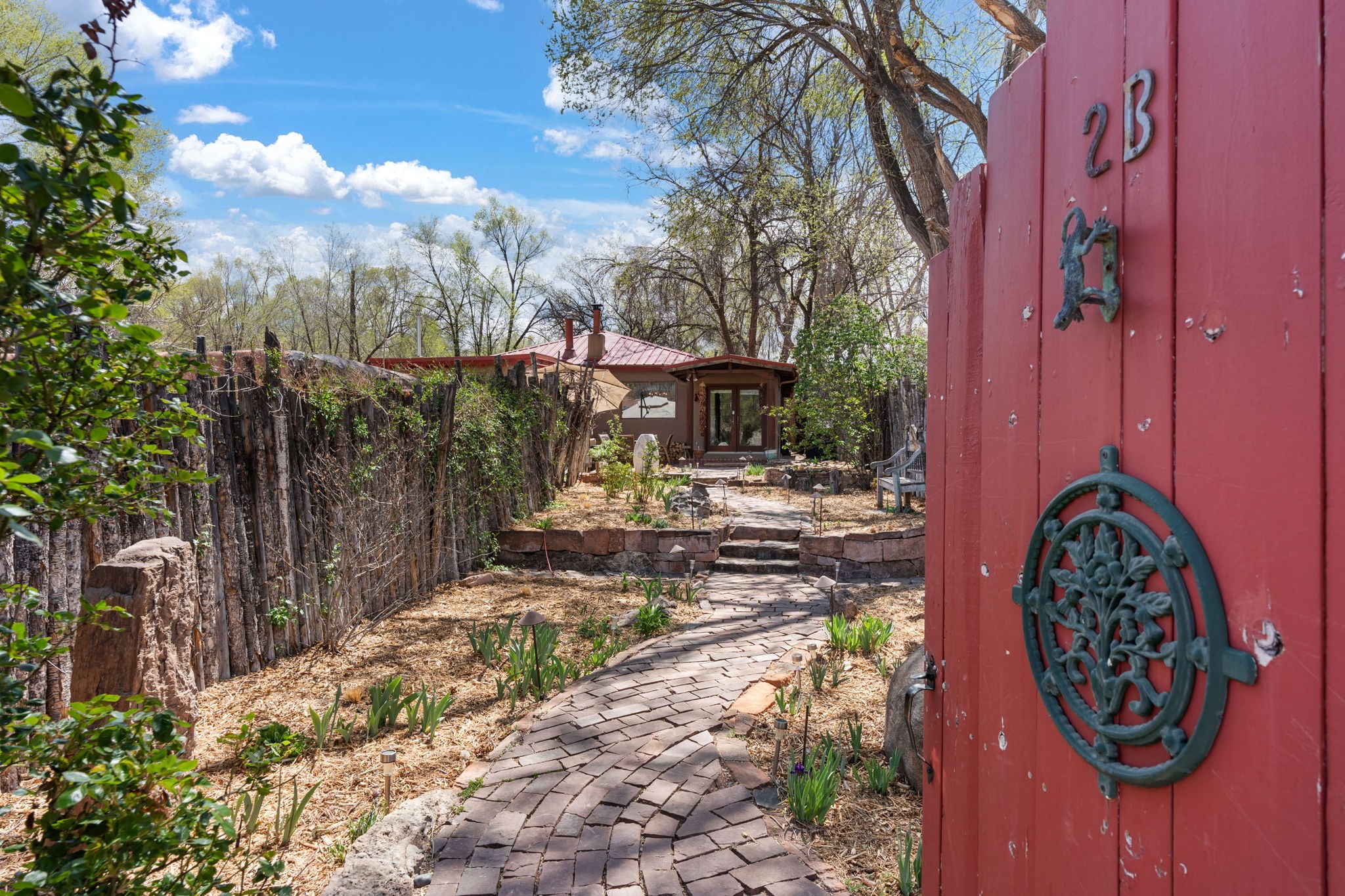 Nestled on a quiet, wooded lane just moments from the beloved Tesuque Market, this enchanting adobe residence, with its metal propanel roof, offers timeless New Mexico charm paired with thoughtful updates and serene outdoor living. A meandering brick pathway, lined with blooming tulips and spring bulbs, leads you from the front gate to a welcoming portal, setting the tone for the beauty that awaits inside. Step through the door and into a world of warmth and authenticity--hand-troweled plaster walls, Saltillo tile floors, and wide plank wood flooring create a rich, textured palette. The living room is a showstopper, infused with character featuring Mesquite wood end cut flooring. Eat-in kitchen area is grounded in history with rare 400-year-old walnut flooring. Coved ceilings with hand-hewn vigas add depth and tradition throughout the home. The sun-filled dining room is the heart of the home, featuring a striking corner Kiva fireplace with a cozy banco, perfect for intimate gatherings or peaceful mornings. A large picture window frames the lush, landscaped gardens like a living painting, making every meal feel like a celebration of nature. Newer windows throughout the home invite natural light while enhancing comfort and efficiency. Outside, your private oasis awaits. A tranquil onyx fountain adds gentle music to the air just below the shaded patio--an ideal setting for both relaxed lounging and al fresco dining. The fully fenced lot offers peace, privacy, and a connection to nature that's hard to find so close to town.This is more than a home--it's a soulful retreat that captures the essence of Tesuque living.