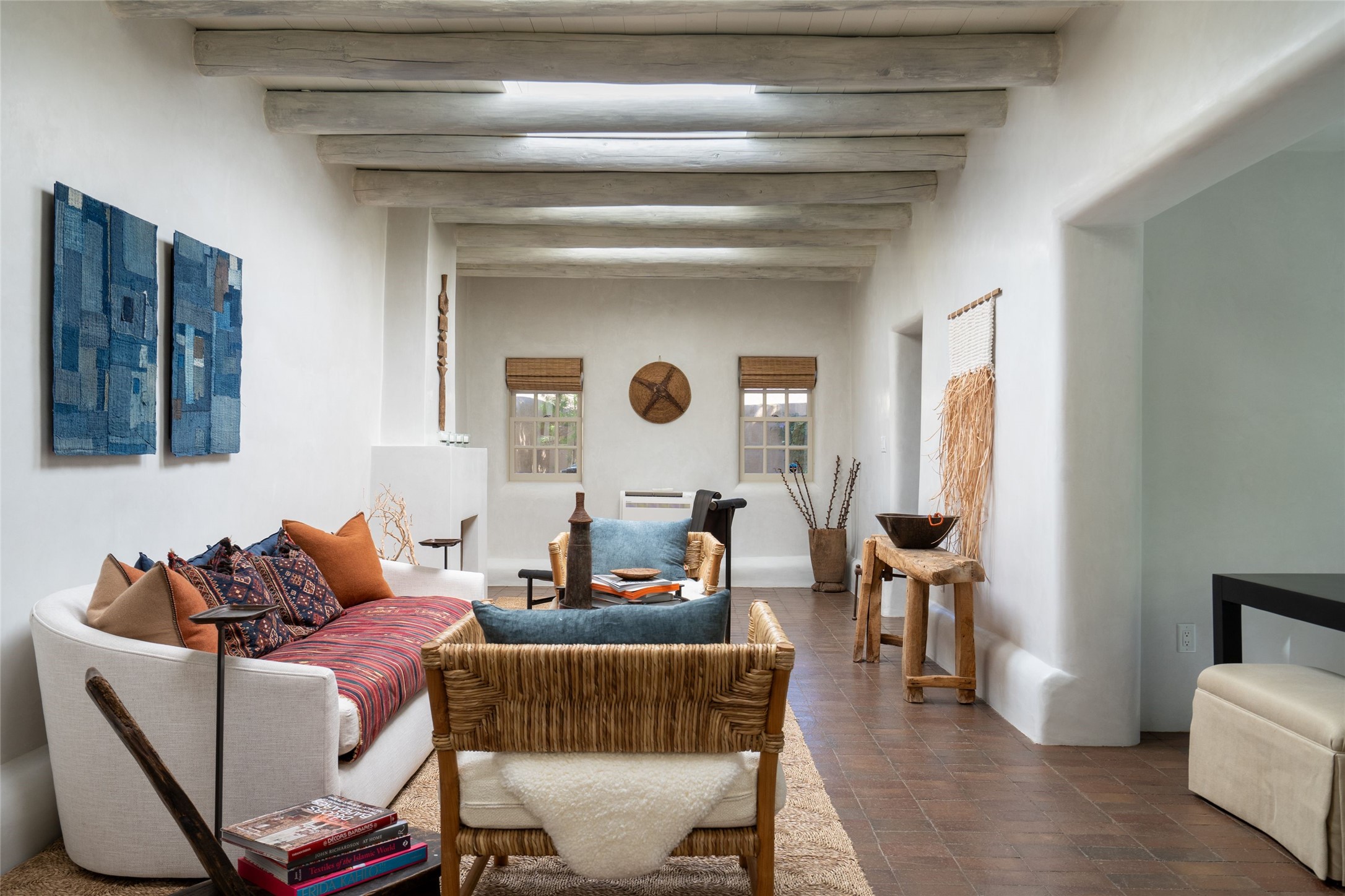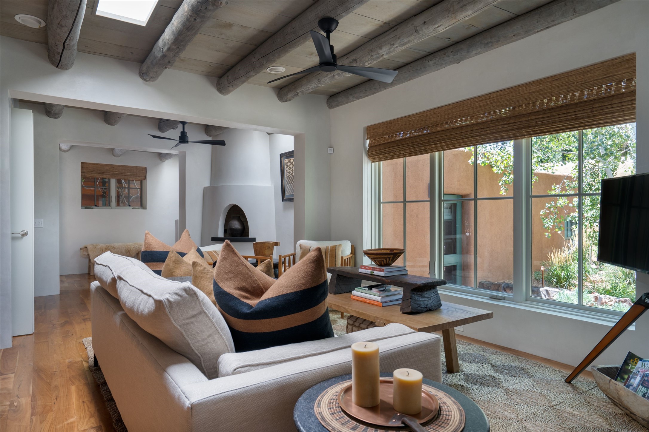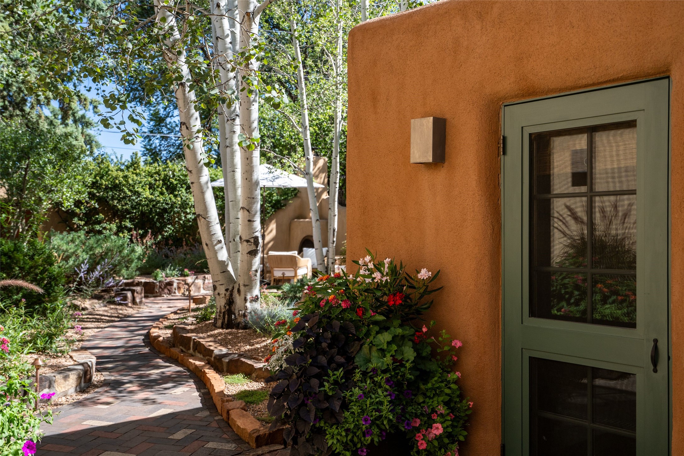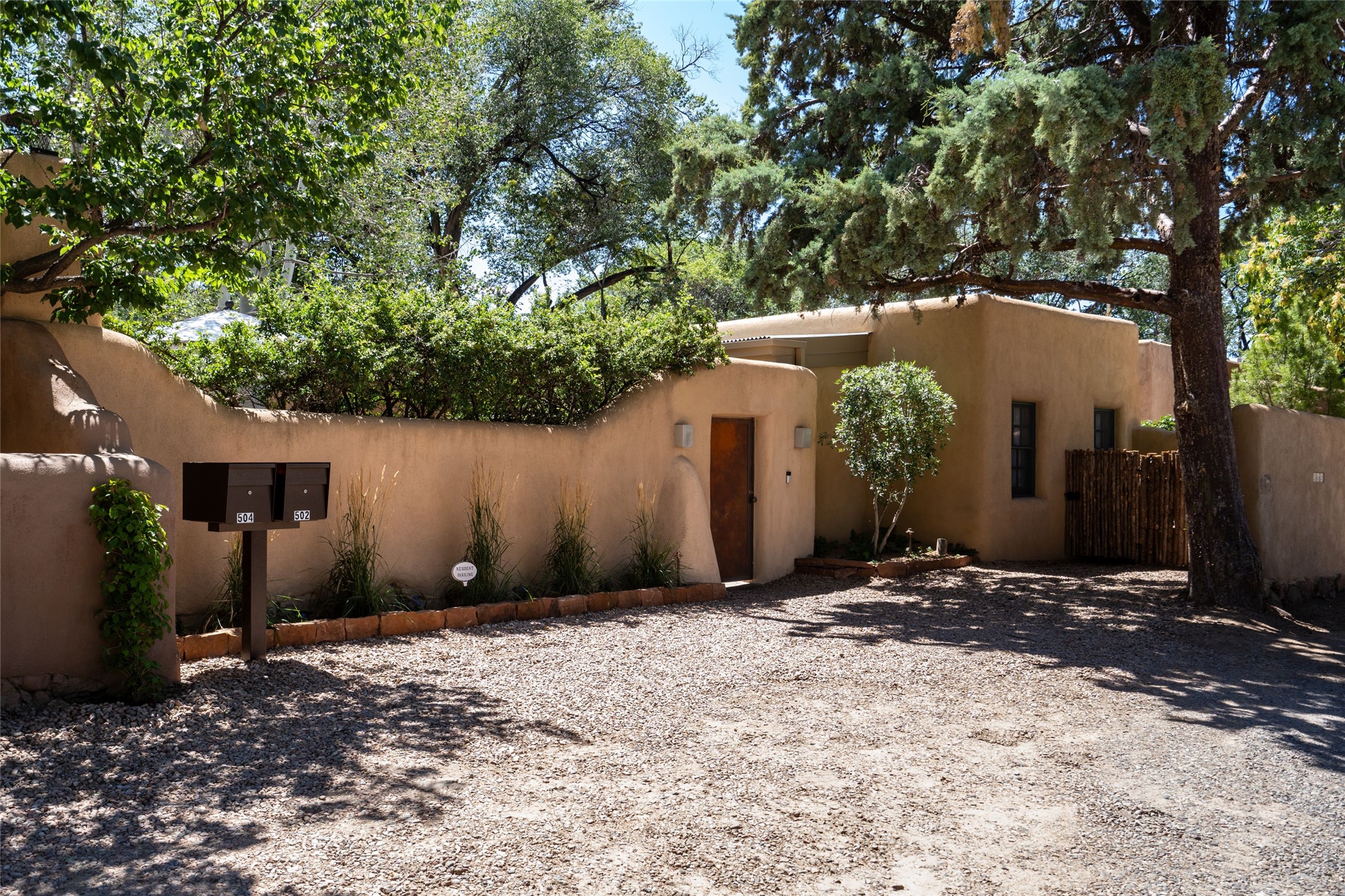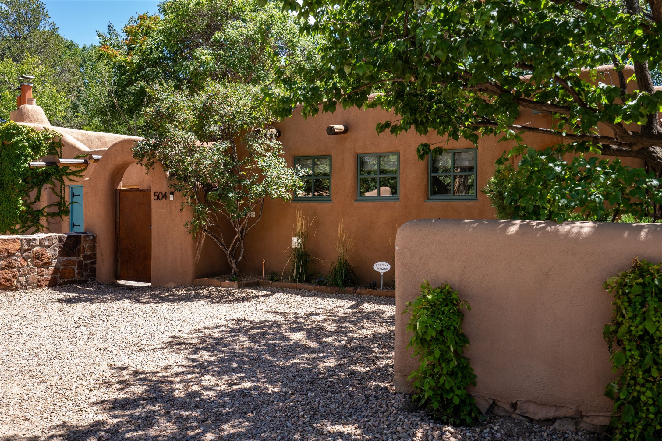Recently renovated Pueblo-style compound that captures the spirit of Santa Fe in the heart of the coveted Historic Eastside. As you enter this enchanting property, you are greeted by a beautifully landscaped courtyard, a tranquil escape with multiple seating areas, perfect for indulging in quiet moments or lively gatherings. The property exudes old-world charm, featuring five wood-burning fireplaces, traditional vigas and beams, and a delightful mix of brick, tile, and wood floors that create a warm and welcoming atmosphere. The 1,521 sq. ft. main house offers 2 spacious bedrooms and 2.5 elegantly appointed baths. 2 dedicated parking spots lead to a private entrance. The thoughtfully remodeled interior showcases a redesigned kitchen that is both functional and exquisite, featuring custom cabinetry and high-end appliances. New primary suite is adorned with reclaimed terracotta Giallo-style tile, a chic wet bar, and a sophisticated Domingue waterproof plaster bath. Additionally, there is a rare finished 554 sq. ft. basement. Complementing the main residence is a charming 1,216 sq. ft. guesthouse. This newly renovated space features two parking spots and a gated entrance. With its open-concept design and skylights, the guesthouse is bathed in natural light, creating a bright and airy ambiance. Ideally located, just moments away from Downtown Subscription, a local coffee house and gathering spot, as well as Canyon Road, Kakawa Chocolate, and Kaune's Neighborhood Market