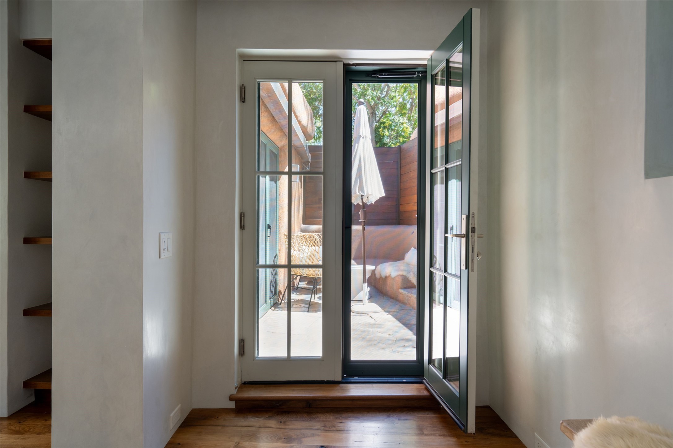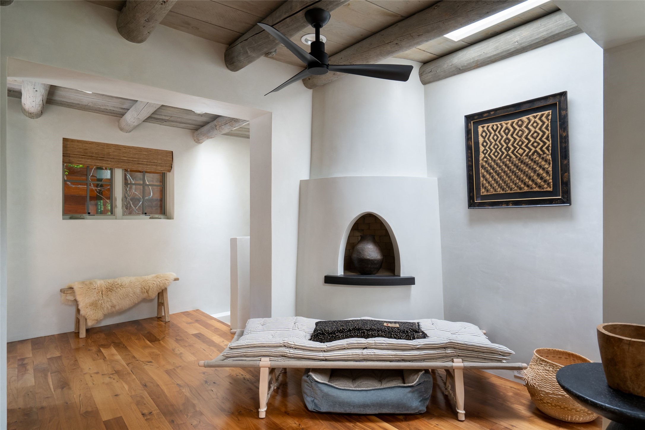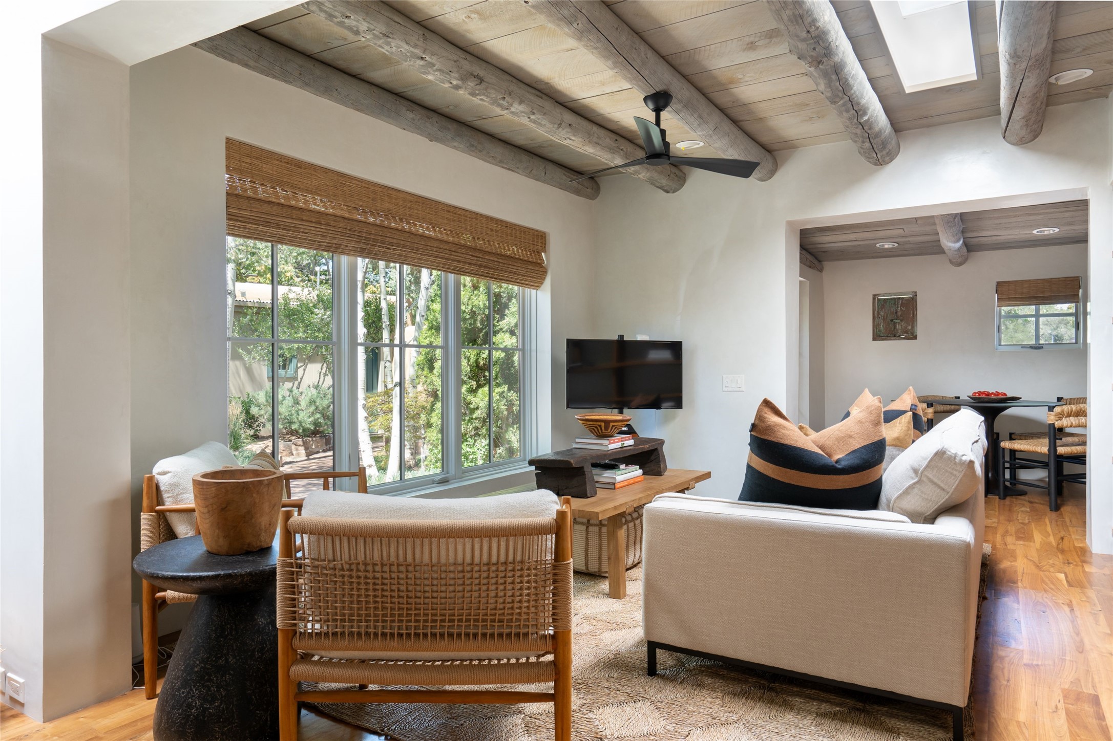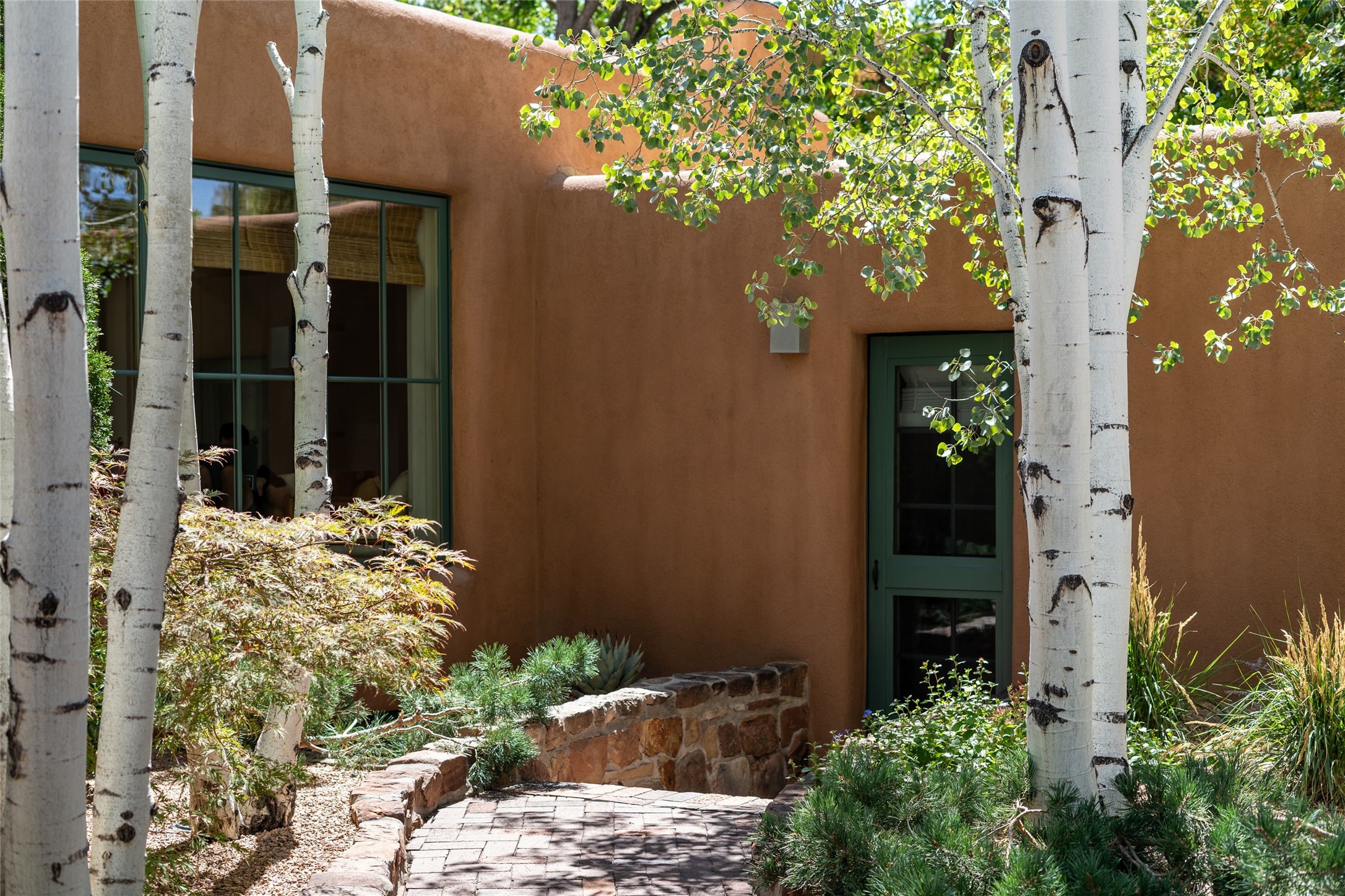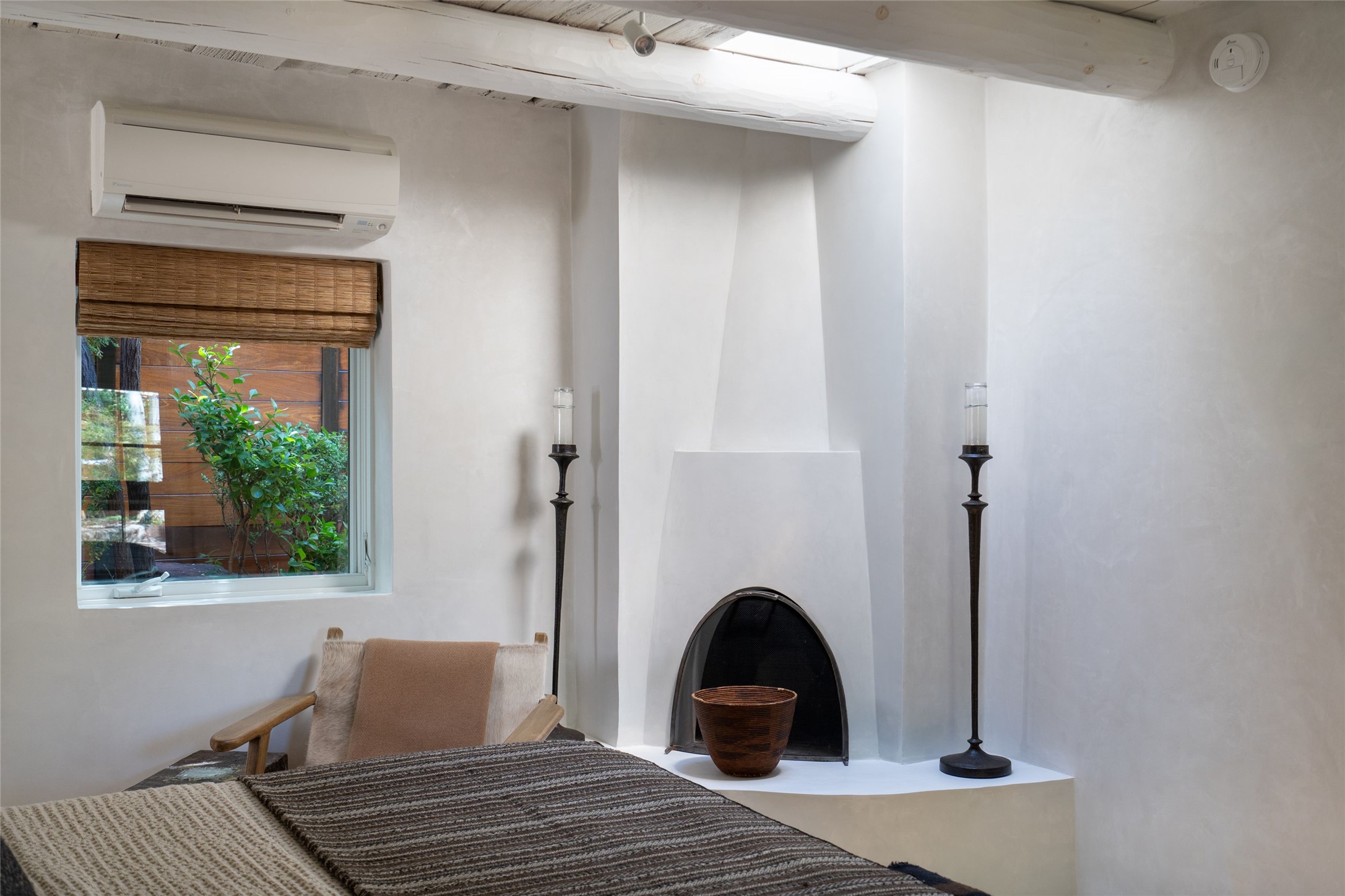 Recently renovated Pueblo-style compound that captures the spirit of Santa Fe in the heart of the coveted Historic Eastside. As you enter this enchanting property, you are greeted by a beautifully landscaped courtyard, a tranquil escape with multiple seating areas, perfect for indulging in quiet moments or lively gatherings. The property exudes old-world charm, featuring five wood-burning fireplaces, traditional vigas and beams, and a delightful mix of brick, tile, and wood floors that create a warm and welcoming atmosphere. The 1,521 sq. ft. main house offers 2 spacious bedrooms and 2.5 elegantly appointed baths. 2 dedicated parking spots lead to a private entrance. The thoughtfully remodeled interior showcases a redesigned kitchen that is both functional and exquisite, featuring custom cabinetry and high-end appliances. New primary suite is adorned with reclaimed terracotta Giallo-style tile, a chic wet bar, and a sophisticated Domingue waterproof plaster bath. Additionally, there is a rare finished 554 sq. ft. basement. Complementing the main residence is a charming 1,216 sq. ft. guesthouse. This newly renovated space features two parking spots and a gated entrance. With its open-concept design and skylights, the guesthouse is bathed in natural light, creating a bright and airy ambiance. Ideally located, just moments away from Downtown Subscription, a local coffee house and gathering spot, as well as Canyon Road, Kakawa Chocolate, and Kaune's Neighborhood Market