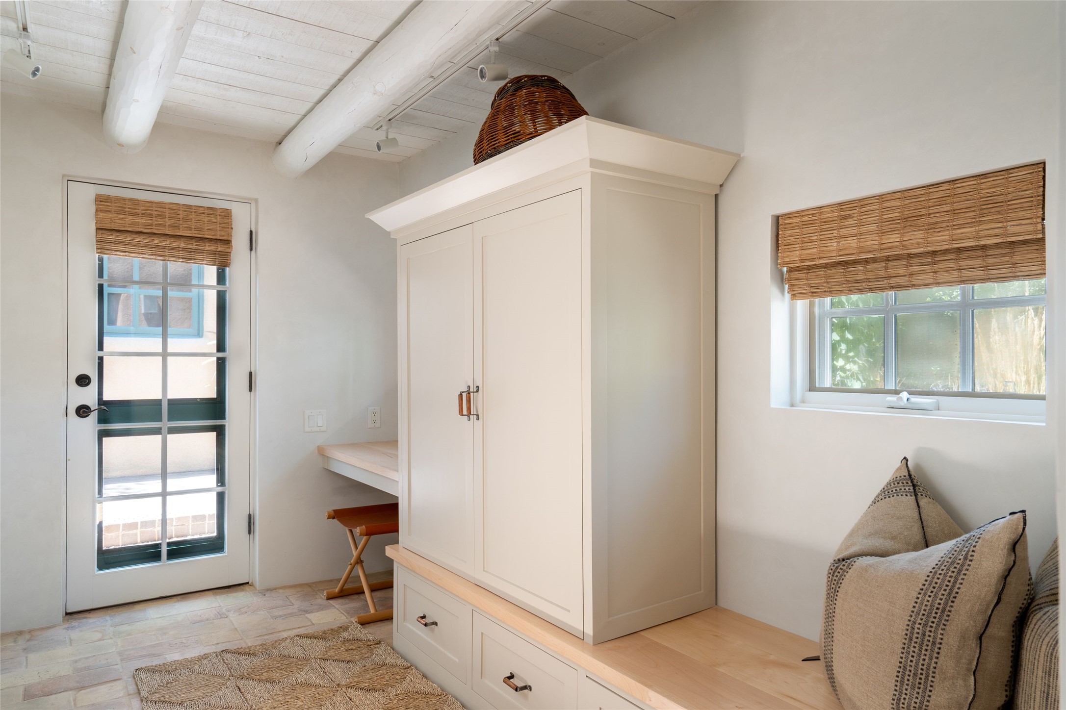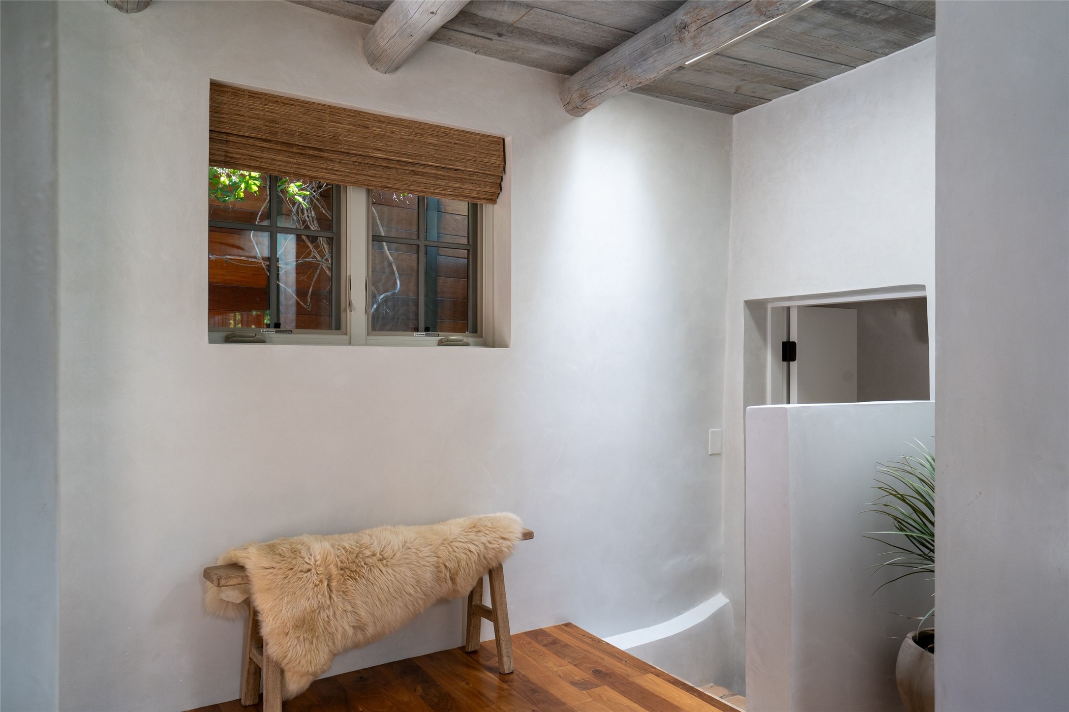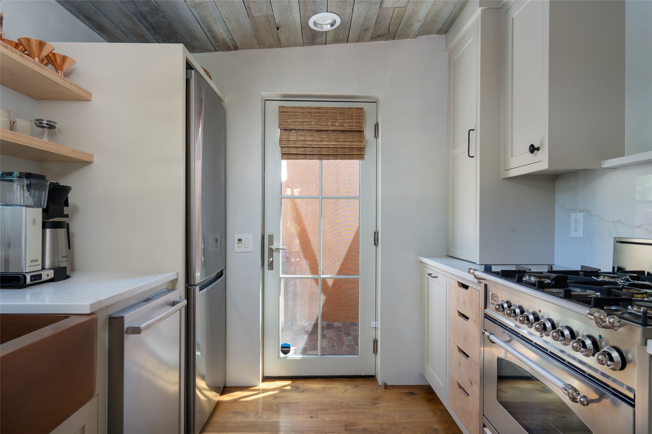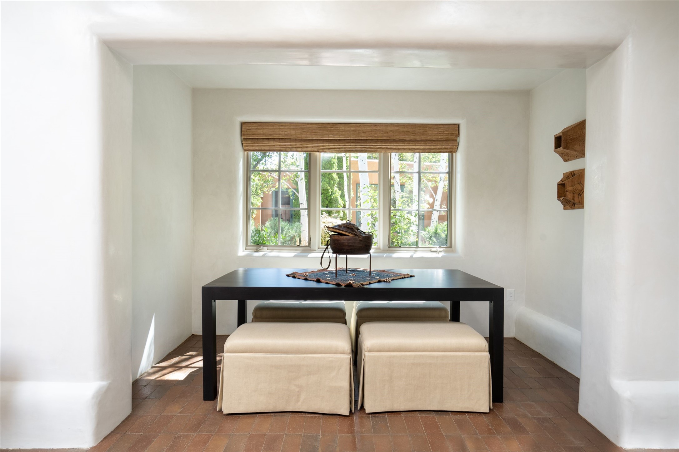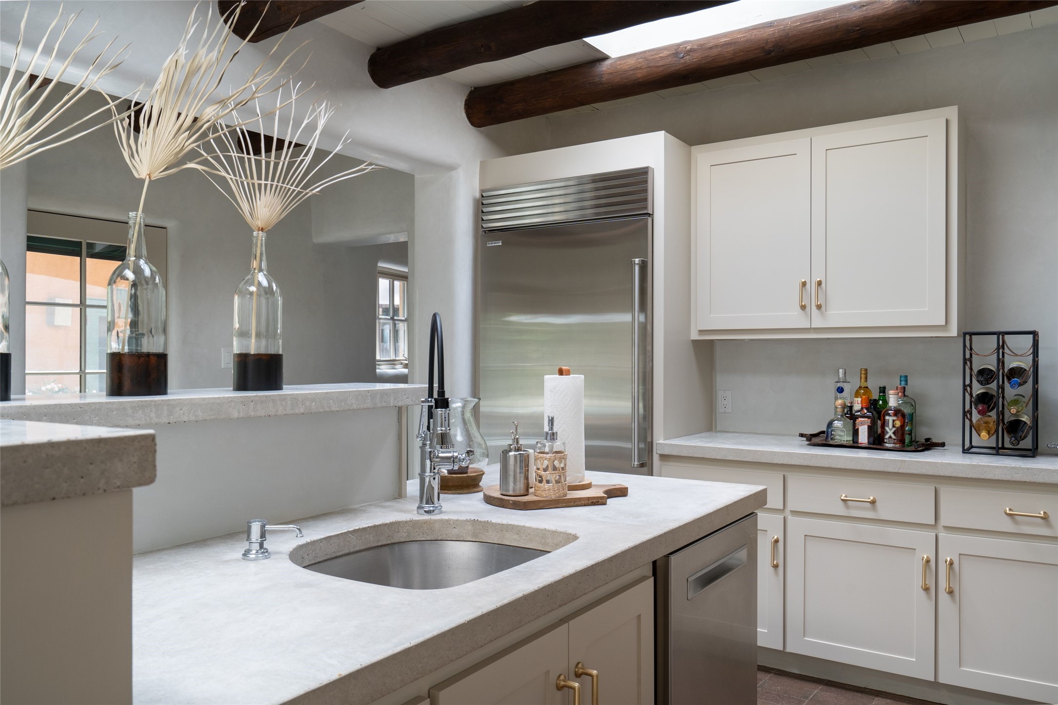 Recently renovated Pueblo-style compound that captures the spirit of Santa Fe in the heart of the coveted Historic Eastside. As you enter this enchanting property, you are greeted by a beautifully landscaped courtyard, a tranquil escape with multiple seating areas, perfect for indulging in quiet moments or lively gatherings. The property exudes old-world charm, featuring five wood-burning fireplaces, traditional vigas and beams, and a delightful mix of brick, tile, and wood floors that create a warm and welcoming atmosphere. The 1,521 sq. ft. main house offers 2 spacious bedrooms and 2.5 elegantly appointed baths. 2 dedicated parking spots lead to a private entrance. The thoughtfully remodeled interior showcases a redesigned kitchen that is both functional and exquisite, featuring custom cabinetry and high-end appliances. New primary suite is adorned with reclaimed terracotta Giallo-style tile, a chic wet bar, and a sophisticated Domingue waterproof plaster bath. Additionally, there is a rare finished 554 sq. ft. basement. Complementing the main residence is a charming 1,216 sq. ft. guesthouse. This newly renovated space features two parking spots and a gated entrance. With its open-concept design and skylights, the guesthouse is bathed in natural light, creating a bright and airy ambiance. Ideally located, just moments away from Downtown Subscription, a local coffee house and gathering spot, as well as Canyon Road, Kakawa Chocolate, and Kaune's Neighborhood Market