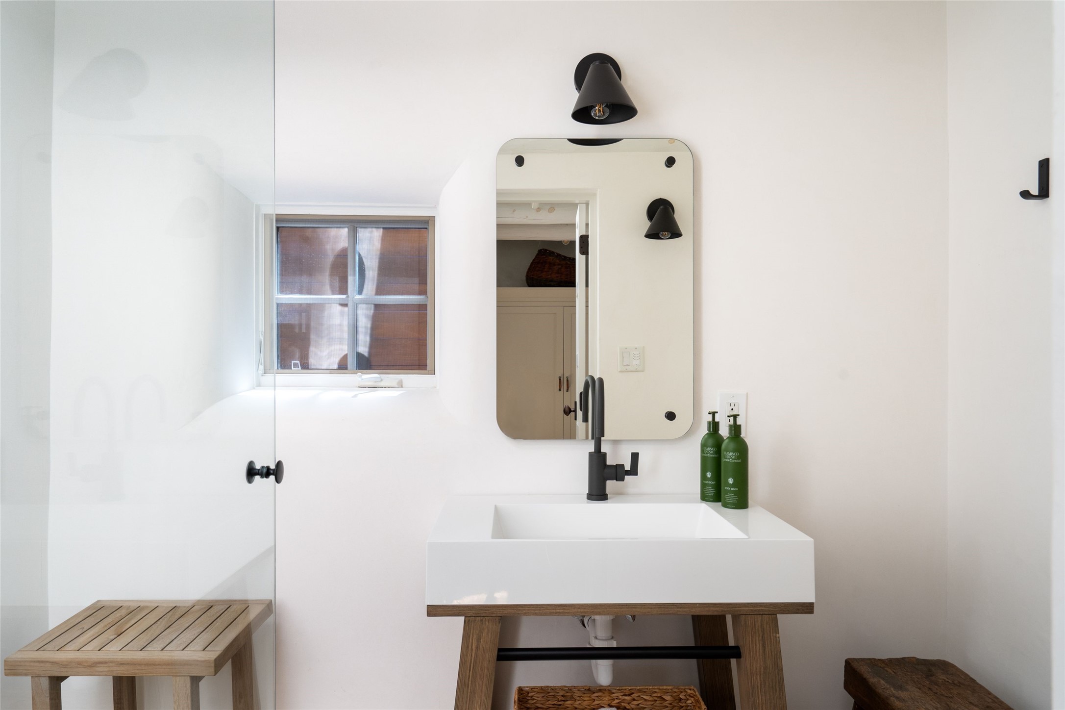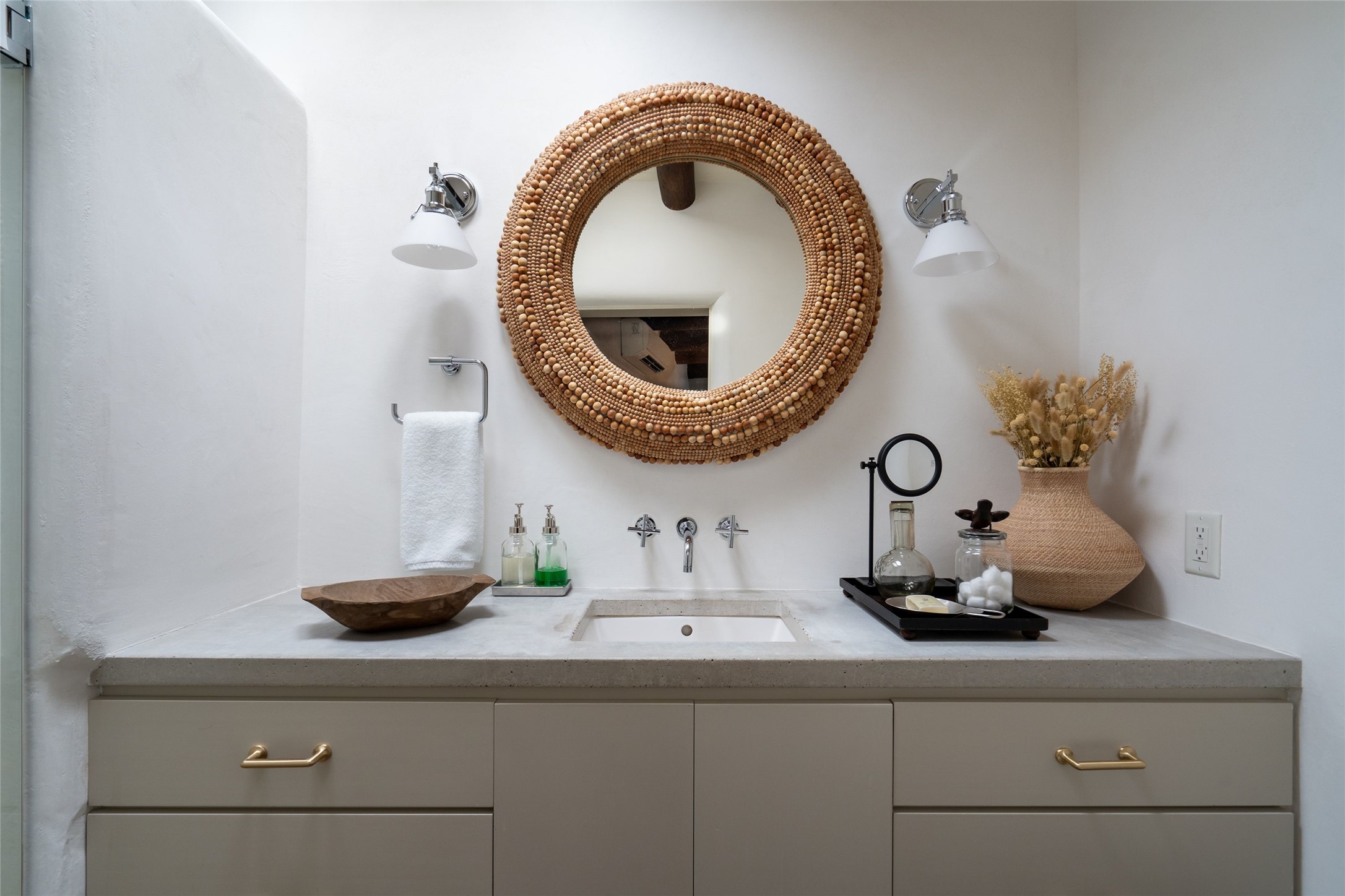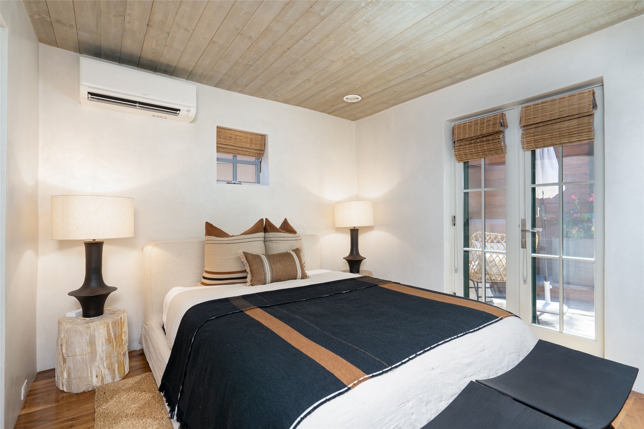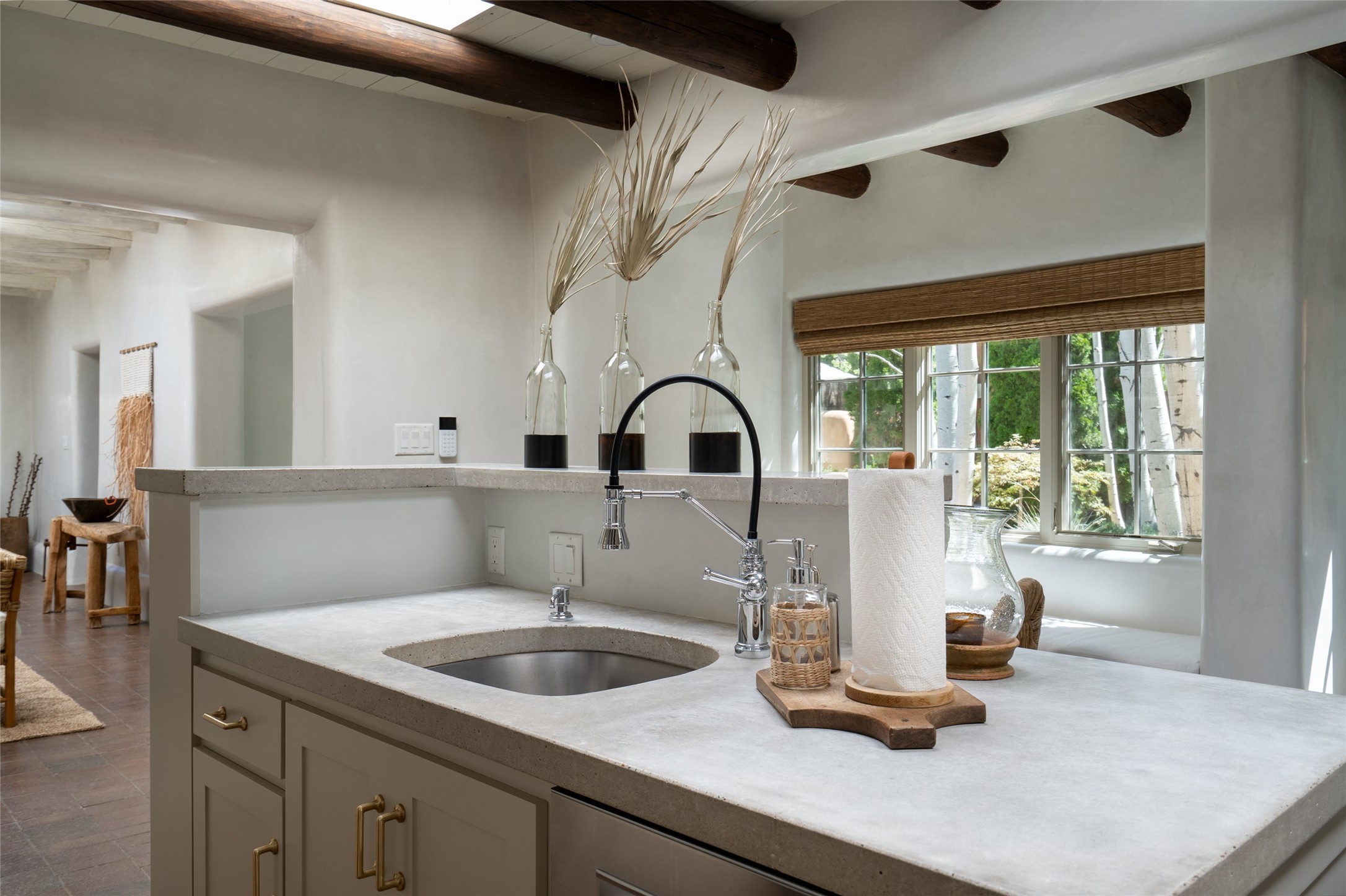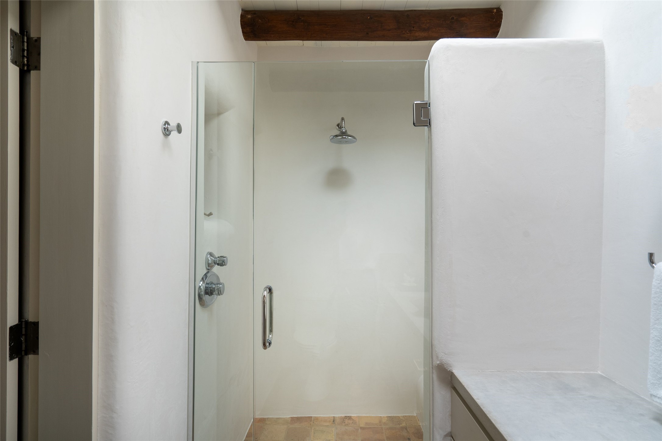 Recently renovated Pueblo-style compound that captures the spirit of Santa Fe in the heart of the coveted Historic Eastside. As you enter this enchanting property, you are greeted by a beautifully landscaped courtyard, a tranquil escape with multiple seating areas, perfect for indulging in quiet moments or lively gatherings. The property exudes old-world charm, featuring five wood-burning fireplaces, traditional vigas and beams, and a delightful mix of brick, tile, and wood floors that create a warm and welcoming atmosphere. The 1,521 sq. ft. main house offers 2 spacious bedrooms and 2.5 elegantly appointed baths. 2 dedicated parking spots lead to a private entrance. The thoughtfully remodeled interior showcases a redesigned kitchen that is both functional and exquisite, featuring custom cabinetry and high-end appliances. New primary suite is adorned with reclaimed terracotta Giallo-style tile, a chic wet bar, and a sophisticated Domingue waterproof plaster bath. Additionally, there is a rare finished 554 sq. ft. basement. Complementing the main residence is a charming 1,216 sq. ft. guesthouse. This newly renovated space features two parking spots and a gated entrance. With its open-concept design and skylights, the guesthouse is bathed in natural light, creating a bright and airy ambiance. Ideally located, just moments away from Downtown Subscription, a local coffee house and gathering spot, as well as Canyon Road, Kakawa Chocolate, and Kaune's Neighborhood Market