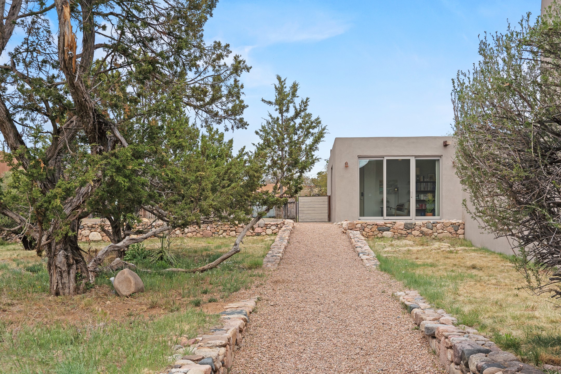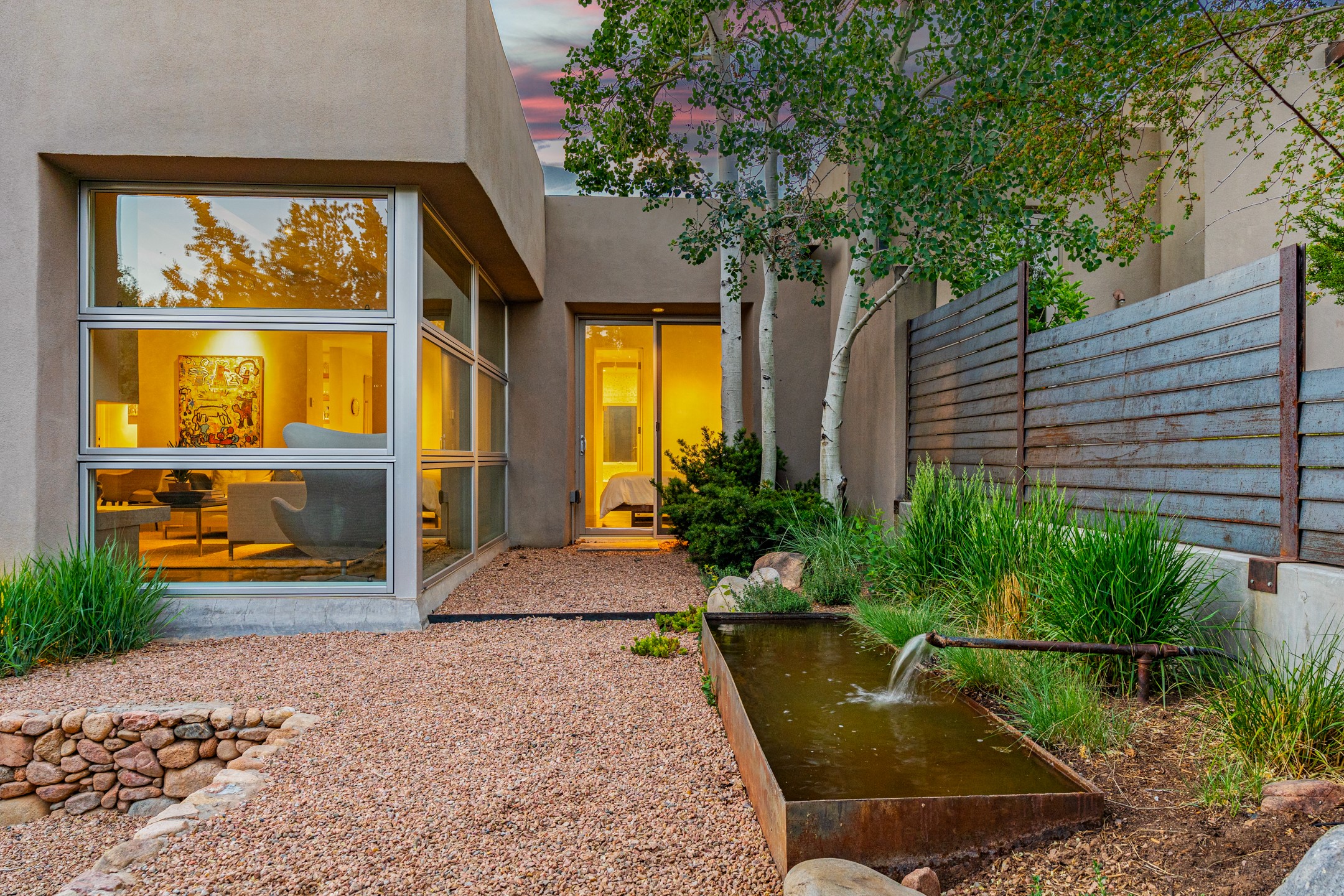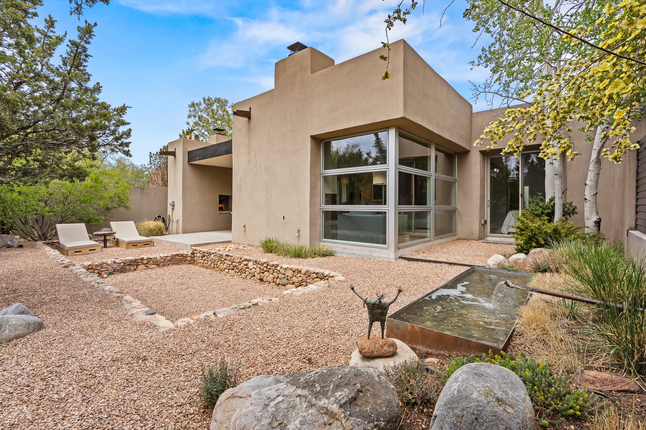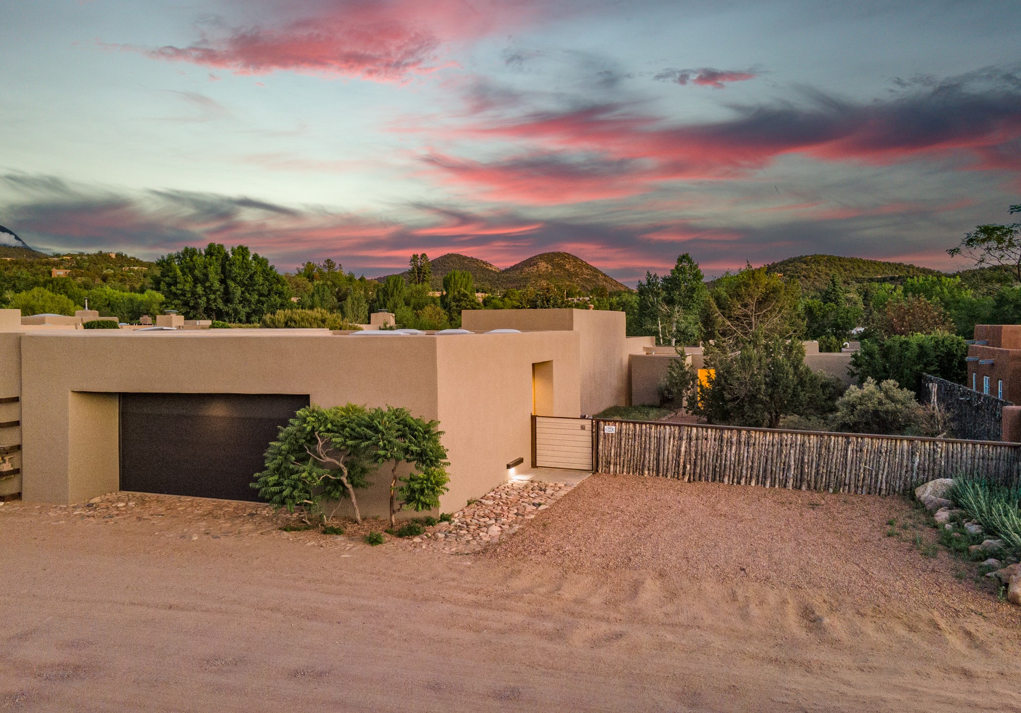 Welcome to the "Pearl House"--a stunning contemporary residence designed by acclaimed architect Trey Jordan as his personal home. This exceptional property seamlessly fuses bold architectural design with modern comforts and relaxed livability. Over the past three years, it has undergone extensive renovations featuring top-of-the-line appliances, fixtures, and finishes. Set on a private 0.29-acre lot with sweeping views of Picacho and Atalaya Peaks, the property includes a main residence with 2-bedrooms and 2-baths, plus a 2-car garage. Attached to the garage is a recently renovated heated studio/office space, along with a storage room and workshop area, offering versatile functionality for creative or active lifestyles. The outdoor spaces are equally impressive, with a tranquil dining area complete with a fireplace and a fountain--perfect for entertaining or quiet reflection. Nature lovers will appreciate the nearby Santa Fe River Trail and the renowned Dale Ball Trail System, offering miles of scenic hiking and biking. Included in the sale are approved plans for a second residence, part of the original vision for the property, designed by Trey Jordan, providing an exciting opportunity for future expansion. Ideally located within walking distance of historic Canyon Road and minutes from the cultural, culinary, and artistic attractions of downtown Santa Fe, Pearl House is a rare architectural gem in an unparalleled setting.